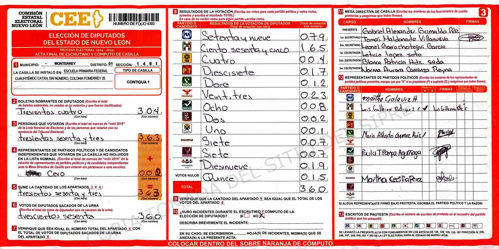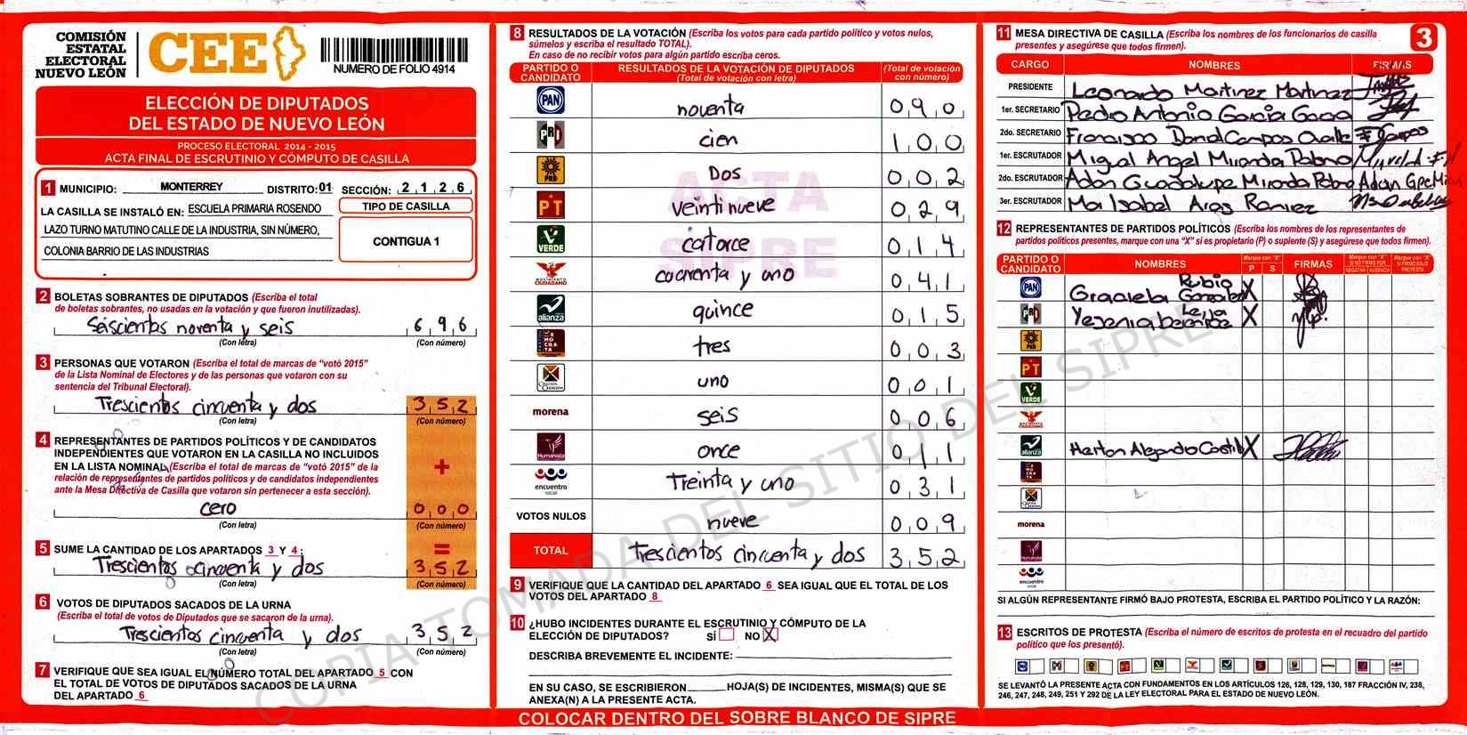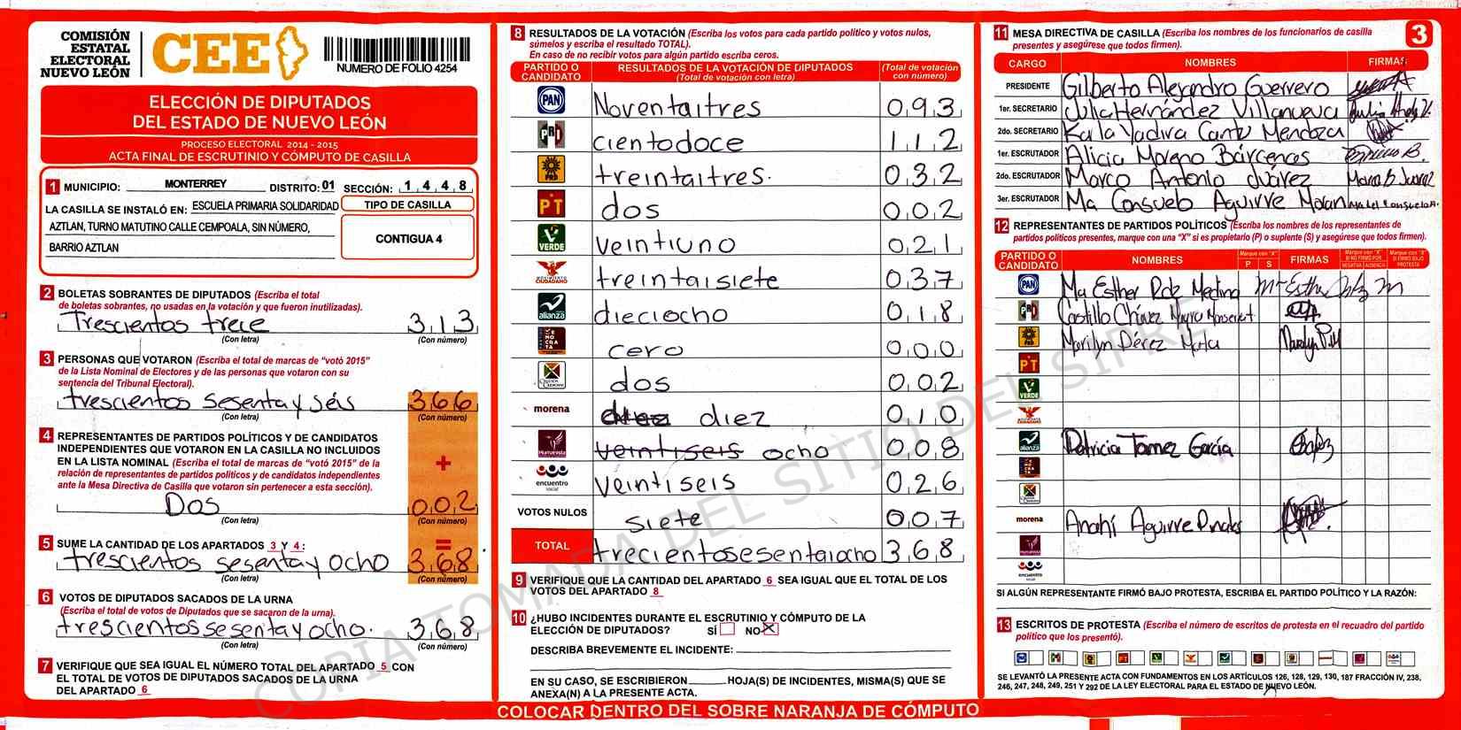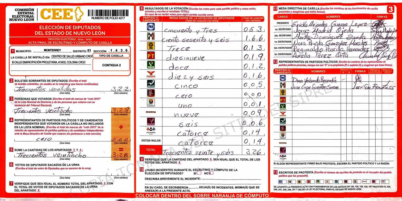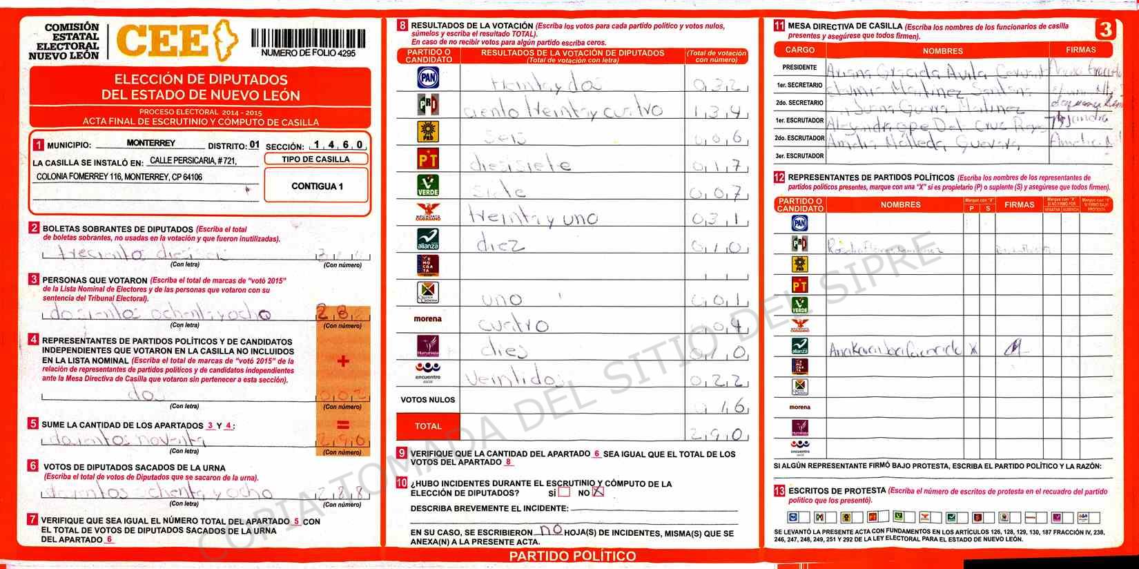 | Claves de Incidencia: | (1) Ilegible, (2) Mutilada, (3) Presenta Correcciones, (4) Presenta Borrones, (5) En Blanco, (6) Cifras Remarcadas, (7) Cifras de Mas, (8) Copiado Movido, (9) Con Signos Inválidos, (10) Excede Lista Nominal, (11) Otra |