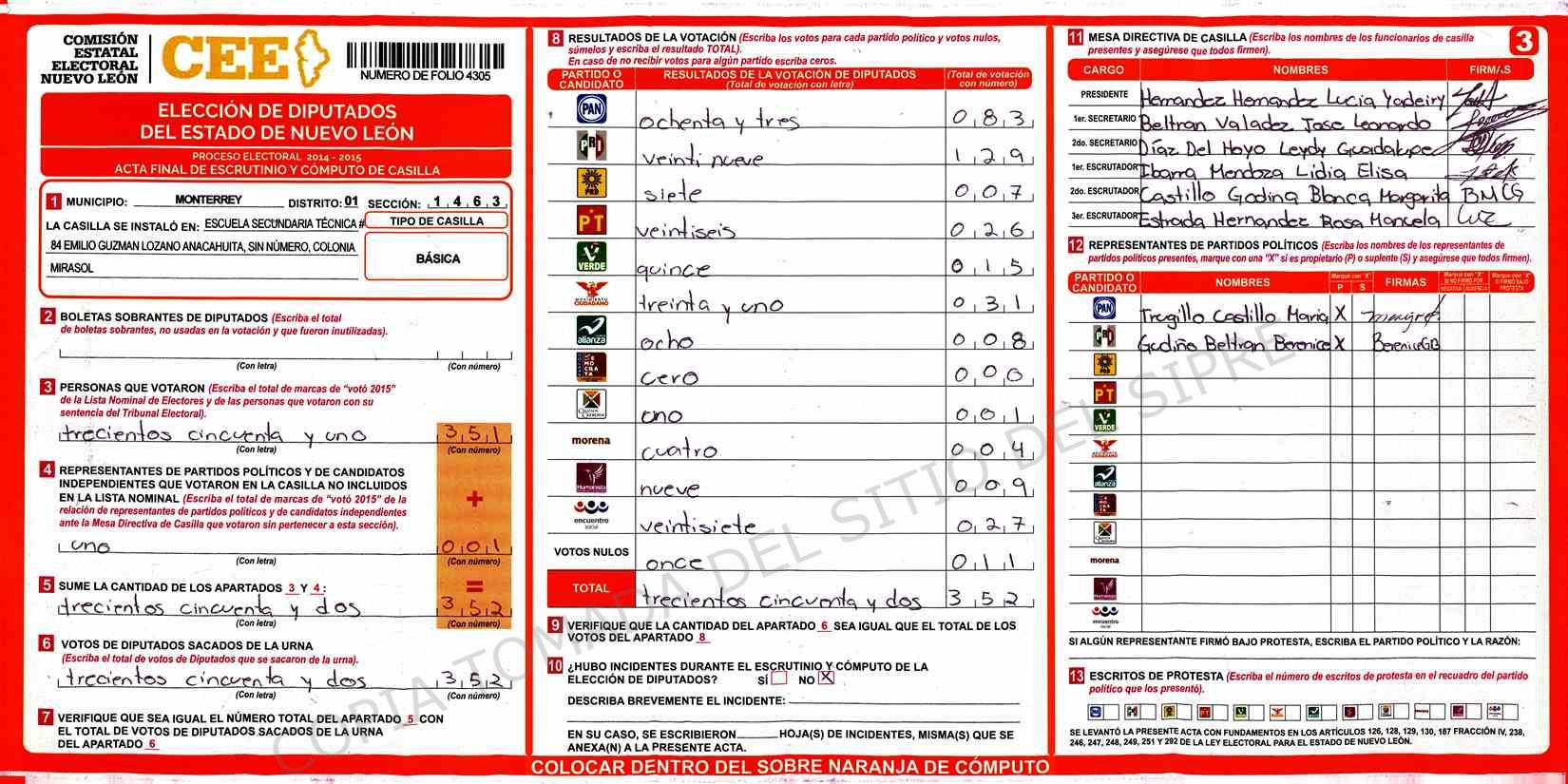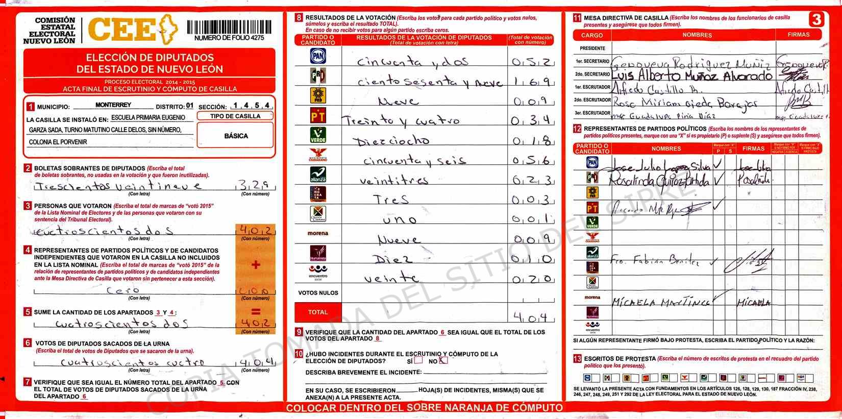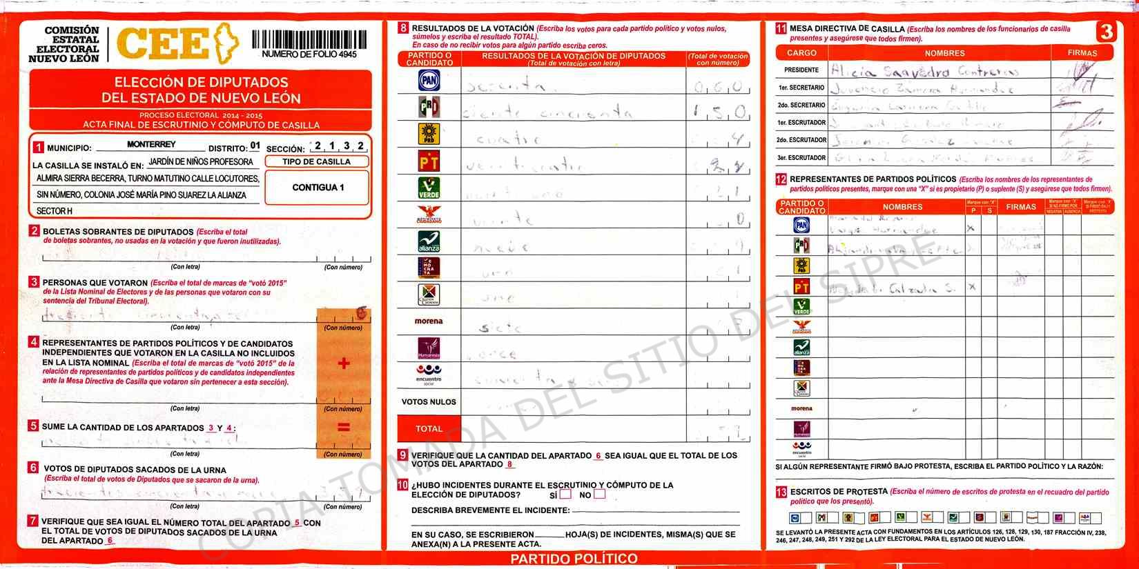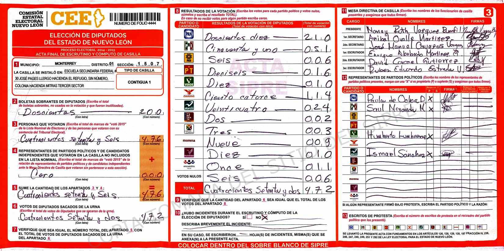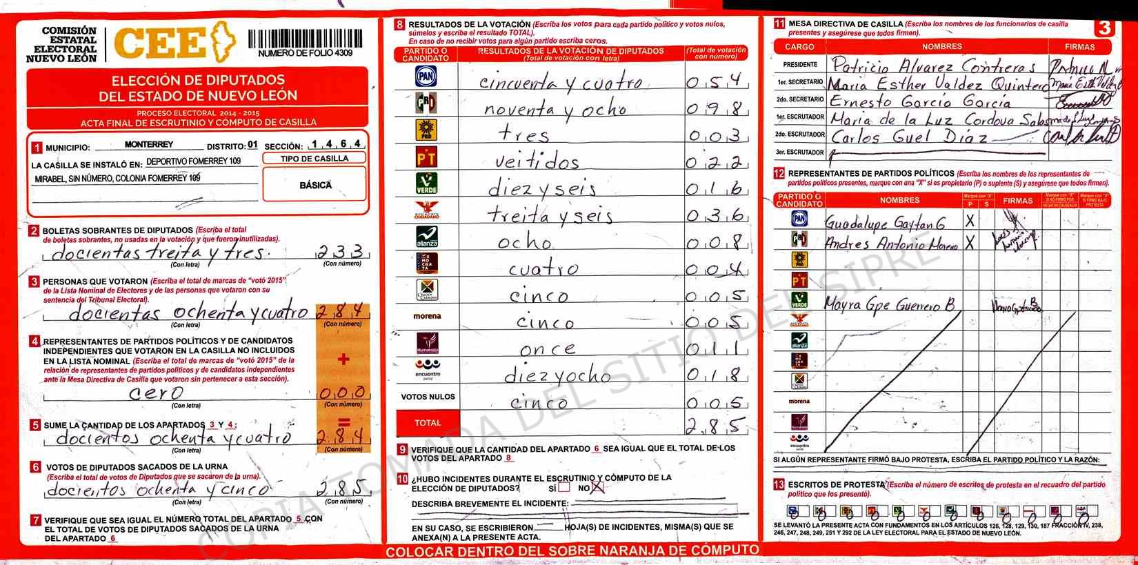 | Claves de Incidencia: | (1) Ilegible, (2) Mutilada, (3) Presenta Correcciones, (4) Presenta Borrones, (5) En Blanco, (6) Cifras Remarcadas, (7) Cifras de Mas, (8) Copiado Movido, (9) Con Signos Inválidos, (10) Excede Lista Nominal, (11) Otra |