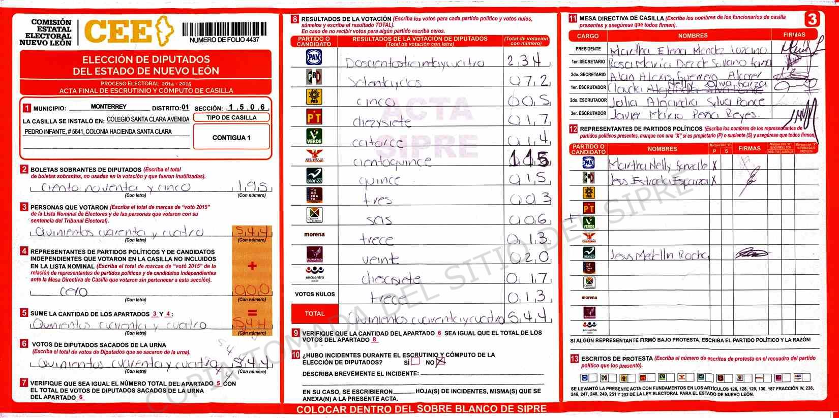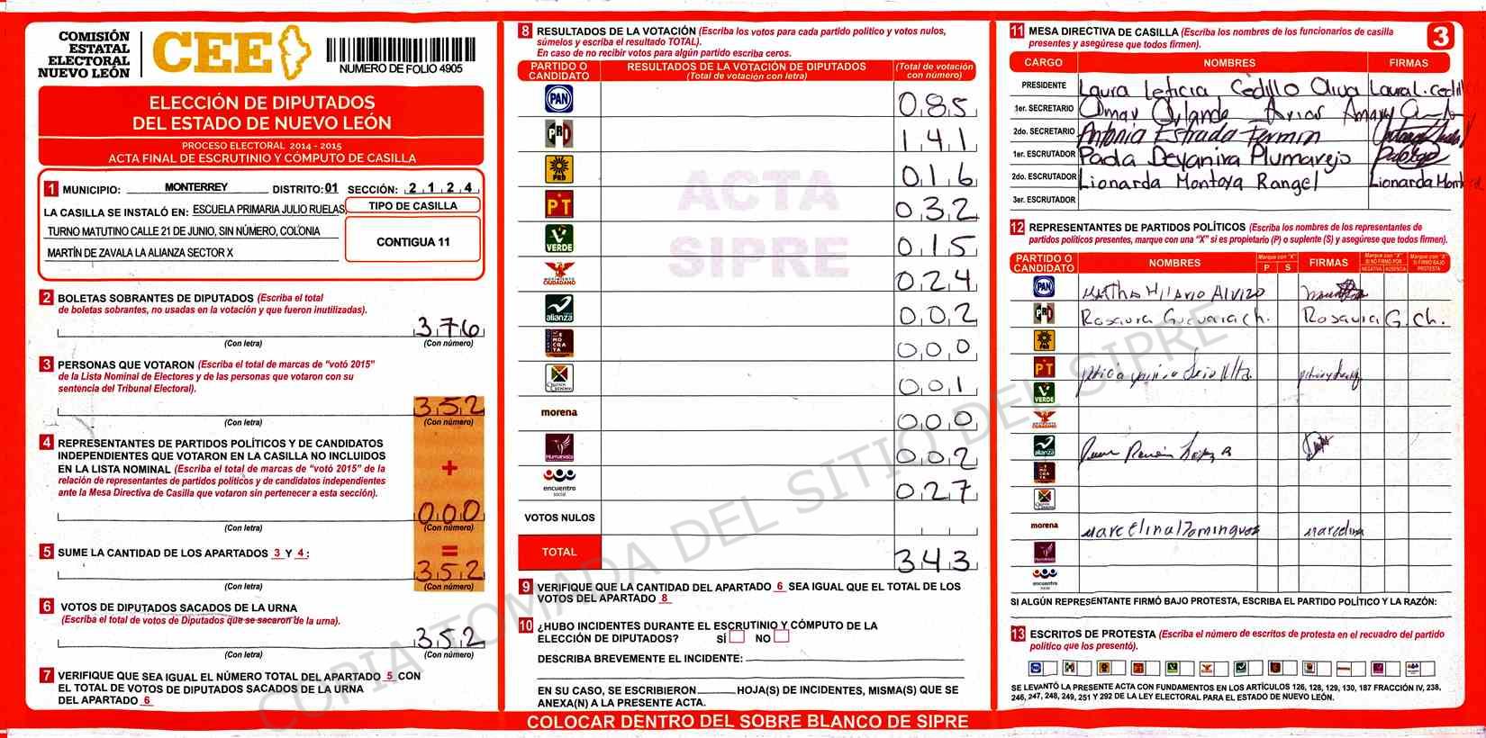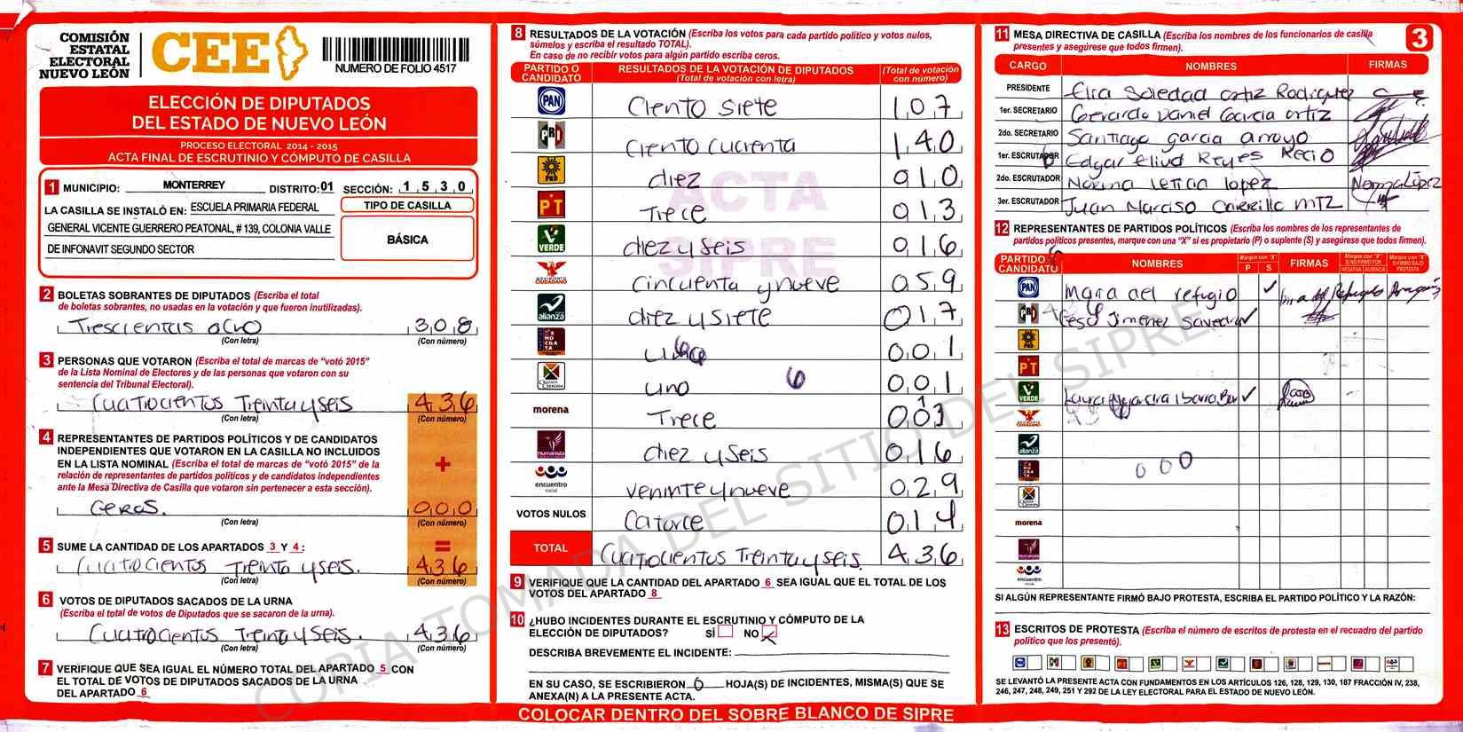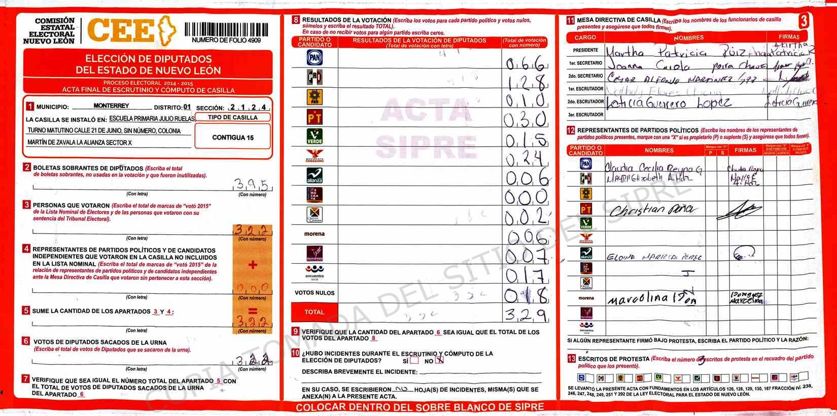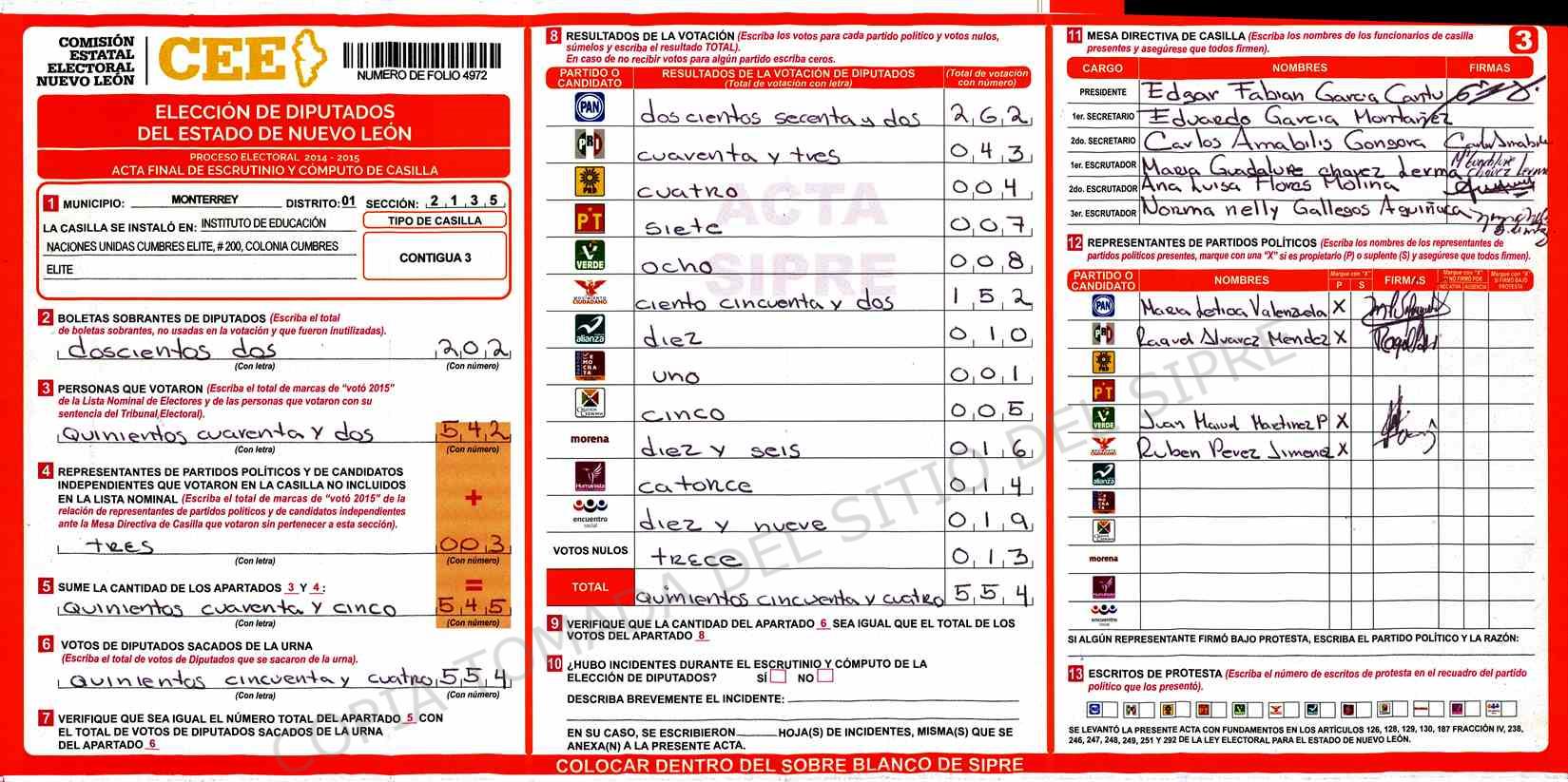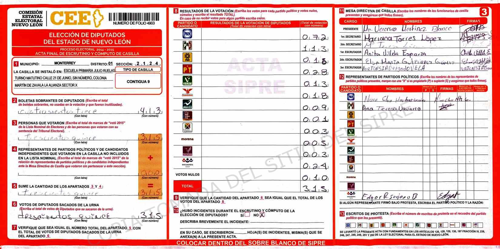 | Claves de Incidencia: | (1) Ilegible, (2) Mutilada, (3) Presenta Correcciones, (4) Presenta Borrones, (5) En Blanco, (6) Cifras Remarcadas, (7) Cifras de Mas, (8) Copiado Movido, (9) Con Signos Inválidos, (10) Excede Lista Nominal, (11) Otra |