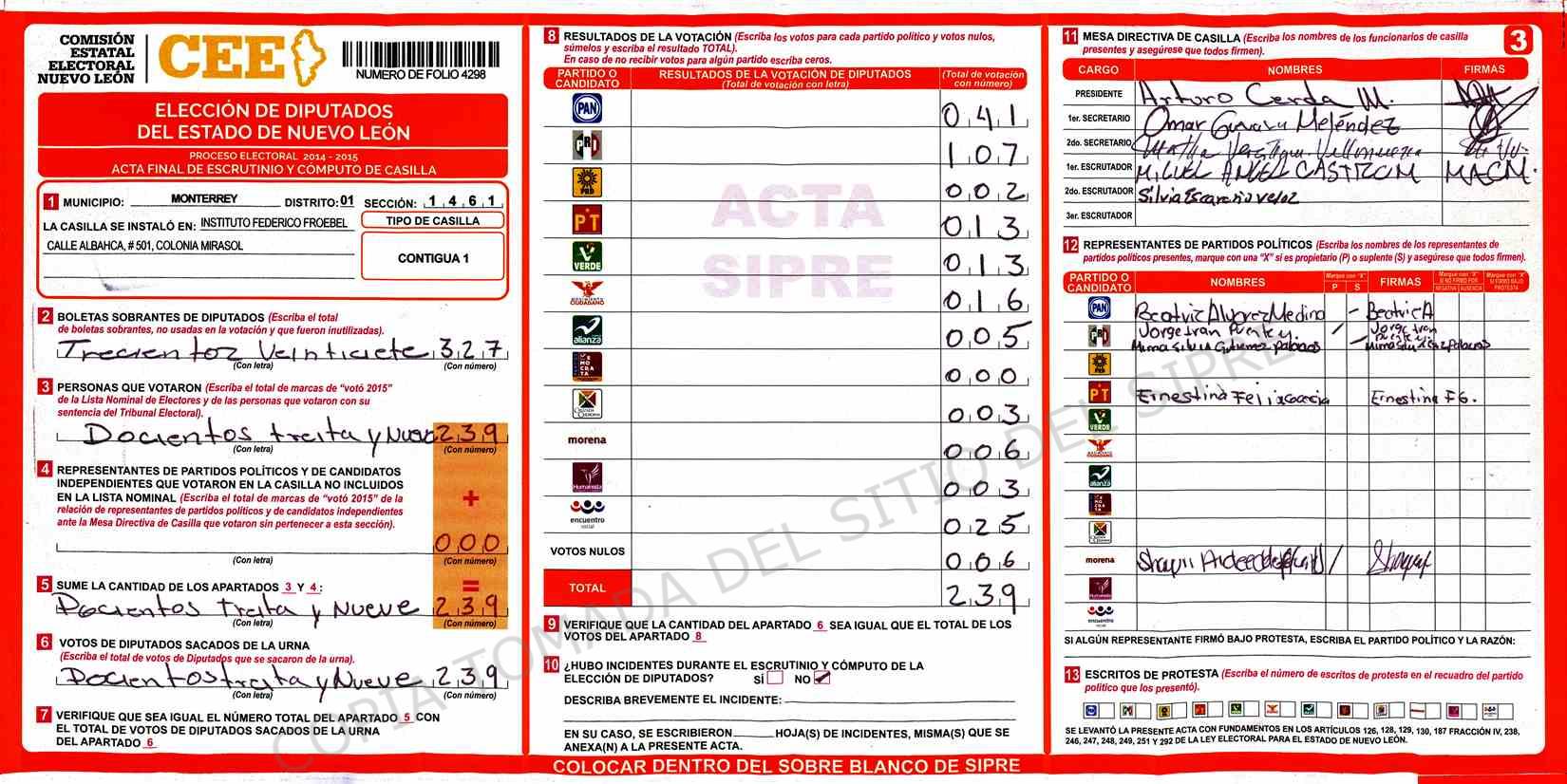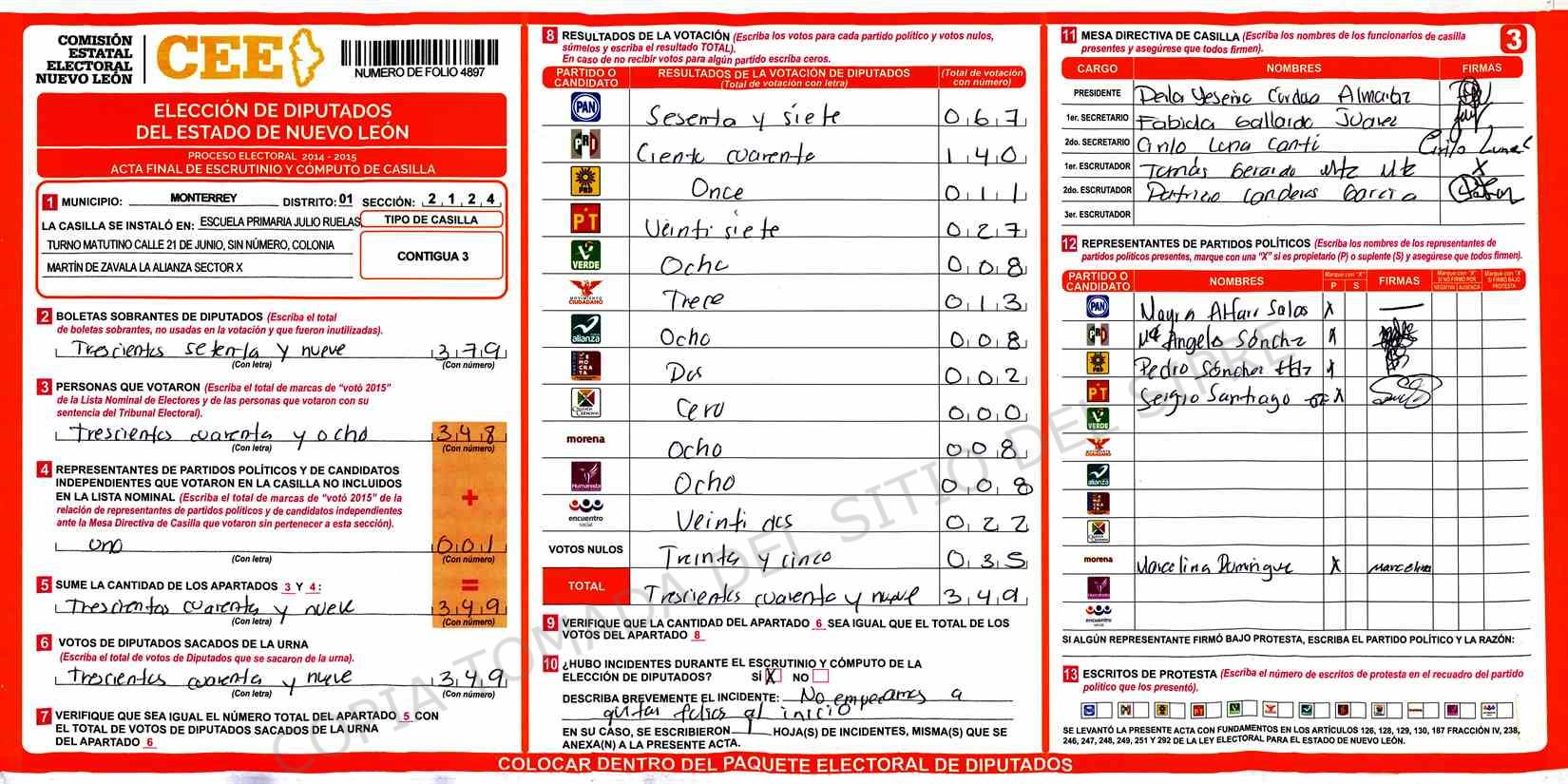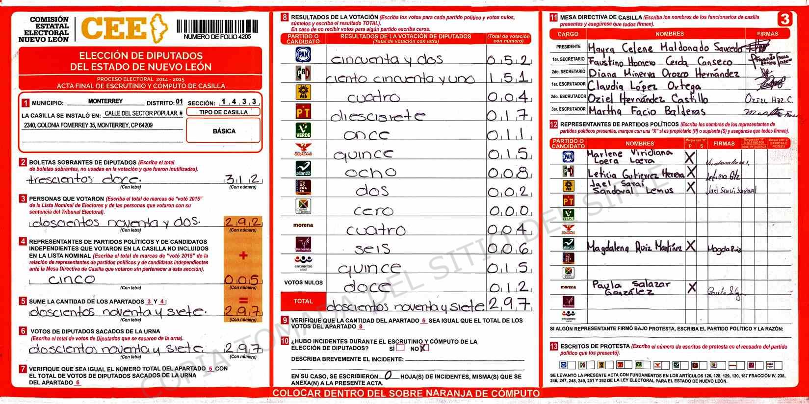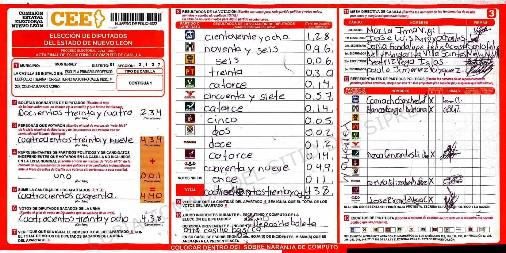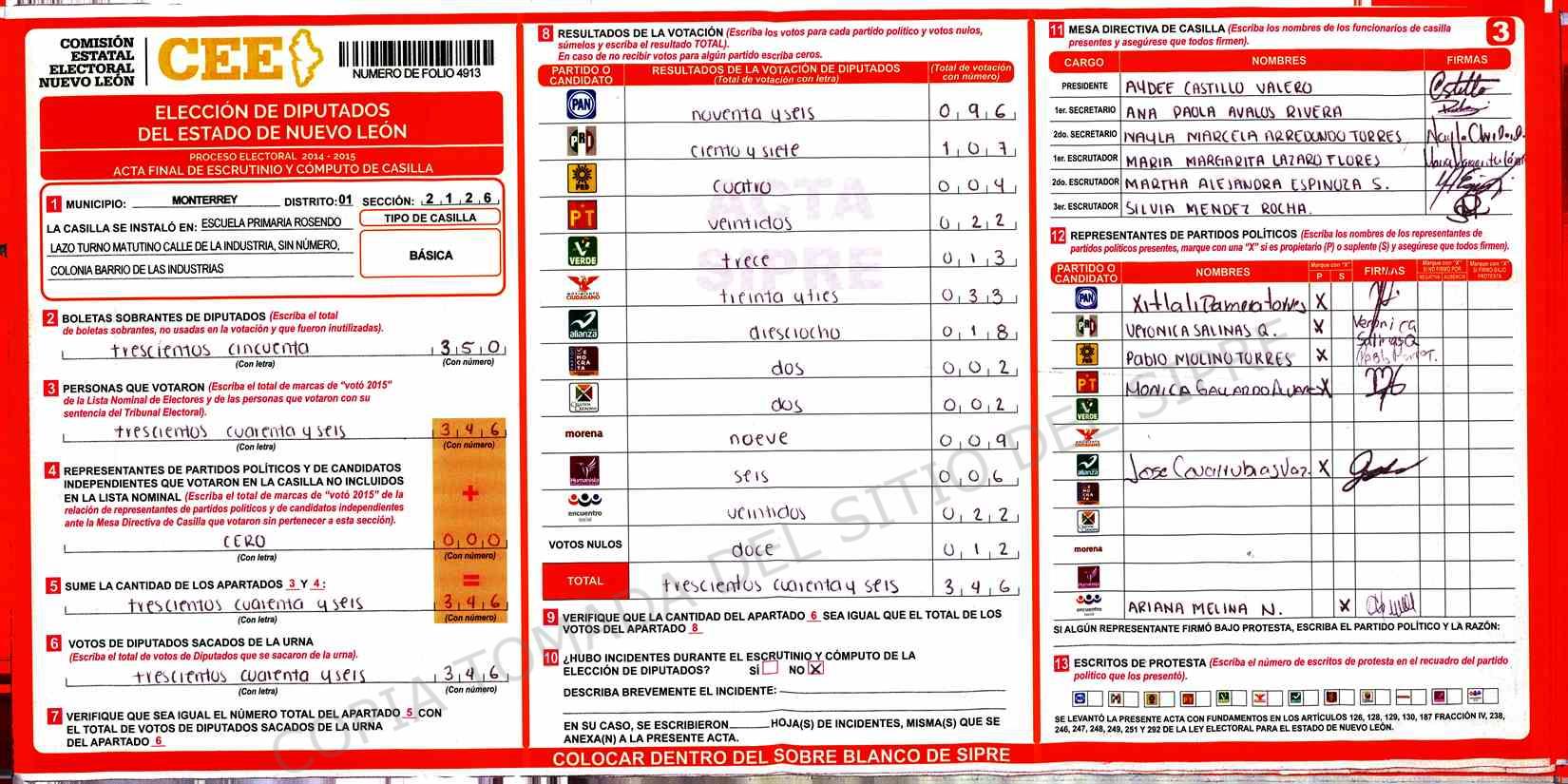 | Claves de Incidencia: | (1) Ilegible, (2) Mutilada, (3) Presenta Correcciones, (4) Presenta Borrones, (5) En Blanco, (6) Cifras Remarcadas, (7) Cifras de Mas, (8) Copiado Movido, (9) Con Signos Inválidos, (10) Excede Lista Nominal, (11) Otra |