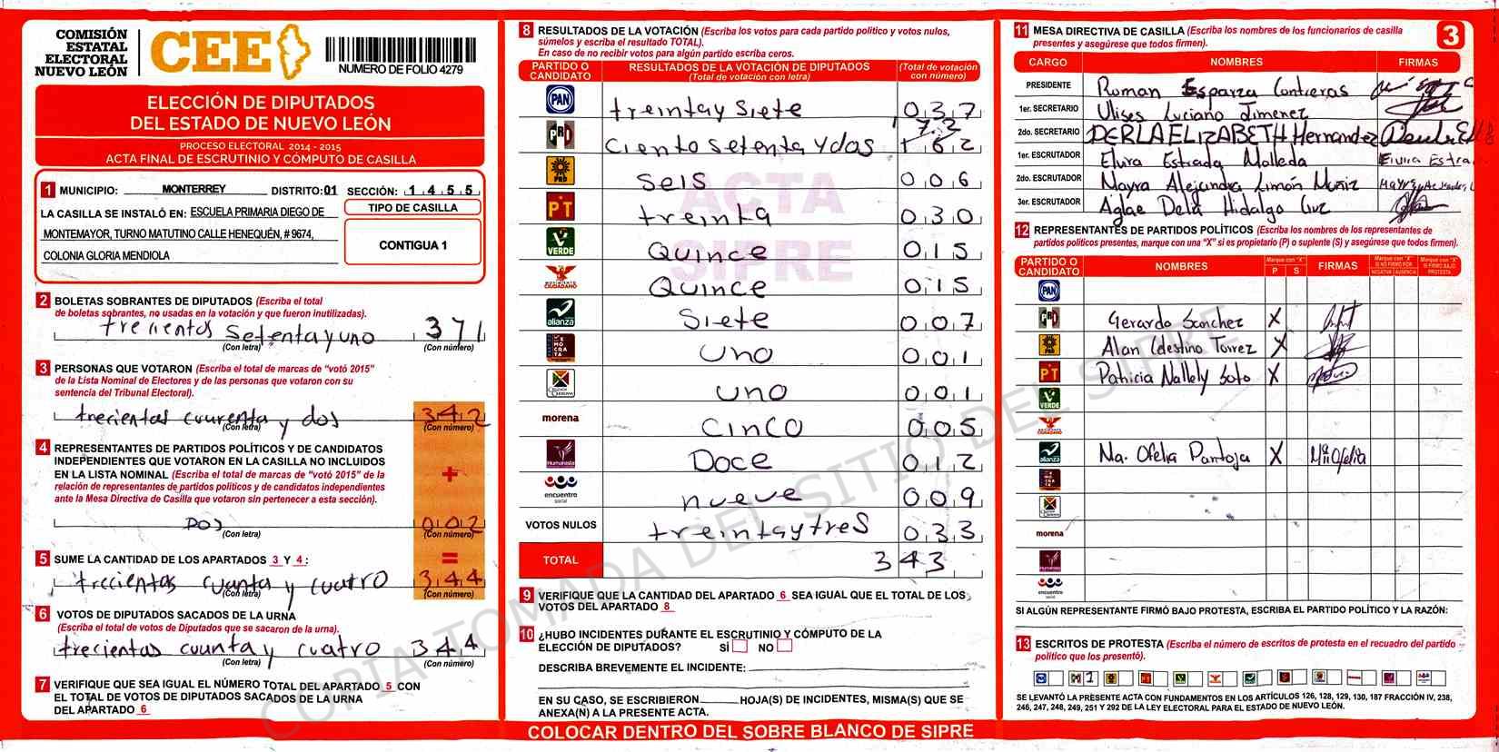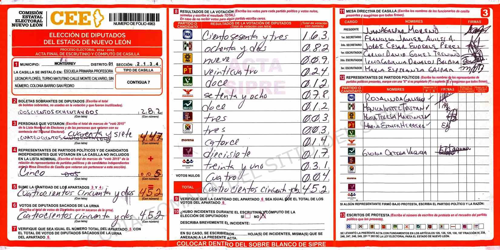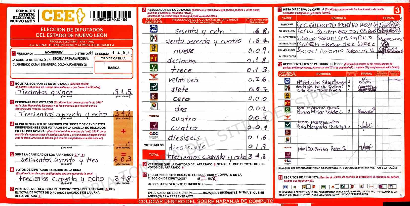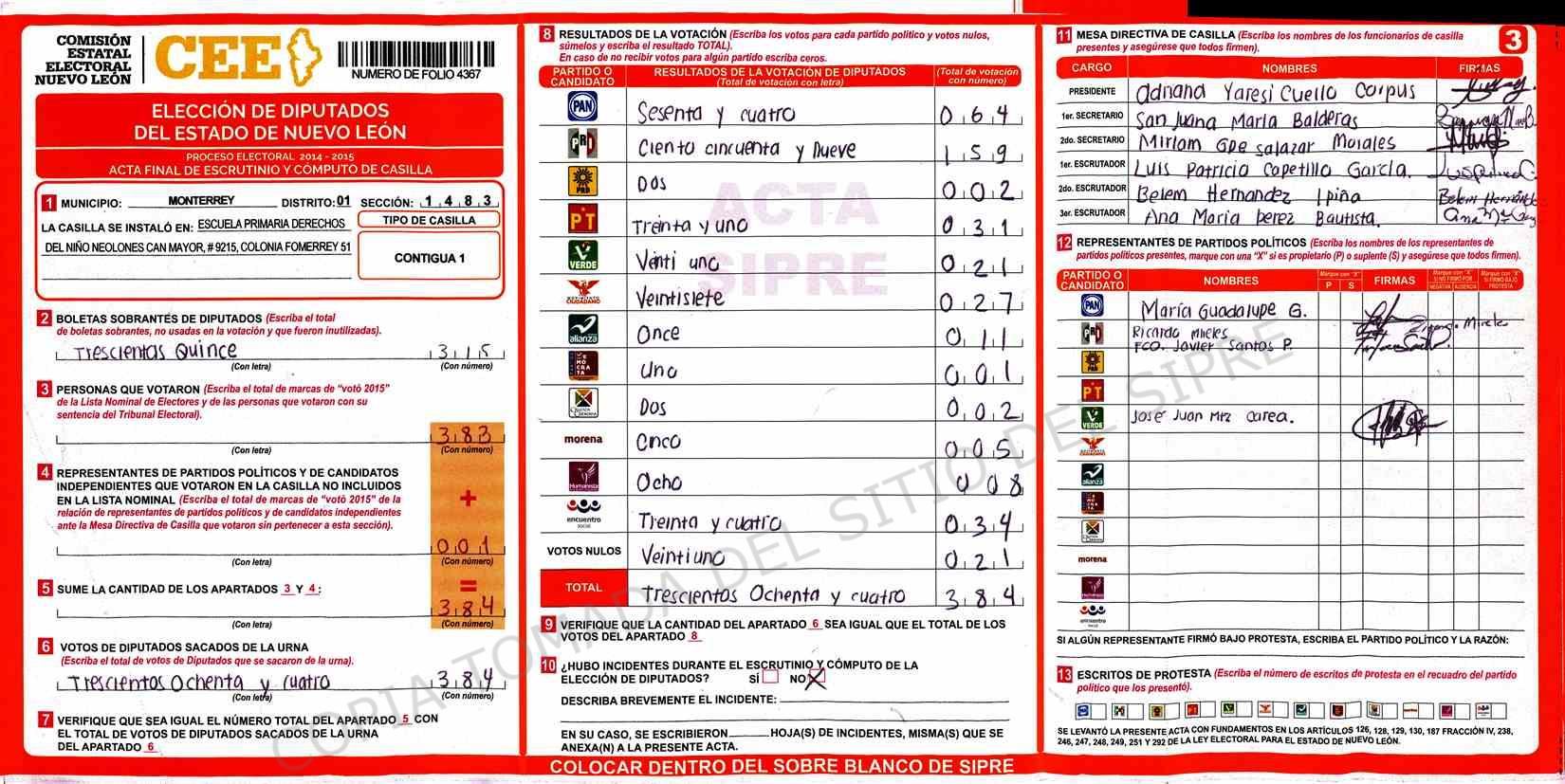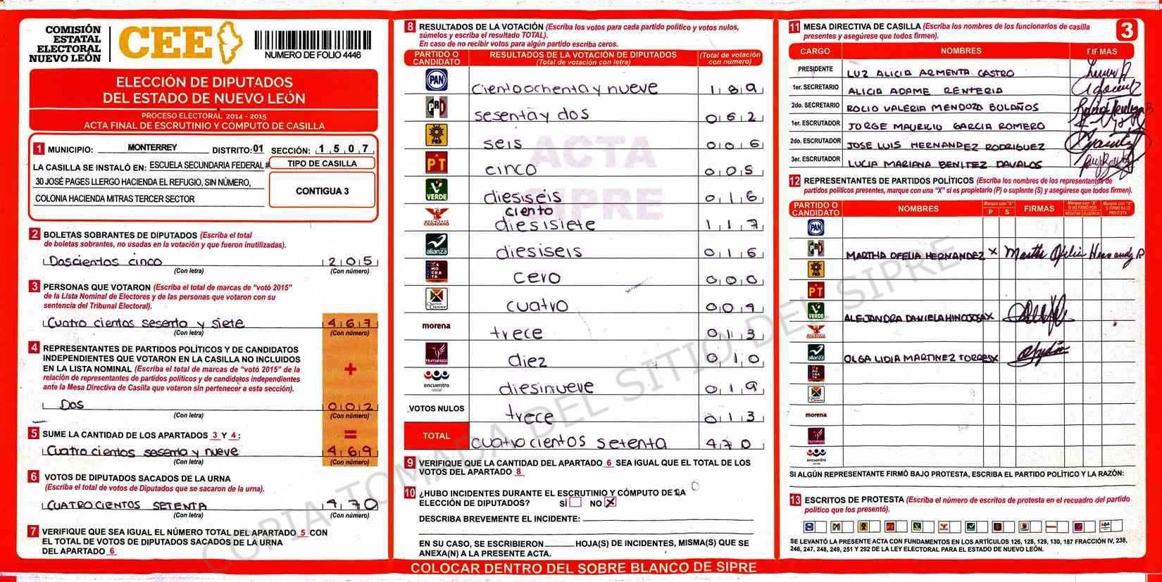 | Claves de Incidencia: | (1) Ilegible, (2) Mutilada, (3) Presenta Correcciones, (4) Presenta Borrones, (5) En Blanco, (6) Cifras Remarcadas, (7) Cifras de Mas, (8) Copiado Movido, (9) Con Signos Inválidos, (10) Excede Lista Nominal, (11) Otra |