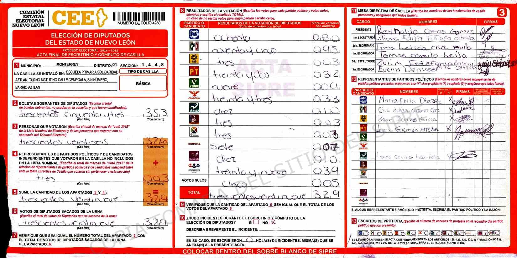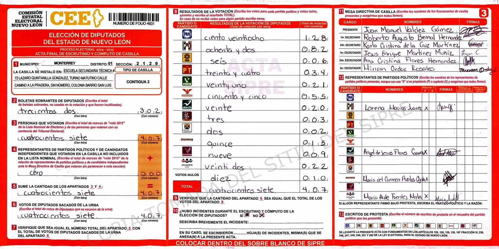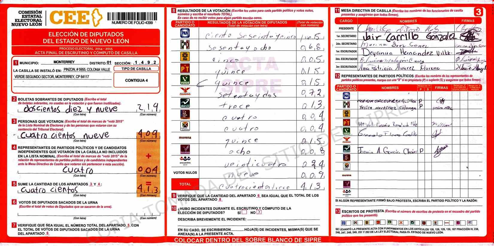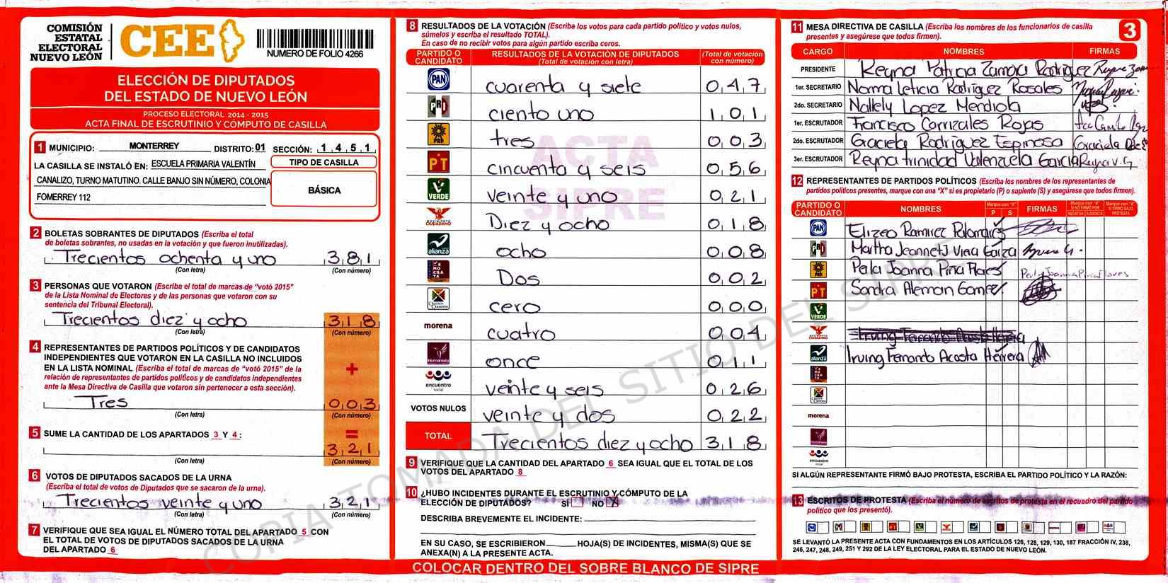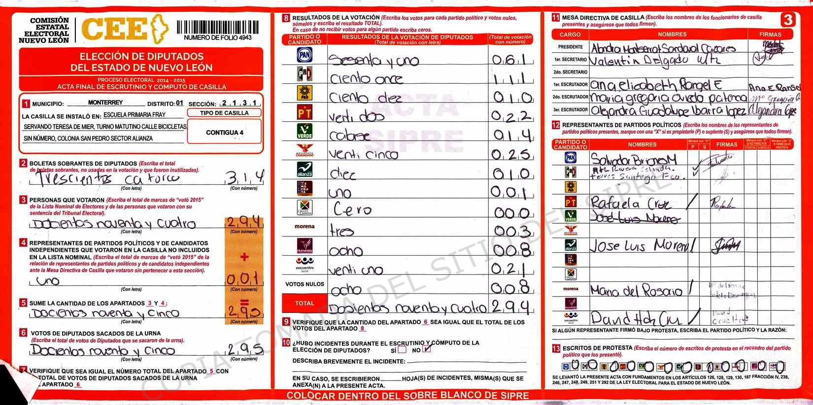 | Claves de Incidencia: | (1) Ilegible, (2) Mutilada, (3) Presenta Correcciones, (4) Presenta Borrones, (5) En Blanco, (6) Cifras Remarcadas, (7) Cifras de Mas, (8) Copiado Movido, (9) Con Signos Inválidos, (10) Excede Lista Nominal, (11) Otra |