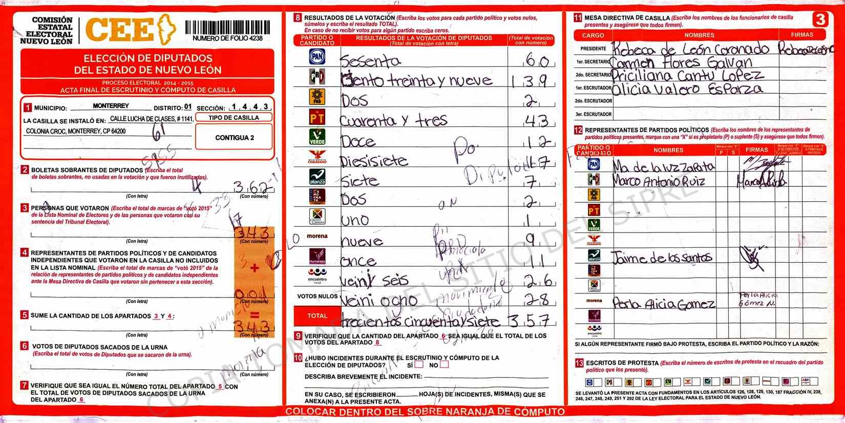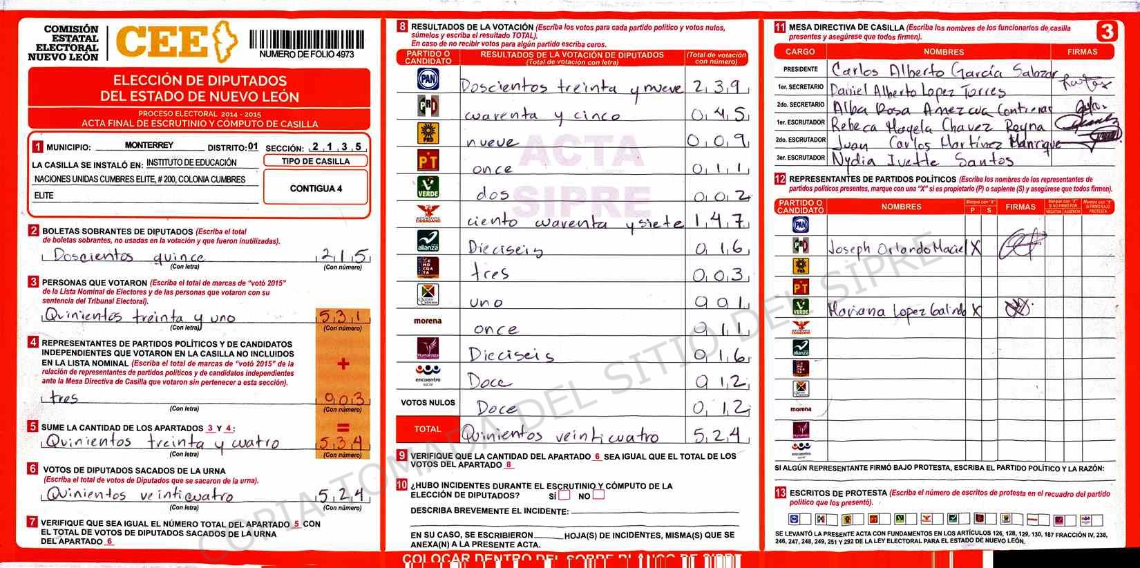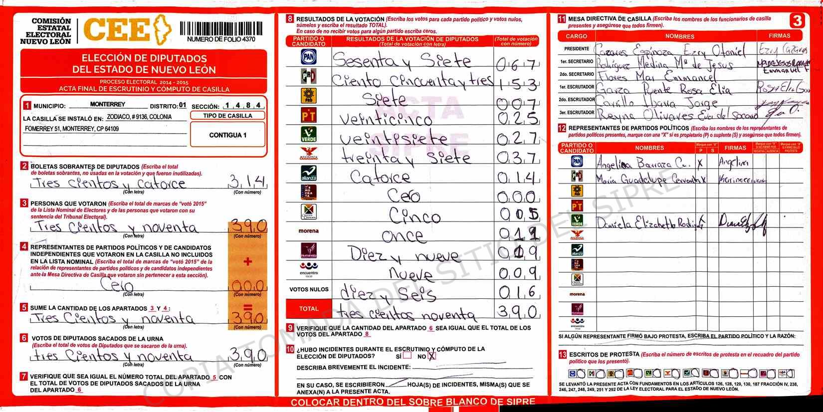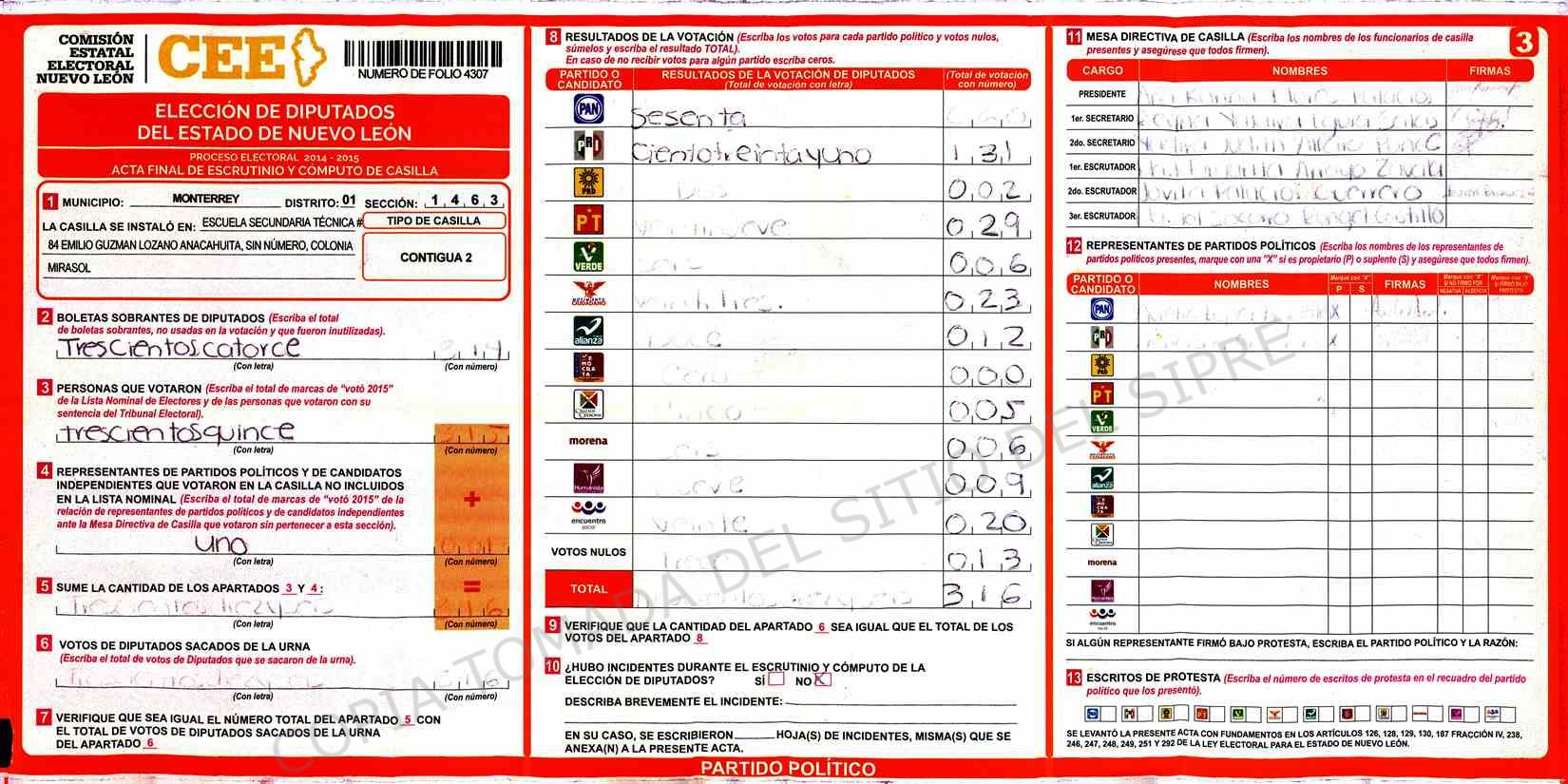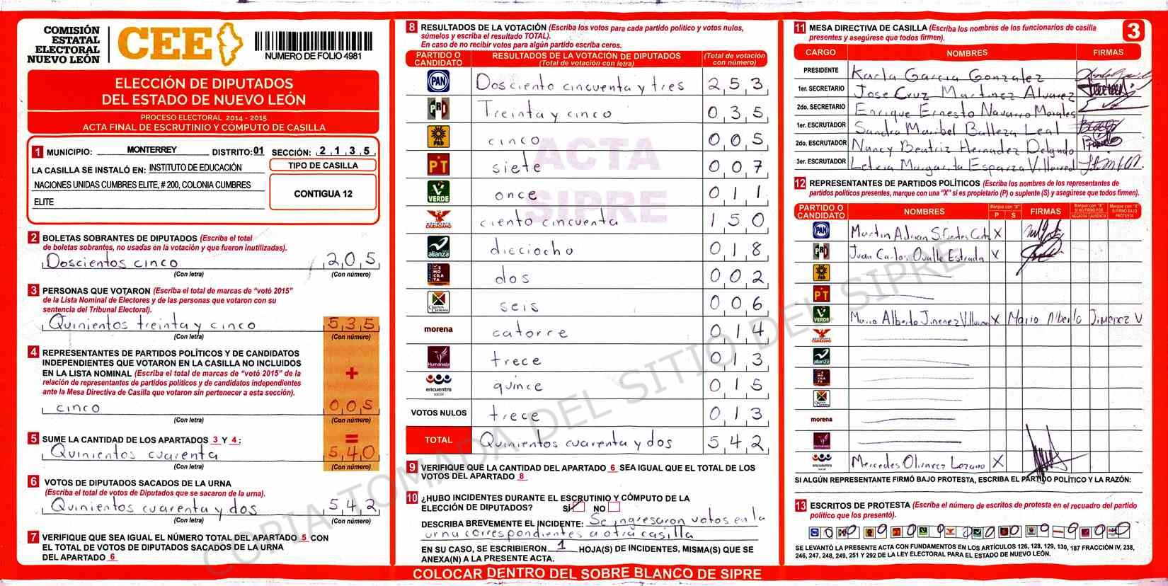 | Claves de Incidencia: | (1) Ilegible, (2) Mutilada, (3) Presenta Correcciones, (4) Presenta Borrones, (5) En Blanco, (6) Cifras Remarcadas, (7) Cifras de Mas, (8) Copiado Movido, (9) Con Signos Inválidos, (10) Excede Lista Nominal, (11) Otra |