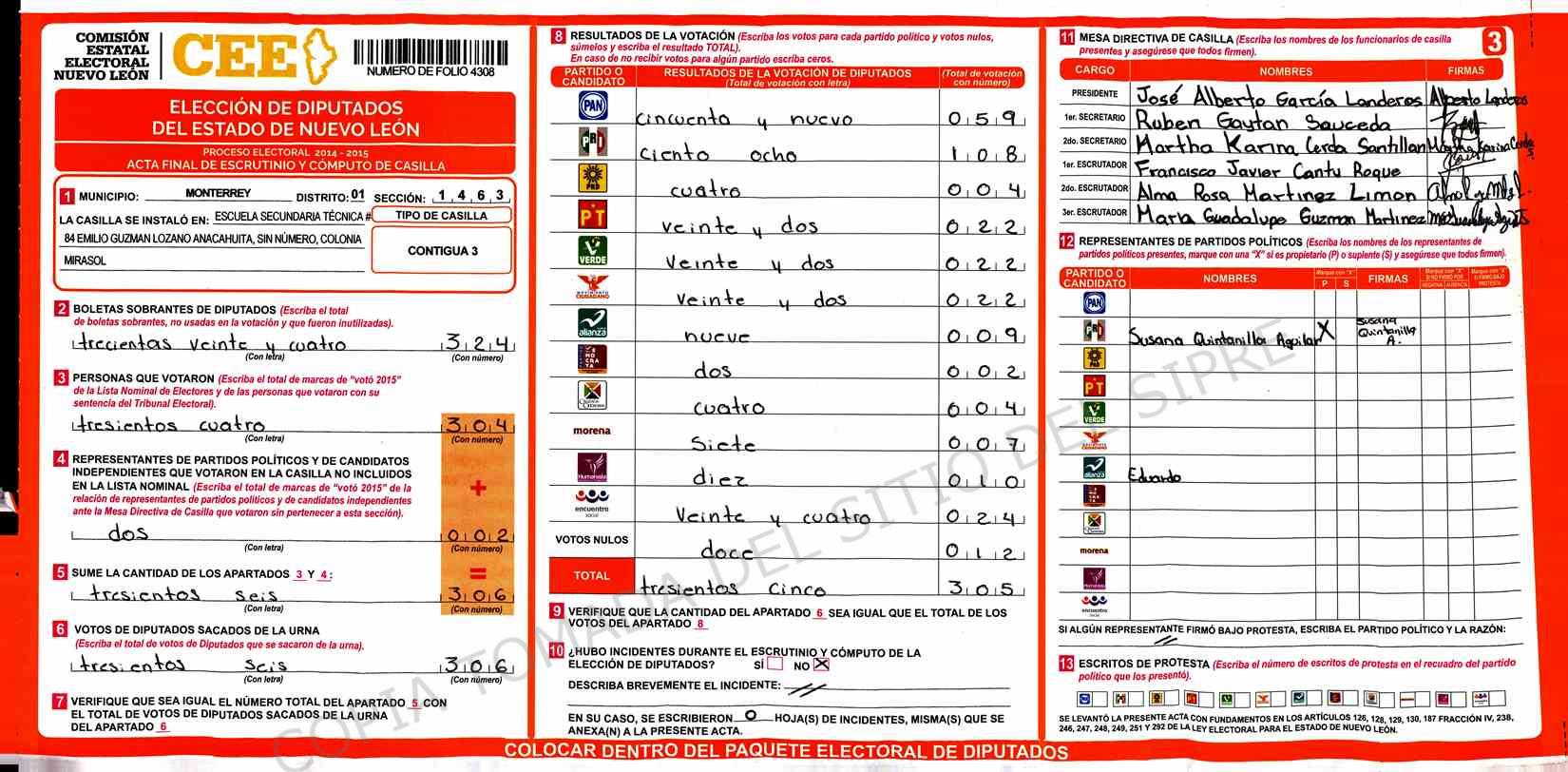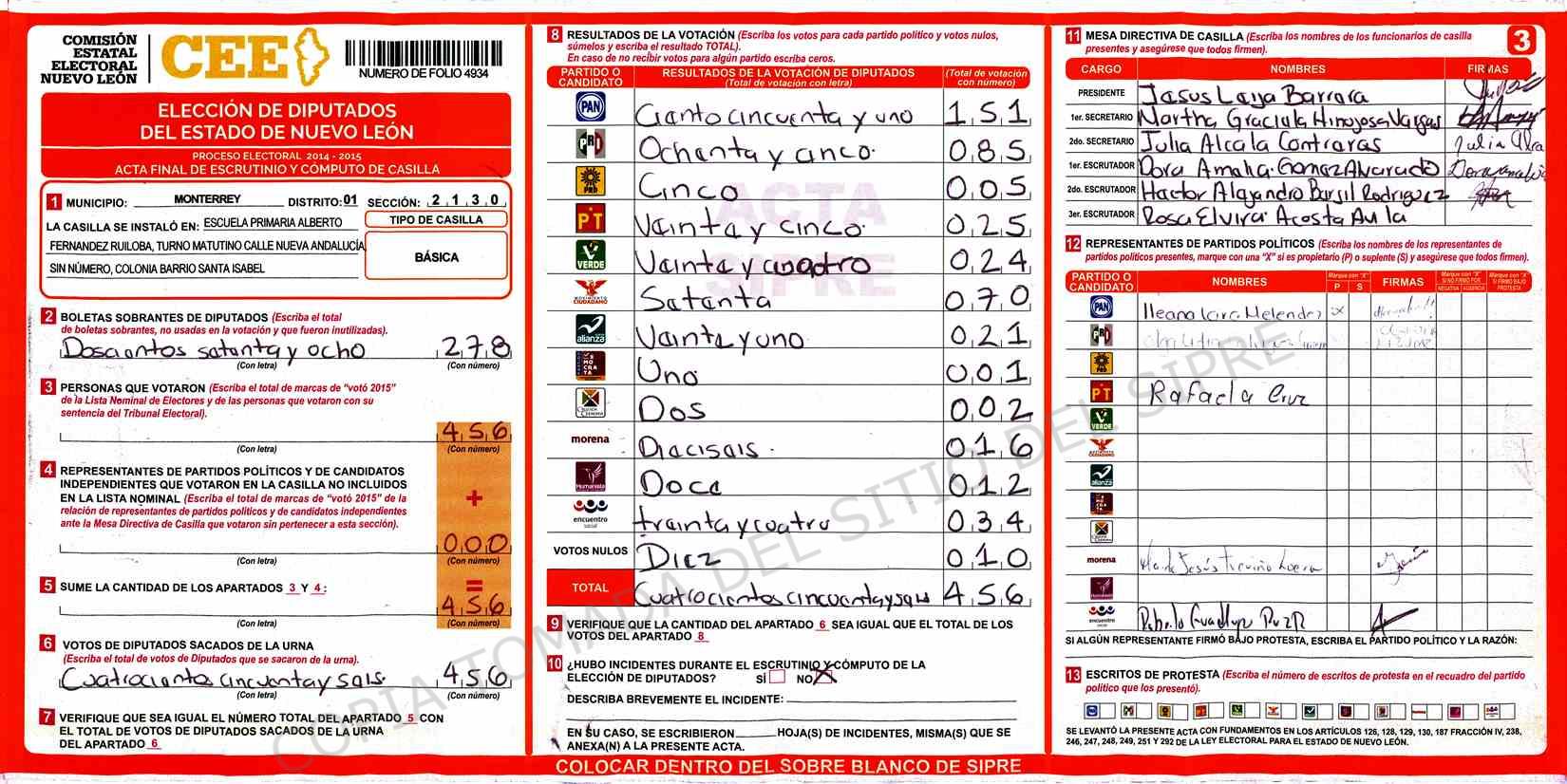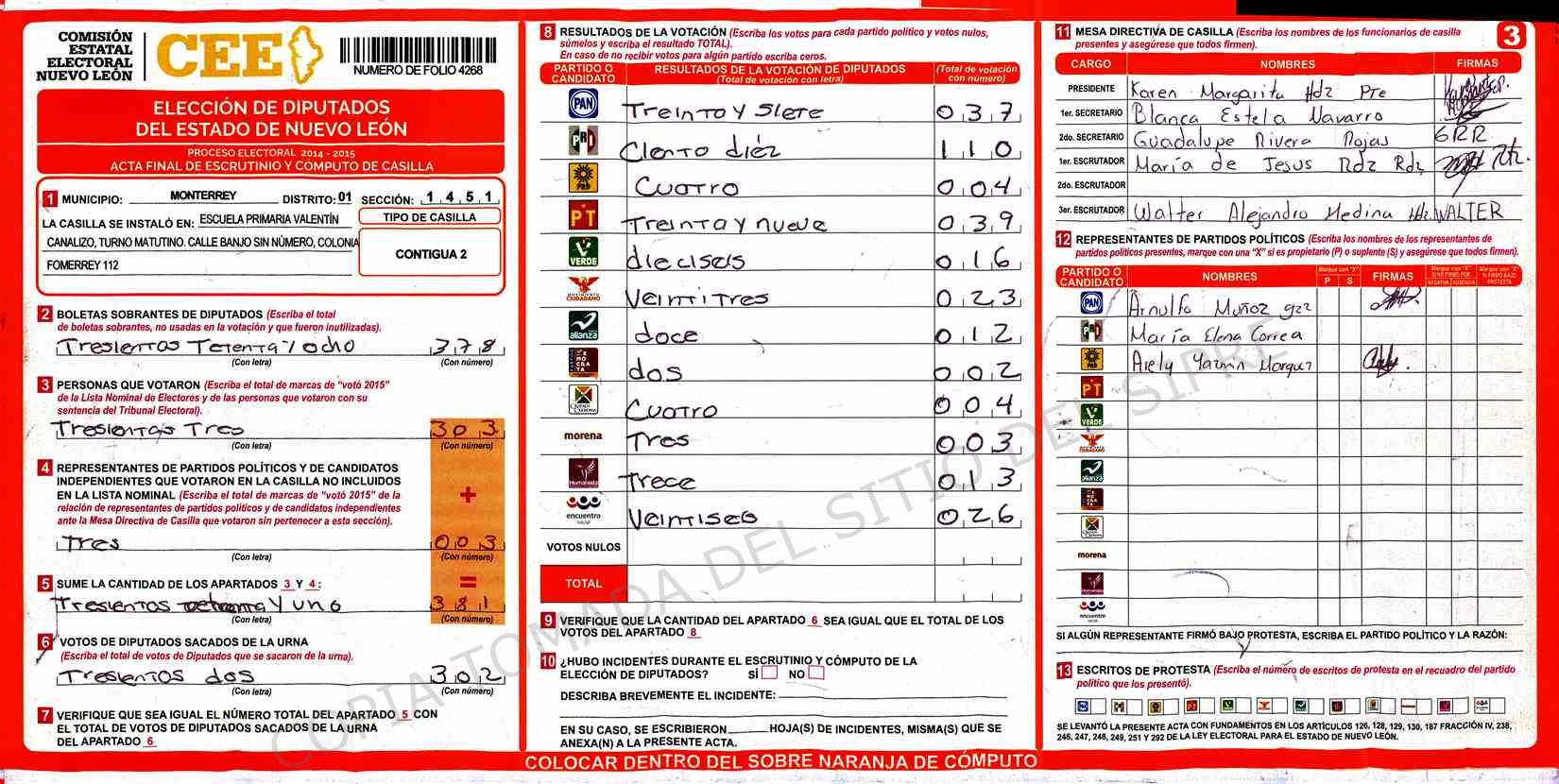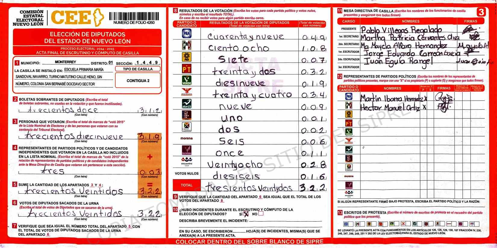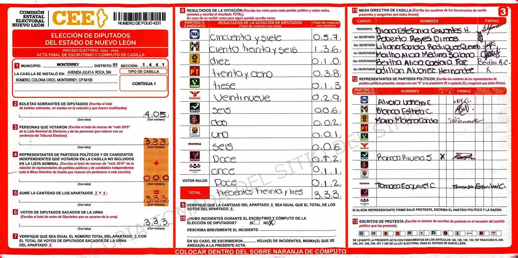 | Claves de Incidencia: | (1) Ilegible, (2) Mutilada, (3) Presenta Correcciones, (4) Presenta Borrones, (5) En Blanco, (6) Cifras Remarcadas, (7) Cifras de Mas, (8) Copiado Movido, (9) Con Signos Inválidos, (10) Excede Lista Nominal, (11) Otra |