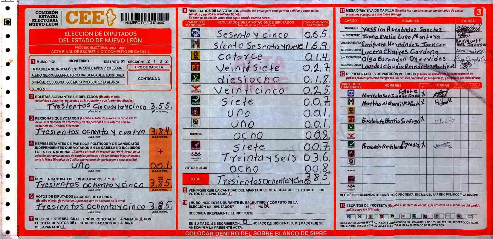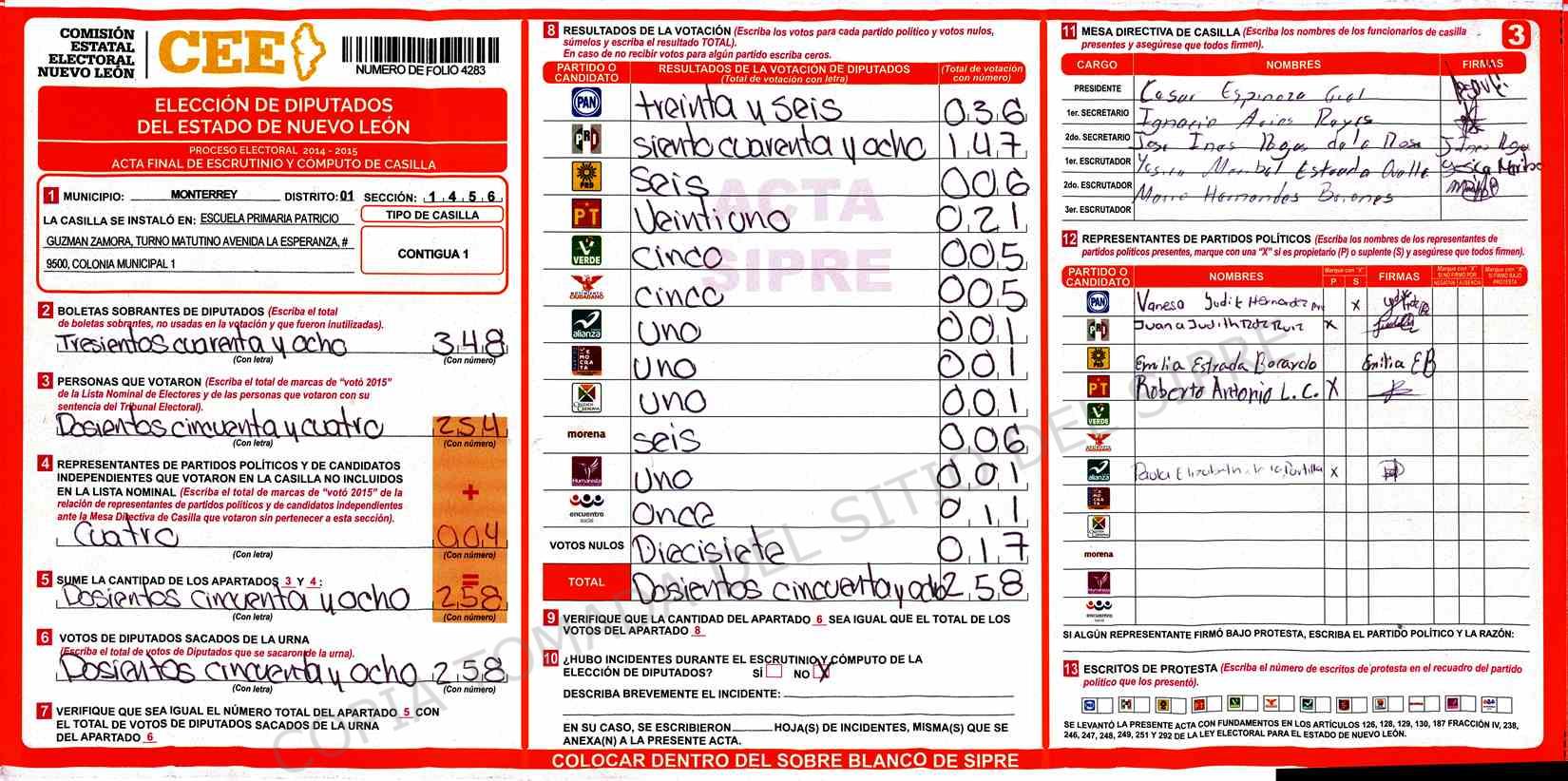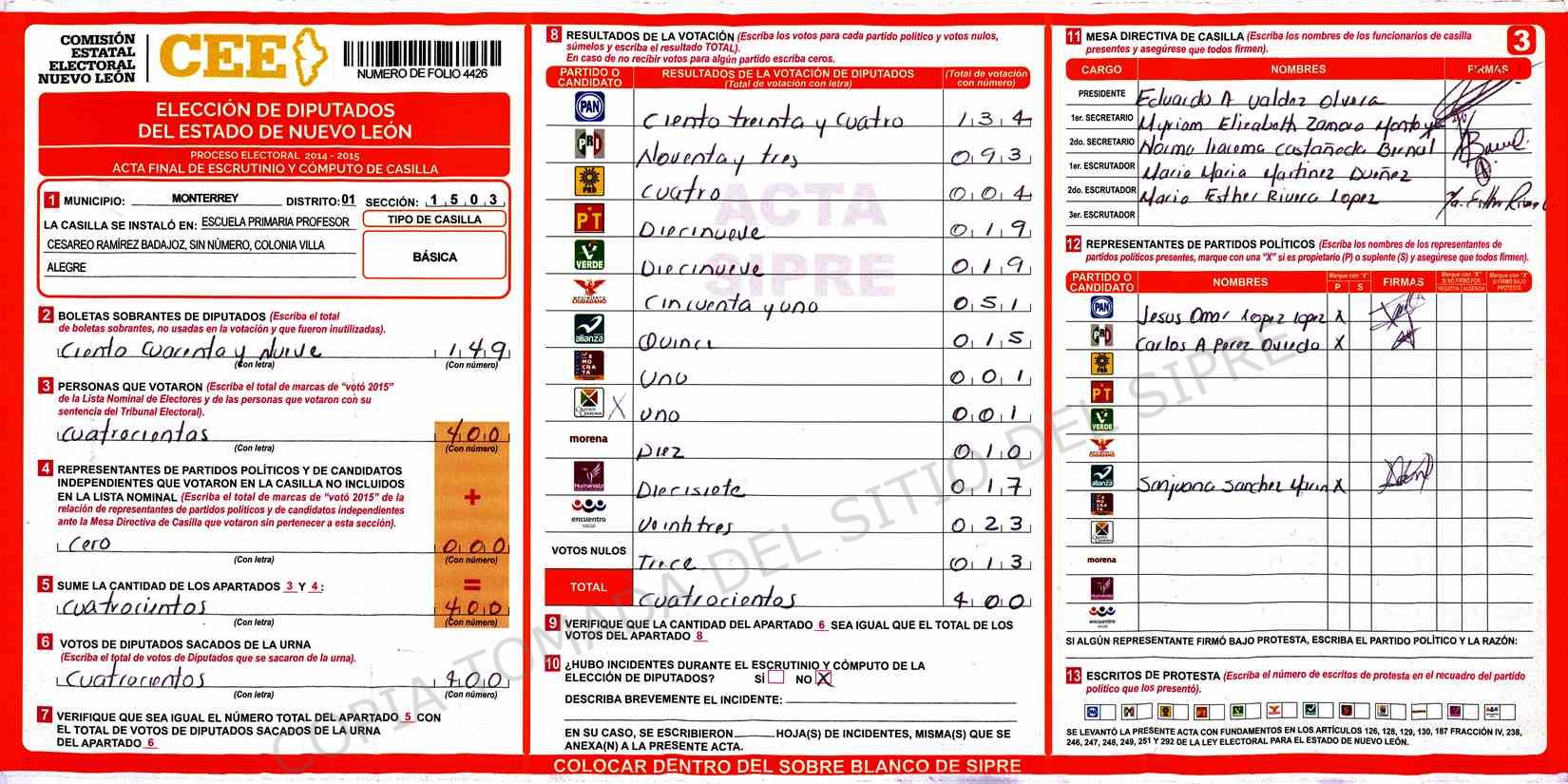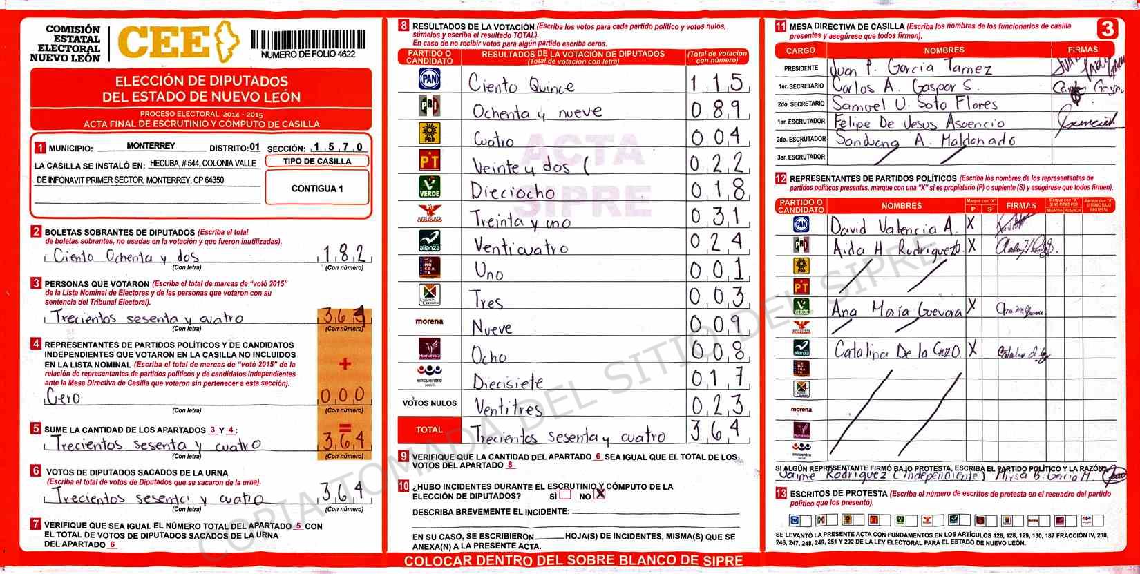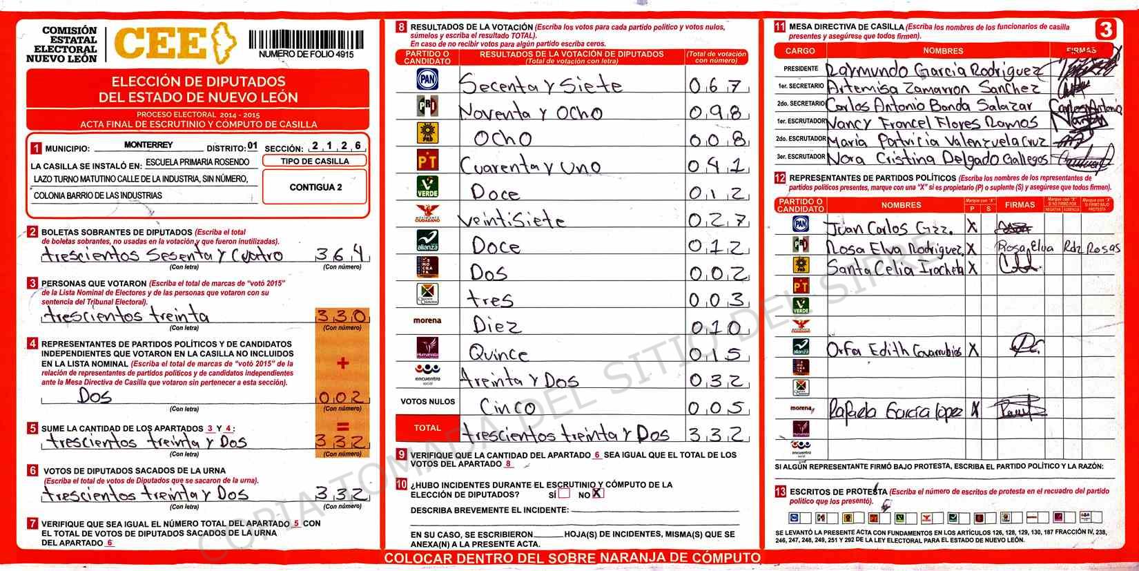 | Claves de Incidencia: | (1) Ilegible, (2) Mutilada, (3) Presenta Correcciones, (4) Presenta Borrones, (5) En Blanco, (6) Cifras Remarcadas, (7) Cifras de Mas, (8) Copiado Movido, (9) Con Signos Inválidos, (10) Excede Lista Nominal, (11) Otra |