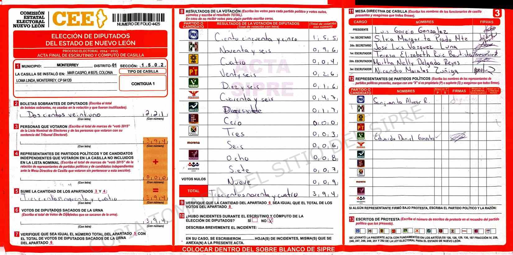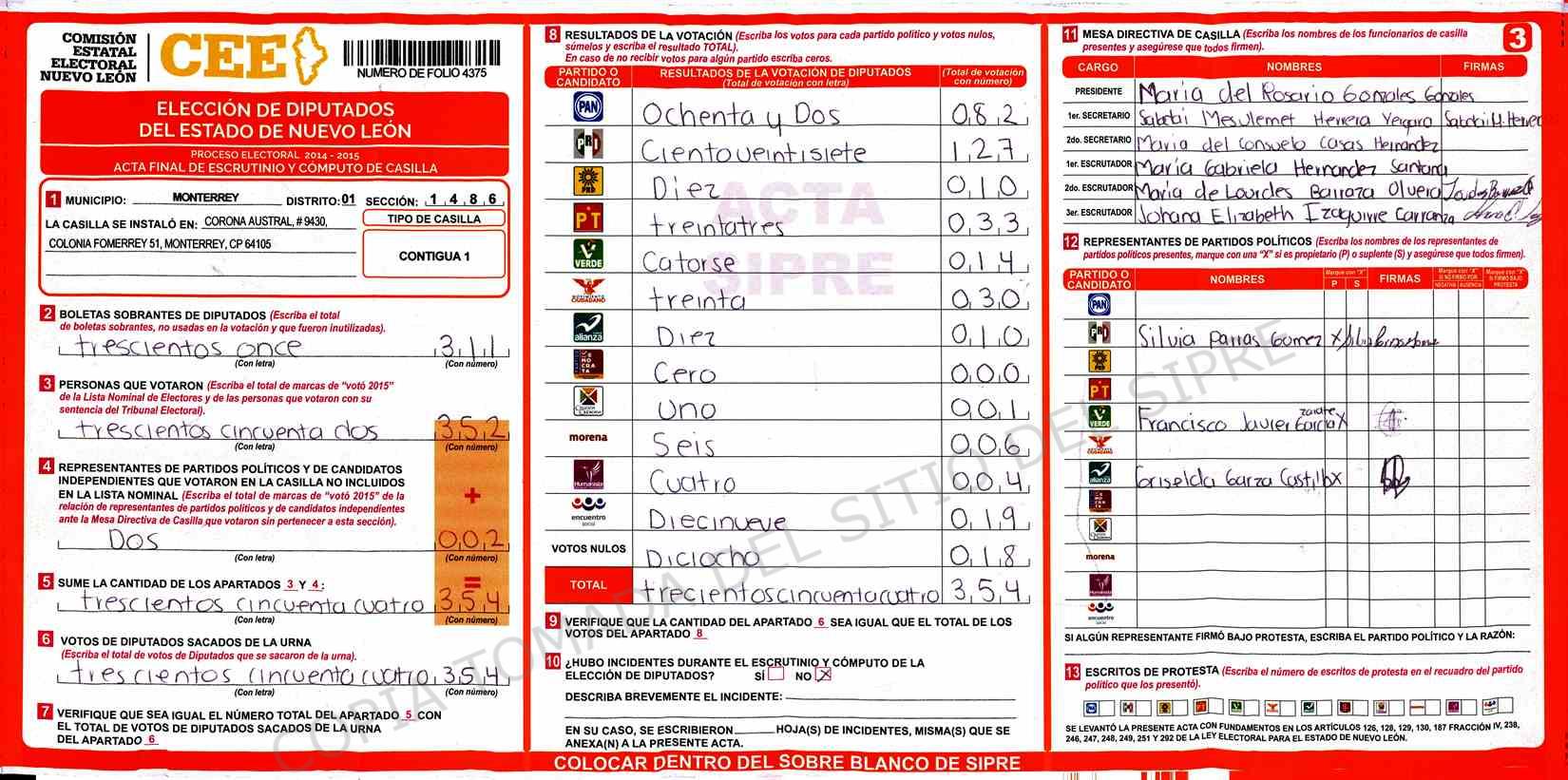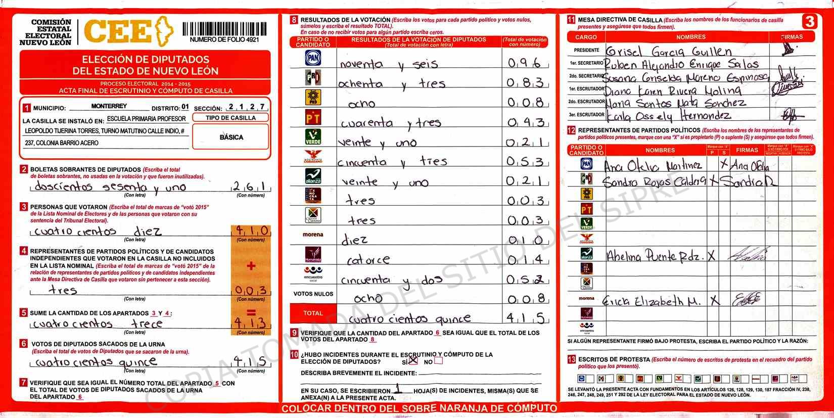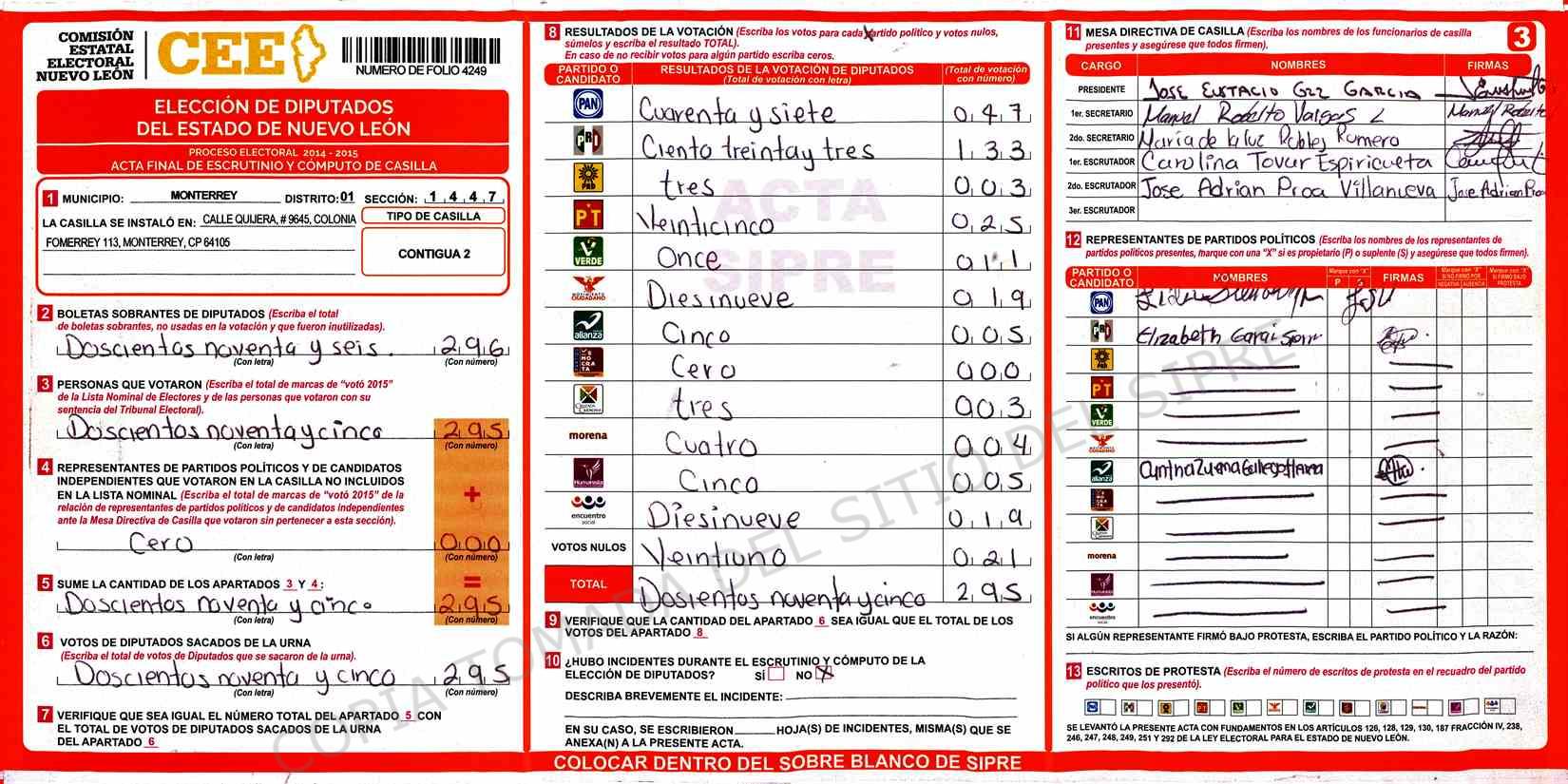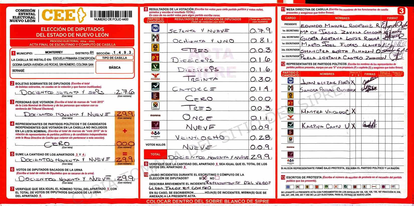 | Claves de Incidencia: | (1) Ilegible, (2) Mutilada, (3) Presenta Correcciones, (4) Presenta Borrones, (5) En Blanco, (6) Cifras Remarcadas, (7) Cifras de Mas, (8) Copiado Movido, (9) Con Signos Inválidos, (10) Excede Lista Nominal, (11) Otra |