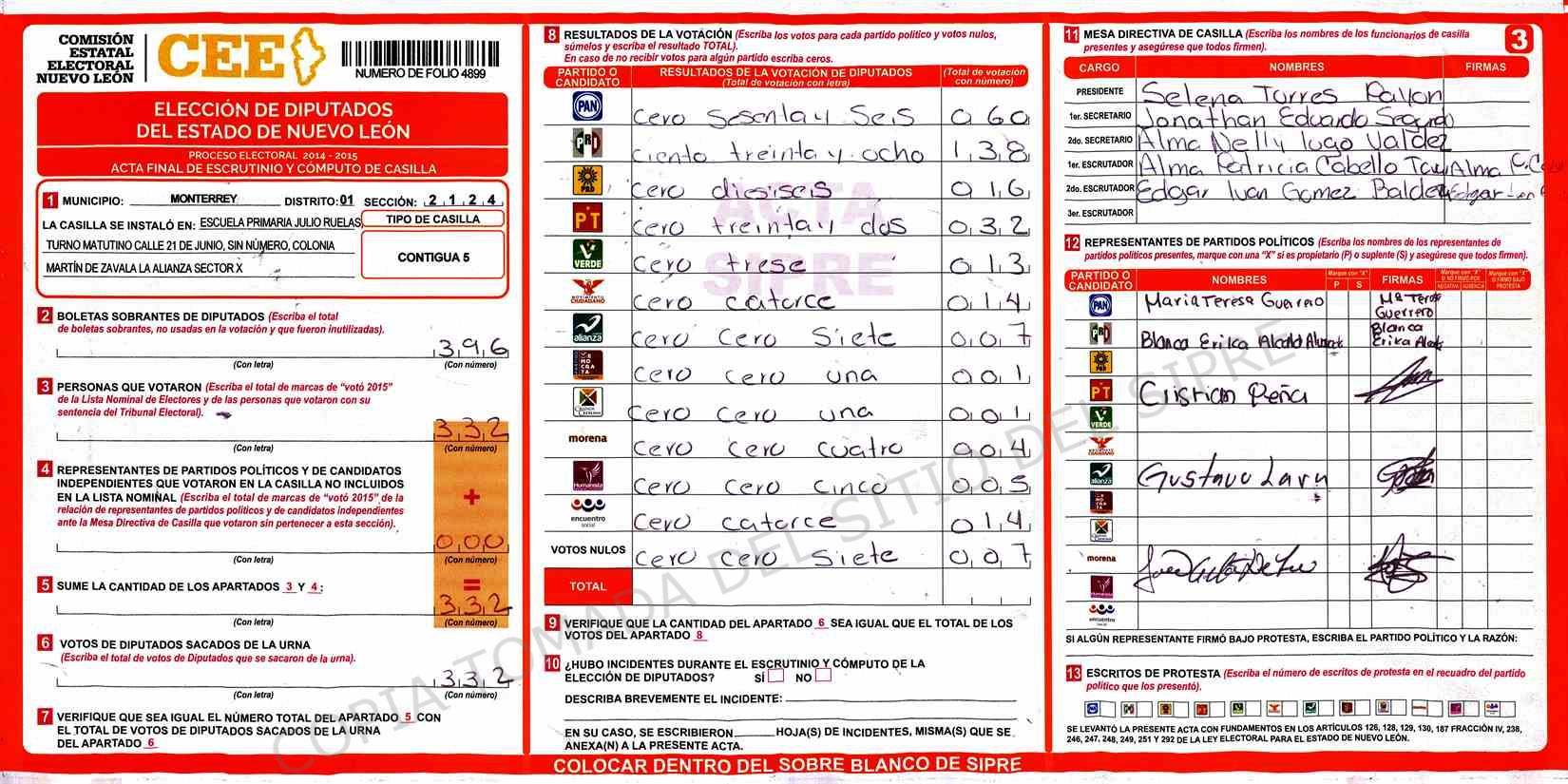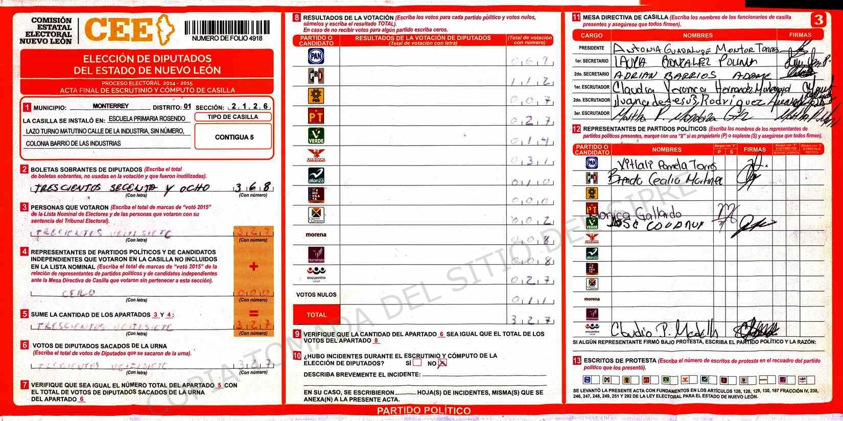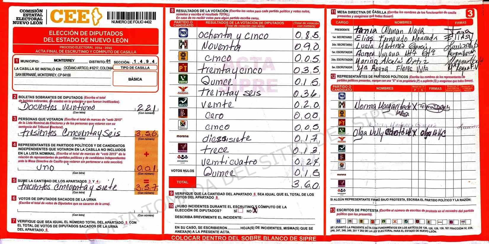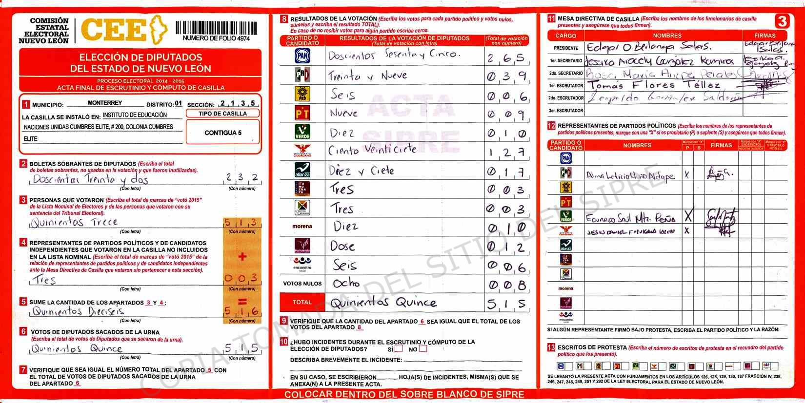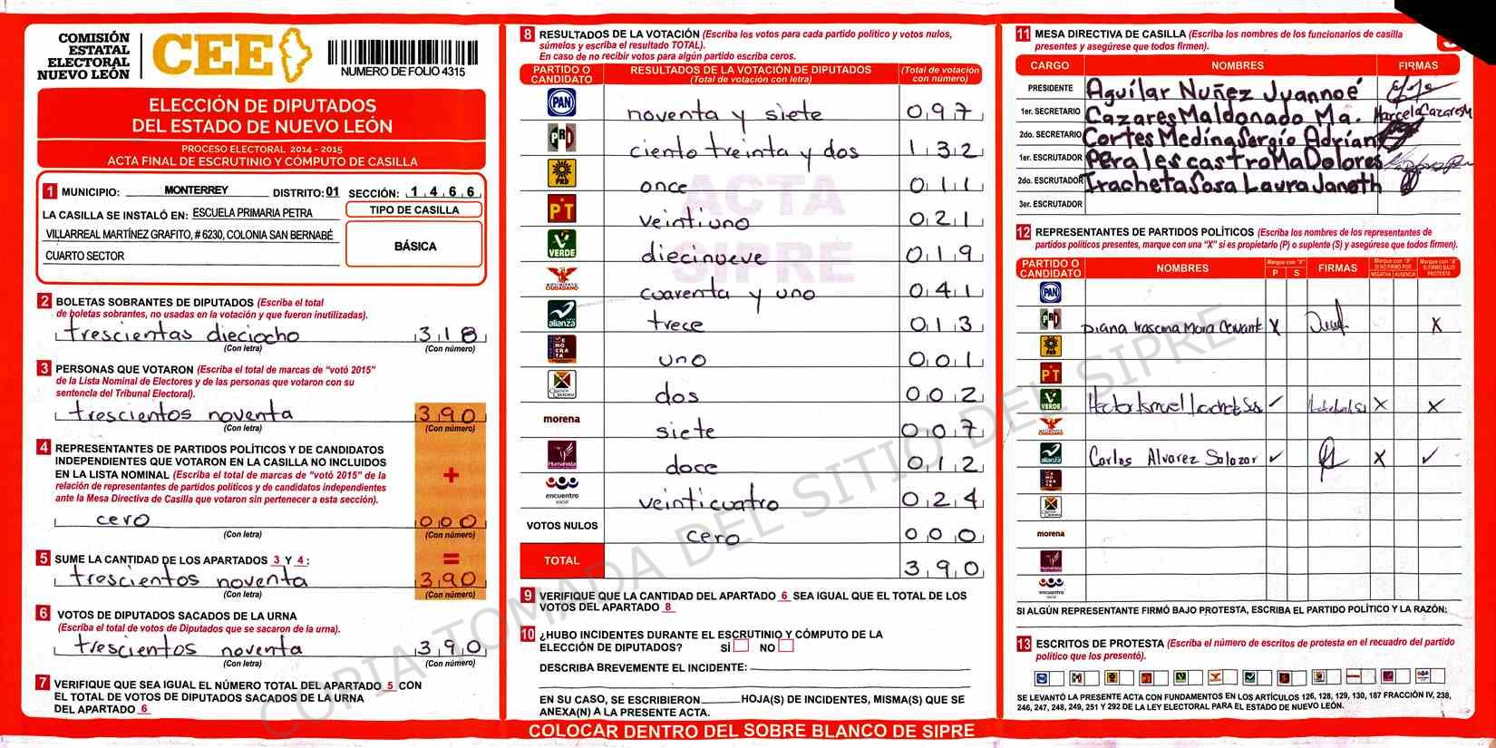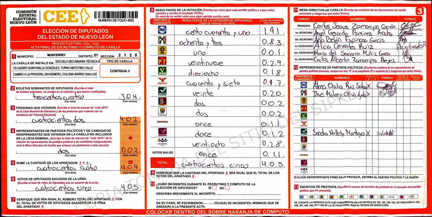 | Claves de Incidencia: | (1) Ilegible, (2) Mutilada, (3) Presenta Correcciones, (4) Presenta Borrones, (5) En Blanco, (6) Cifras Remarcadas, (7) Cifras de Mas, (8) Copiado Movido, (9) Con Signos Inválidos, (10) Excede Lista Nominal, (11) Otra |