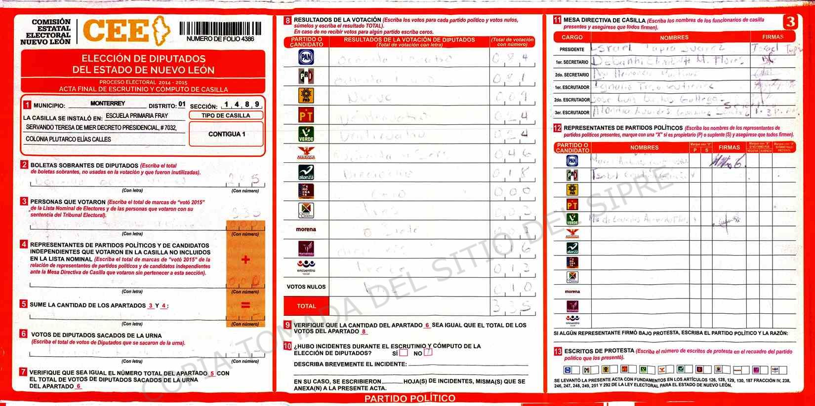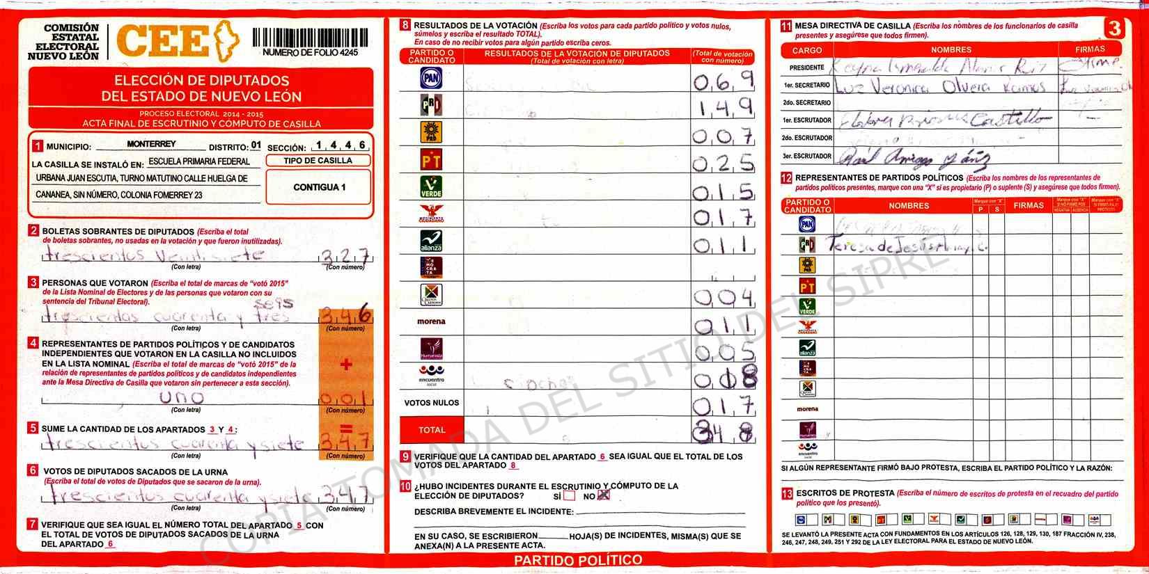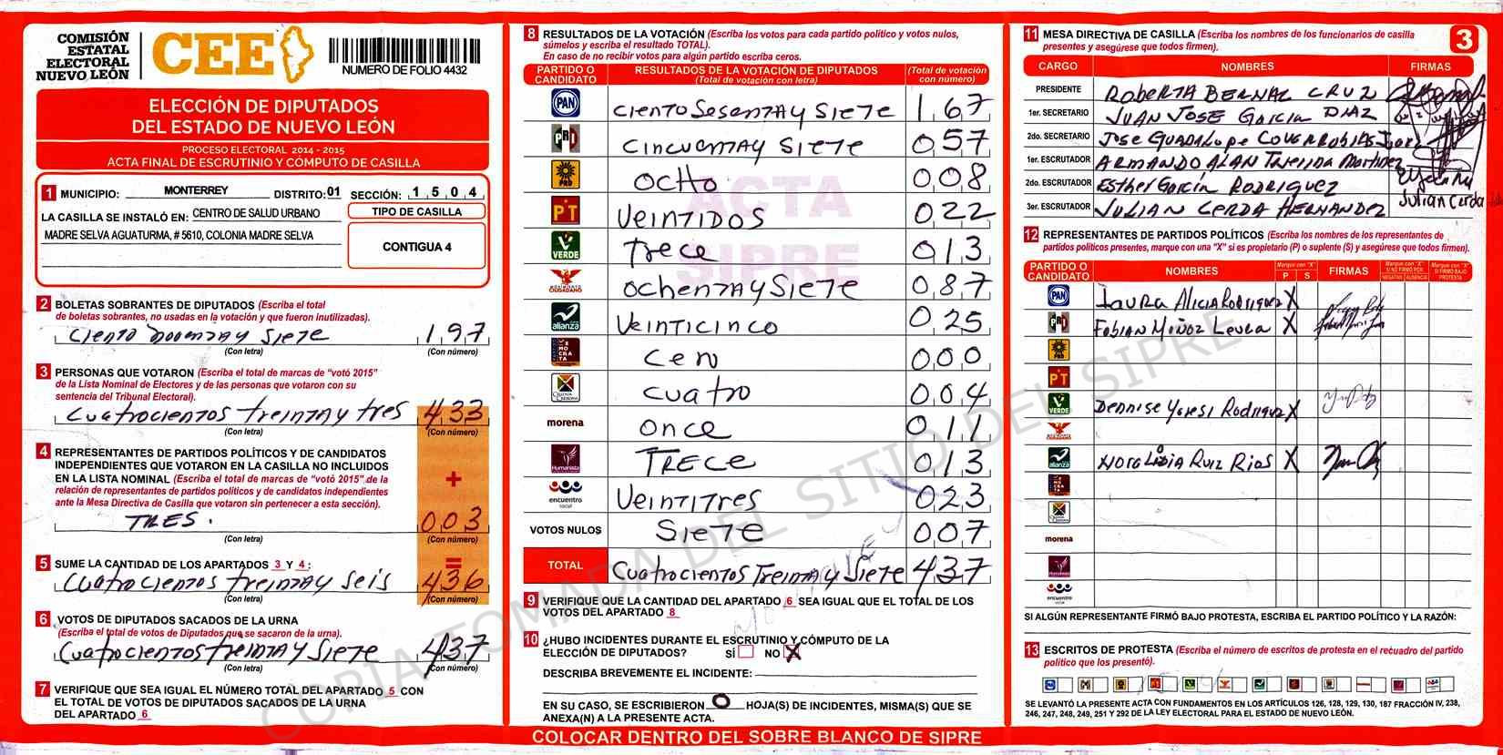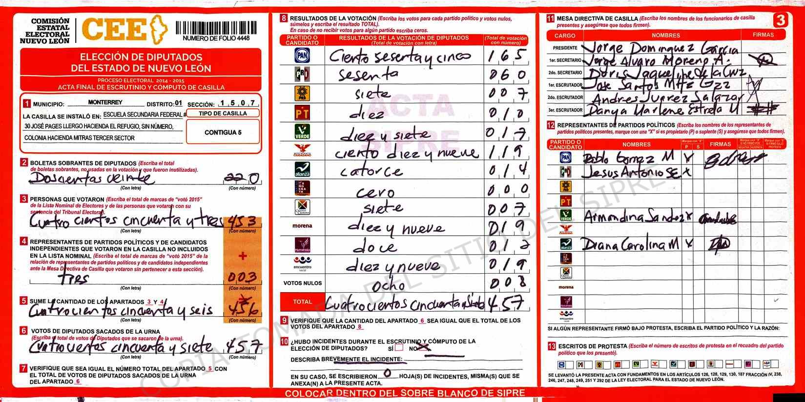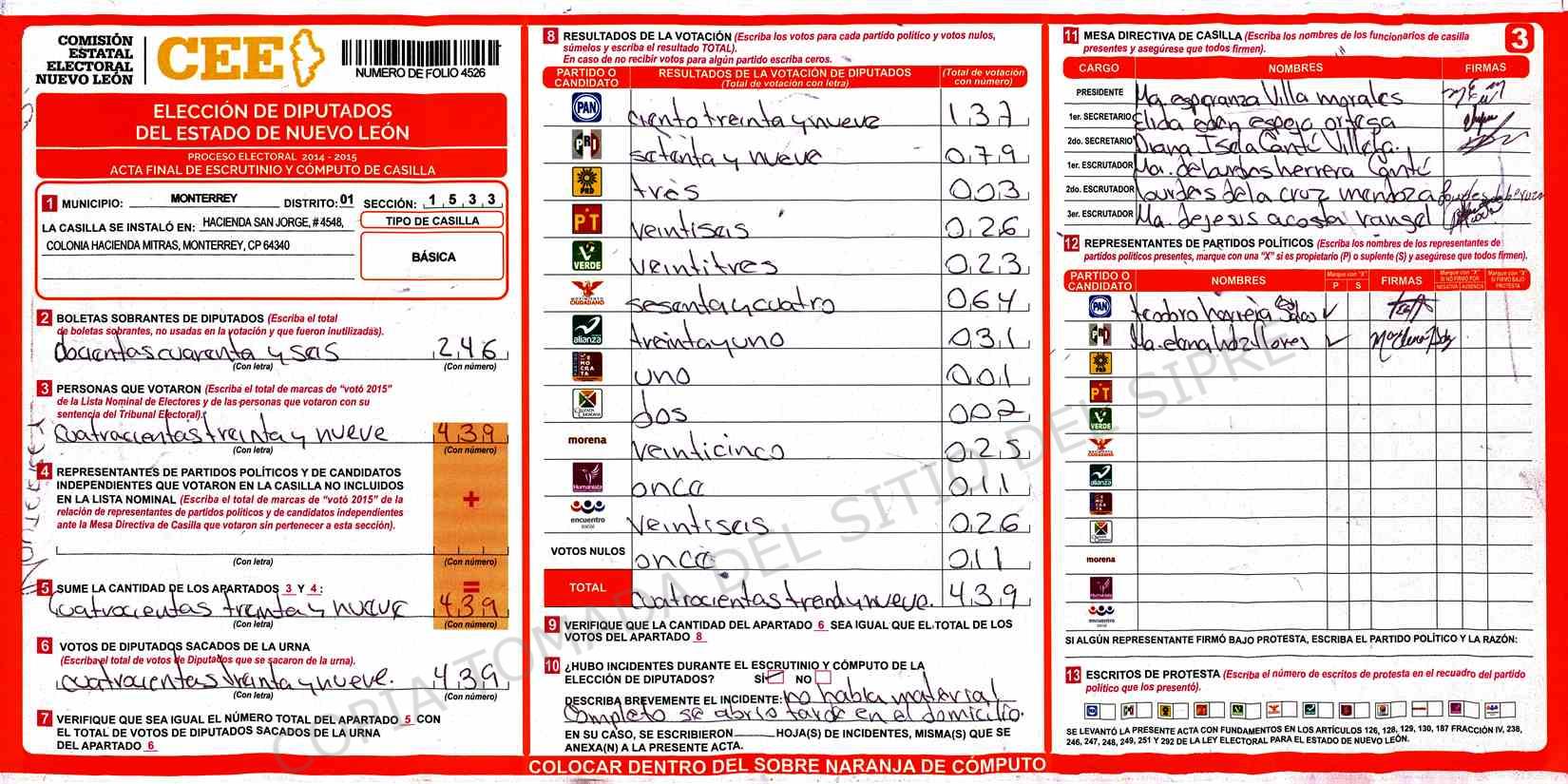 | Claves de Incidencia: | (1) Ilegible, (2) Mutilada, (3) Presenta Correcciones, (4) Presenta Borrones, (5) En Blanco, (6) Cifras Remarcadas, (7) Cifras de Mas, (8) Copiado Movido, (9) Con Signos Inválidos, (10) Excede Lista Nominal, (11) Otra |