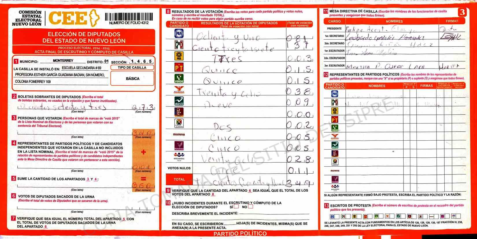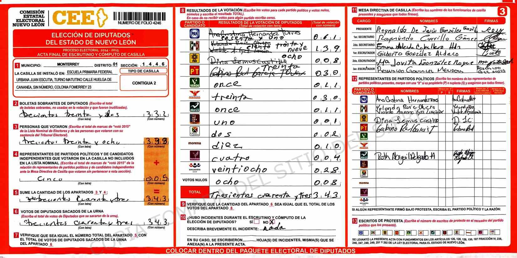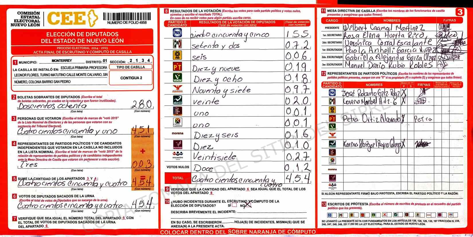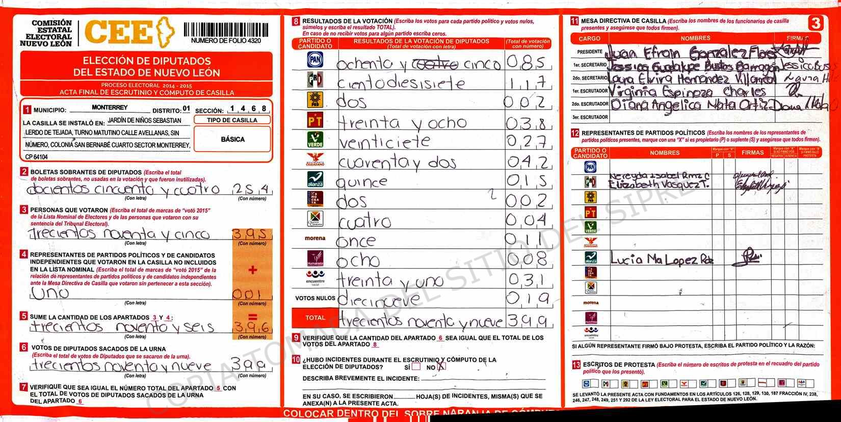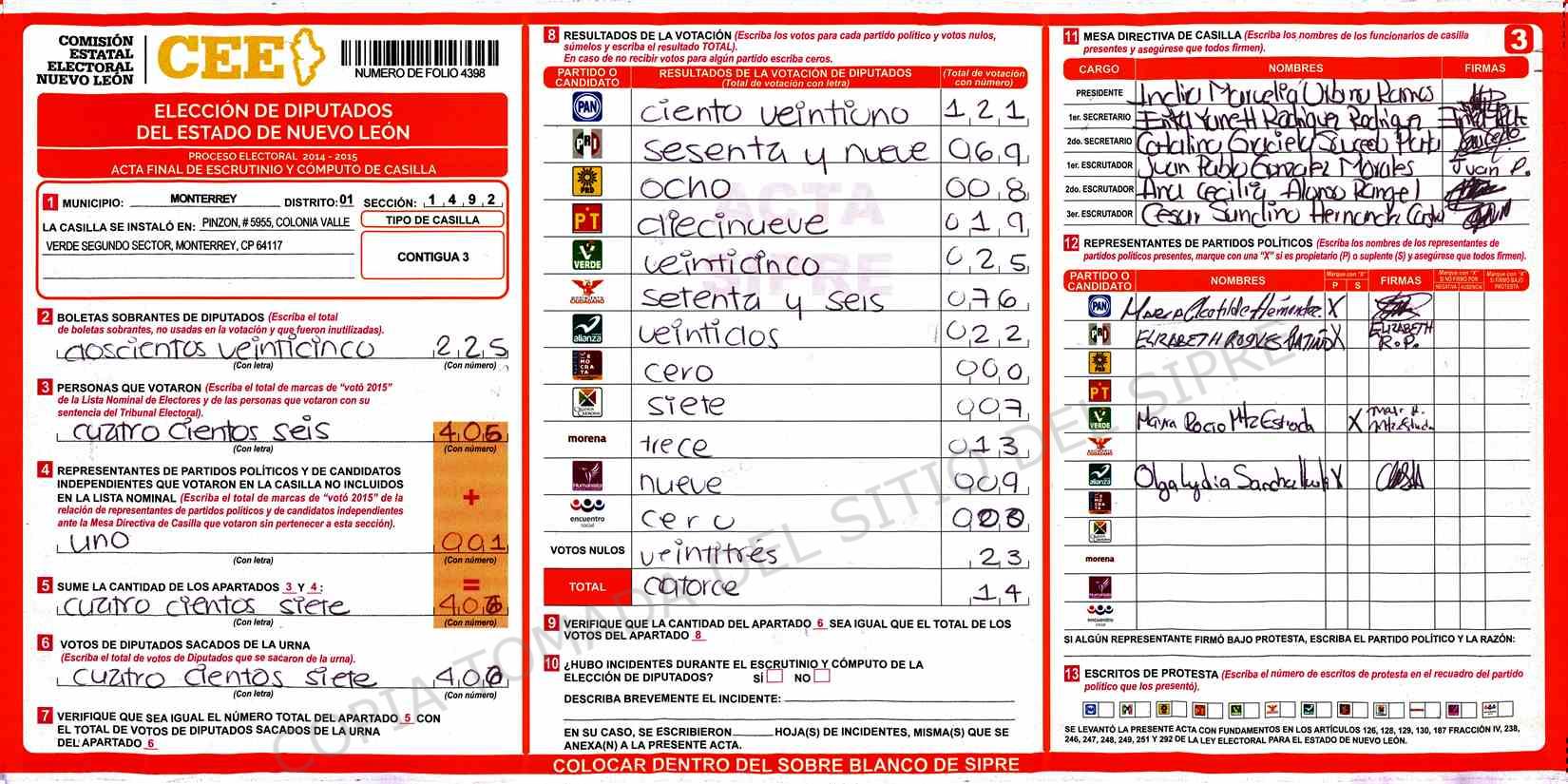 | Claves de Incidencia: | (1) Ilegible, (2) Mutilada, (3) Presenta Correcciones, (4) Presenta Borrones, (5) En Blanco, (6) Cifras Remarcadas, (7) Cifras de Mas, (8) Copiado Movido, (9) Con Signos Inválidos, (10) Excede Lista Nominal, (11) Otra |