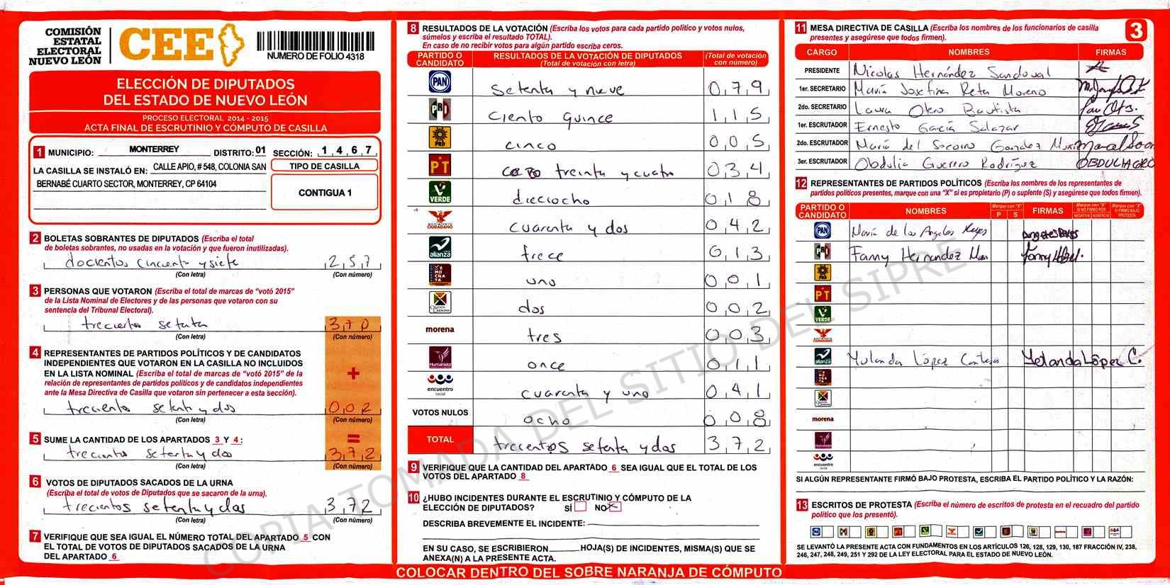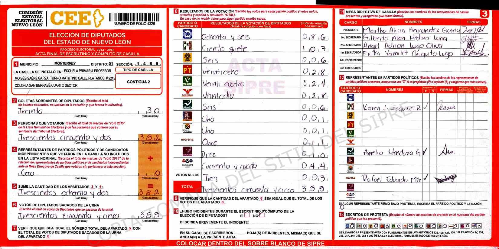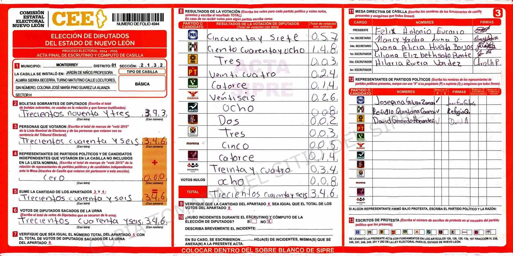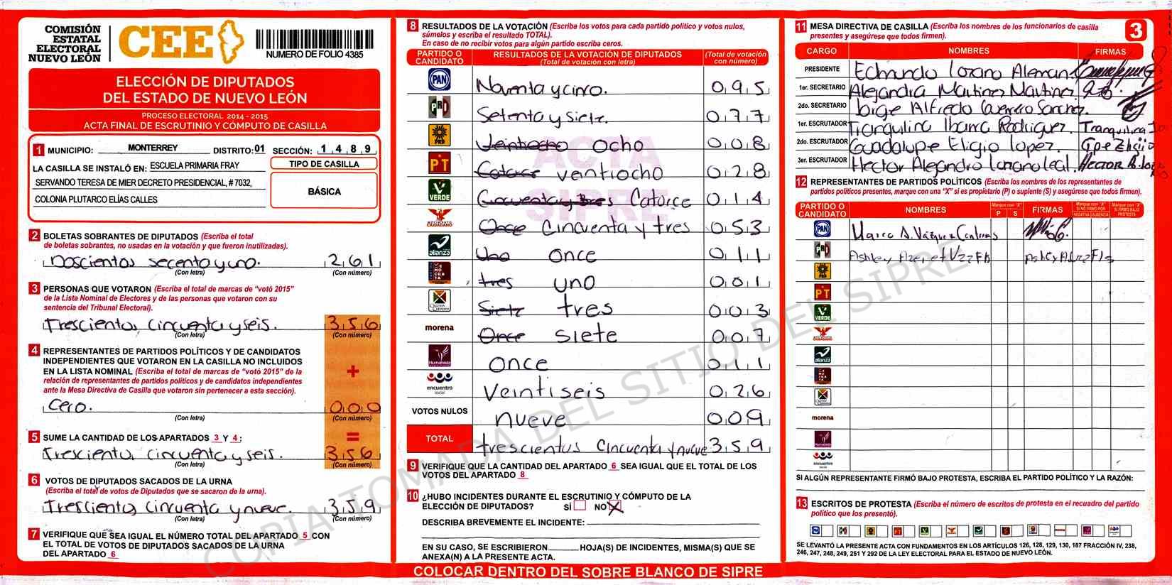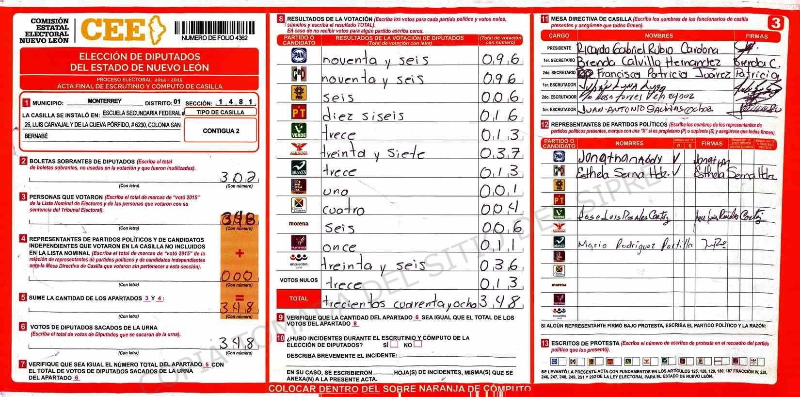 | Claves de Incidencia: | (1) Ilegible, (2) Mutilada, (3) Presenta Correcciones, (4) Presenta Borrones, (5) En Blanco, (6) Cifras Remarcadas, (7) Cifras de Mas, (8) Copiado Movido, (9) Con Signos Inválidos, (10) Excede Lista Nominal, (11) Otra |