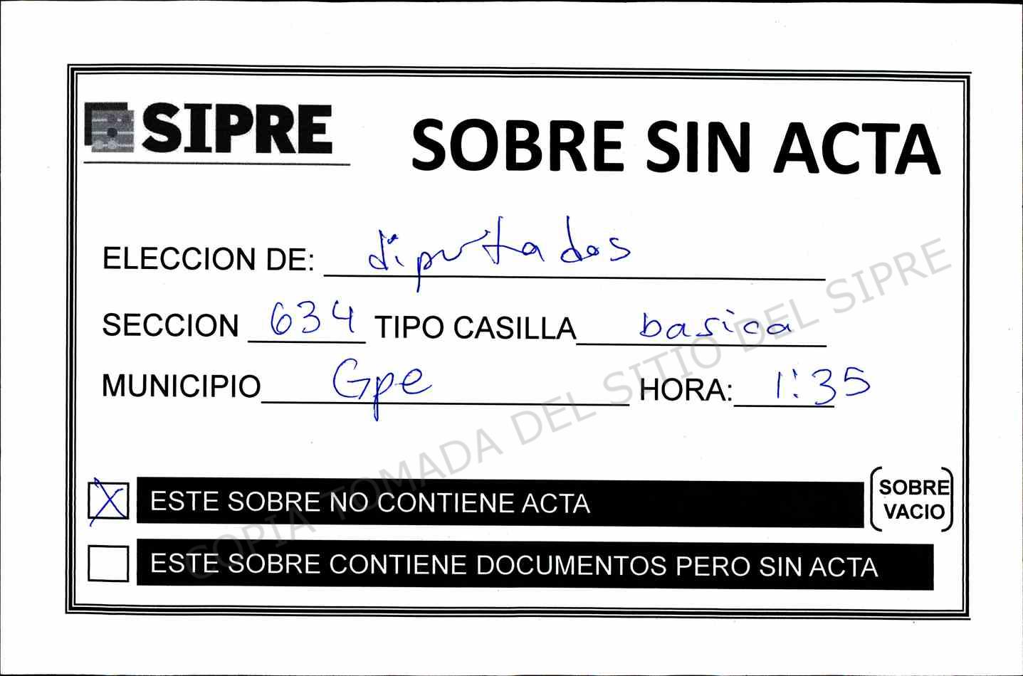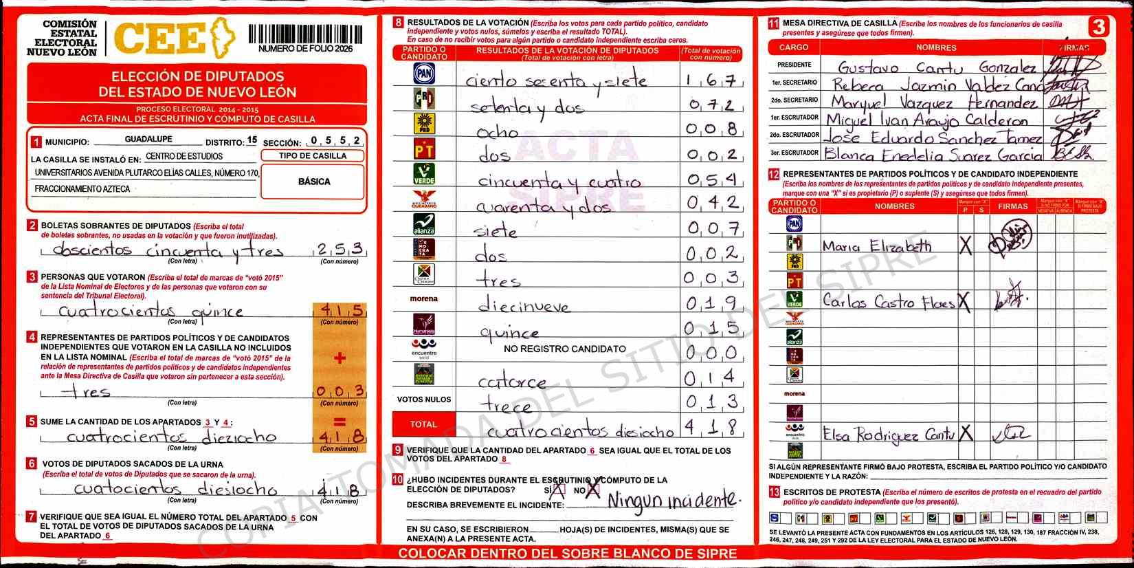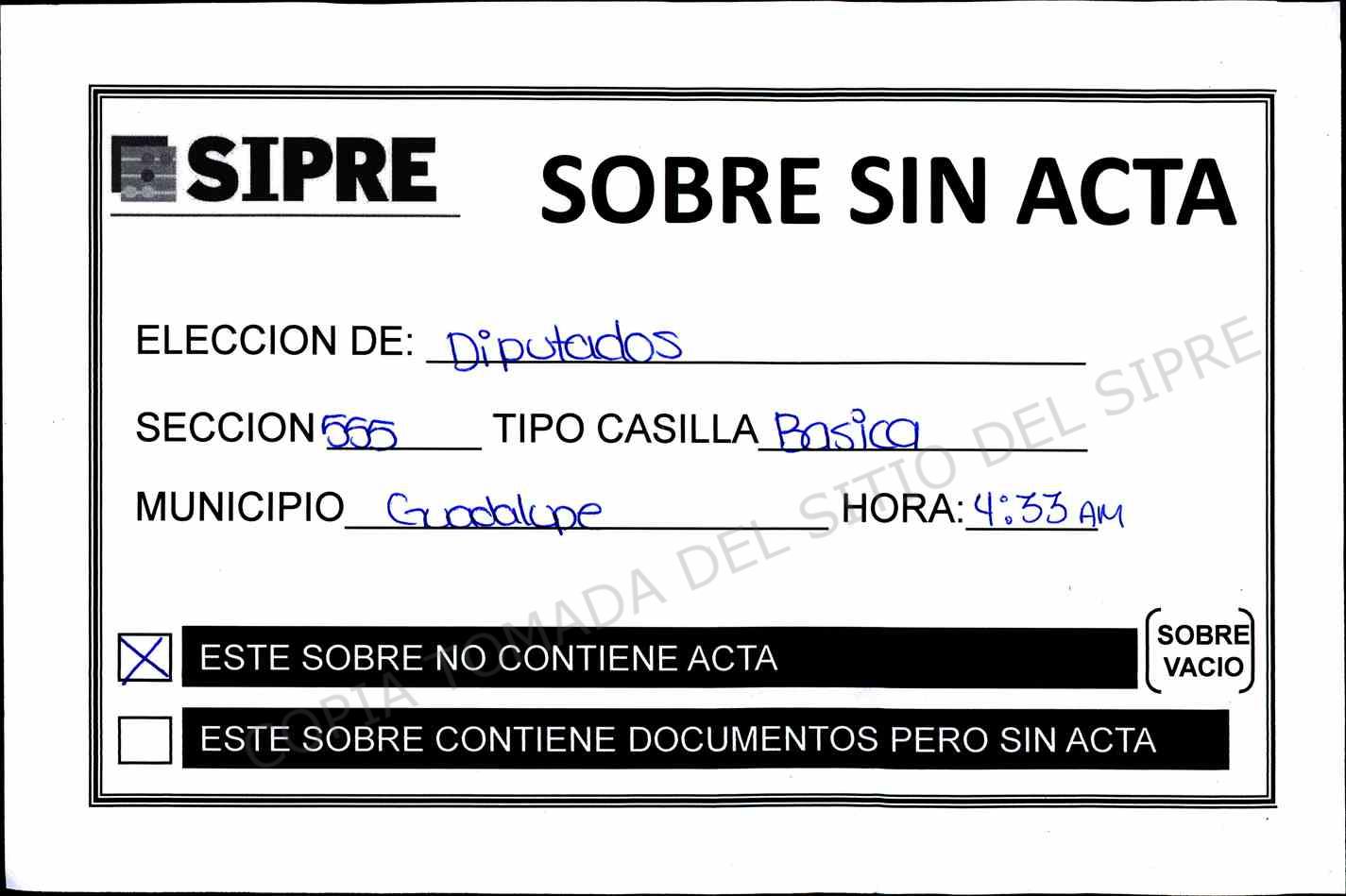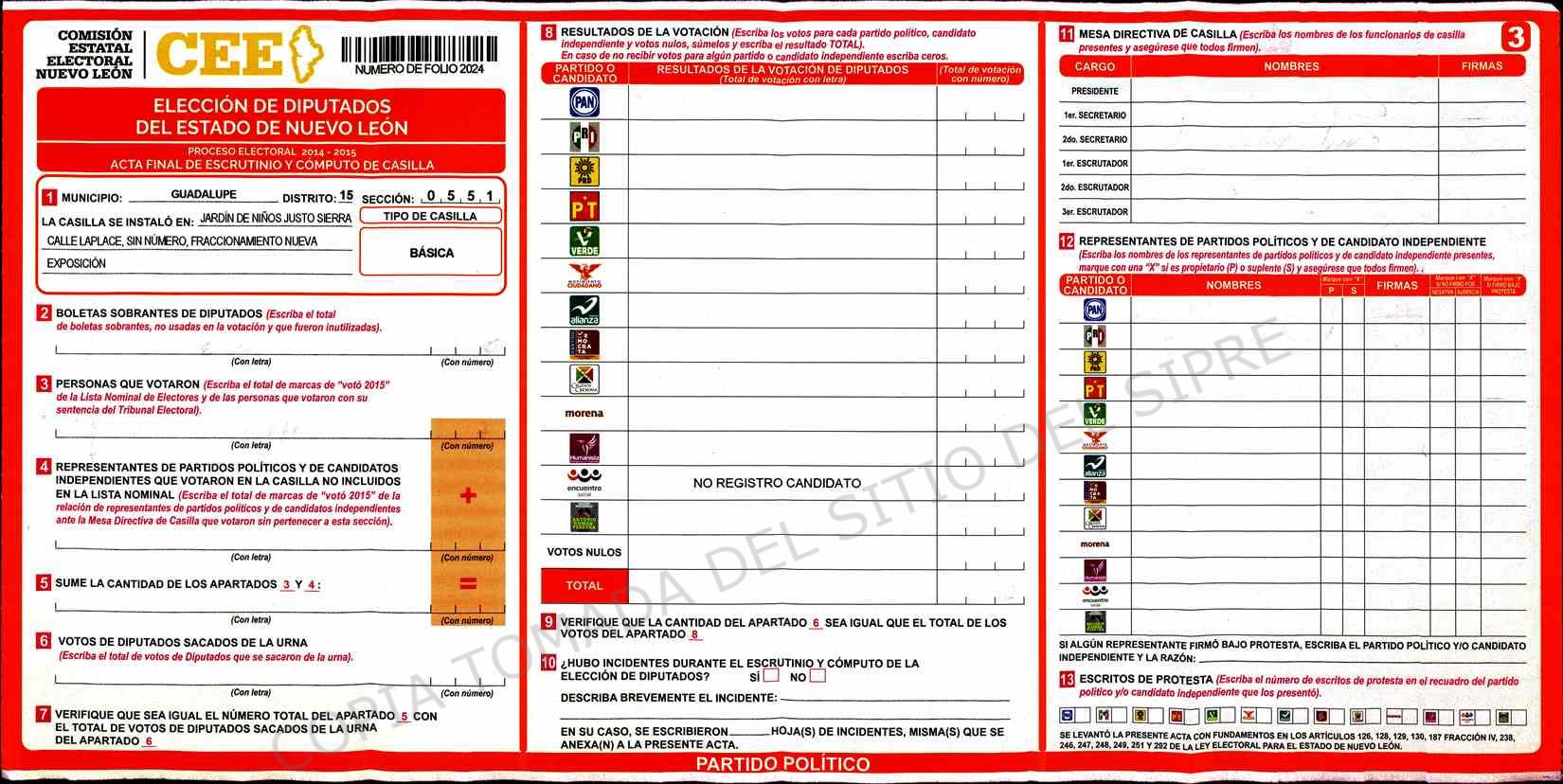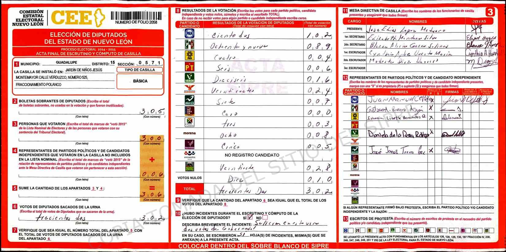 | Claves de Incidencia: | (1) Ilegible, (2) Mutilada, (3) Presenta Correcciones, (4) Presenta Borrones, (5) En Blanco, (6) Cifras Remarcadas, (7) Cifras de Mas, (8) Copiado Movido, (9) Con Signos Inválidos, (10) Excede Lista Nominal, (11) Otra |