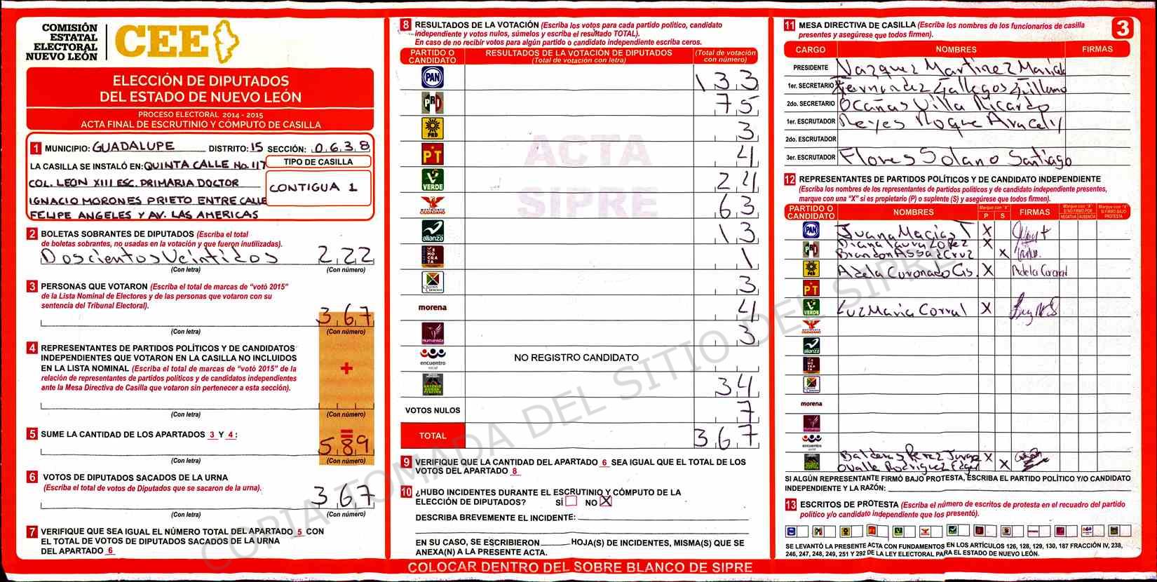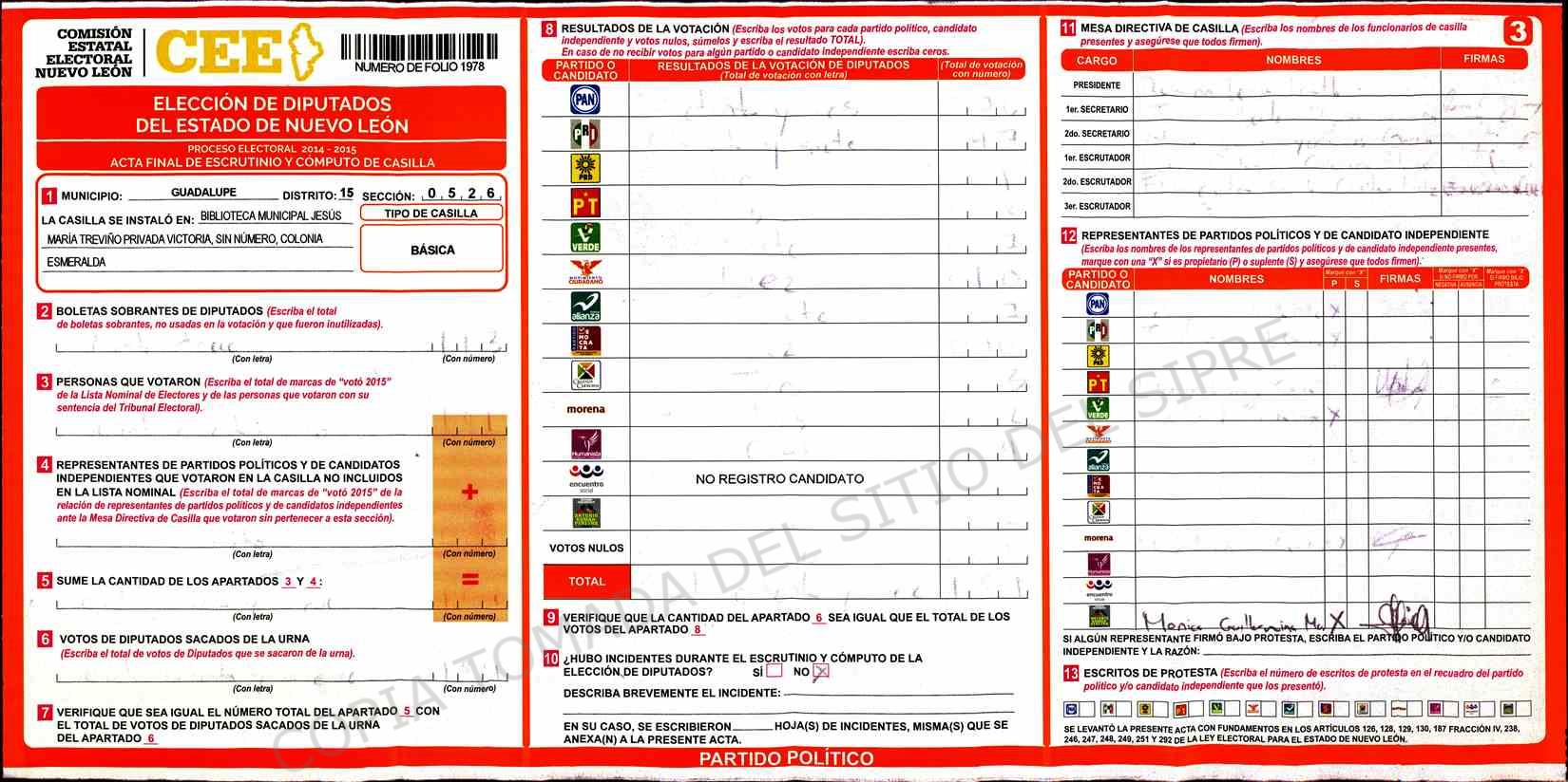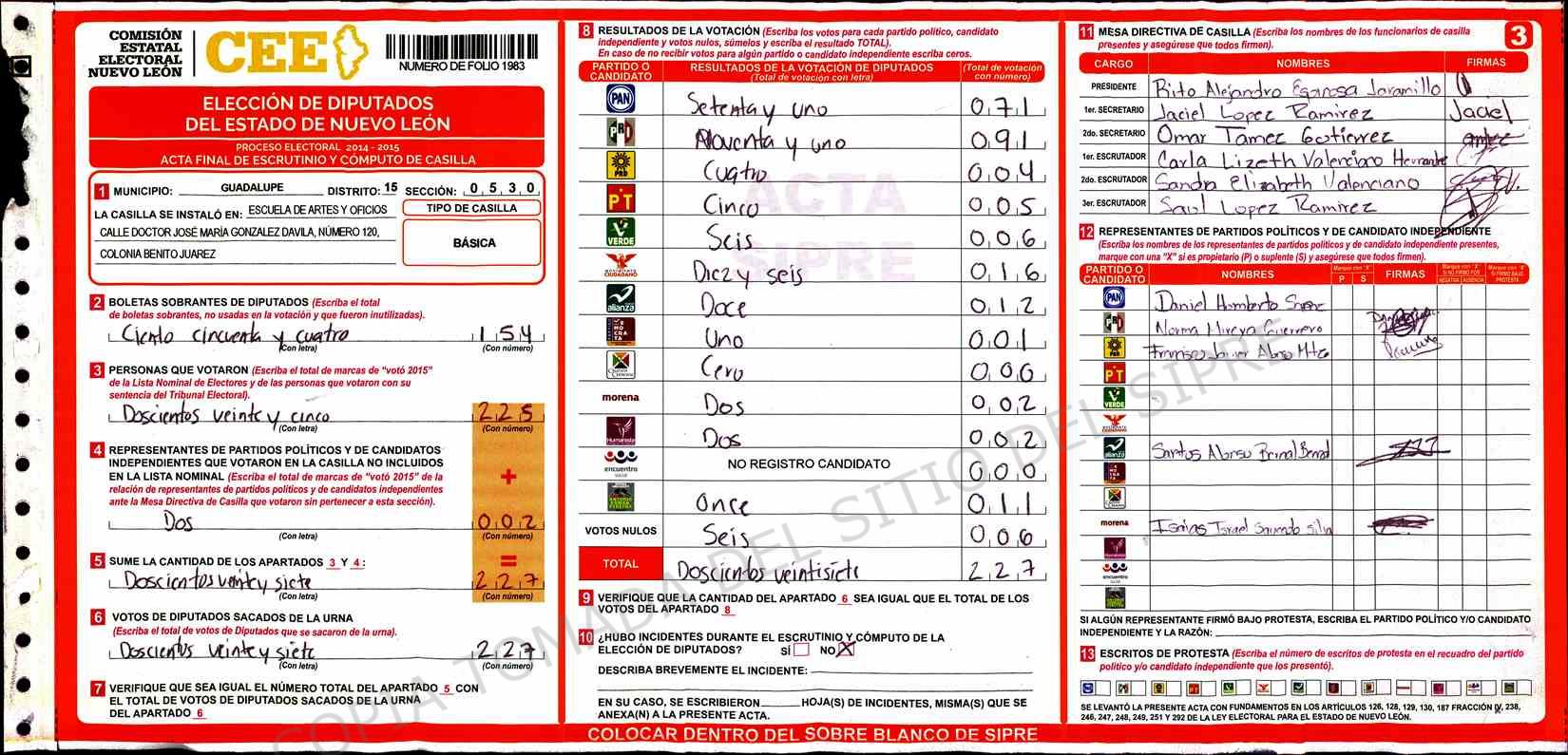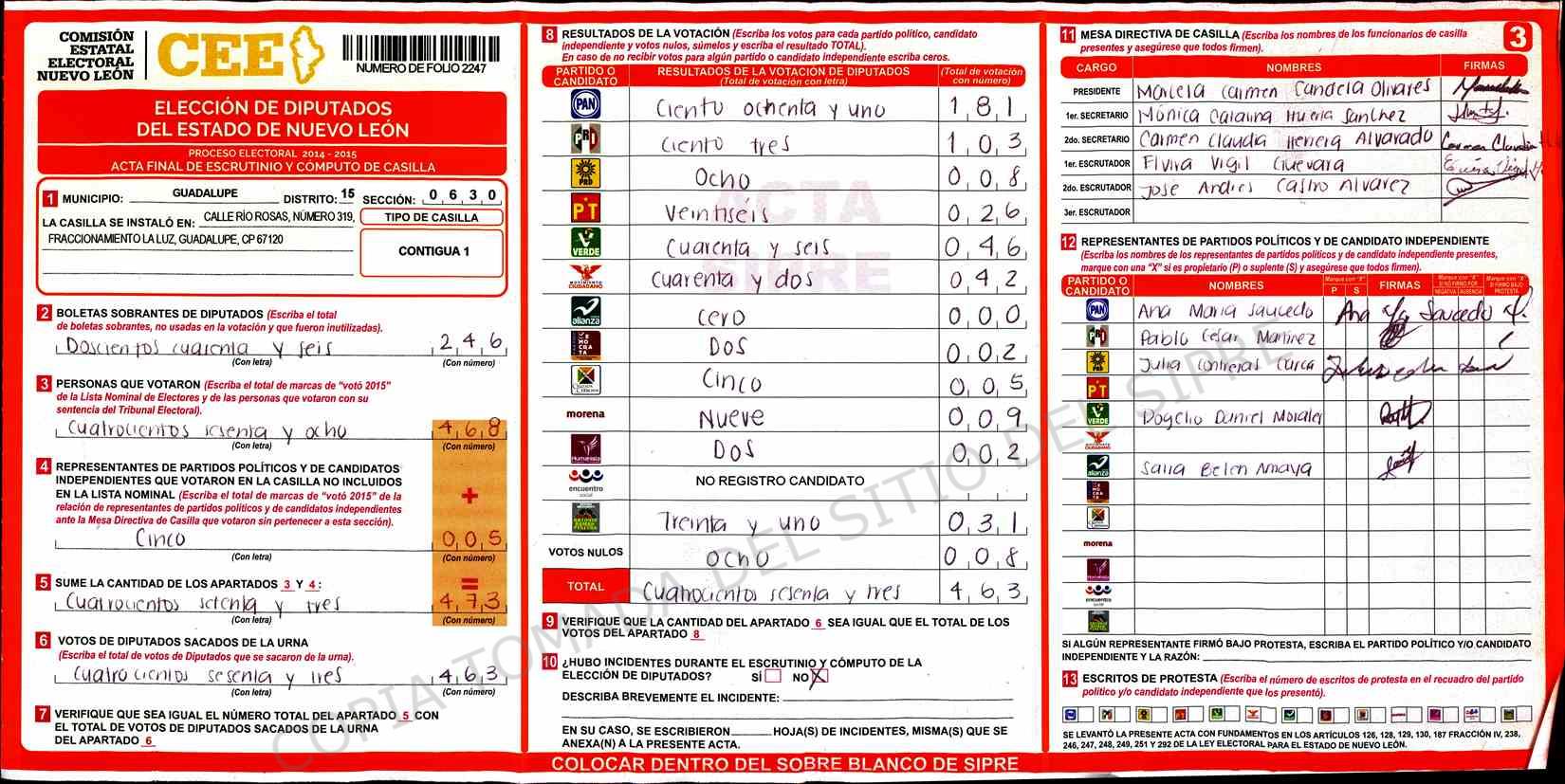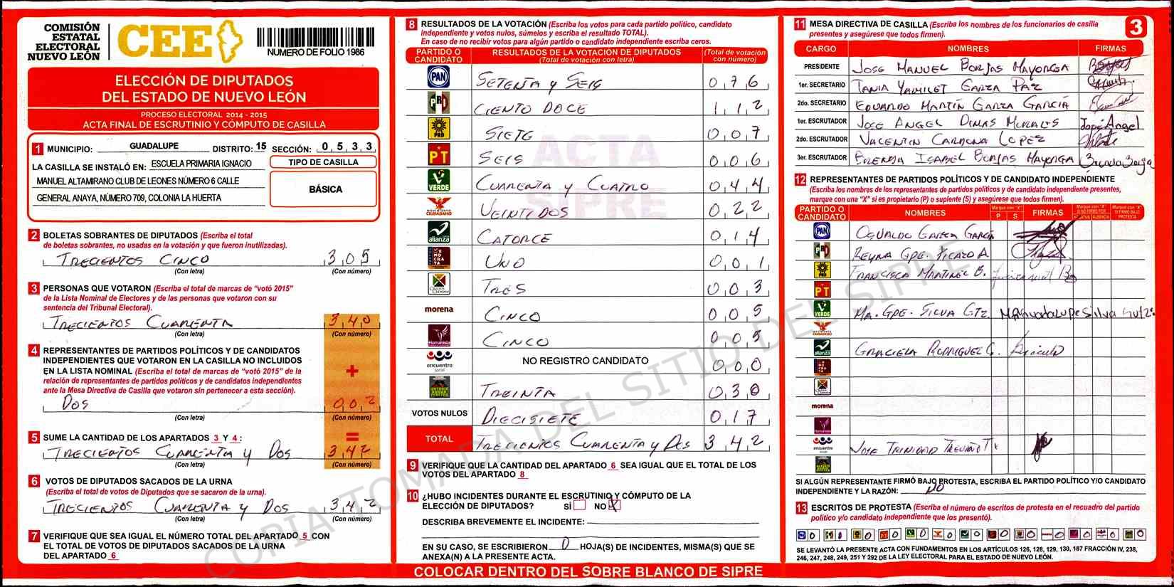 | Claves de Incidencia: | (1) Ilegible, (2) Mutilada, (3) Presenta Correcciones, (4) Presenta Borrones, (5) En Blanco, (6) Cifras Remarcadas, (7) Cifras de Mas, (8) Copiado Movido, (9) Con Signos Inválidos, (10) Excede Lista Nominal, (11) Otra |