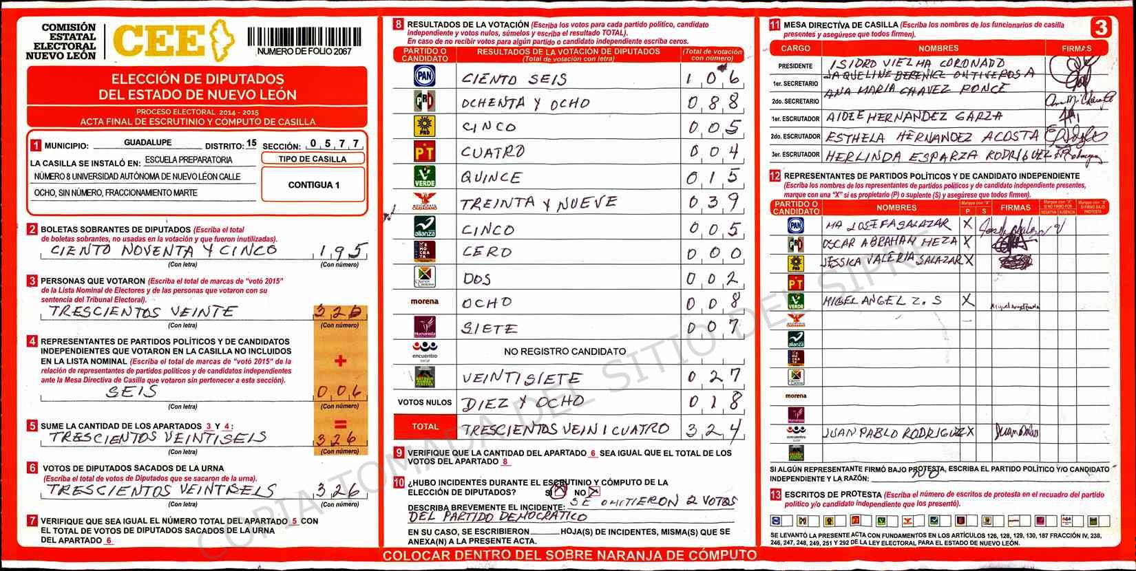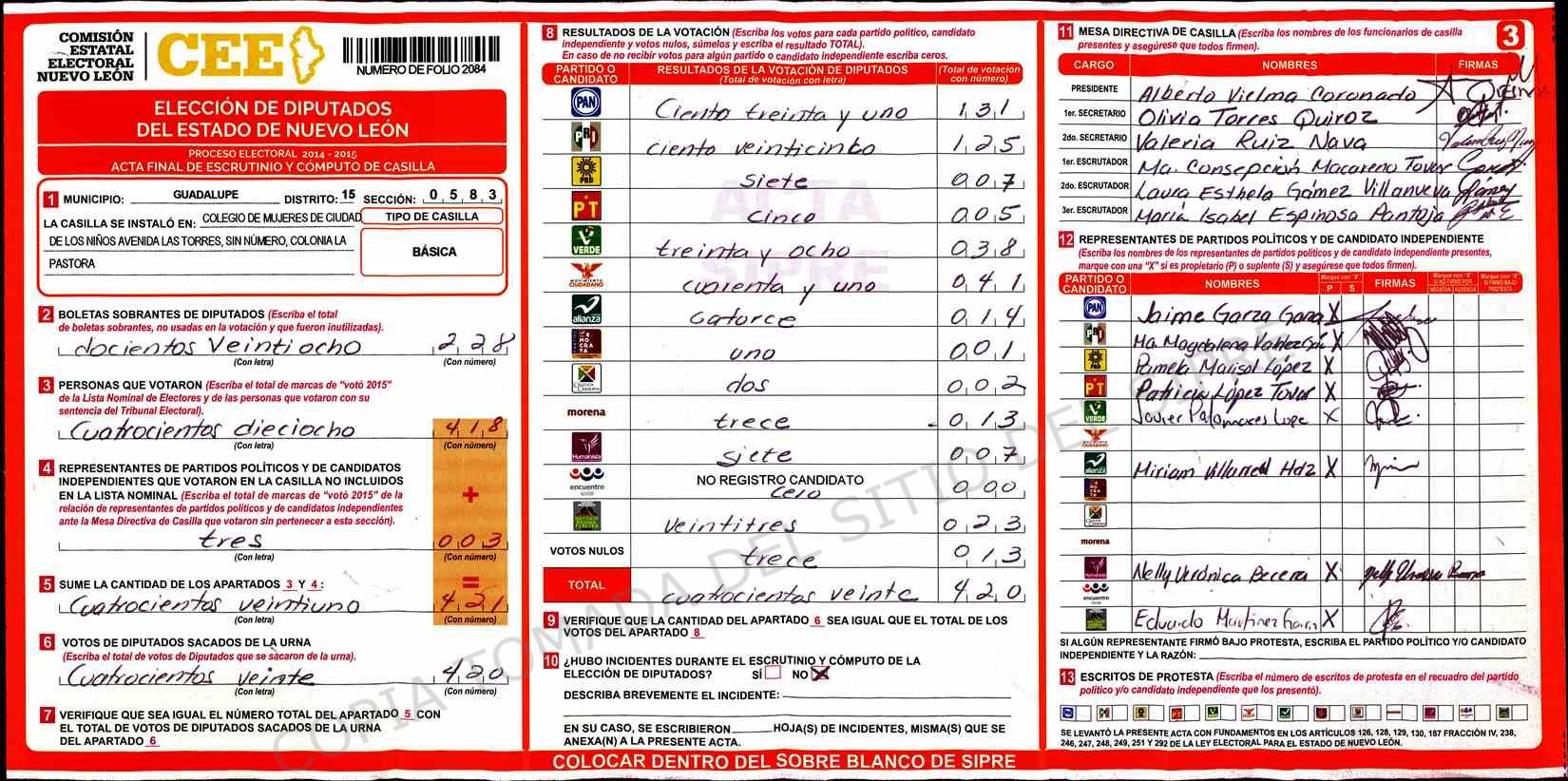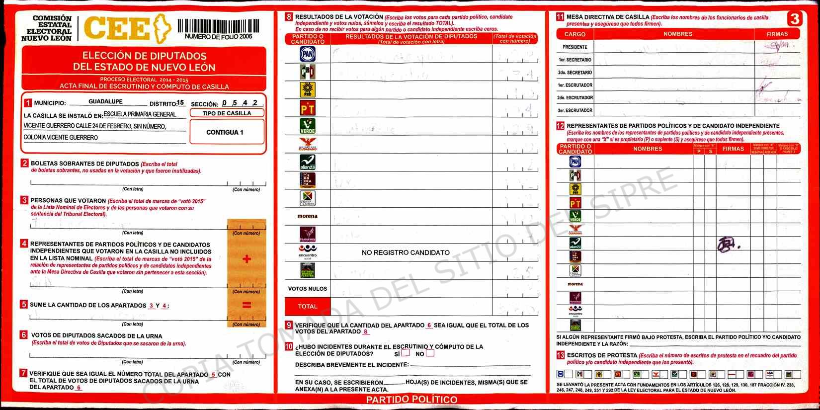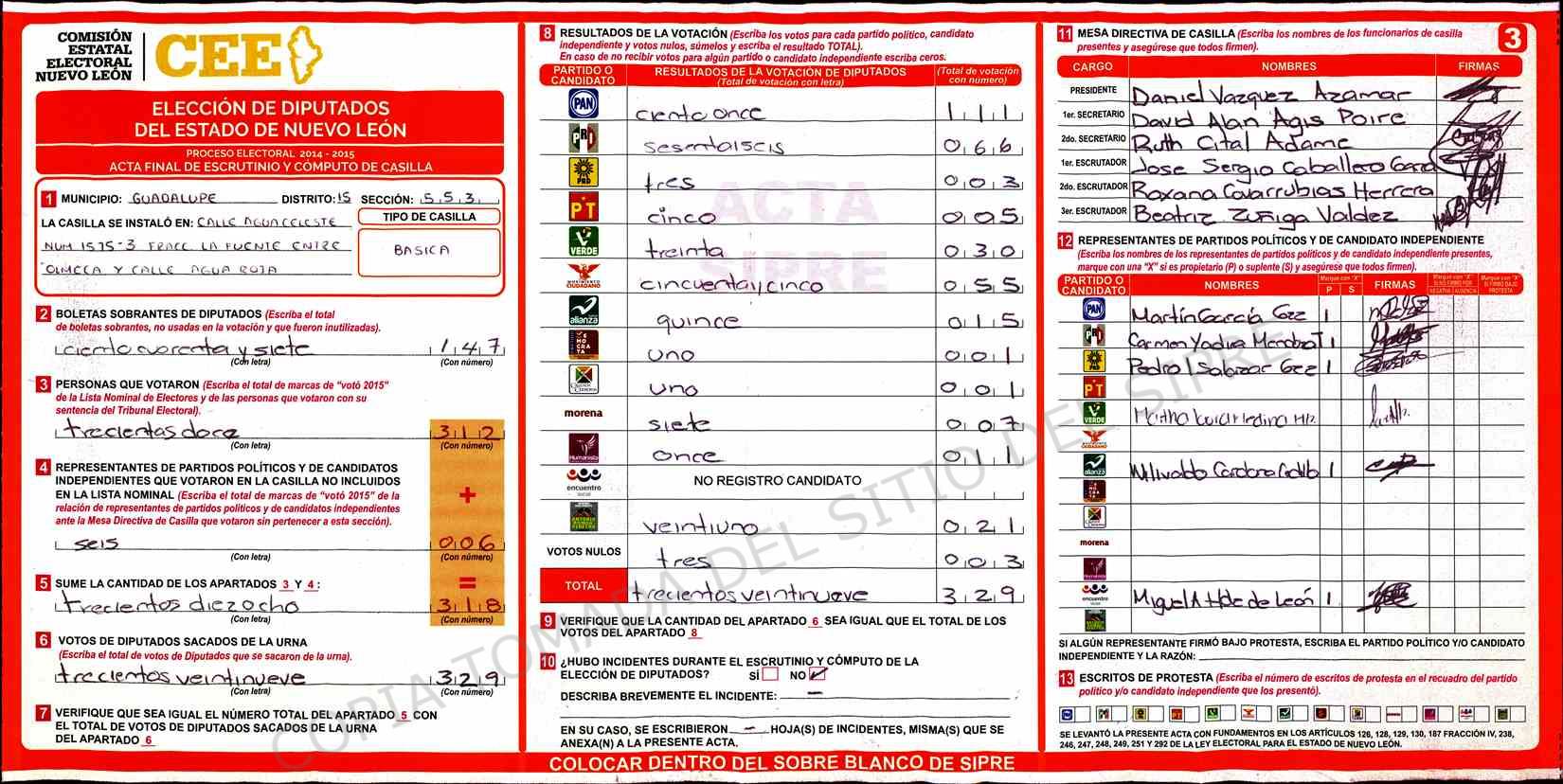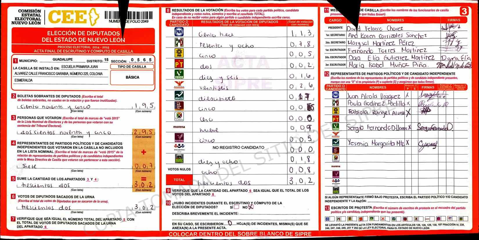| Claves de Incidencia: | (1) Ilegible, (2) Mutilada, (3) Presenta Correcciones, (4) Presenta Borrones, (5) En Blanco, (6) Cifras Remarcadas, (7) Cifras de Mas, (8) Copiado Movido, (9) Con Signos Inválidos, (10) Excede Lista Nominal, (11) Otra |