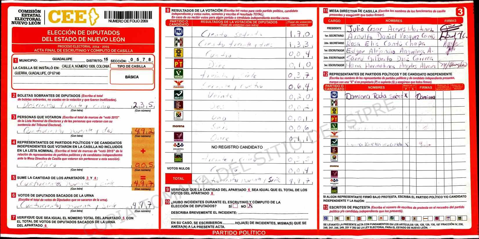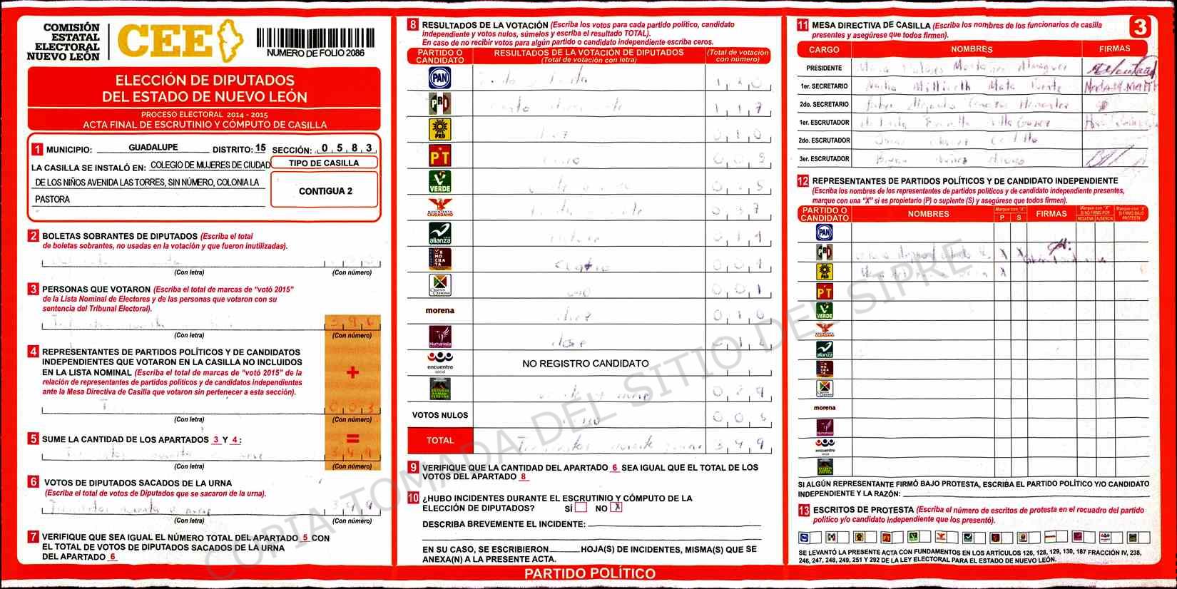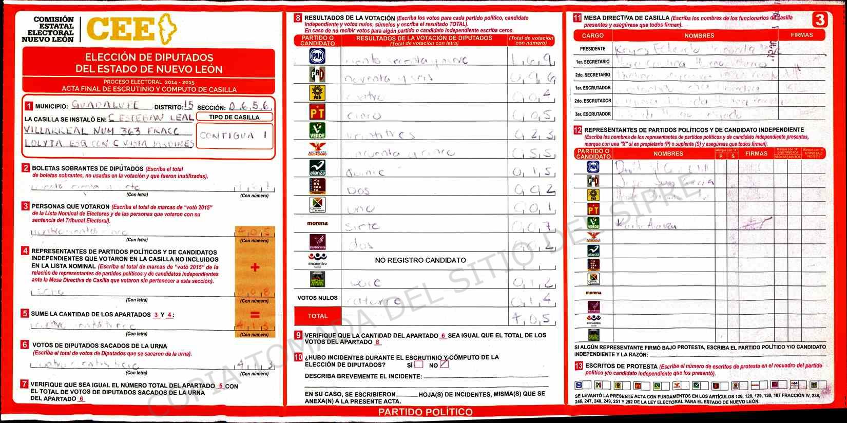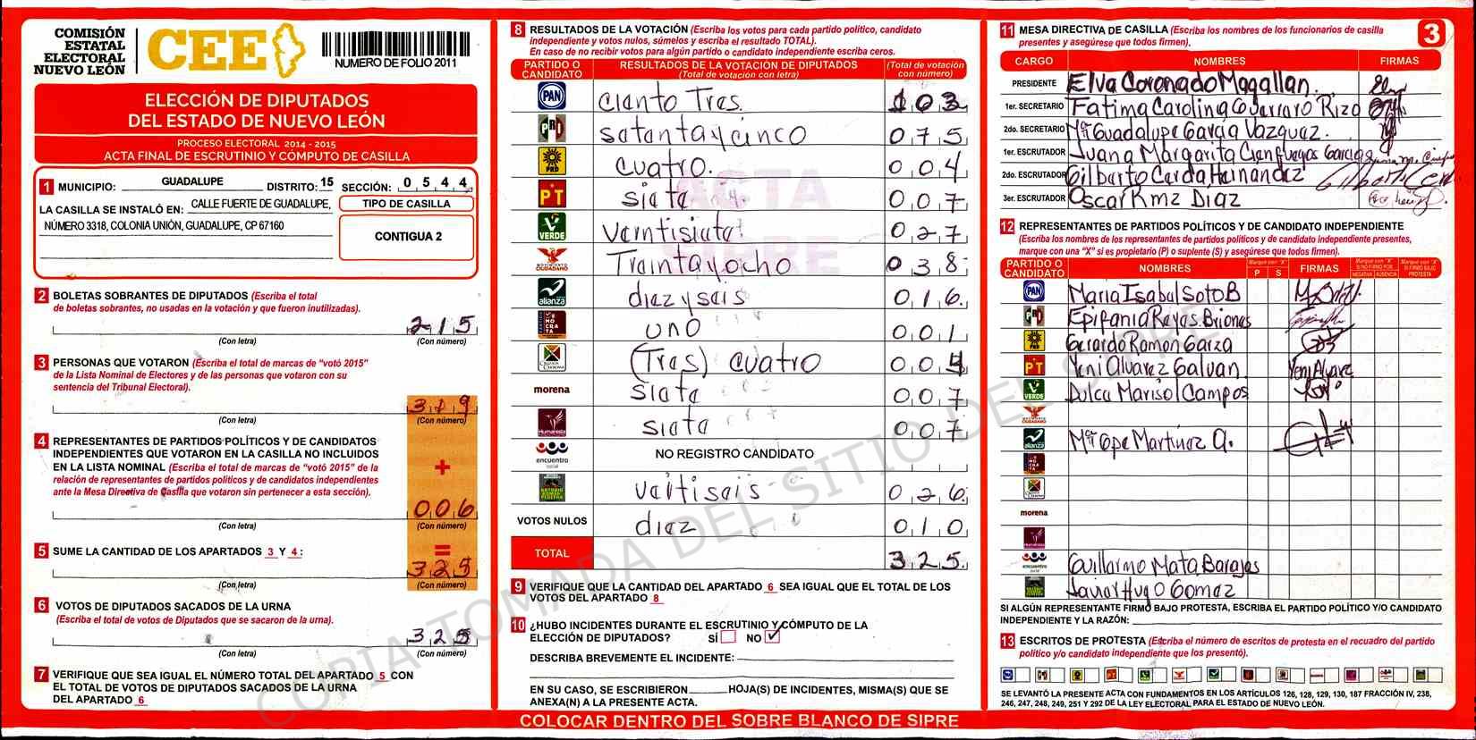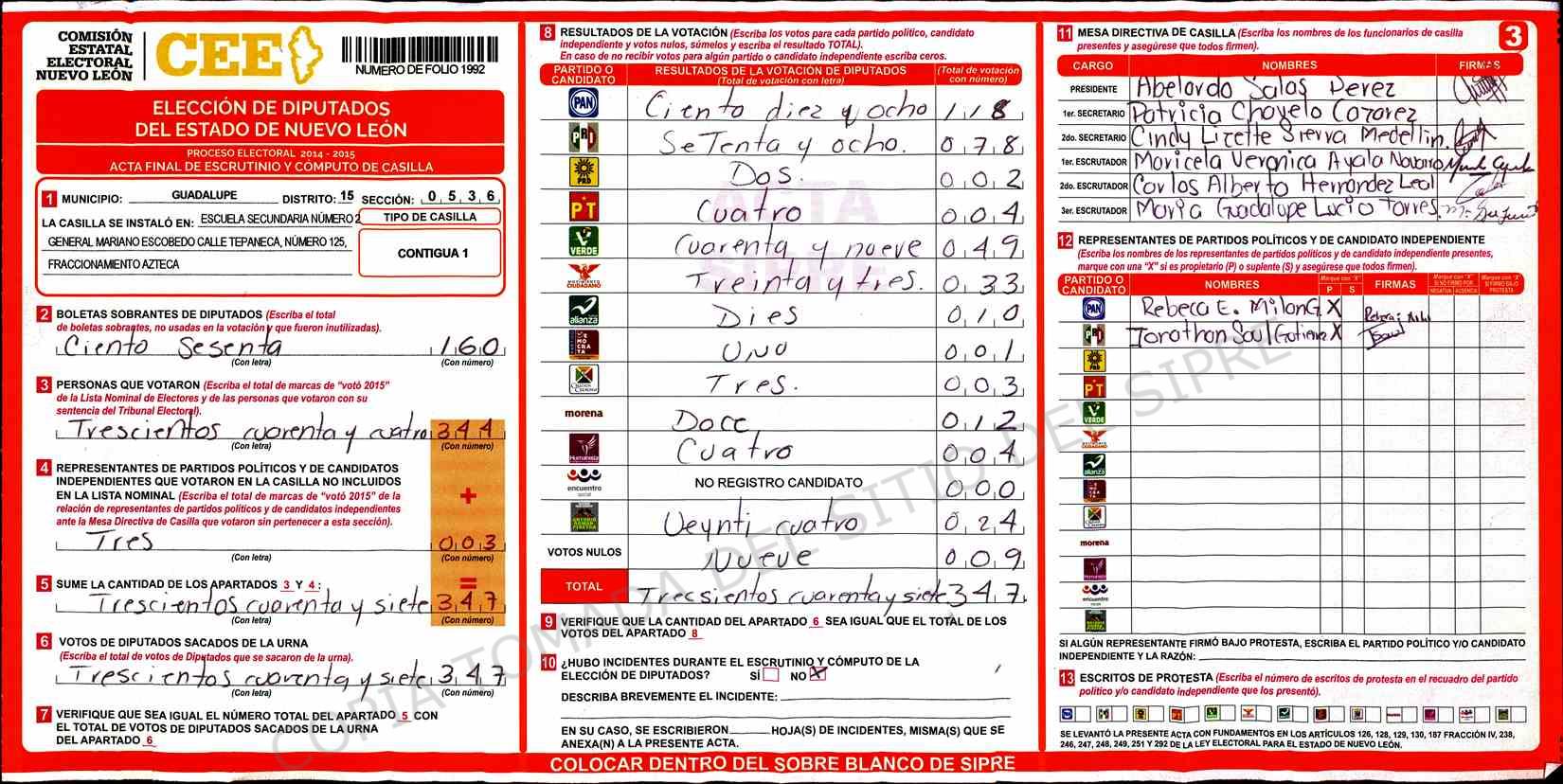 | Claves de Incidencia: | (1) Ilegible, (2) Mutilada, (3) Presenta Correcciones, (4) Presenta Borrones, (5) En Blanco, (6) Cifras Remarcadas, (7) Cifras de Mas, (8) Copiado Movido, (9) Con Signos Inválidos, (10) Excede Lista Nominal, (11) Otra |