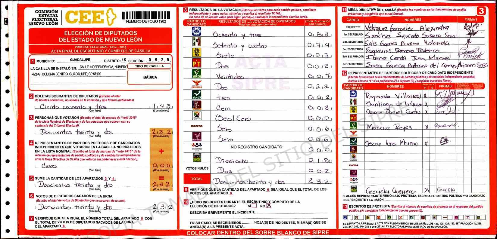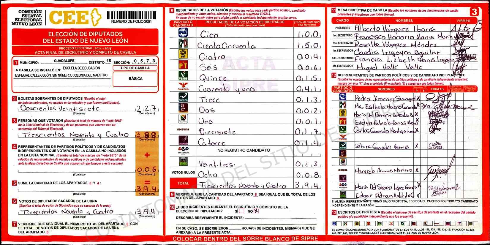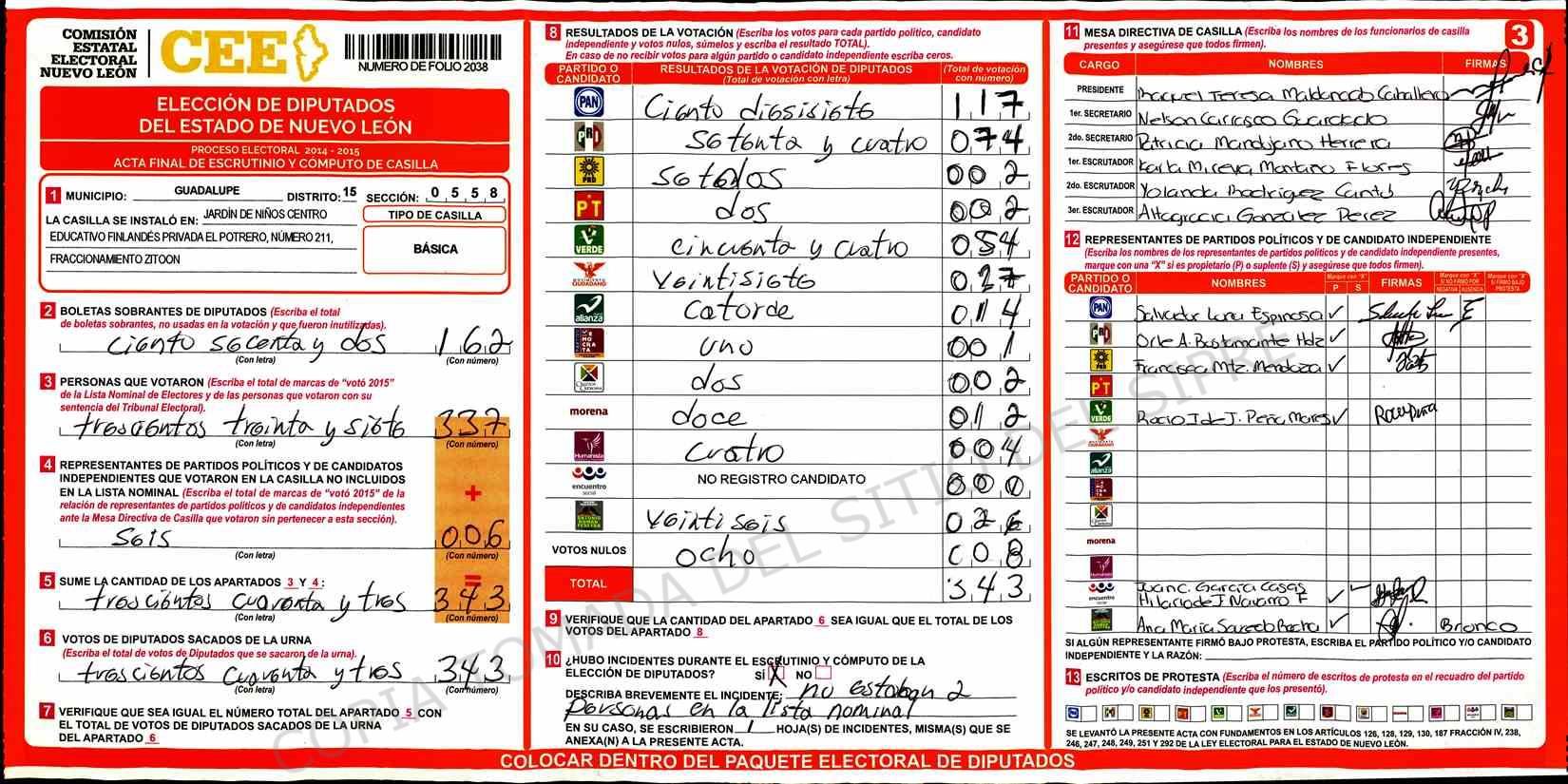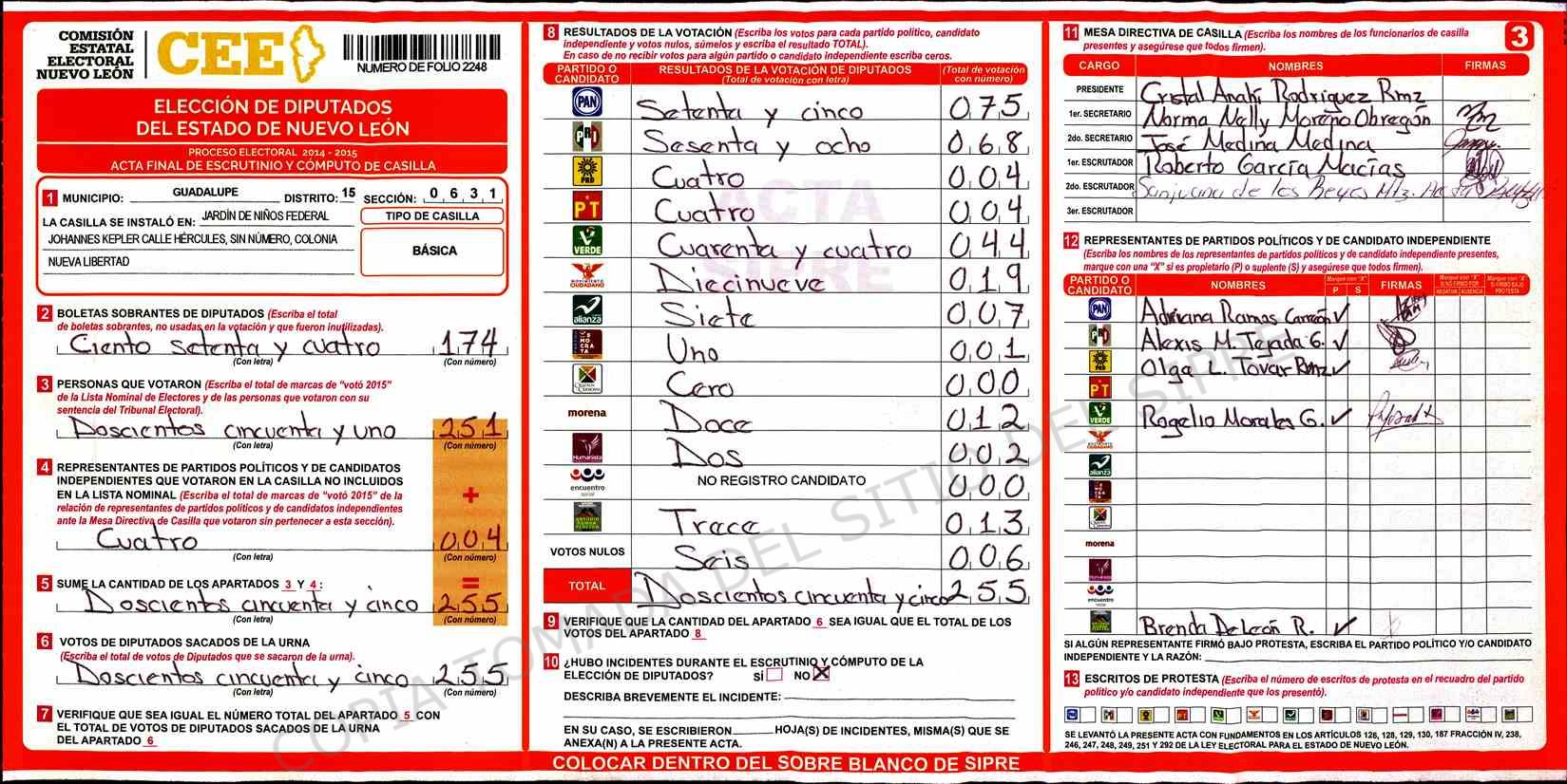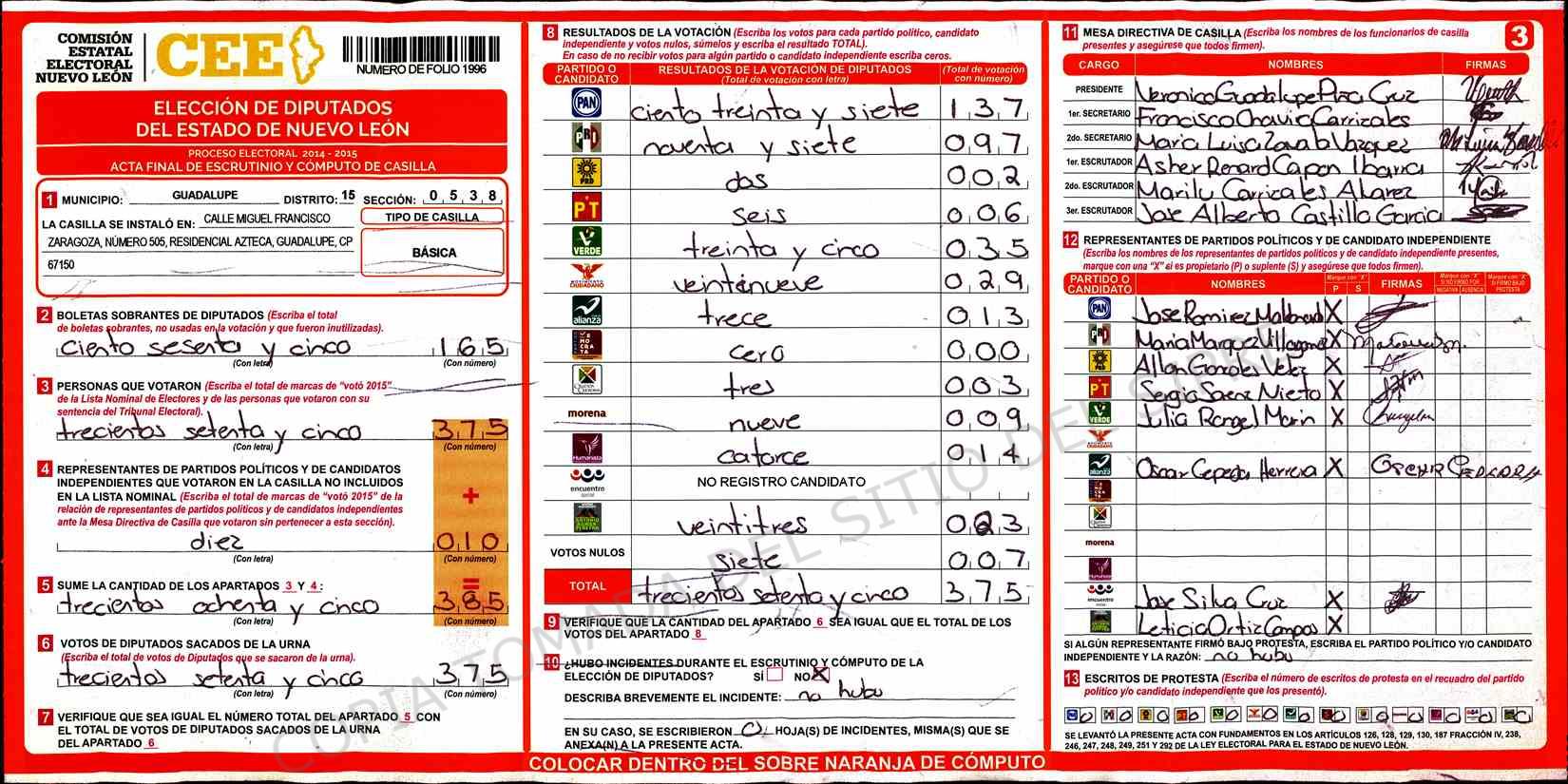 | Claves de Incidencia: | (1) Ilegible, (2) Mutilada, (3) Presenta Correcciones, (4) Presenta Borrones, (5) En Blanco, (6) Cifras Remarcadas, (7) Cifras de Mas, (8) Copiado Movido, (9) Con Signos Inválidos, (10) Excede Lista Nominal, (11) Otra |
