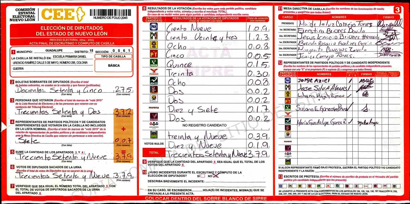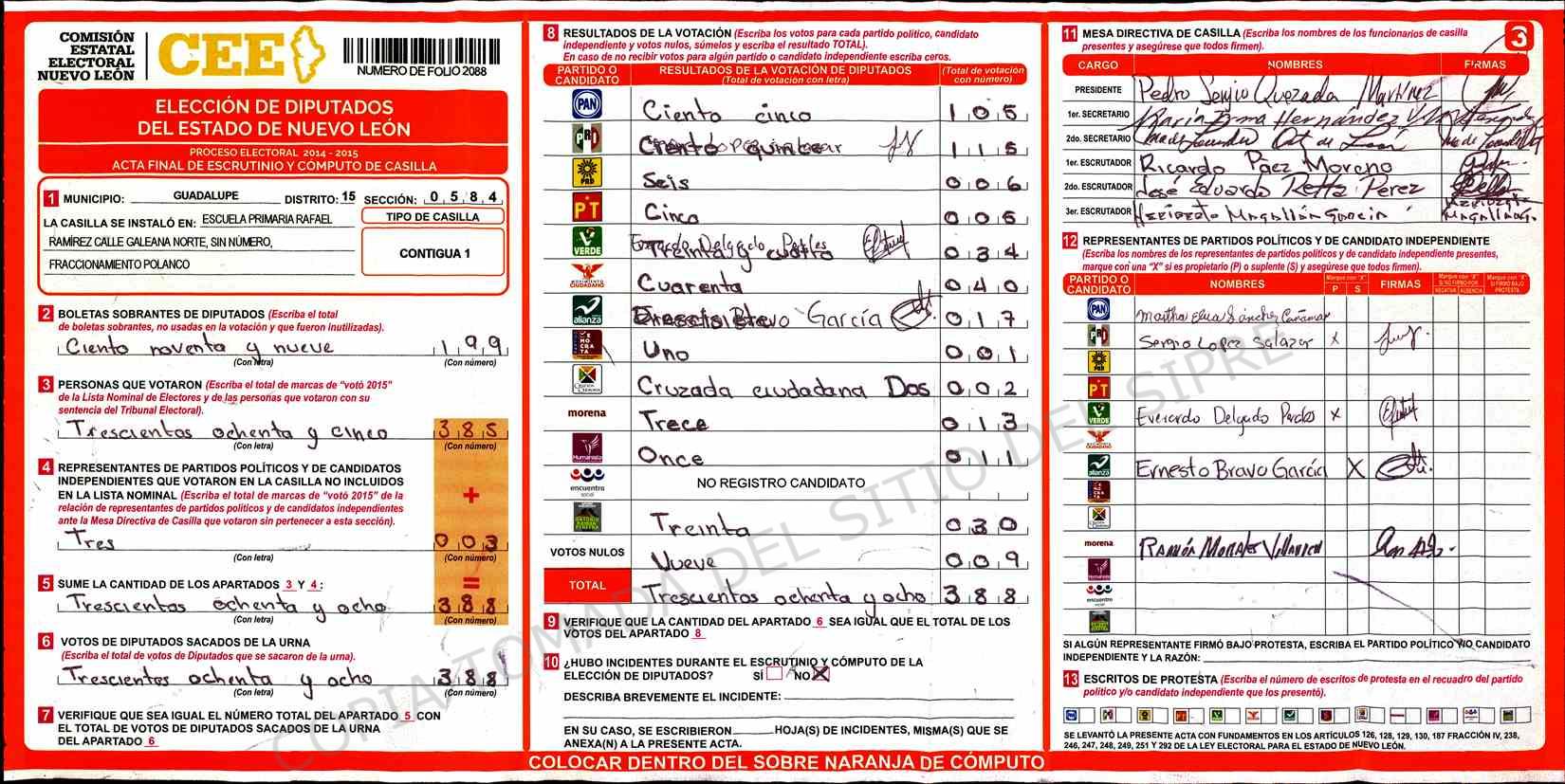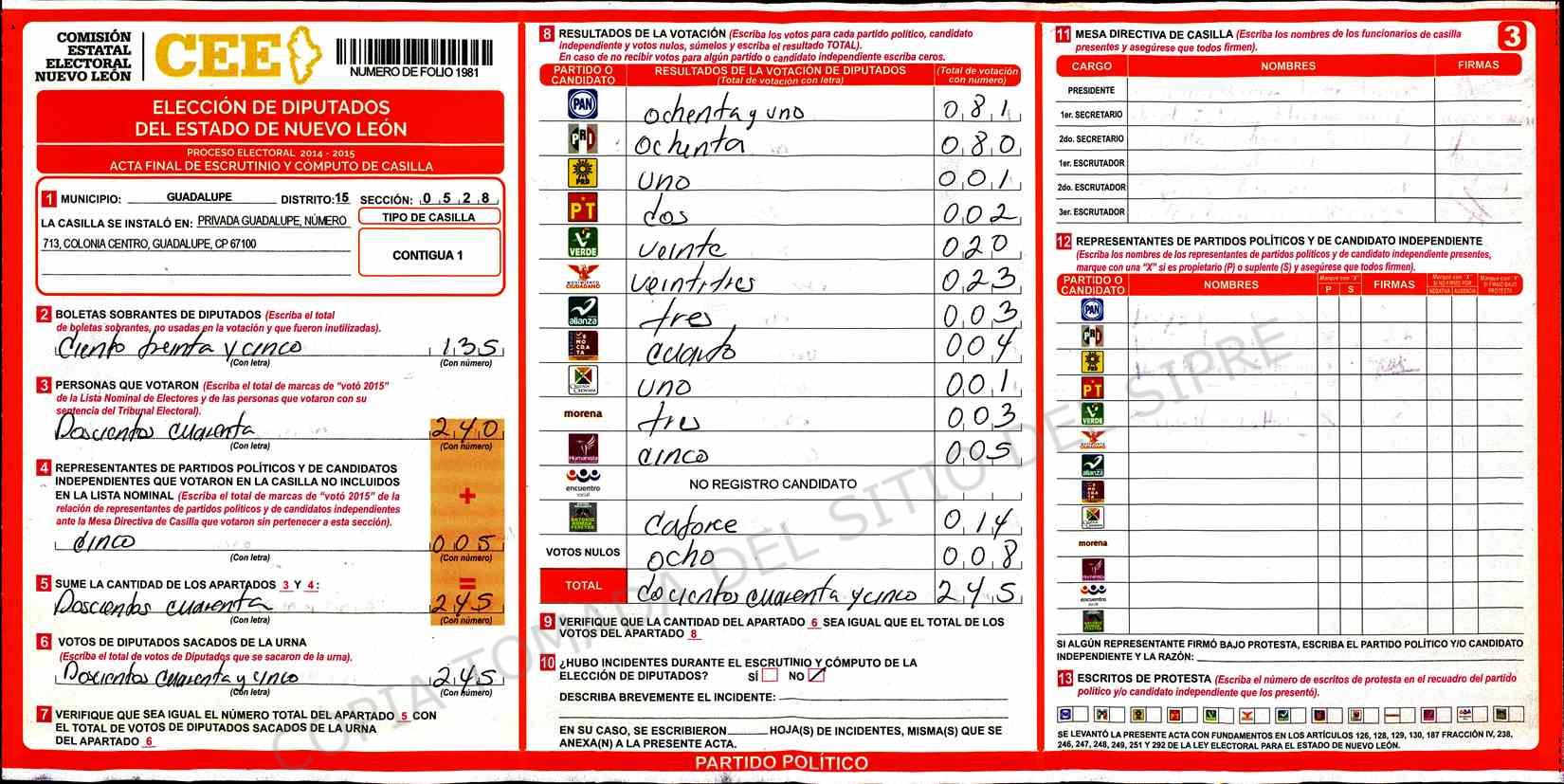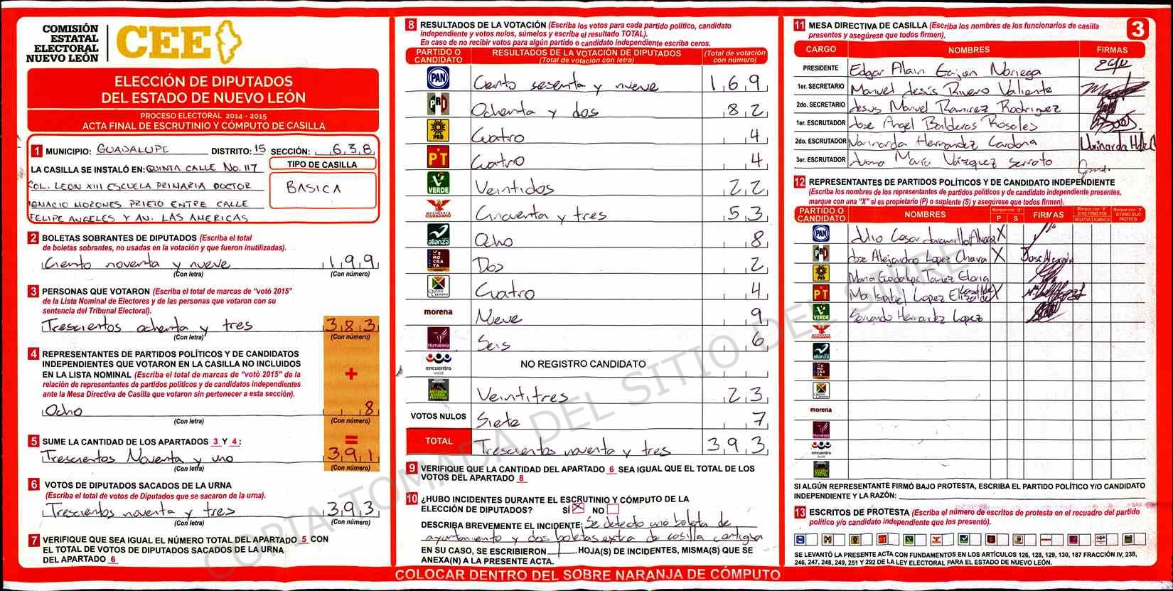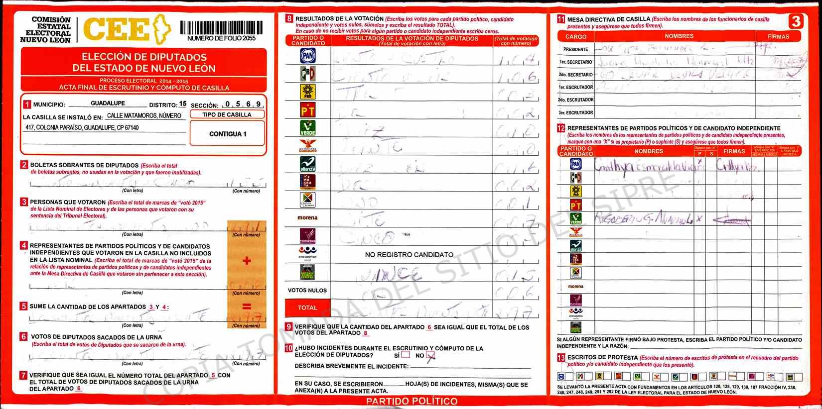 | Claves de Incidencia: | (1) Ilegible, (2) Mutilada, (3) Presenta Correcciones, (4) Presenta Borrones, (5) En Blanco, (6) Cifras Remarcadas, (7) Cifras de Mas, (8) Copiado Movido, (9) Con Signos Inválidos, (10) Excede Lista Nominal, (11) Otra |