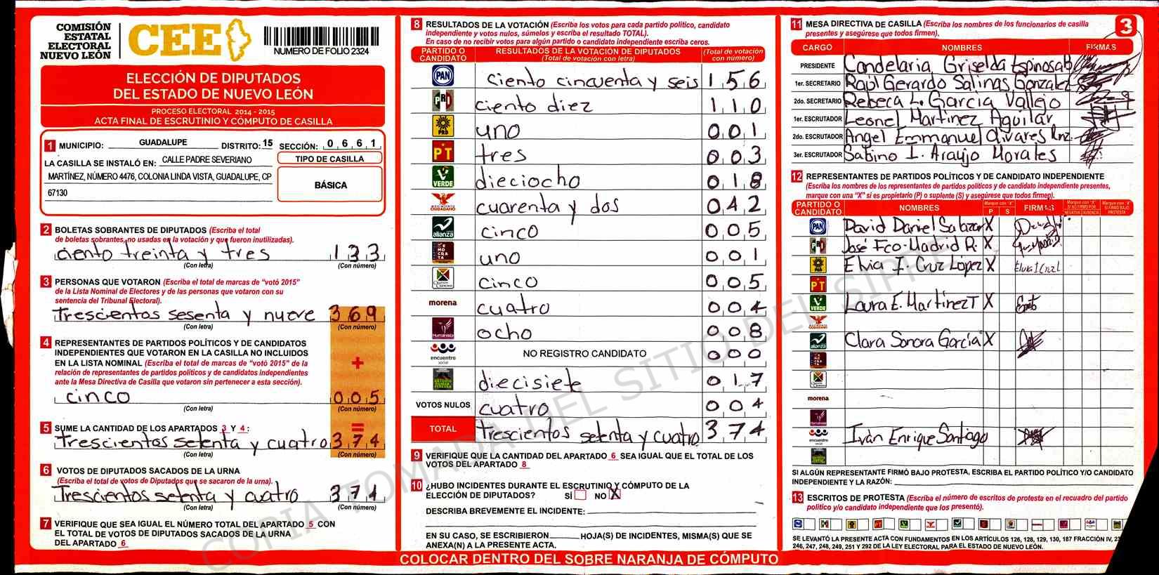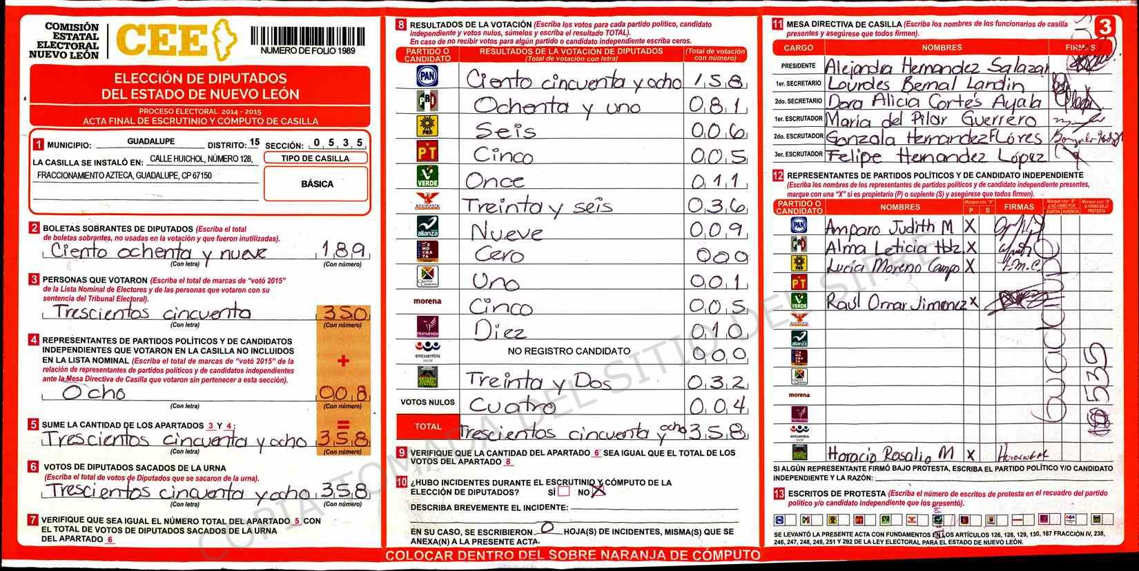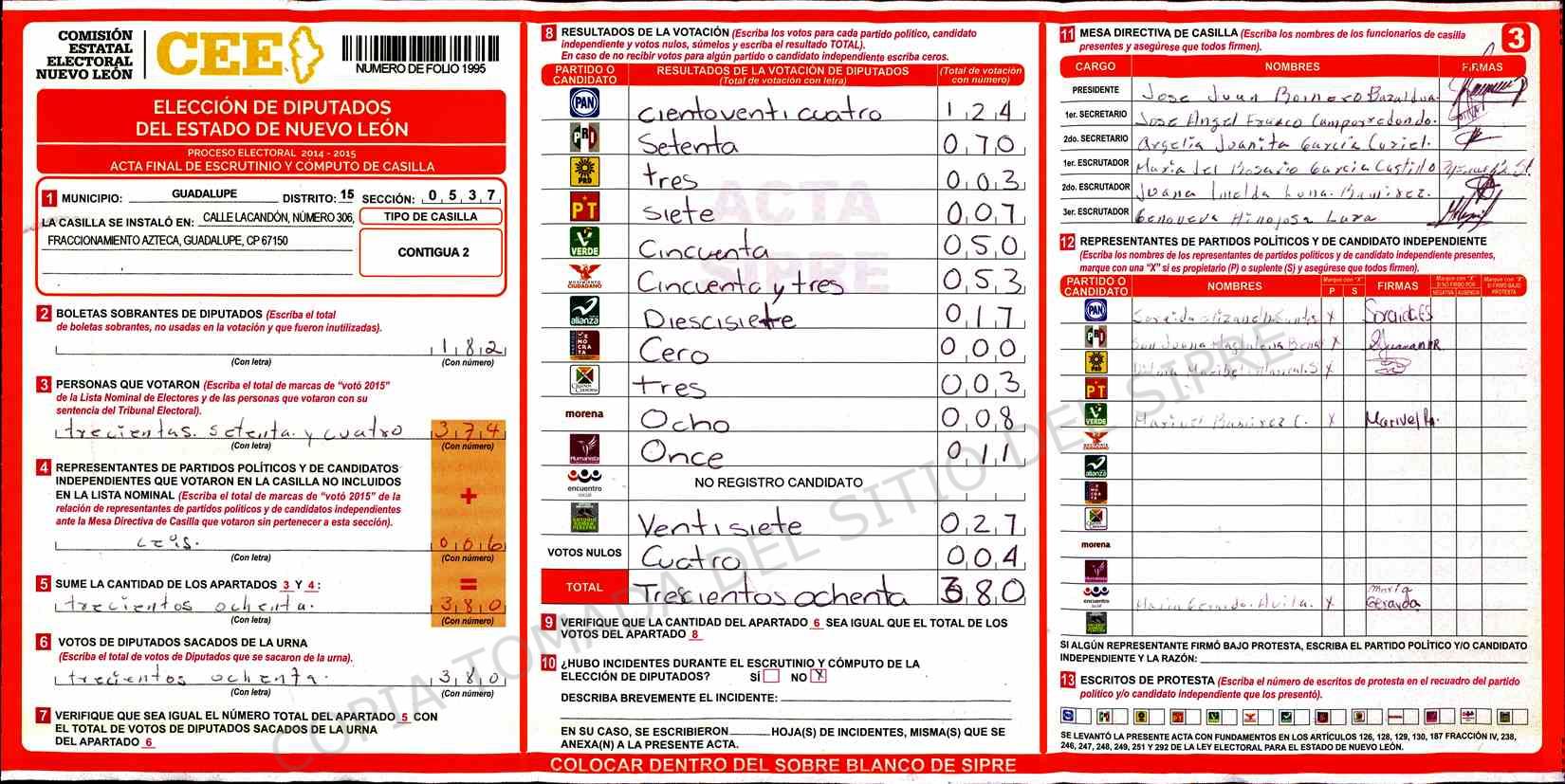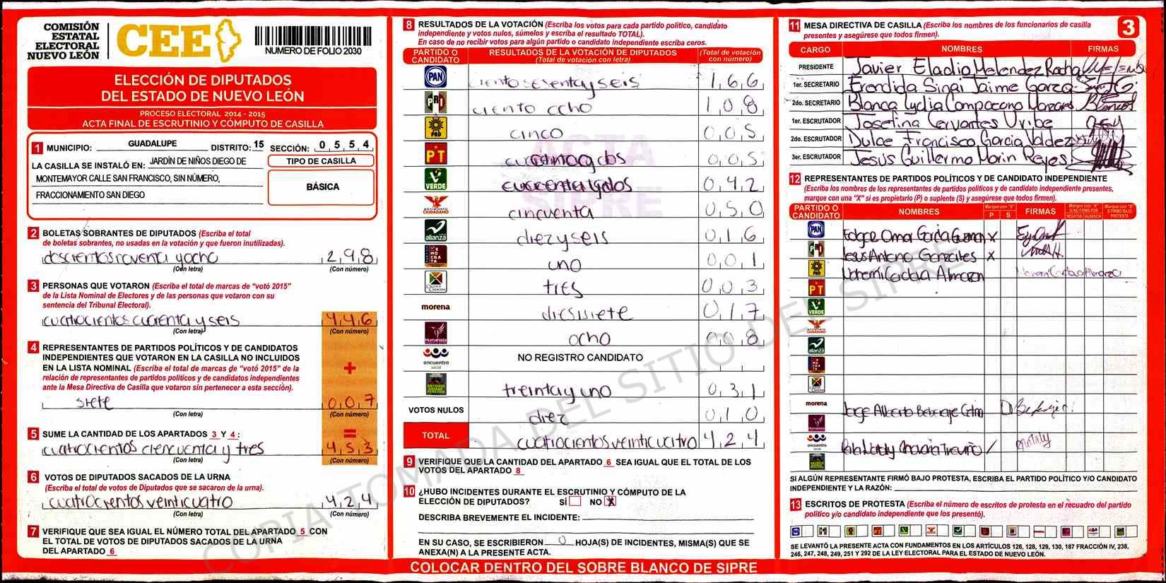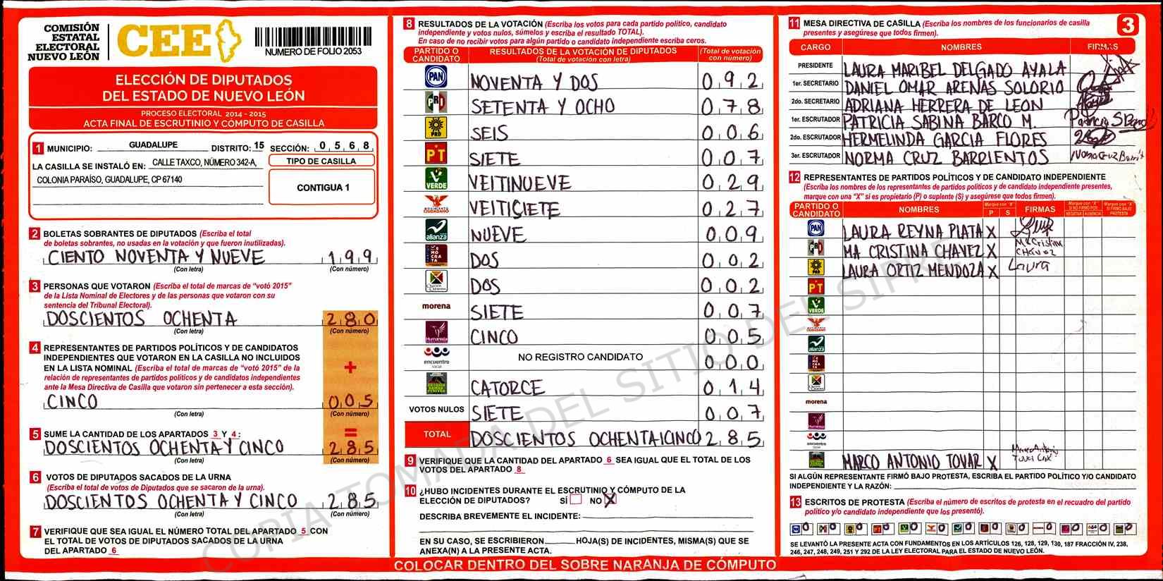 | Claves de Incidencia: | (1) Ilegible, (2) Mutilada, (3) Presenta Correcciones, (4) Presenta Borrones, (5) En Blanco, (6) Cifras Remarcadas, (7) Cifras de Mas, (8) Copiado Movido, (9) Con Signos Inválidos, (10) Excede Lista Nominal, (11) Otra |
