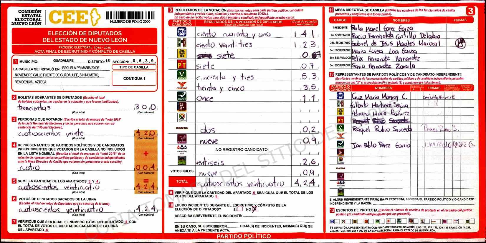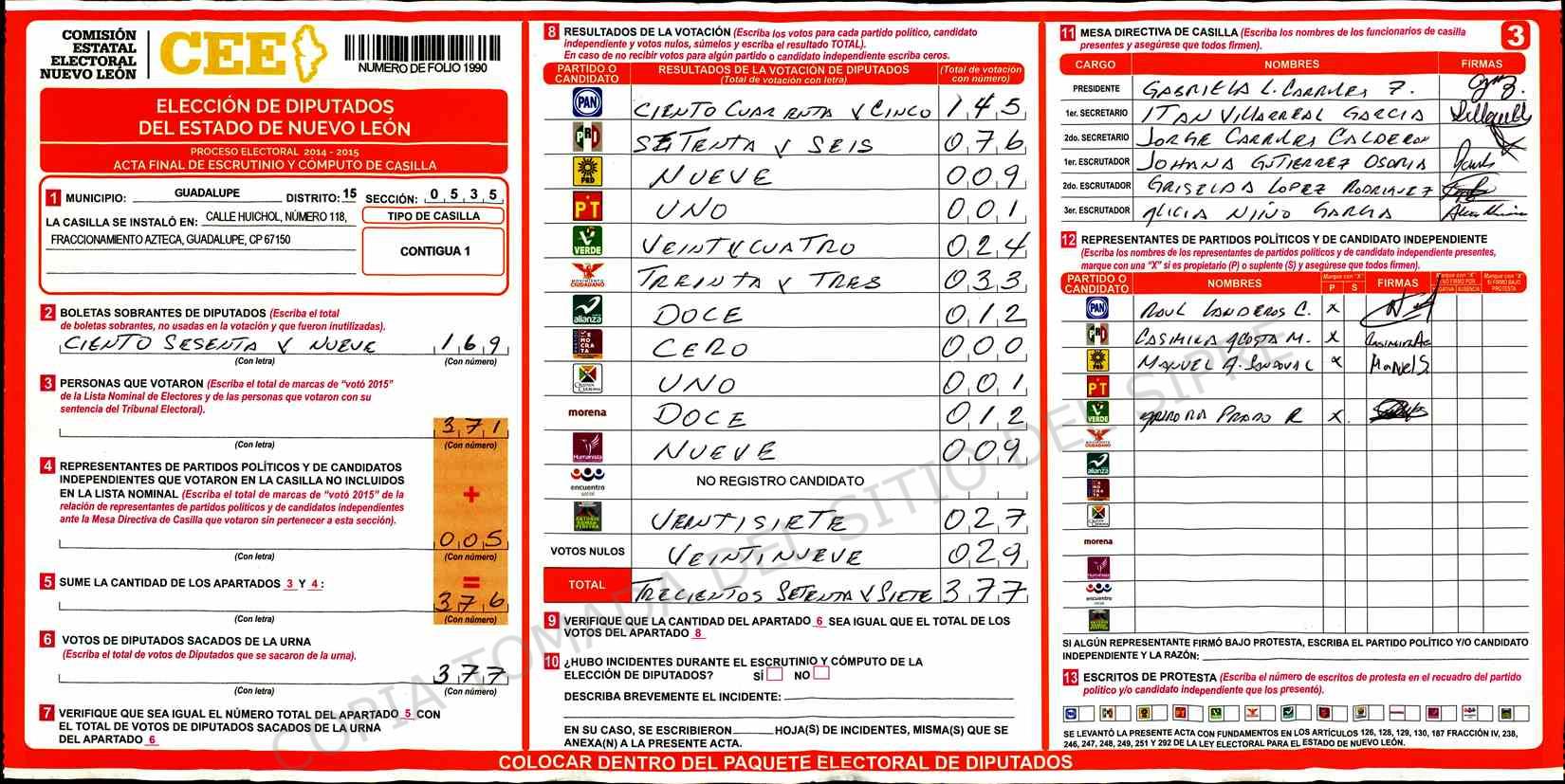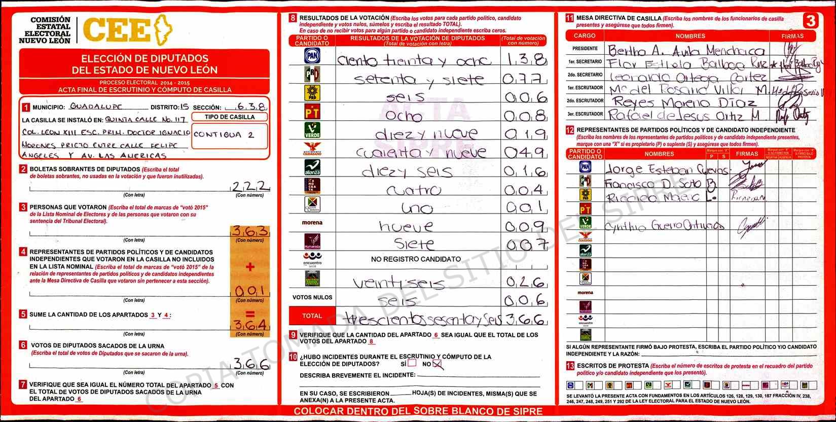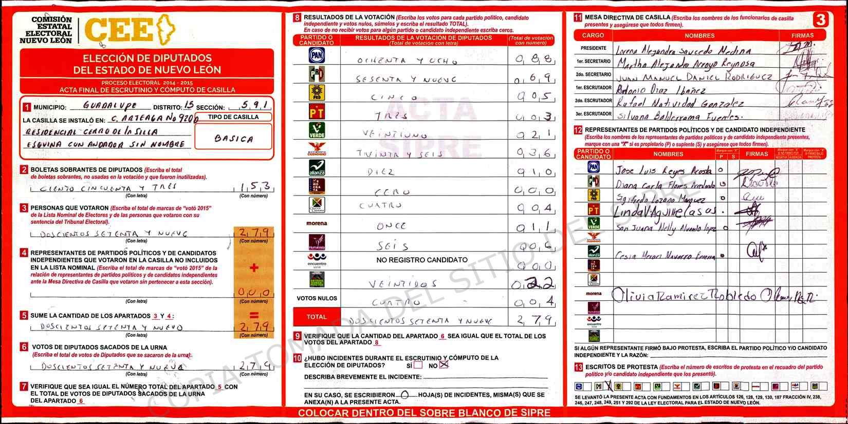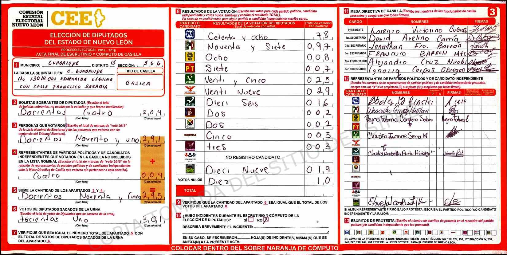 | Claves de Incidencia: | (1) Ilegible, (2) Mutilada, (3) Presenta Correcciones, (4) Presenta Borrones, (5) En Blanco, (6) Cifras Remarcadas, (7) Cifras de Mas, (8) Copiado Movido, (9) Con Signos Inválidos, (10) Excede Lista Nominal, (11) Otra |