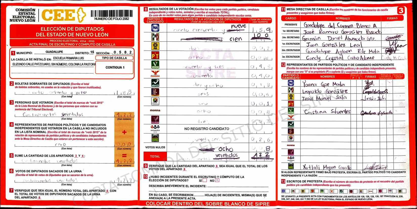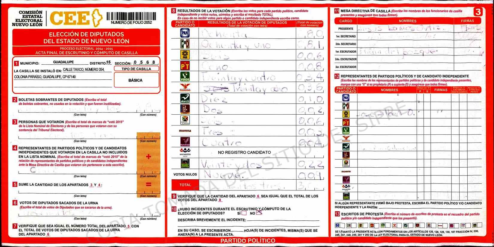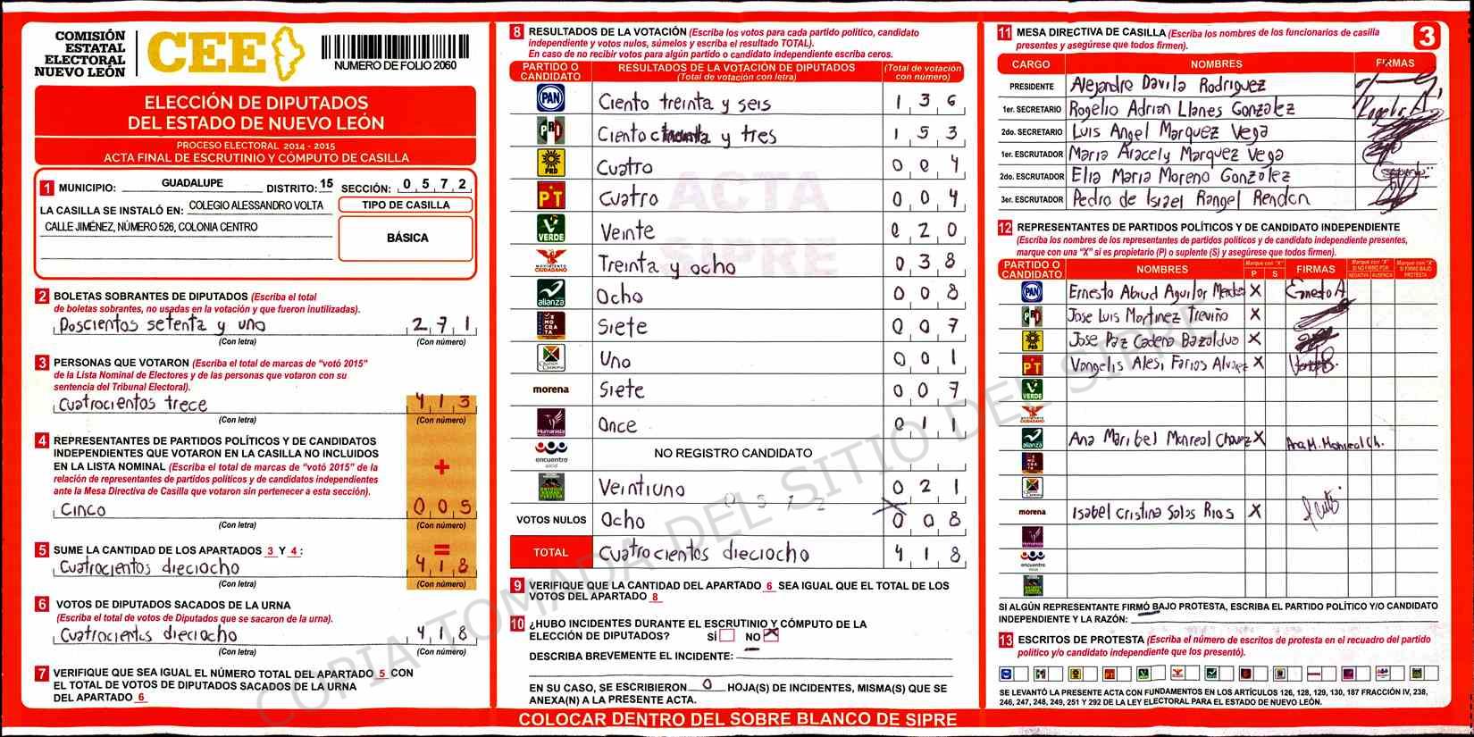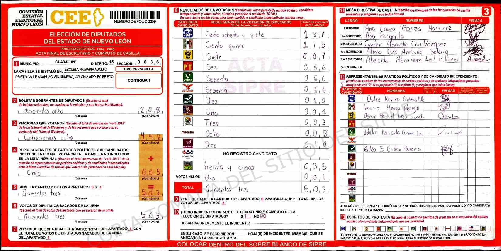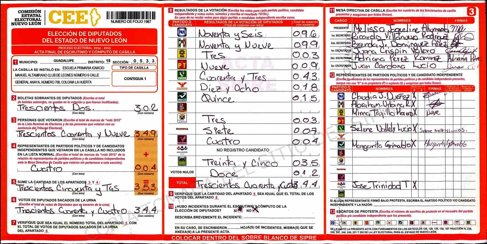 | Claves de Incidencia: | (1) Ilegible, (2) Mutilada, (3) Presenta Correcciones, (4) Presenta Borrones, (5) En Blanco, (6) Cifras Remarcadas, (7) Cifras de Mas, (8) Copiado Movido, (9) Con Signos Inválidos, (10) Excede Lista Nominal, (11) Otra |
