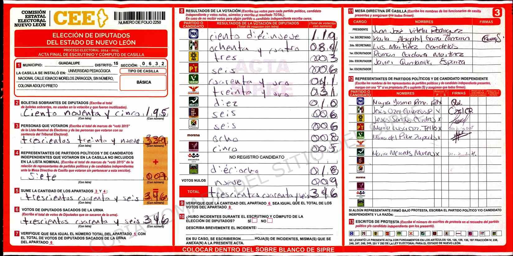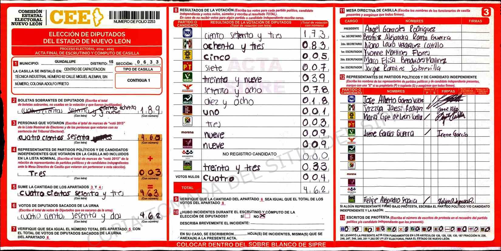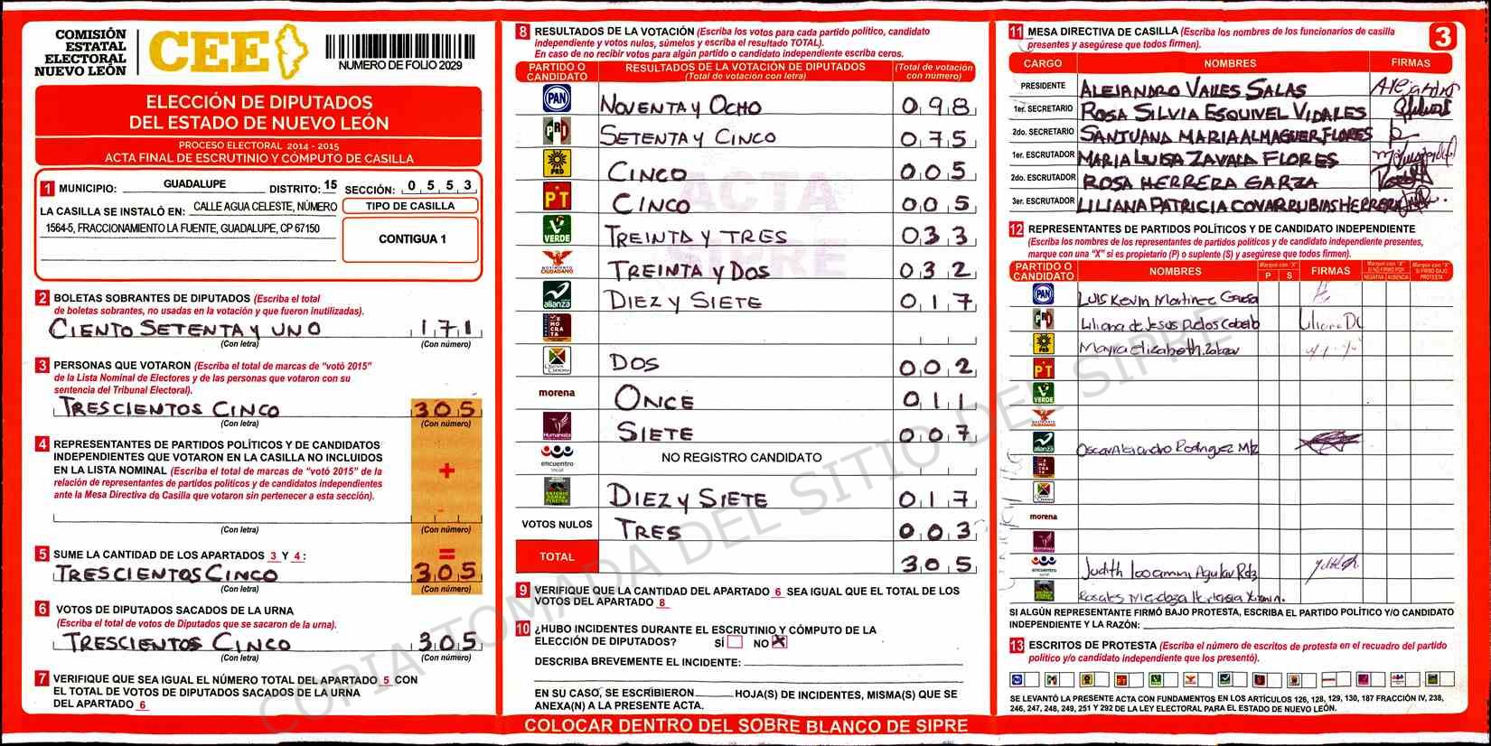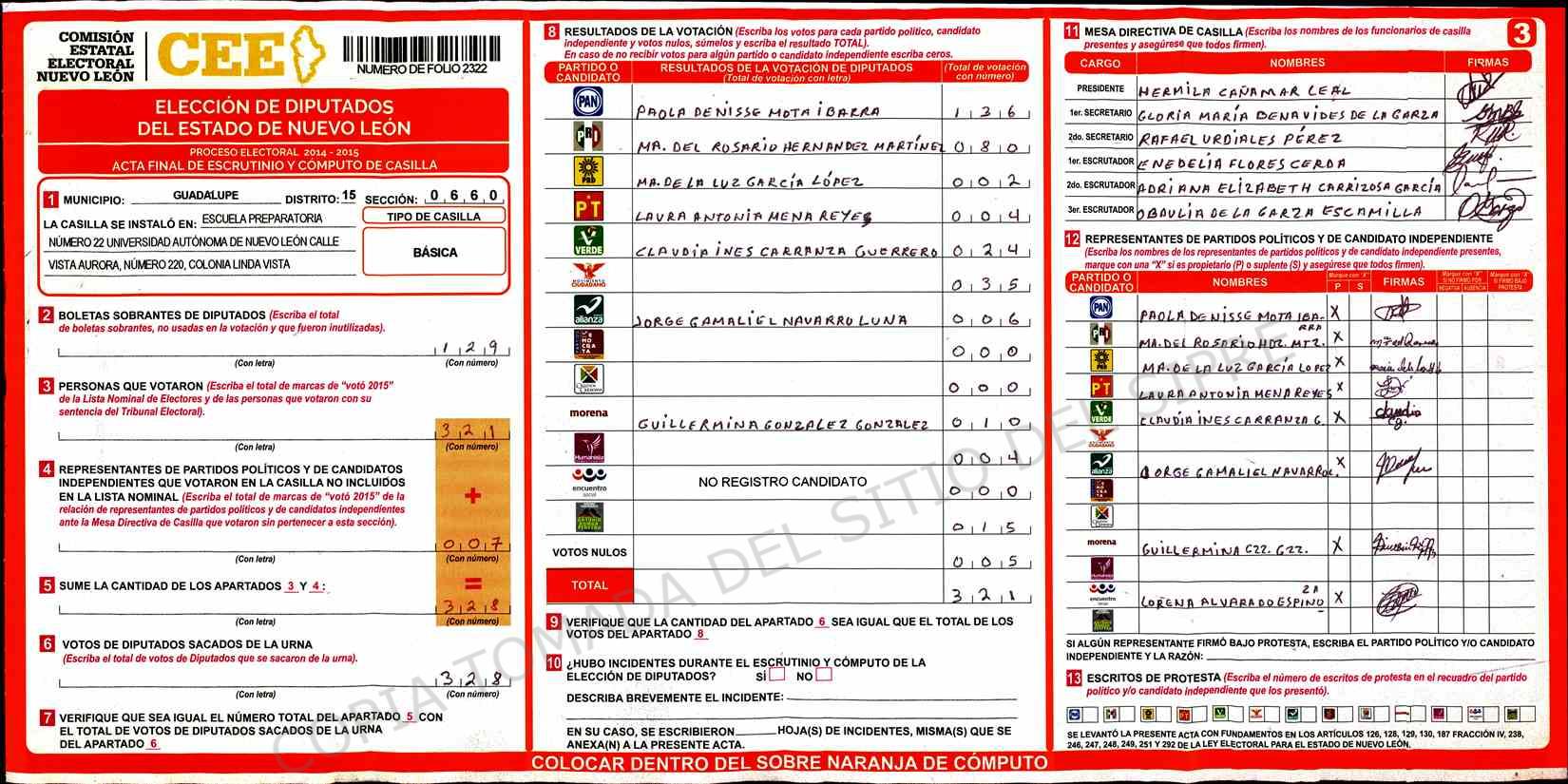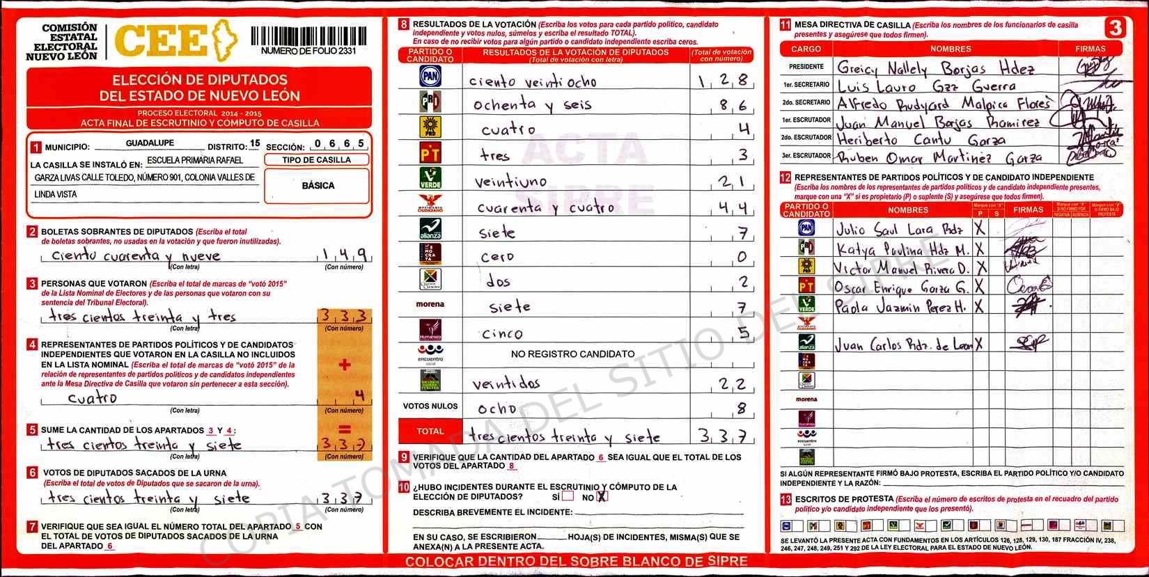 | Claves de Incidencia: | (1) Ilegible, (2) Mutilada, (3) Presenta Correcciones, (4) Presenta Borrones, (5) En Blanco, (6) Cifras Remarcadas, (7) Cifras de Mas, (8) Copiado Movido, (9) Con Signos Inválidos, (10) Excede Lista Nominal, (11) Otra |