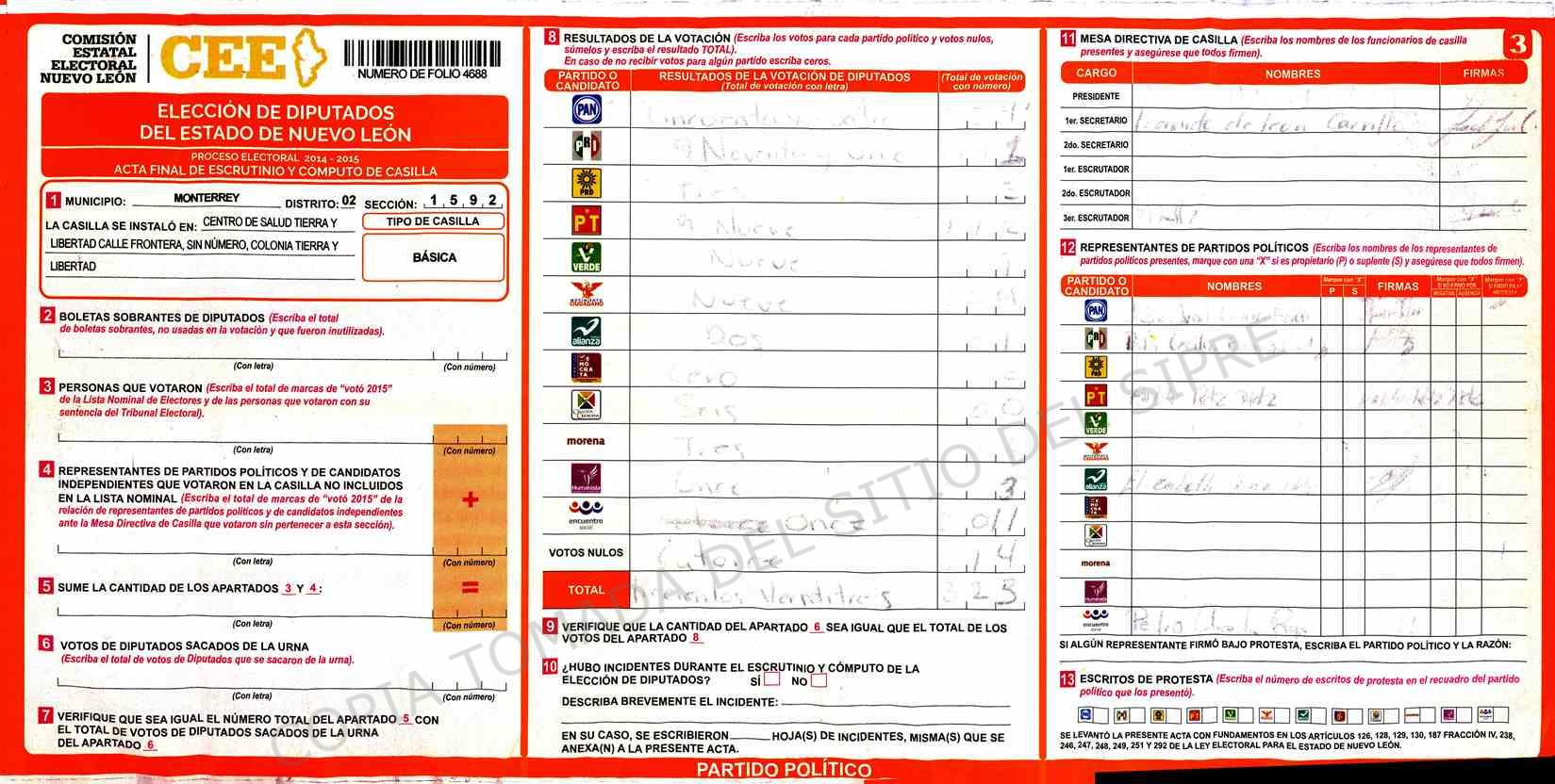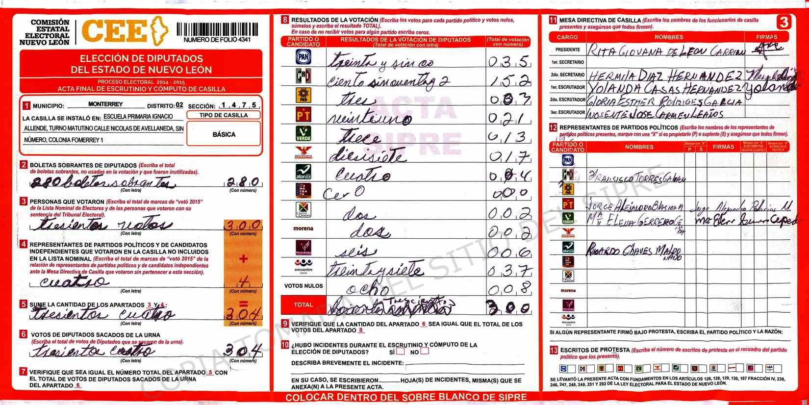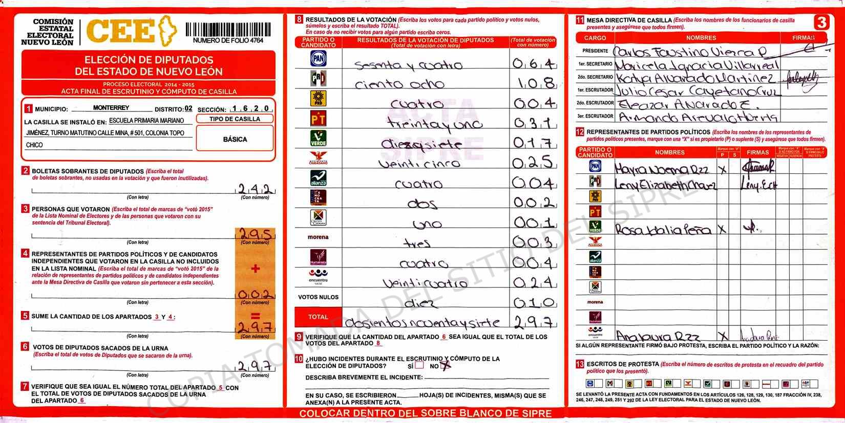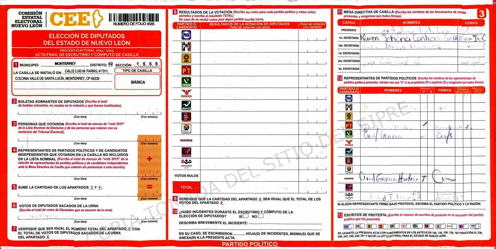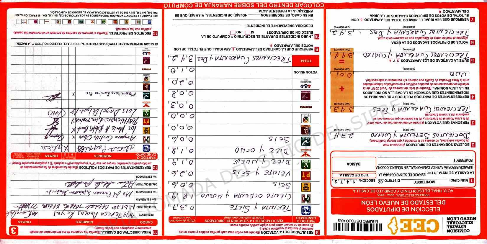 | Claves de Incidencia: | (1) Ilegible, (2) Mutilada, (3) Presenta Correcciones, (4) Presenta Borrones, (5) En Blanco, (6) Cifras Remarcadas, (7) Cifras de Mas, (8) Copiado Movido, (9) Con Signos Inválidos, (10) Excede Lista Nominal, (11) Otra |
