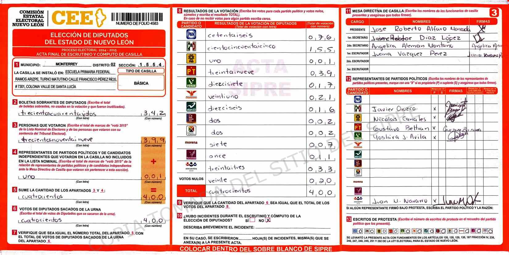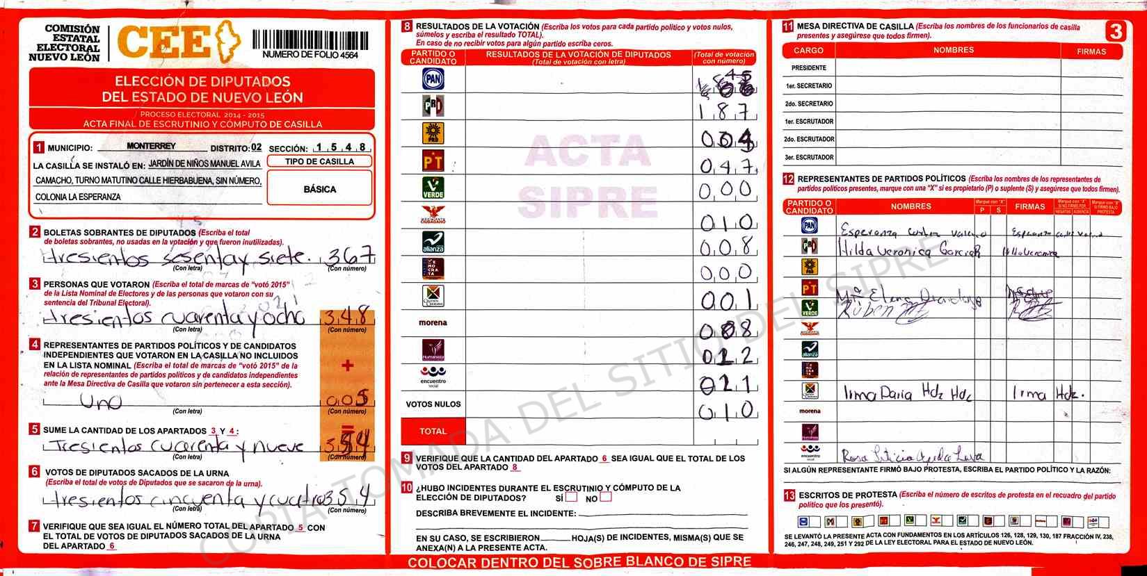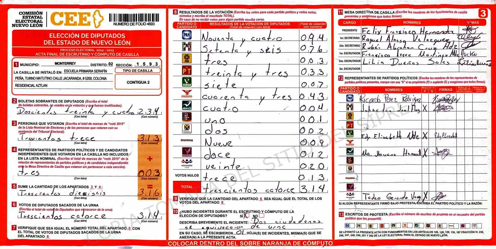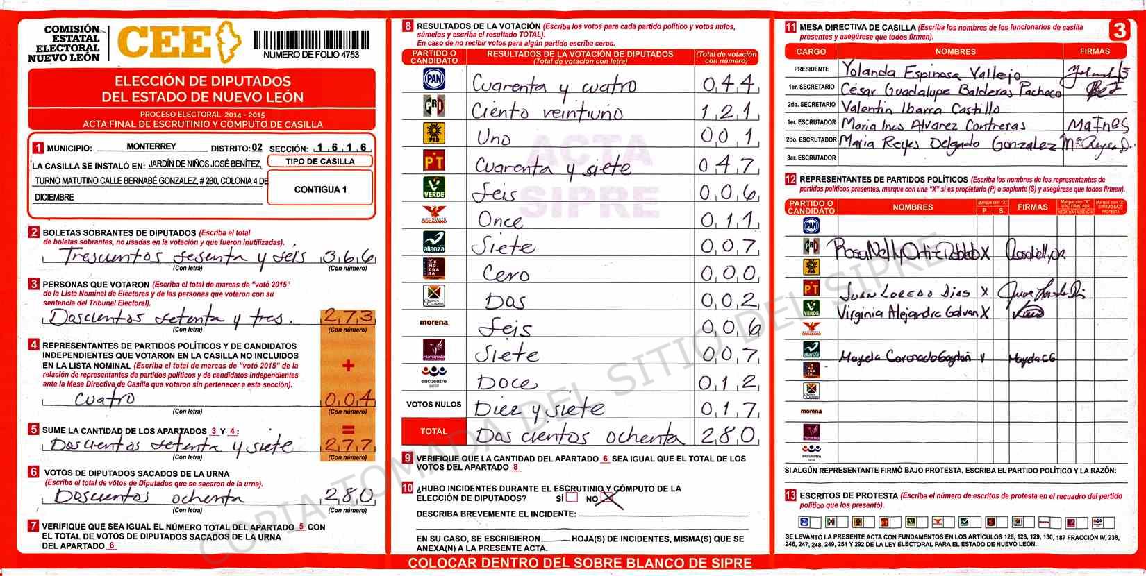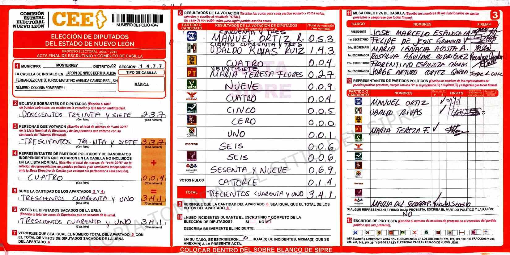 | Claves de Incidencia: | (1) Ilegible, (2) Mutilada, (3) Presenta Correcciones, (4) Presenta Borrones, (5) En Blanco, (6) Cifras Remarcadas, (7) Cifras de Mas, (8) Copiado Movido, (9) Con Signos Inválidos, (10) Excede Lista Nominal, (11) Otra |