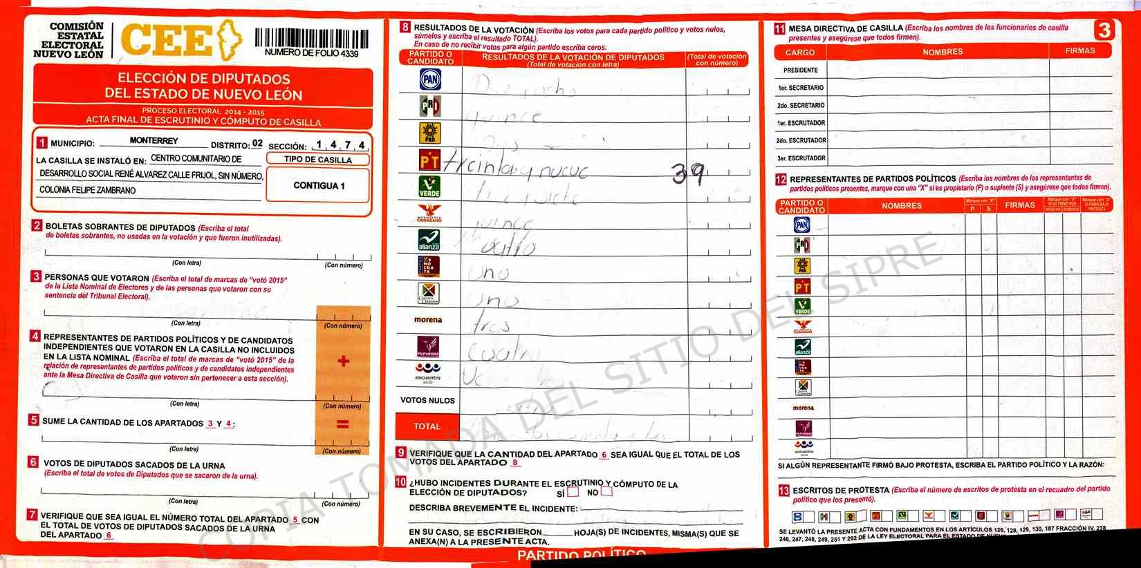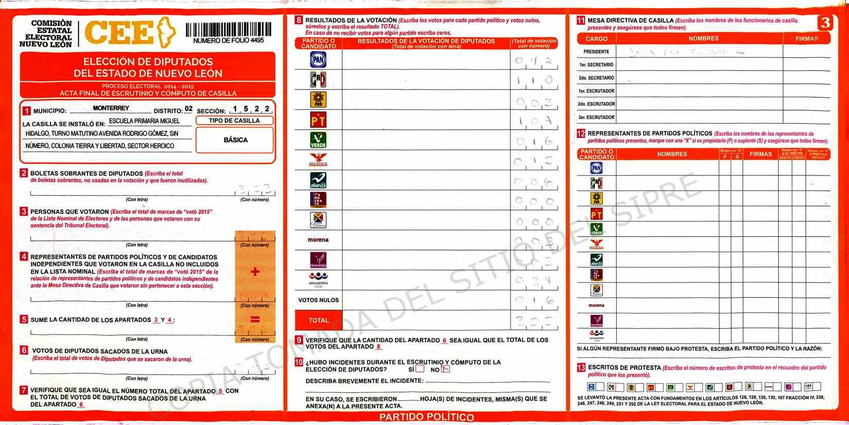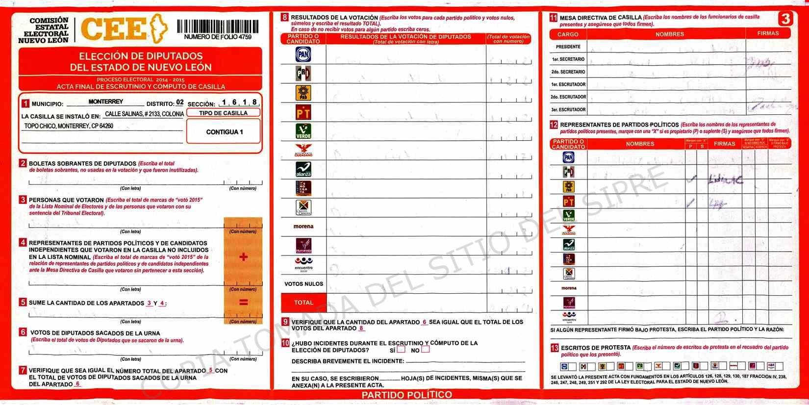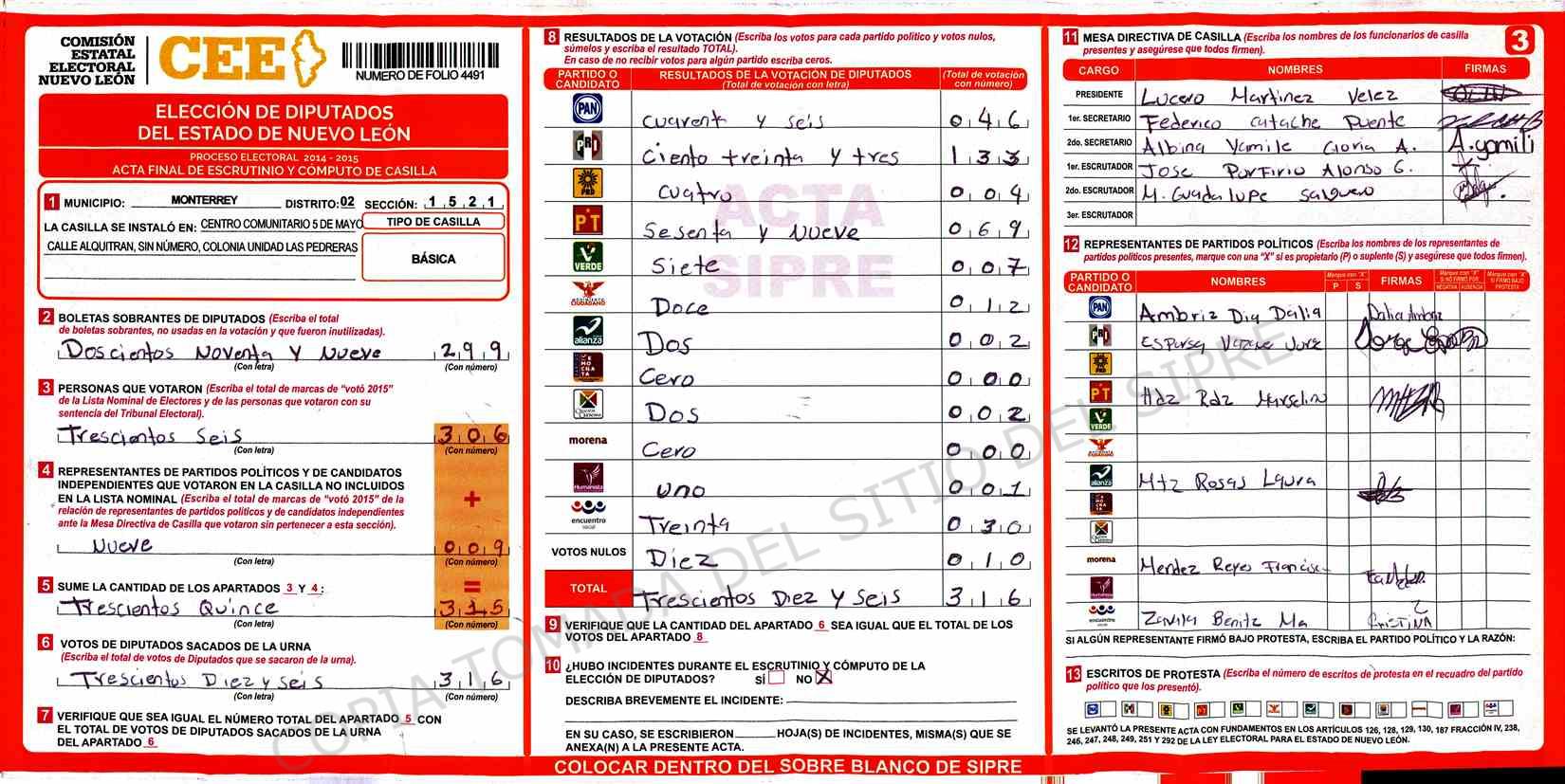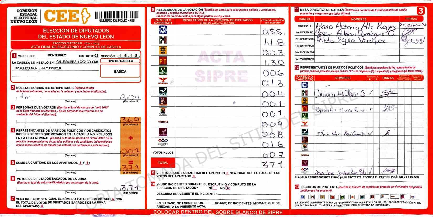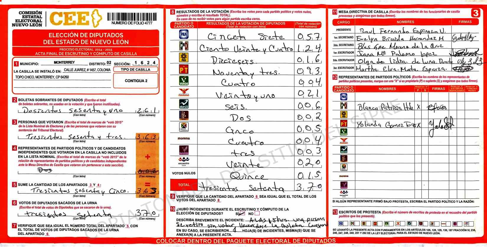 | Claves de Incidencia: | (1) Ilegible, (2) Mutilada, (3) Presenta Correcciones, (4) Presenta Borrones, (5) En Blanco, (6) Cifras Remarcadas, (7) Cifras de Mas, (8) Copiado Movido, (9) Con Signos Inválidos, (10) Excede Lista Nominal, (11) Otra |