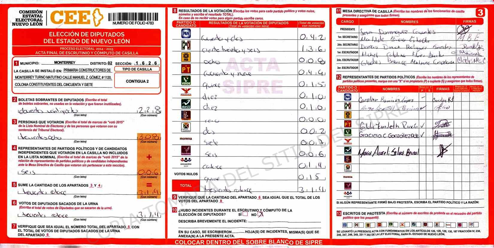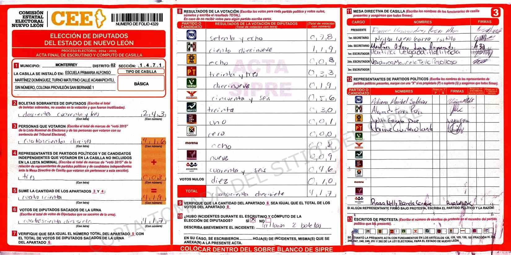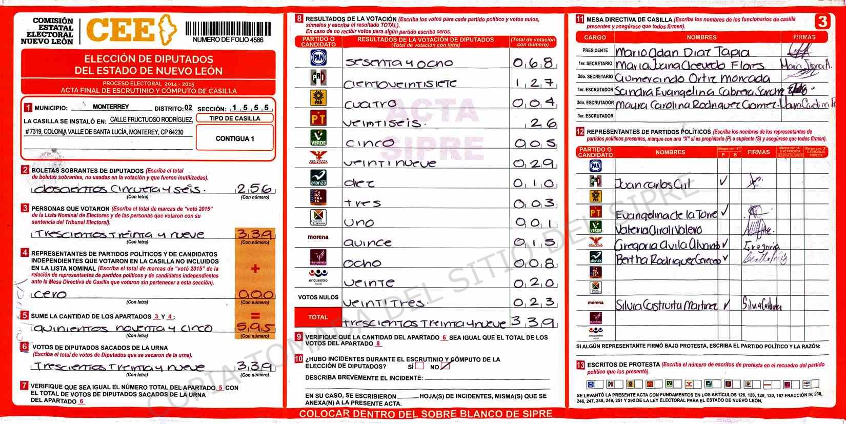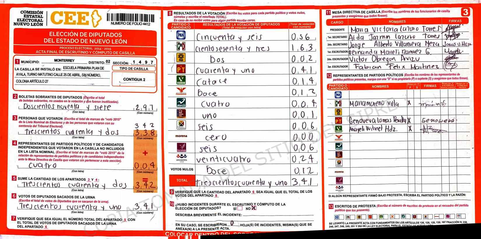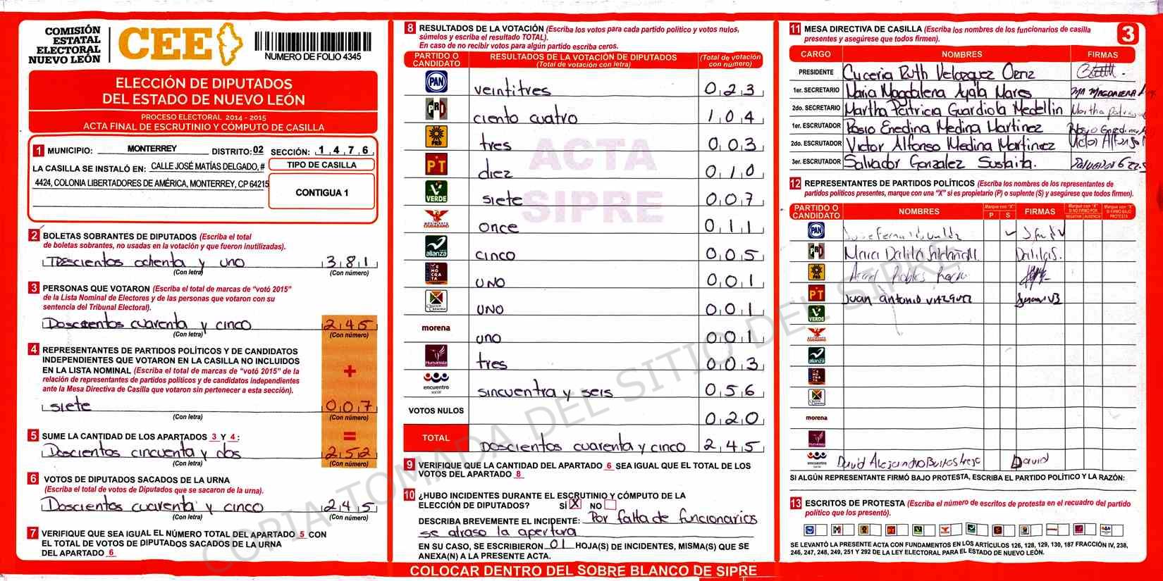 | Claves de Incidencia: | (1) Ilegible, (2) Mutilada, (3) Presenta Correcciones, (4) Presenta Borrones, (5) En Blanco, (6) Cifras Remarcadas, (7) Cifras de Mas, (8) Copiado Movido, (9) Con Signos Inválidos, (10) Excede Lista Nominal, (11) Otra |