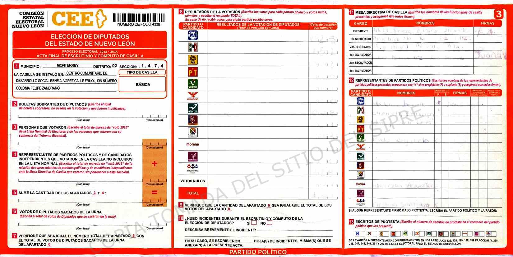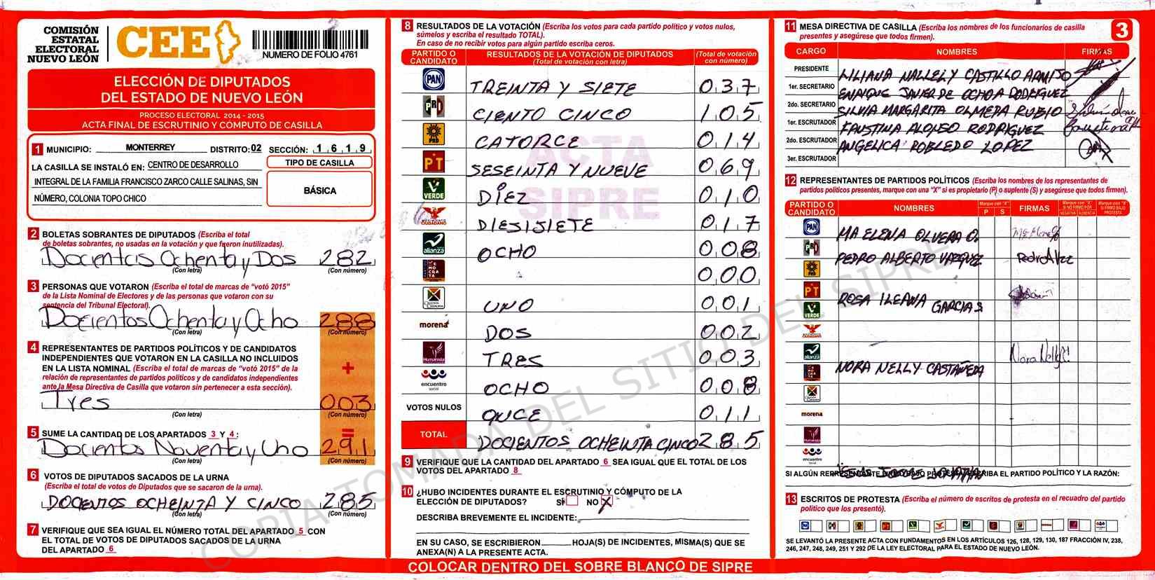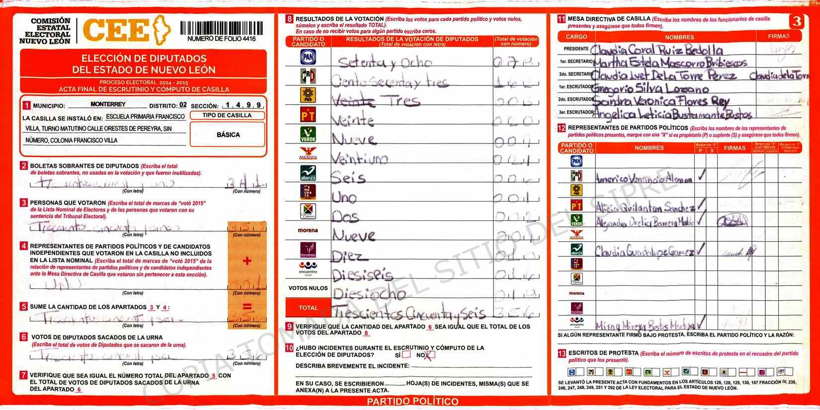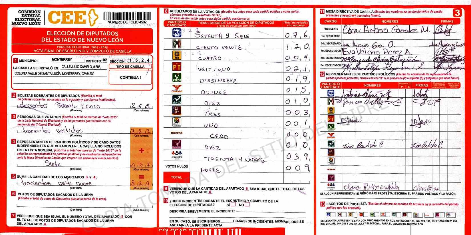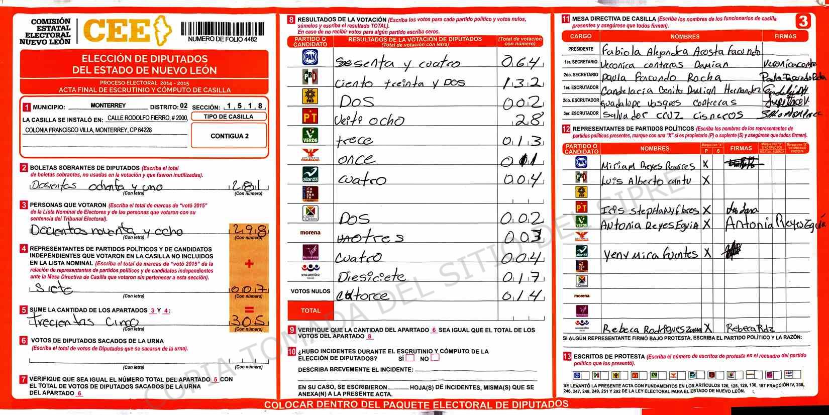 | Claves de Incidencia: | (1) Ilegible, (2) Mutilada, (3) Presenta Correcciones, (4) Presenta Borrones, (5) En Blanco, (6) Cifras Remarcadas, (7) Cifras de Mas, (8) Copiado Movido, (9) Con Signos Inválidos, (10) Excede Lista Nominal, (11) Otra |