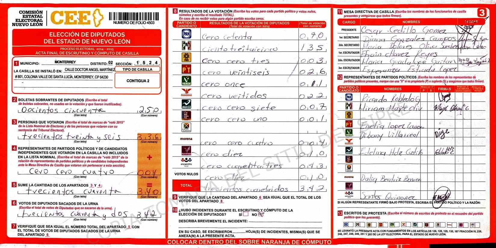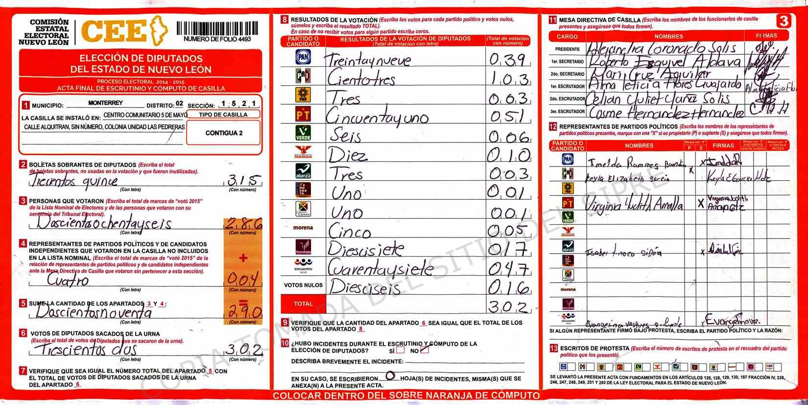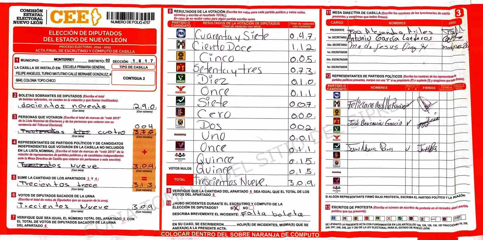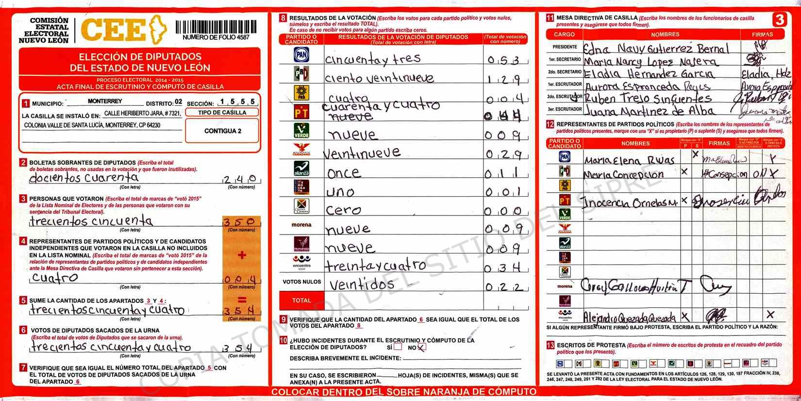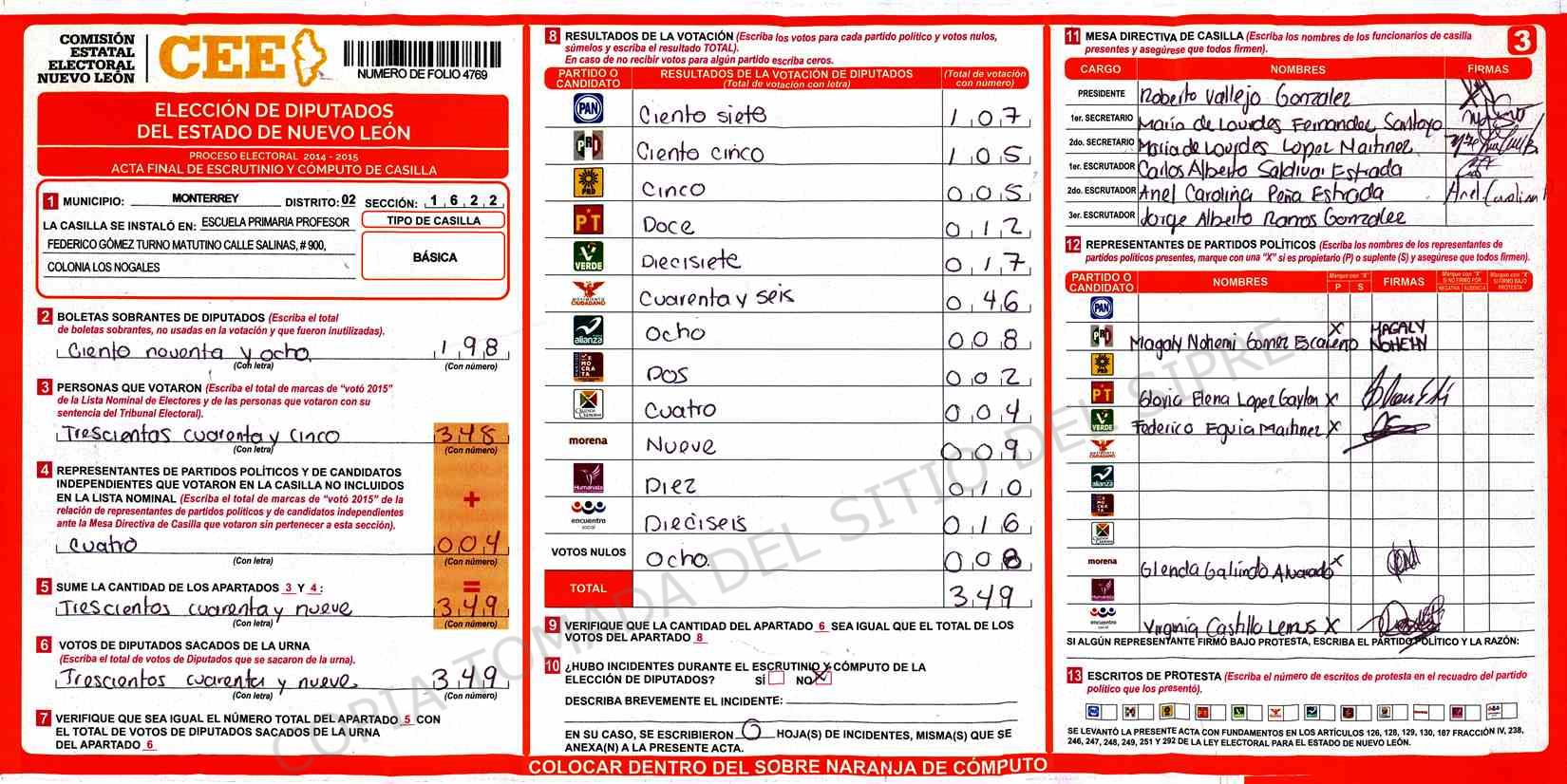 | Claves de Incidencia: | (1) Ilegible, (2) Mutilada, (3) Presenta Correcciones, (4) Presenta Borrones, (5) En Blanco, (6) Cifras Remarcadas, (7) Cifras de Mas, (8) Copiado Movido, (9) Con Signos Inválidos, (10) Excede Lista Nominal, (11) Otra |