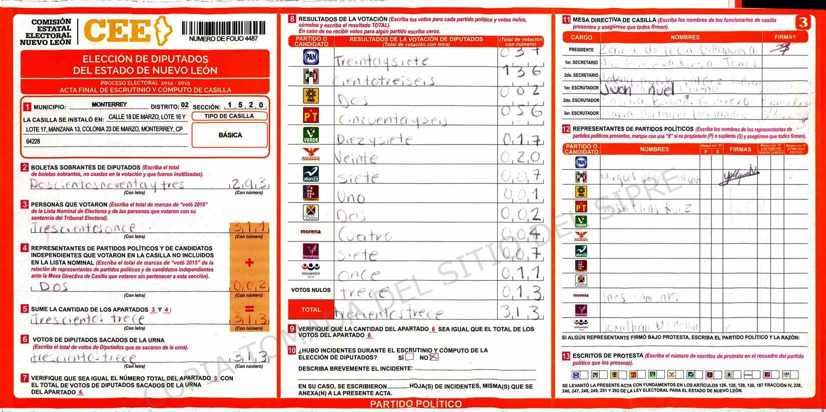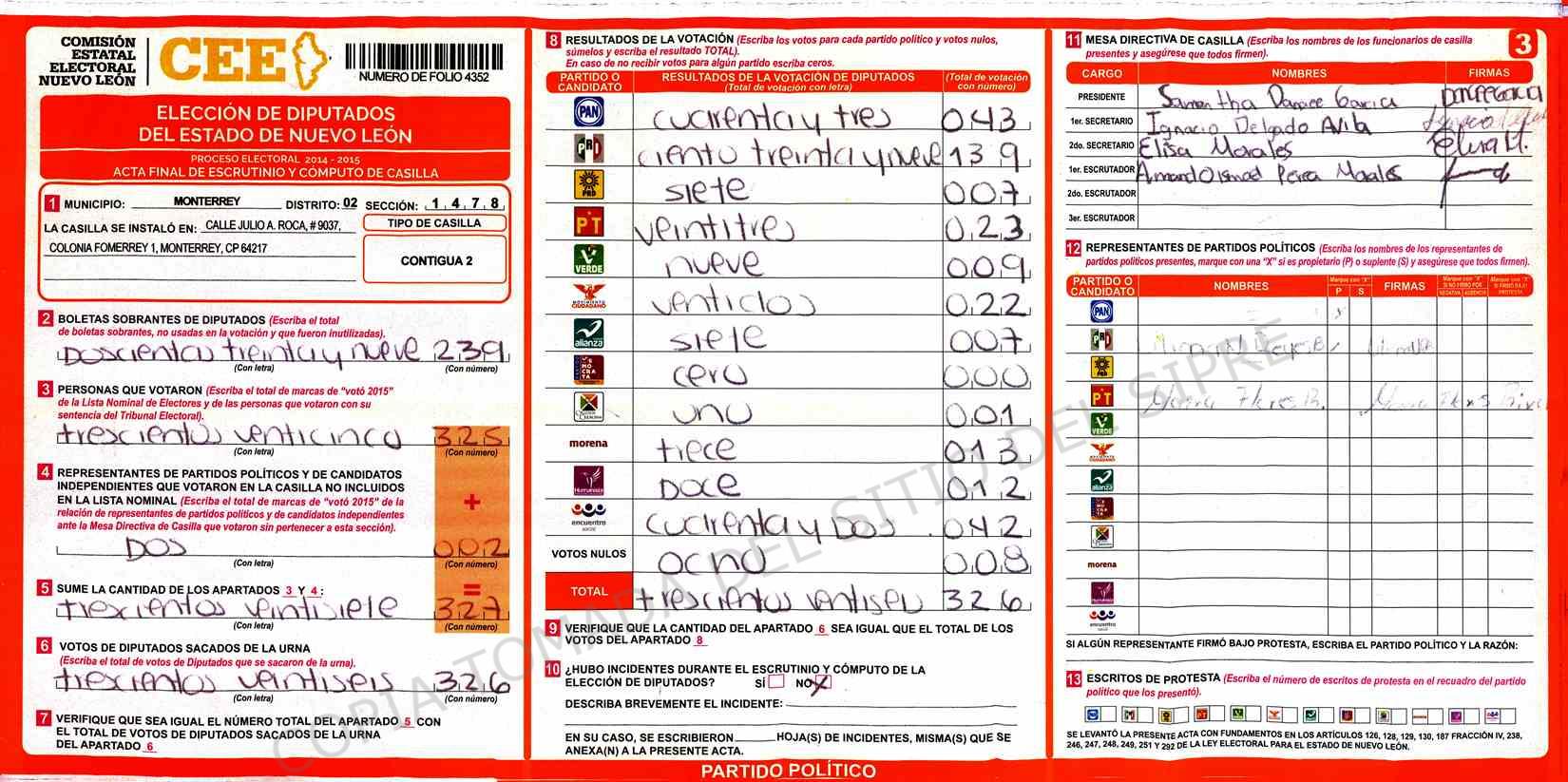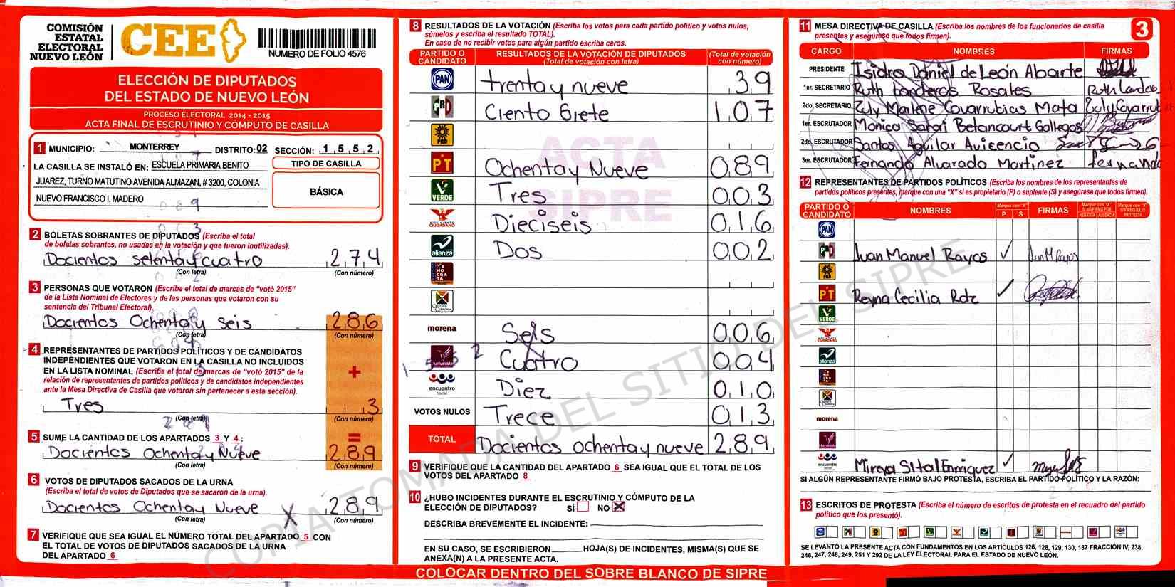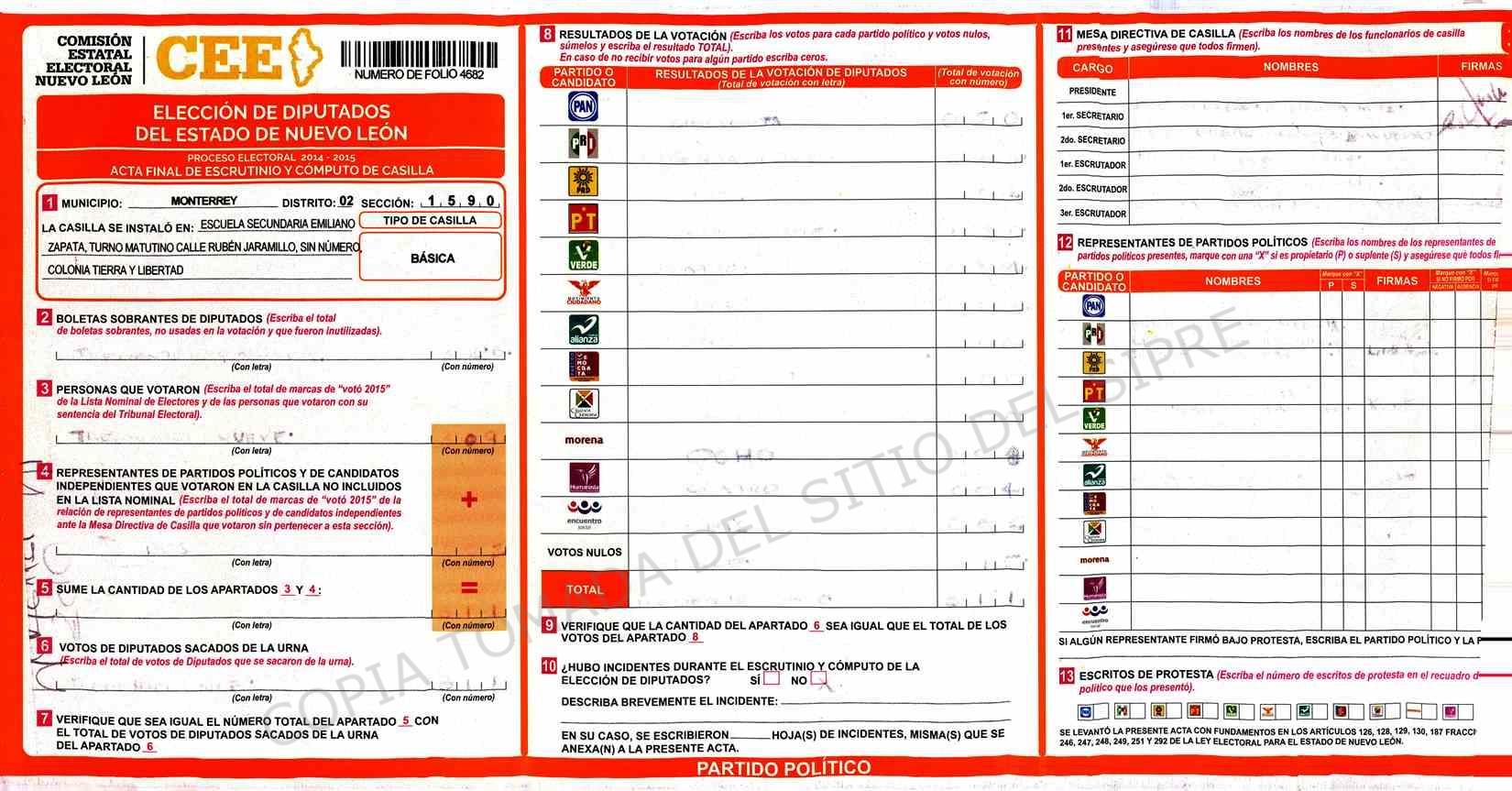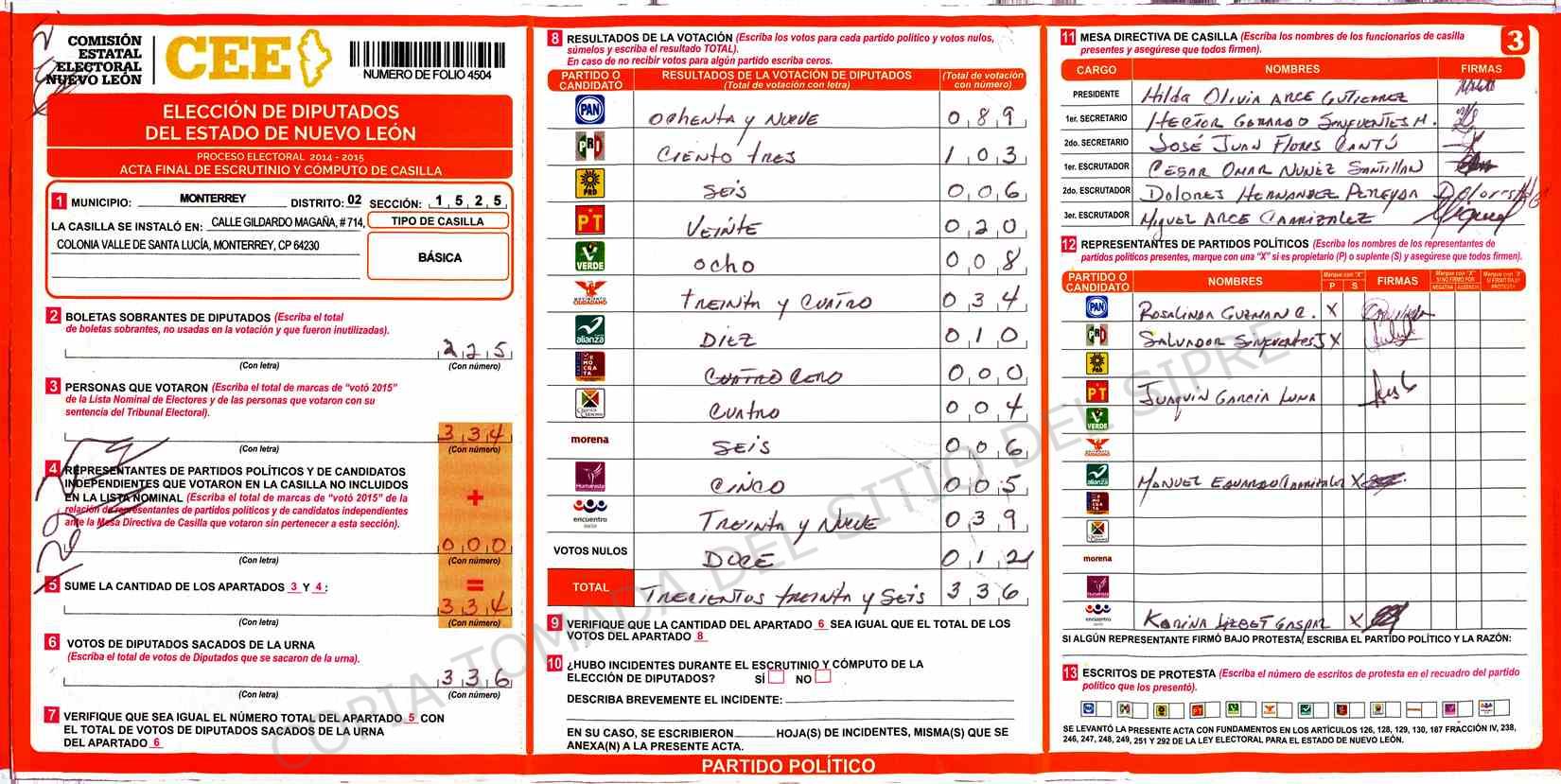 | Claves de Incidencia: | (1) Ilegible, (2) Mutilada, (3) Presenta Correcciones, (4) Presenta Borrones, (5) En Blanco, (6) Cifras Remarcadas, (7) Cifras de Mas, (8) Copiado Movido, (9) Con Signos Inválidos, (10) Excede Lista Nominal, (11) Otra |