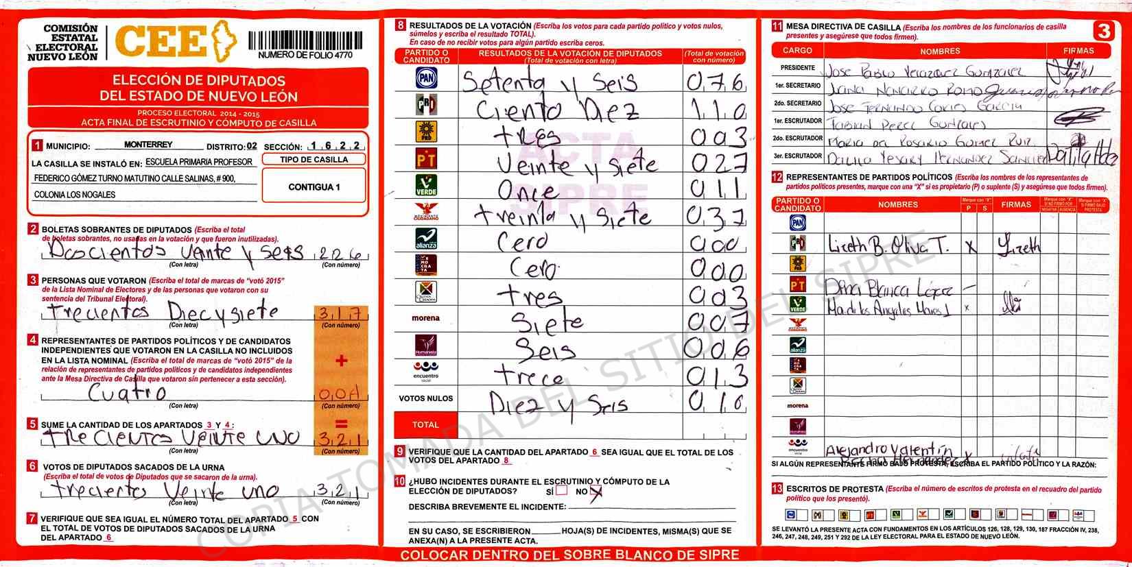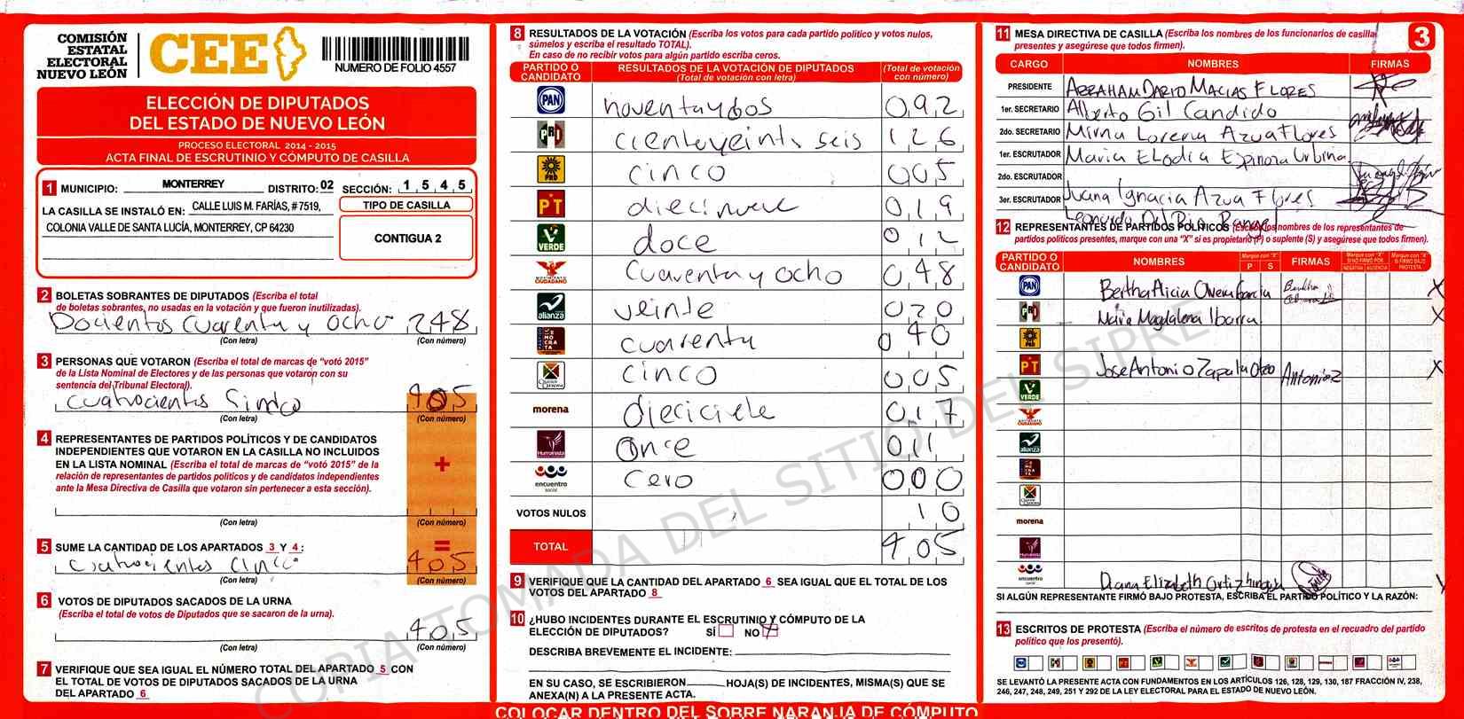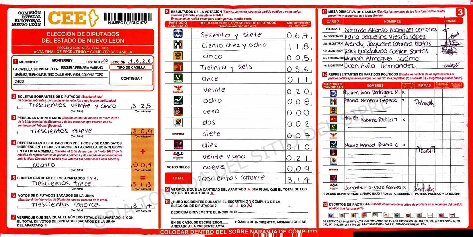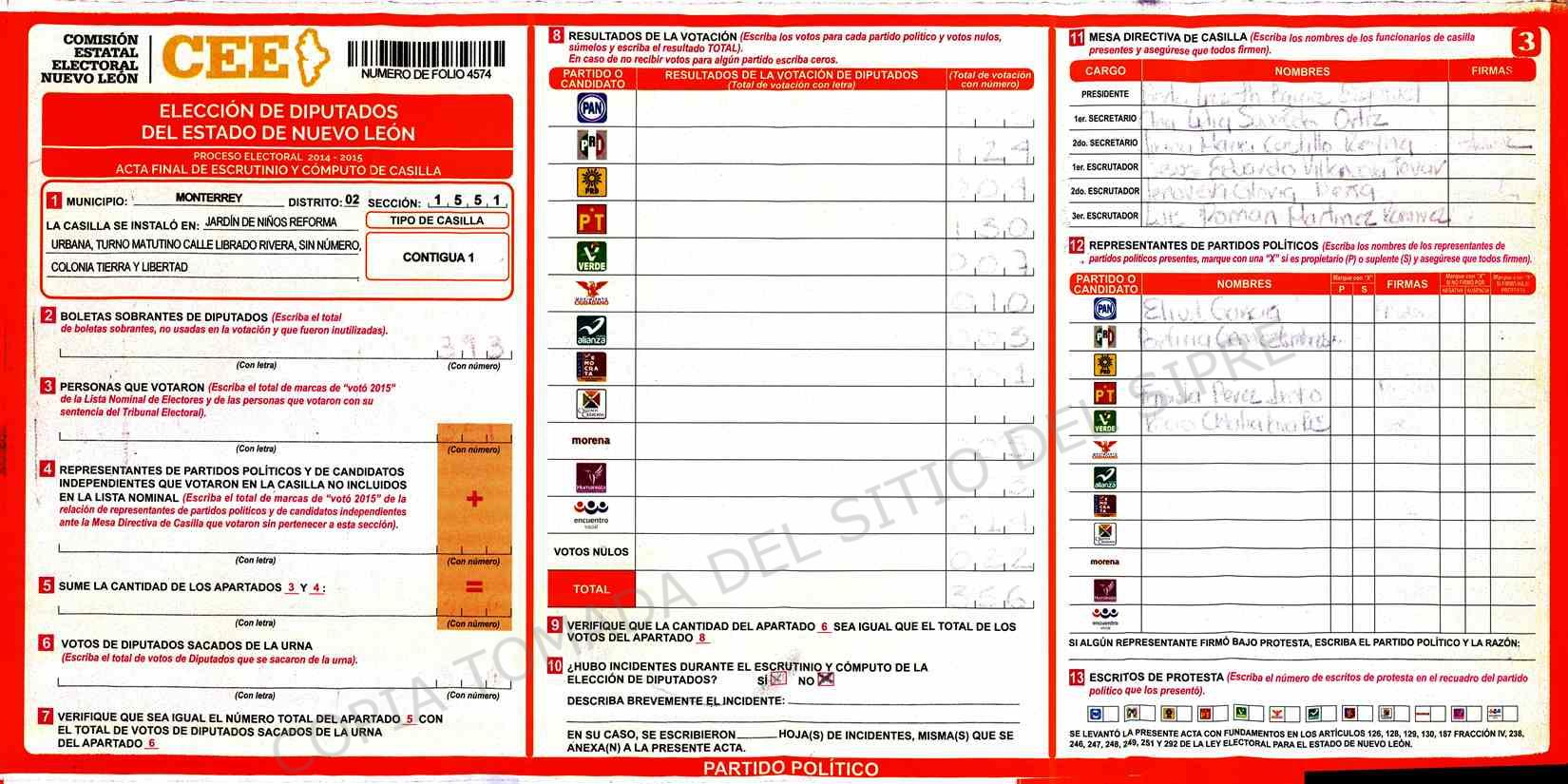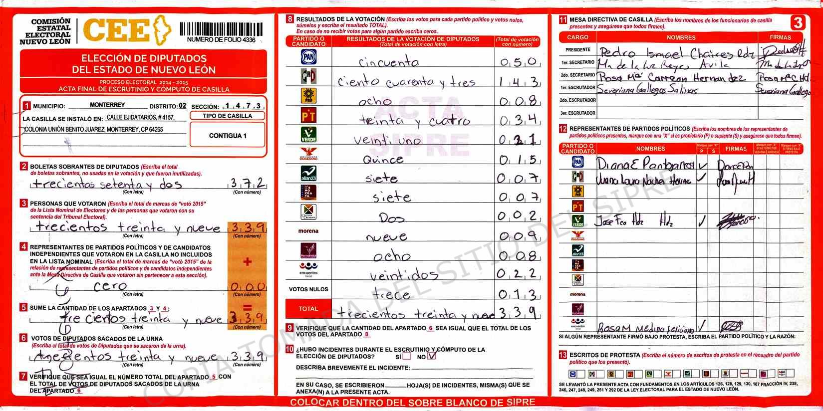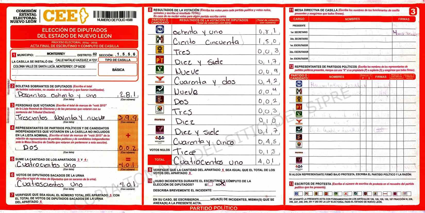 | Claves de Incidencia: | (1) Ilegible, (2) Mutilada, (3) Presenta Correcciones, (4) Presenta Borrones, (5) En Blanco, (6) Cifras Remarcadas, (7) Cifras de Mas, (8) Copiado Movido, (9) Con Signos Inválidos, (10) Excede Lista Nominal, (11) Otra |