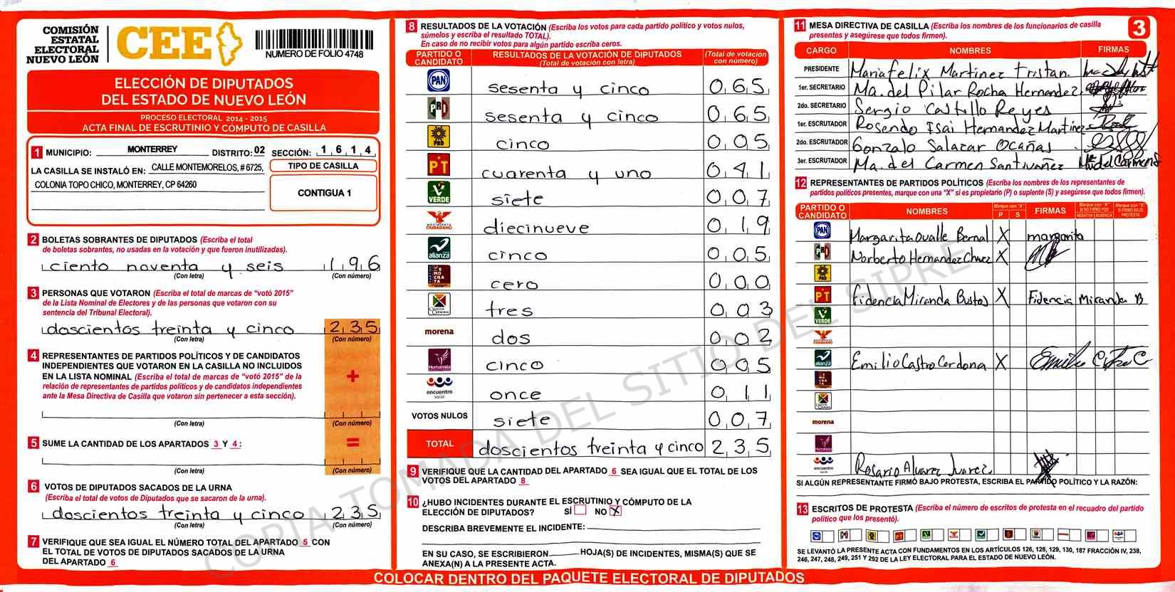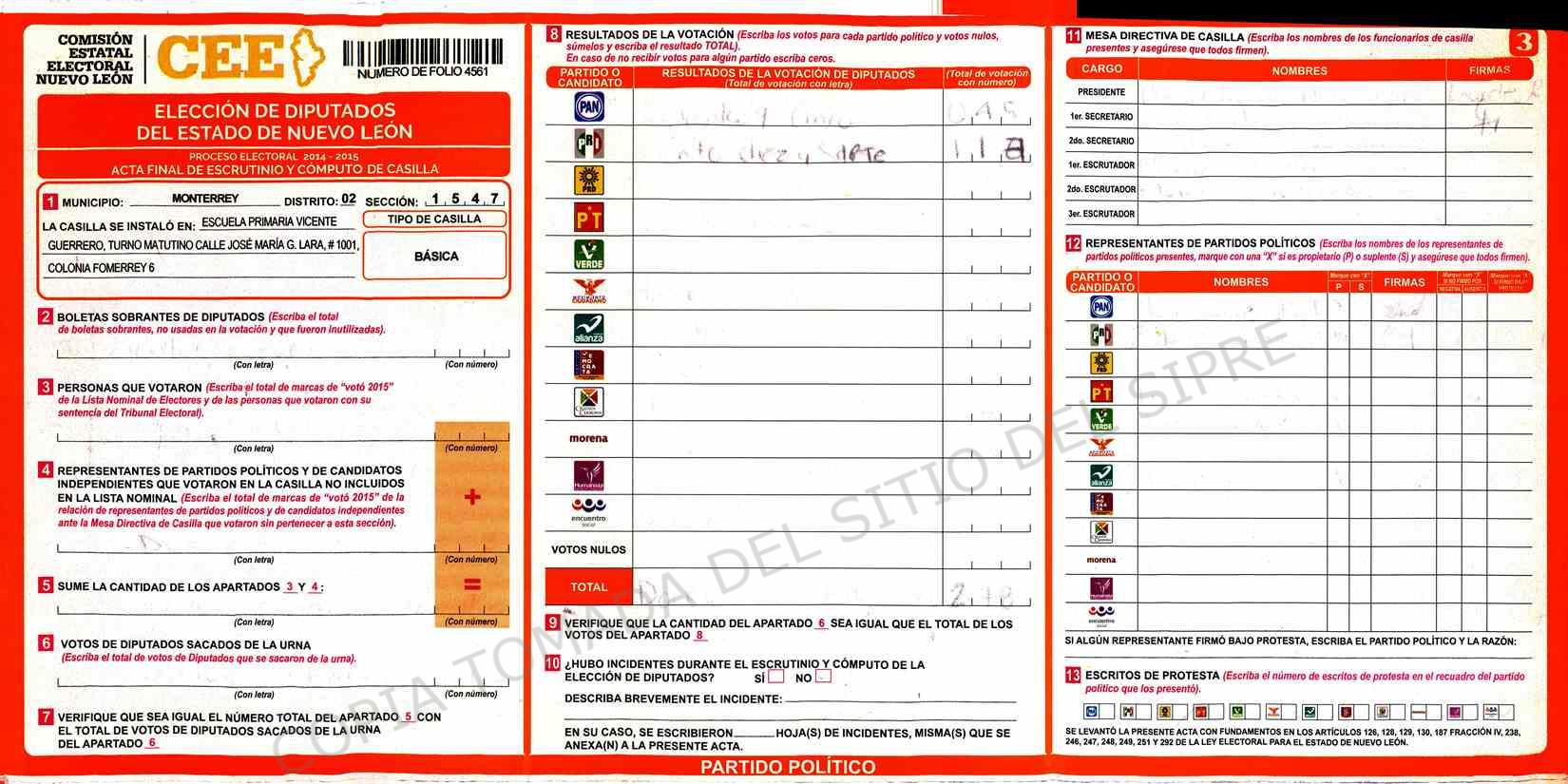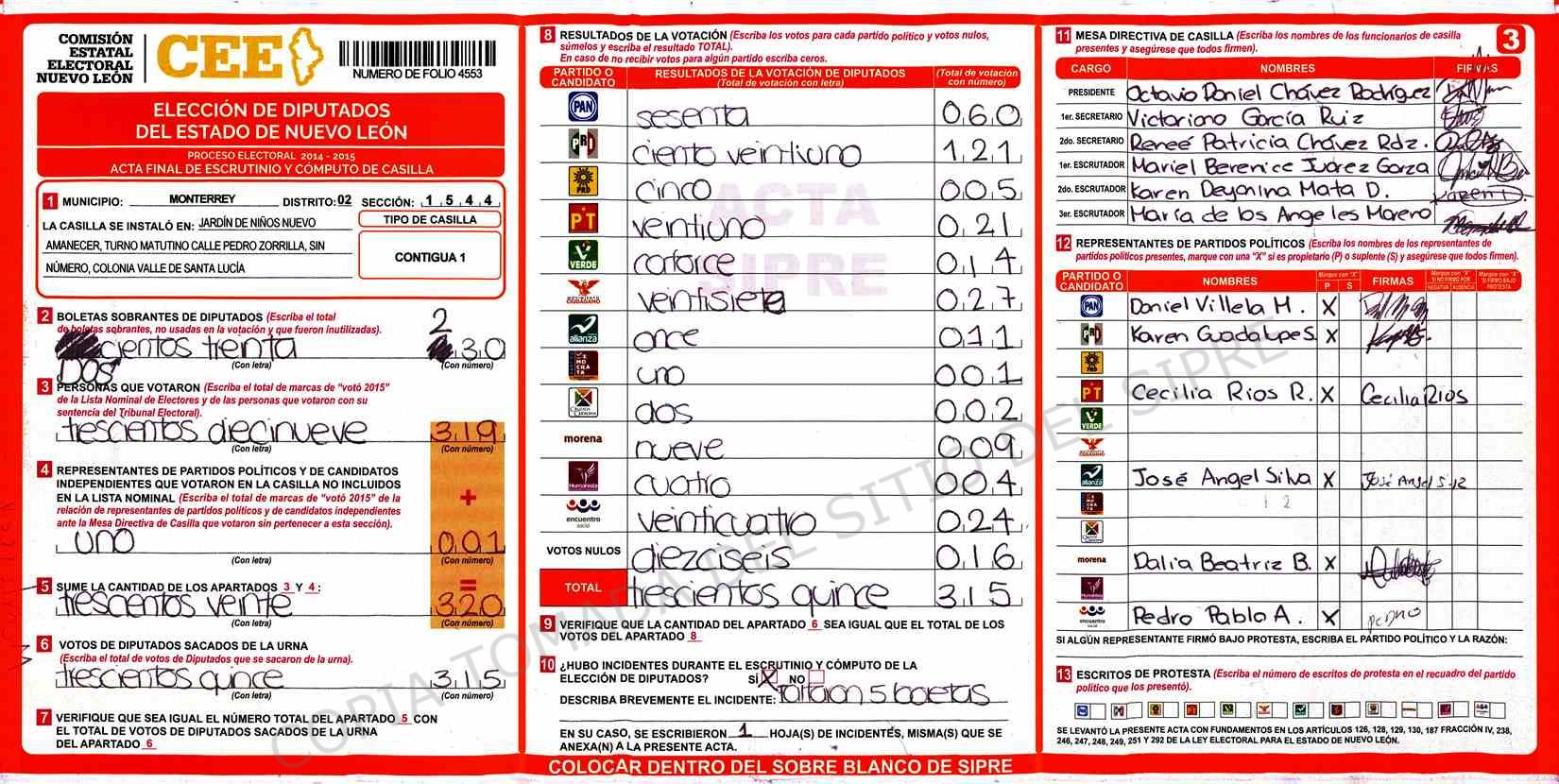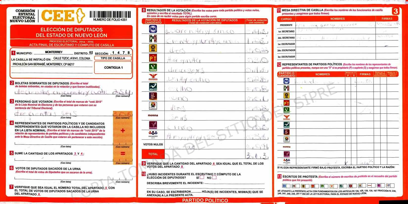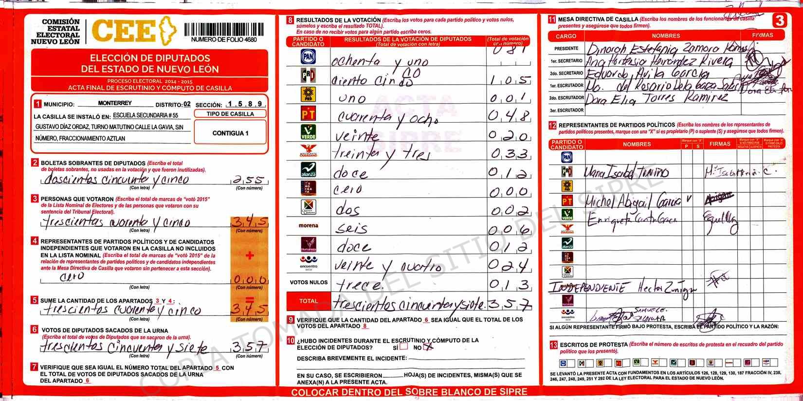 | Claves de Incidencia: | (1) Ilegible, (2) Mutilada, (3) Presenta Correcciones, (4) Presenta Borrones, (5) En Blanco, (6) Cifras Remarcadas, (7) Cifras de Mas, (8) Copiado Movido, (9) Con Signos Inválidos, (10) Excede Lista Nominal, (11) Otra |
