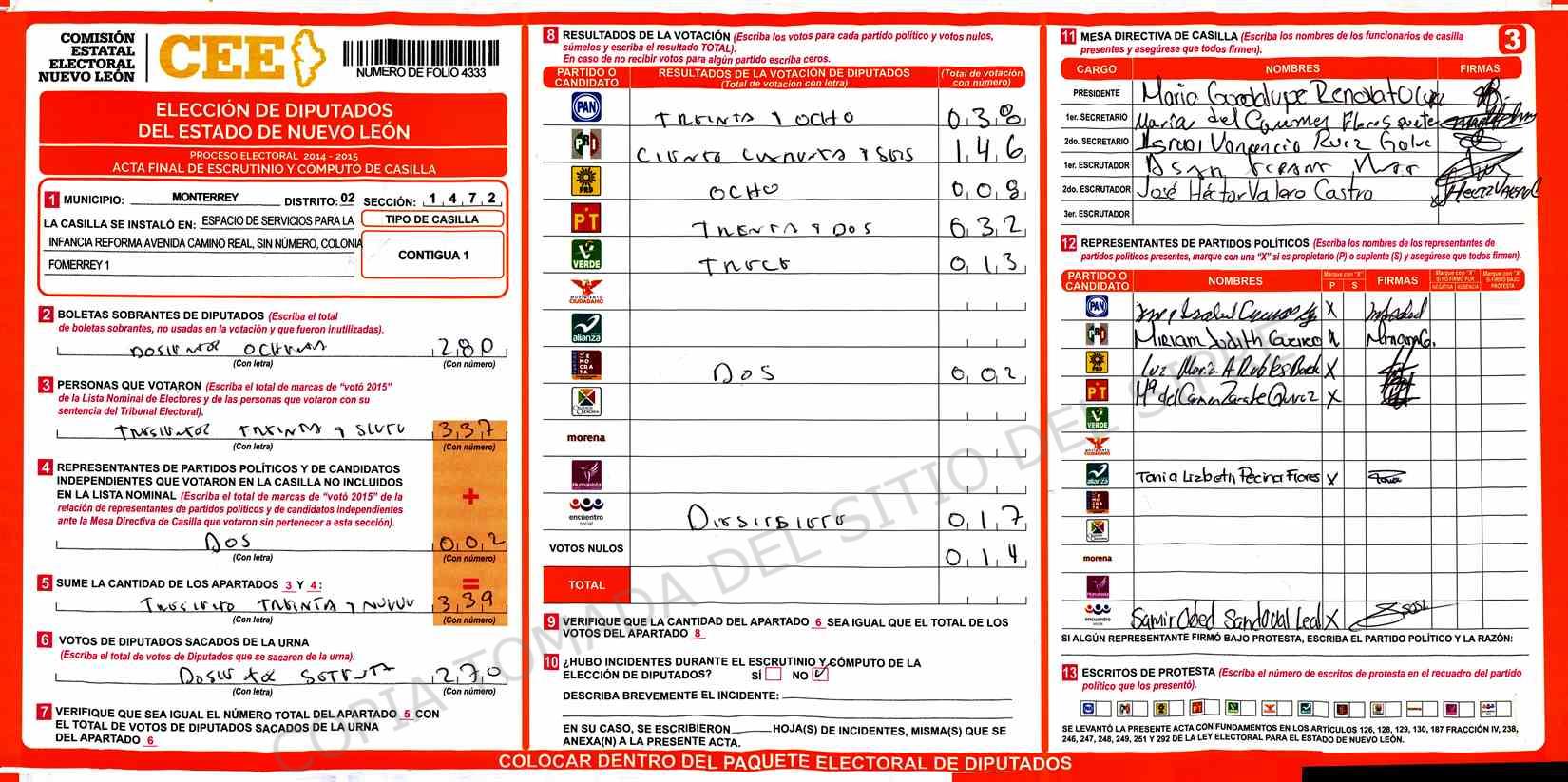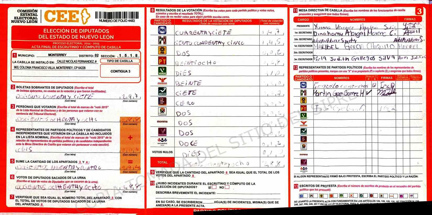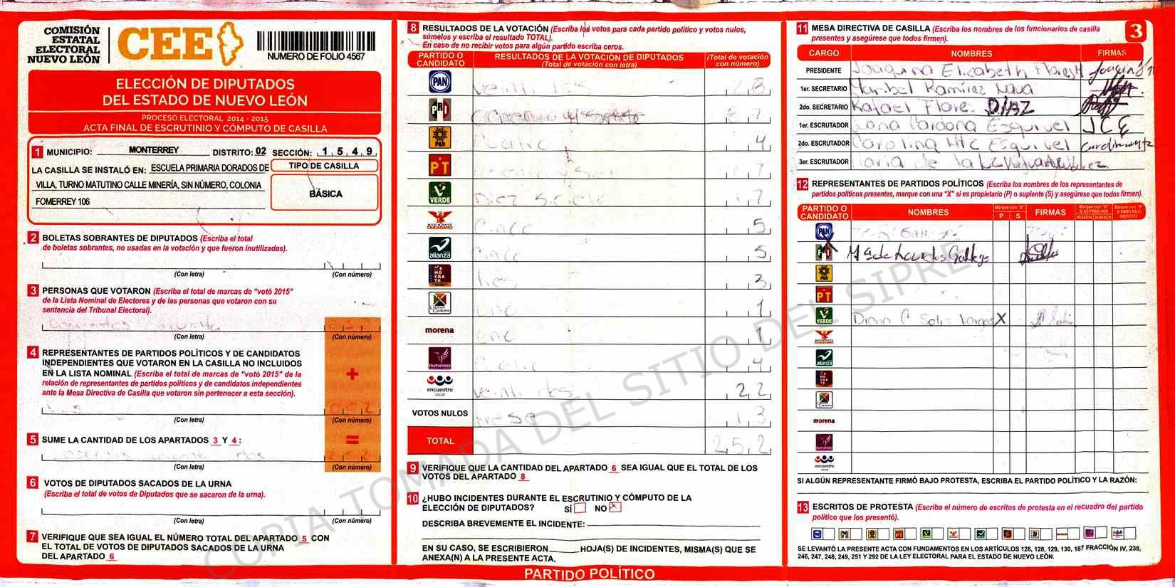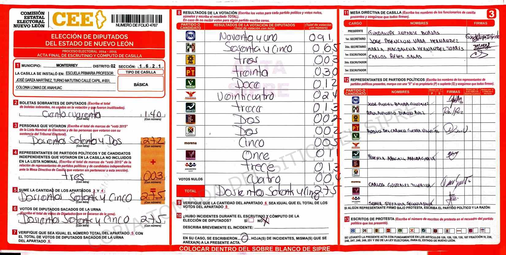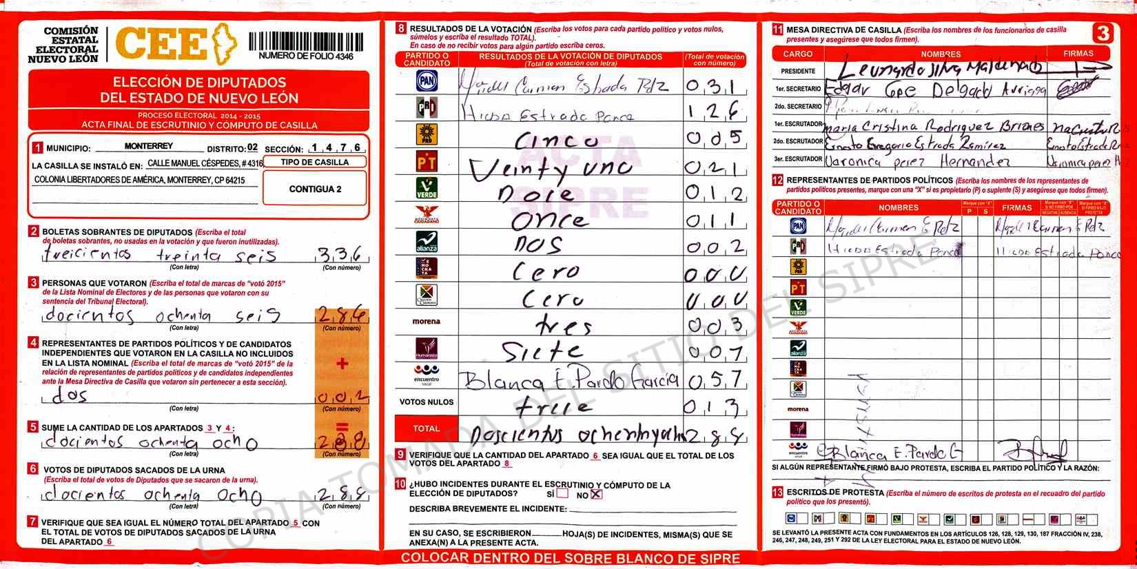 | Claves de Incidencia: | (1) Ilegible, (2) Mutilada, (3) Presenta Correcciones, (4) Presenta Borrones, (5) En Blanco, (6) Cifras Remarcadas, (7) Cifras de Mas, (8) Copiado Movido, (9) Con Signos Inválidos, (10) Excede Lista Nominal, (11) Otra |
