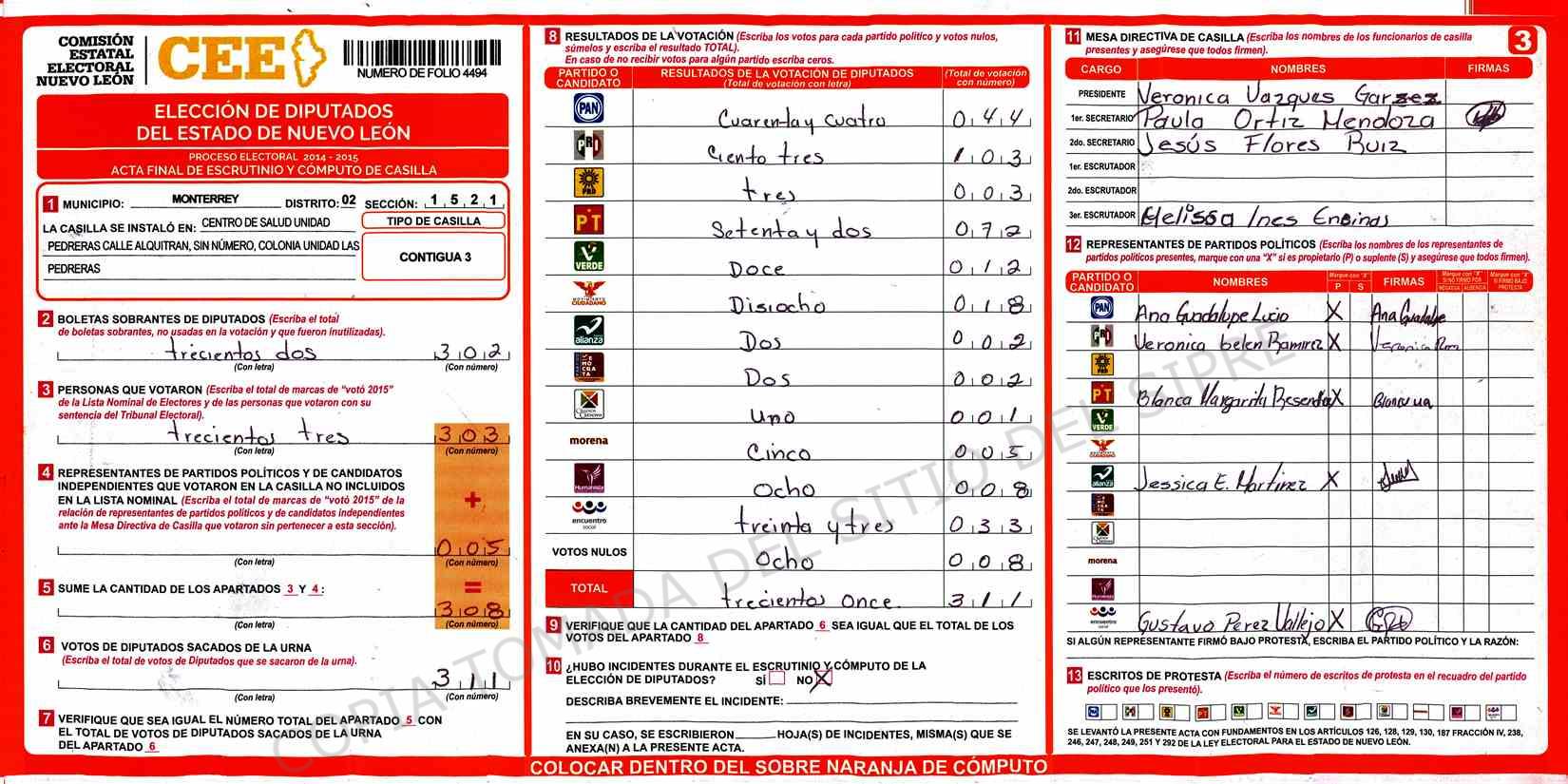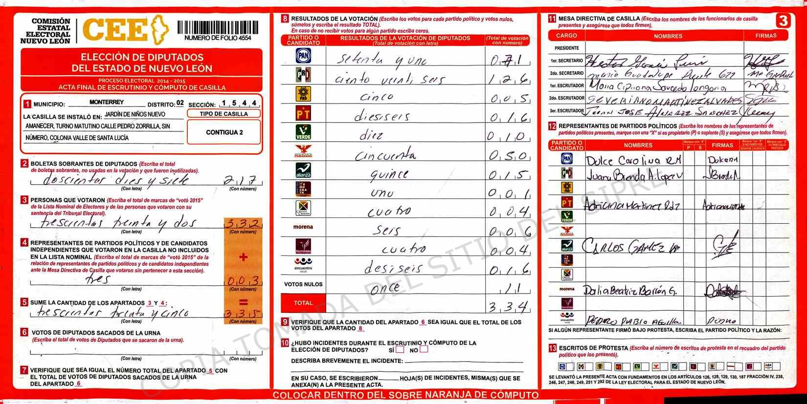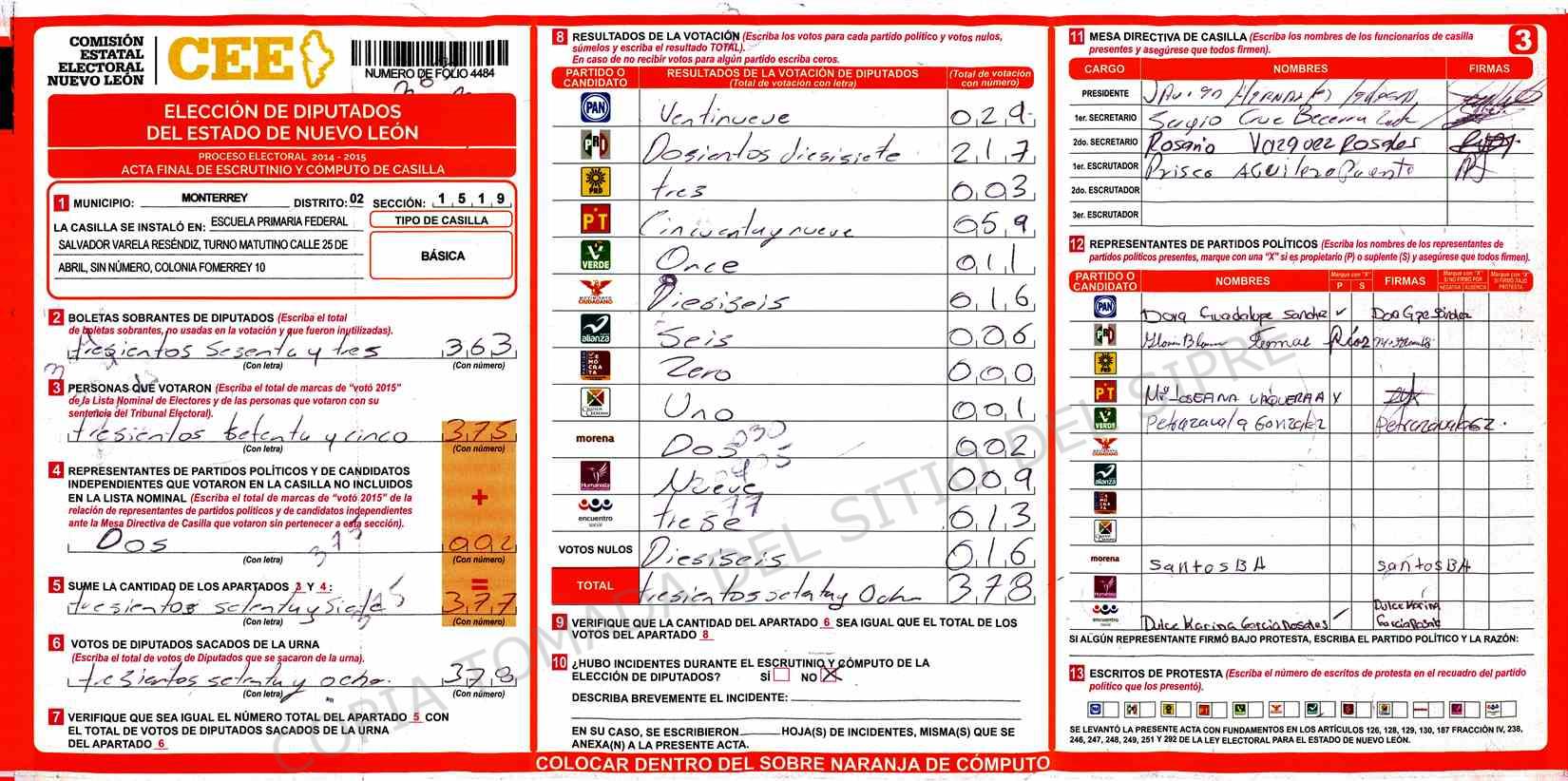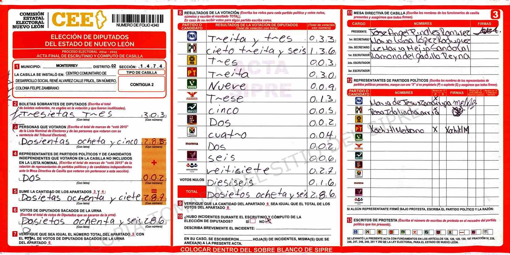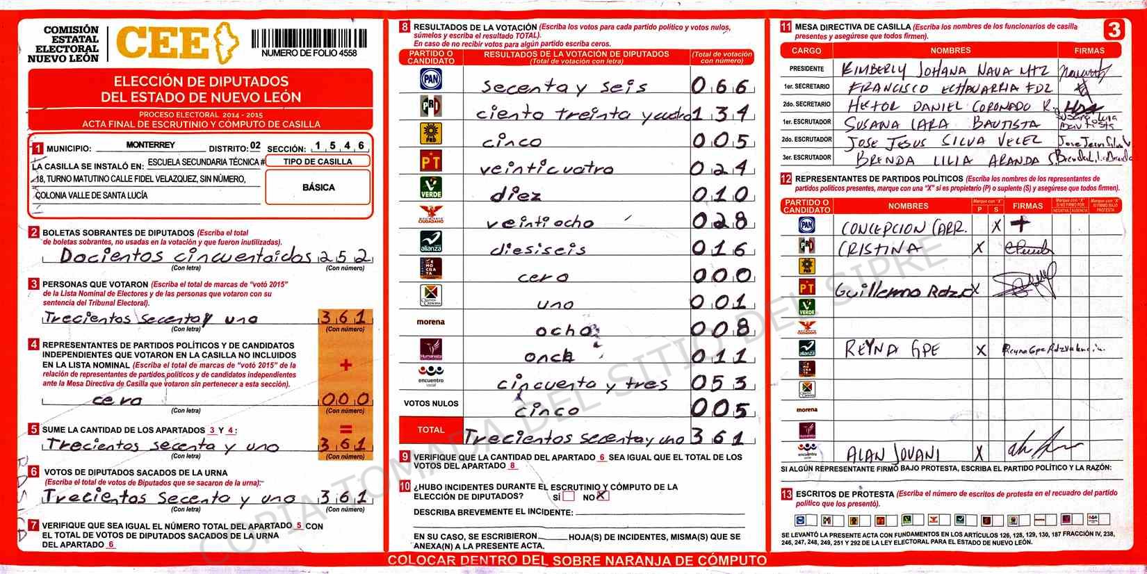 | Claves de Incidencia: | (1) Ilegible, (2) Mutilada, (3) Presenta Correcciones, (4) Presenta Borrones, (5) En Blanco, (6) Cifras Remarcadas, (7) Cifras de Mas, (8) Copiado Movido, (9) Con Signos Inválidos, (10) Excede Lista Nominal, (11) Otra |