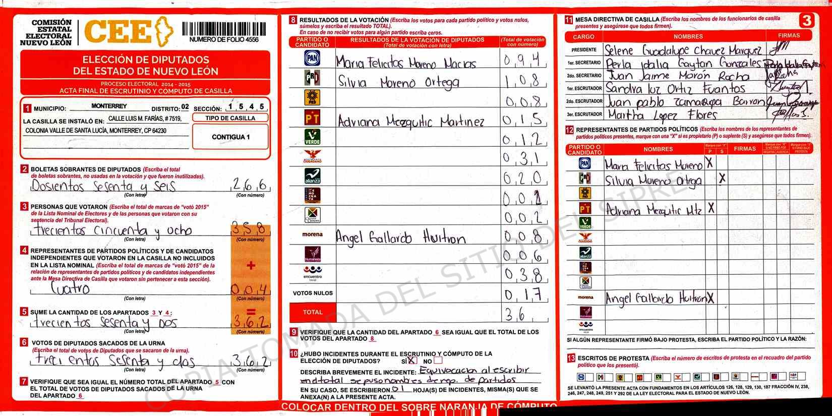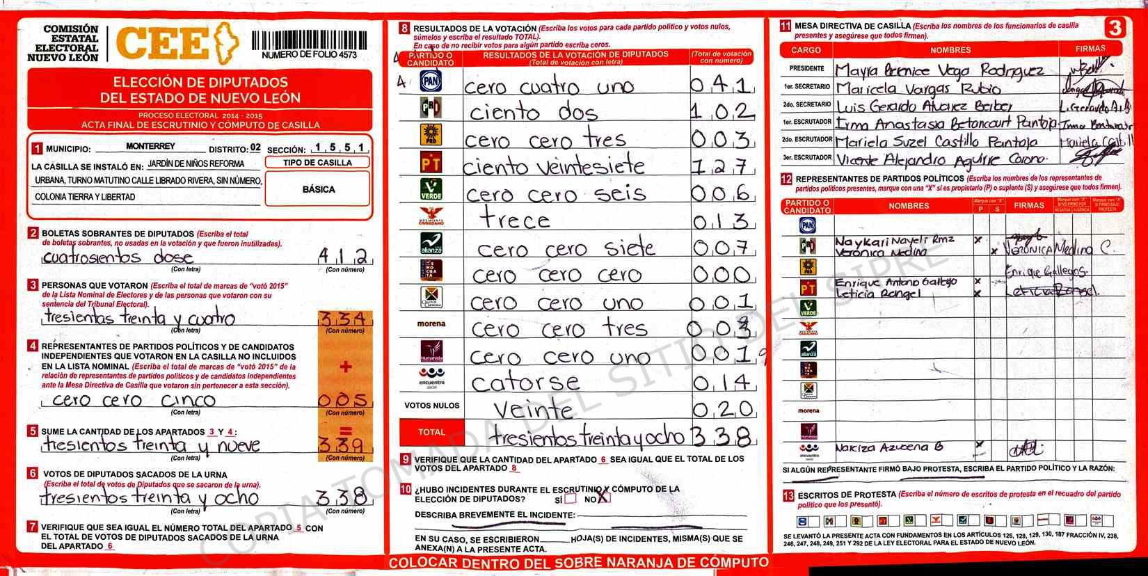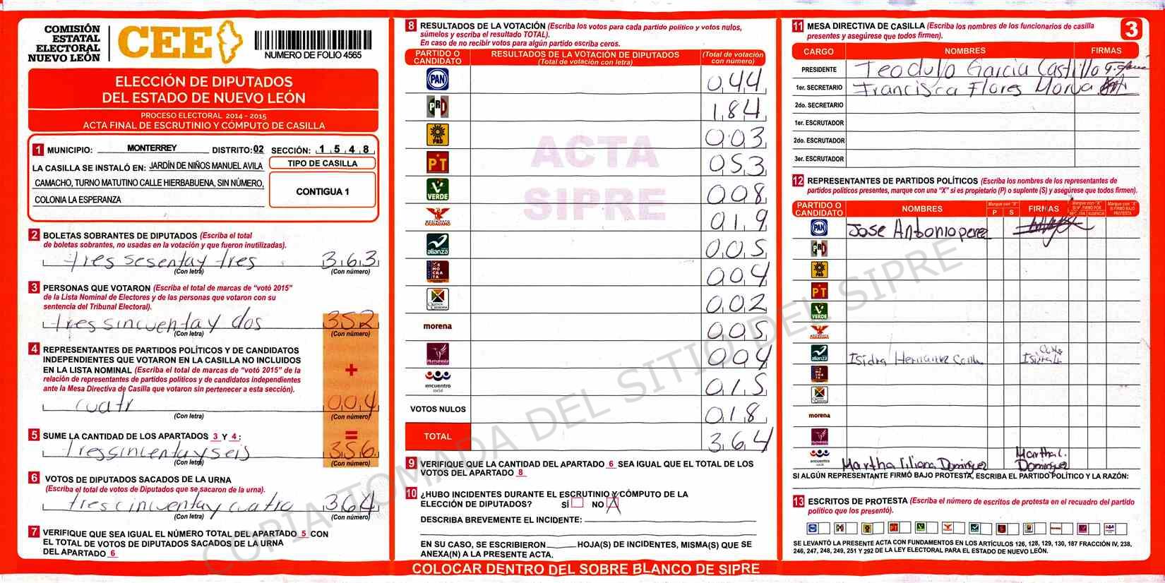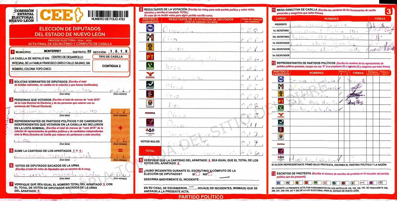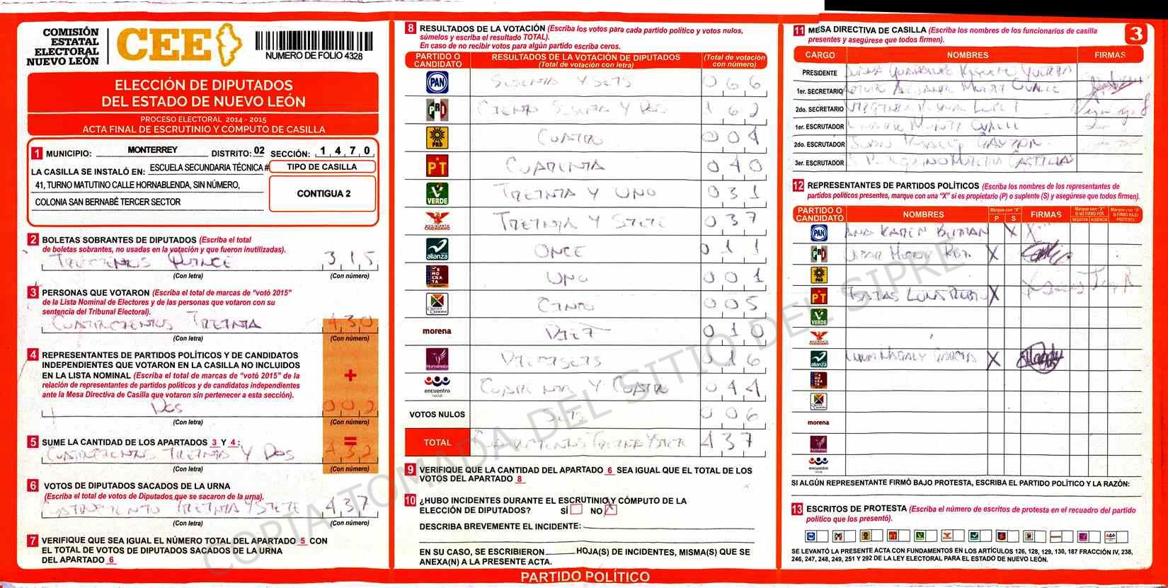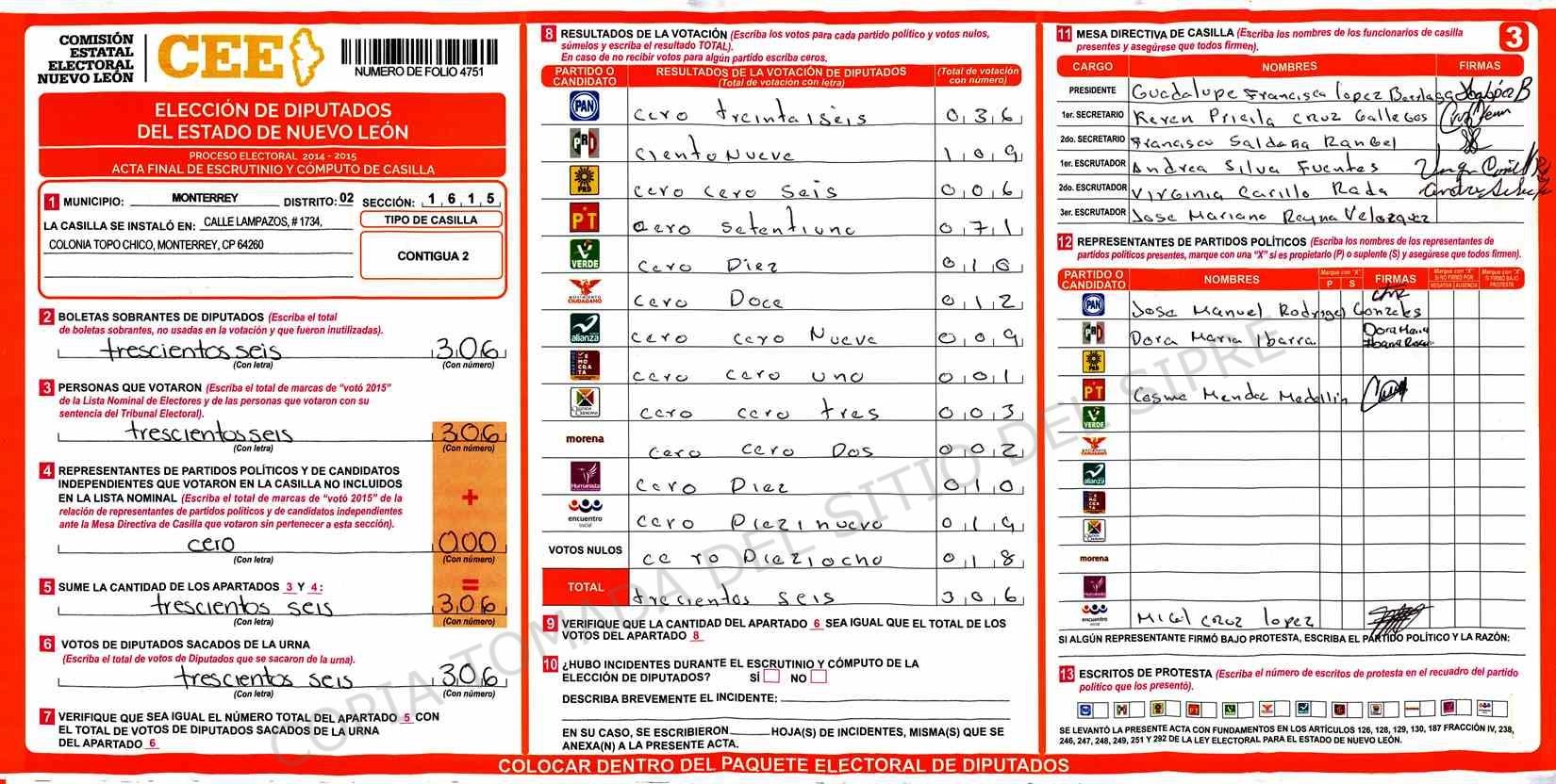 | Claves de Incidencia: | (1) Ilegible, (2) Mutilada, (3) Presenta Correcciones, (4) Presenta Borrones, (5) En Blanco, (6) Cifras Remarcadas, (7) Cifras de Mas, (8) Copiado Movido, (9) Con Signos Inválidos, (10) Excede Lista Nominal, (11) Otra |
