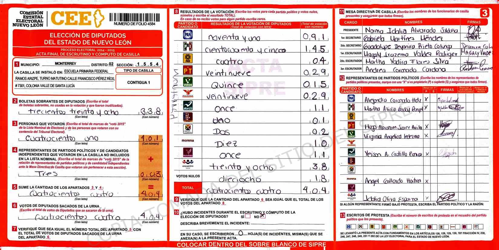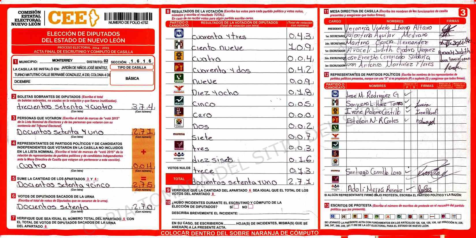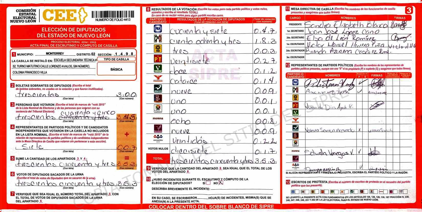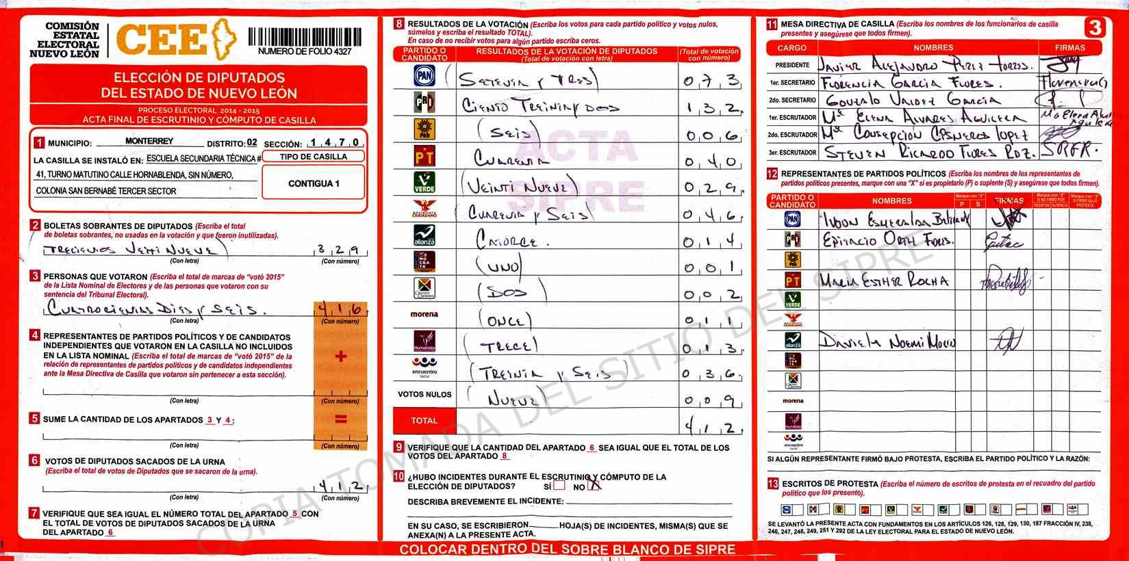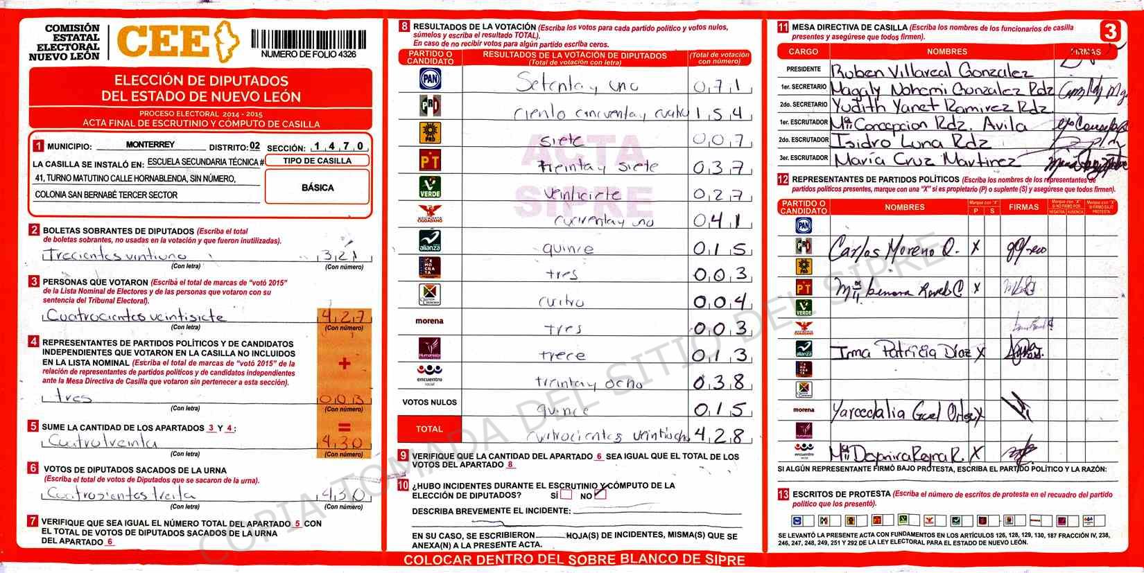 | Claves de Incidencia: | (1) Ilegible, (2) Mutilada, (3) Presenta Correcciones, (4) Presenta Borrones, (5) En Blanco, (6) Cifras Remarcadas, (7) Cifras de Mas, (8) Copiado Movido, (9) Con Signos Inválidos, (10) Excede Lista Nominal, (11) Otra |