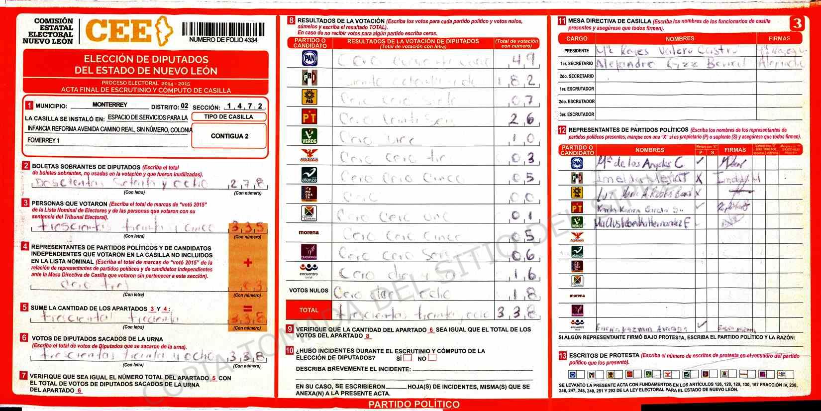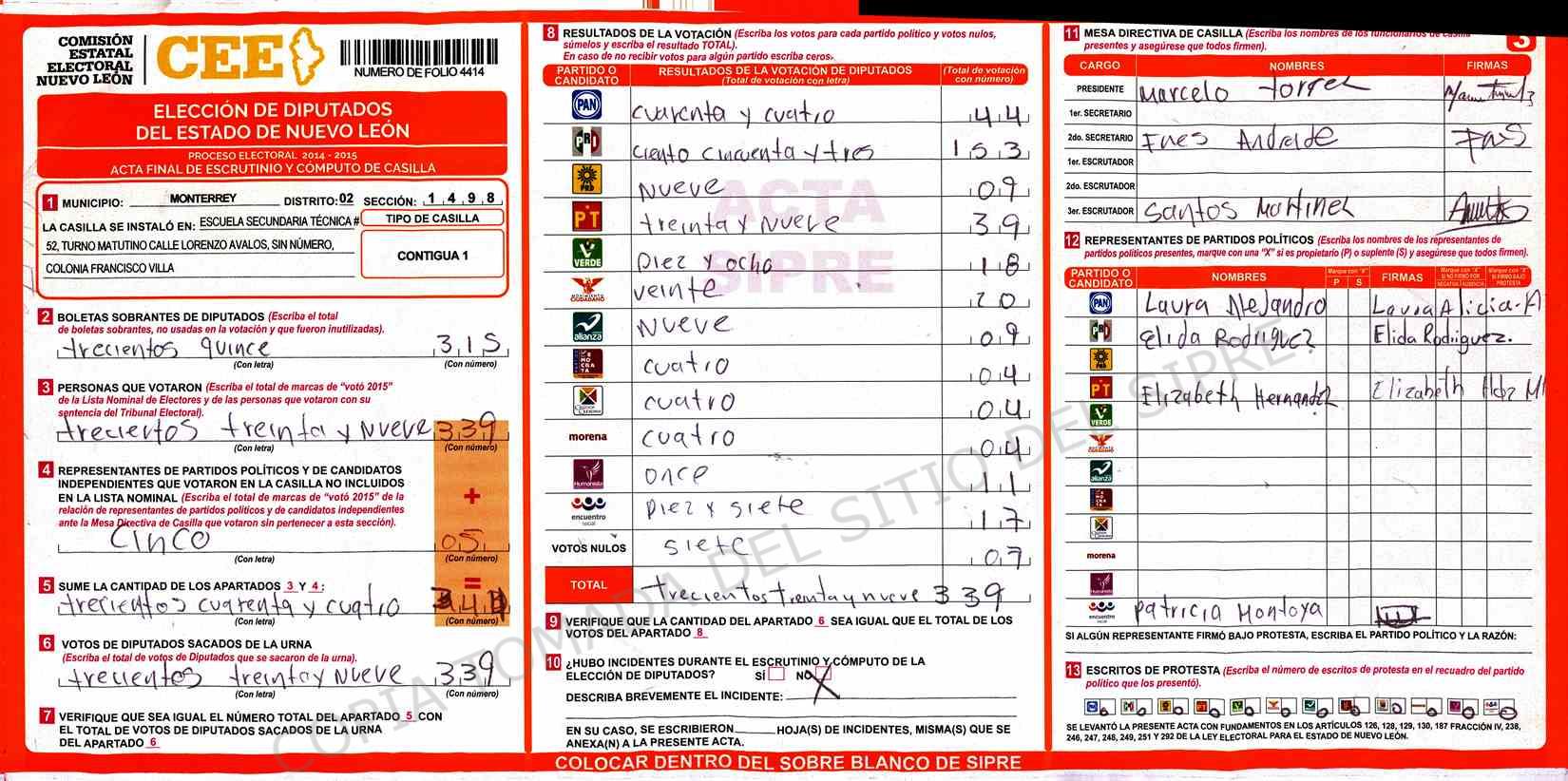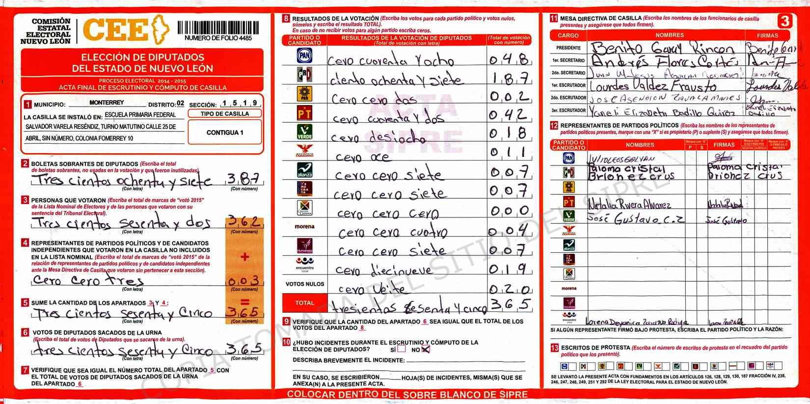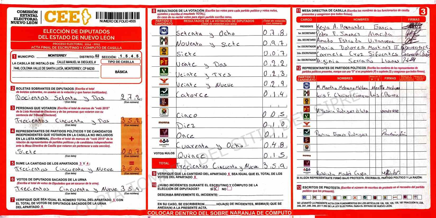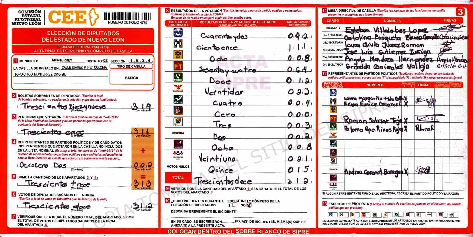 | Claves de Incidencia: | (1) Ilegible, (2) Mutilada, (3) Presenta Correcciones, (4) Presenta Borrones, (5) En Blanco, (6) Cifras Remarcadas, (7) Cifras de Mas, (8) Copiado Movido, (9) Con Signos Inválidos, (10) Excede Lista Nominal, (11) Otra |