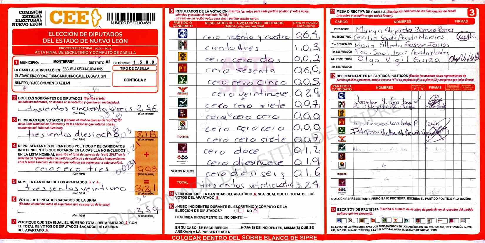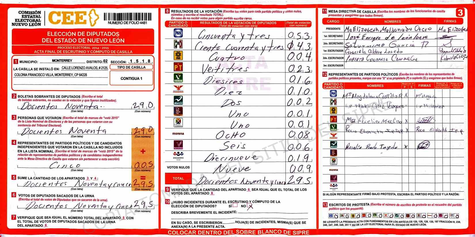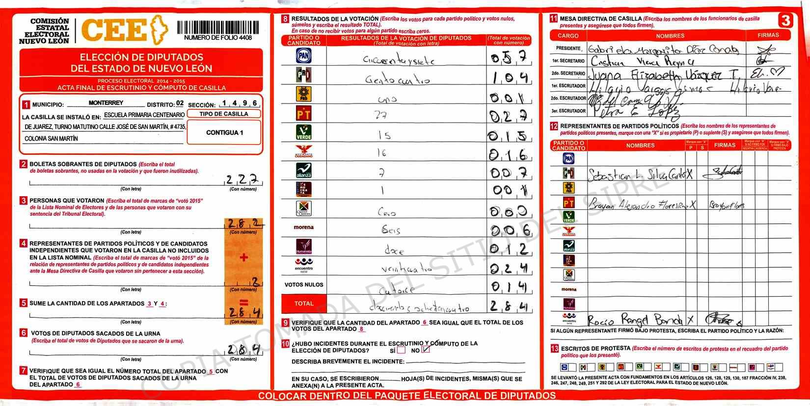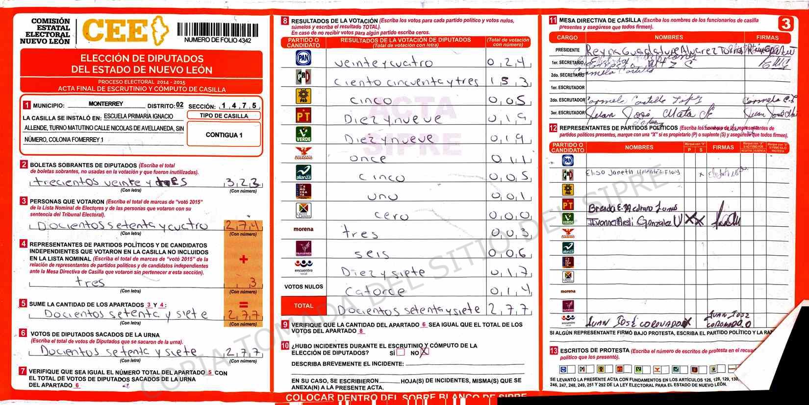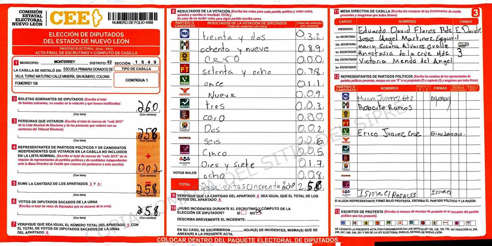| Claves de Incidencia: | (1) Ilegible, (2) Mutilada, (3) Presenta Correcciones, (4) Presenta Borrones, (5) En Blanco, (6) Cifras Remarcadas, (7) Cifras de Mas, (8) Copiado Movido, (9) Con Signos Inválidos, (10) Excede Lista Nominal, (11) Otra |