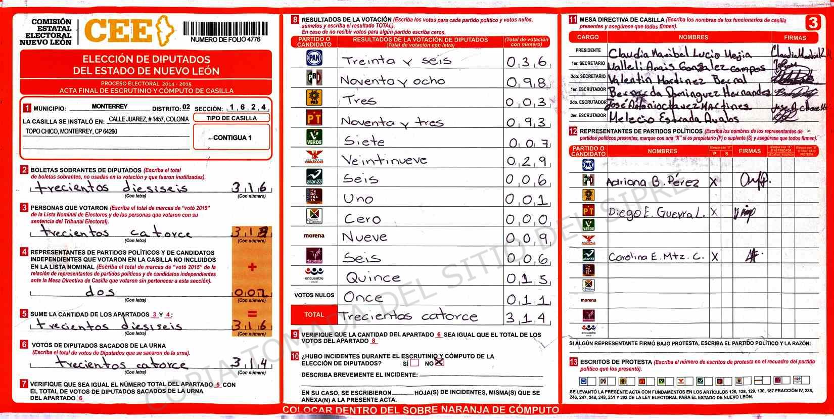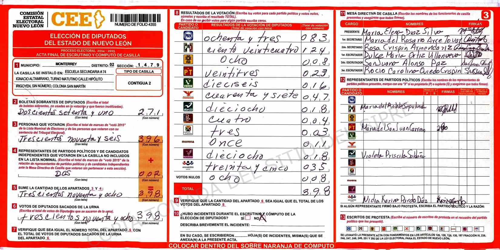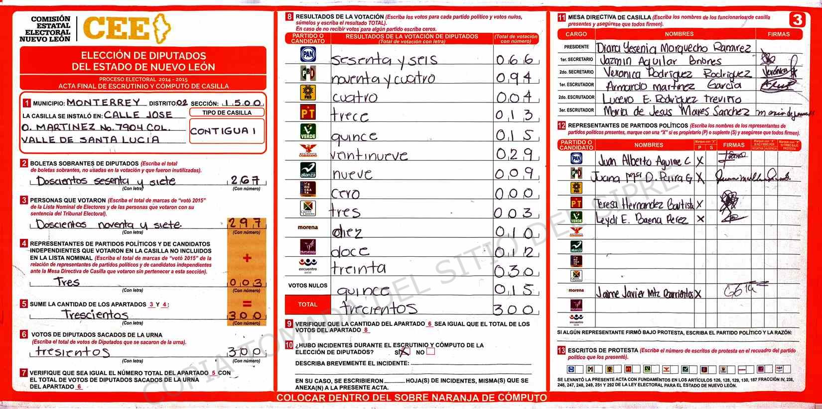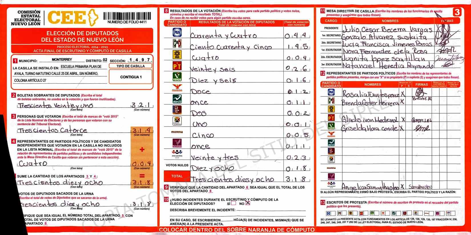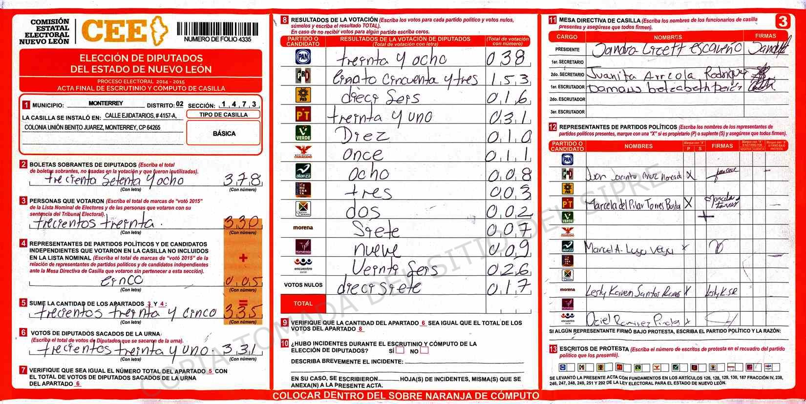| Claves de Incidencia: | (1) Ilegible, (2) Mutilada, (3) Presenta Correcciones, (4) Presenta Borrones, (5) En Blanco, (6) Cifras Remarcadas, (7) Cifras de Mas, (8) Copiado Movido, (9) Con Signos Inválidos, (10) Excede Lista Nominal, (11) Otra |