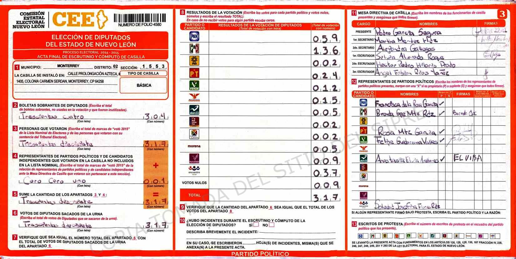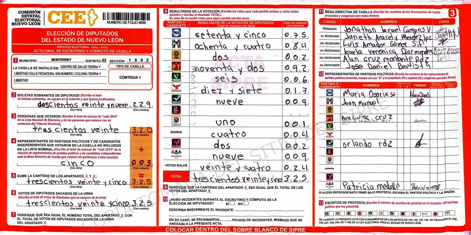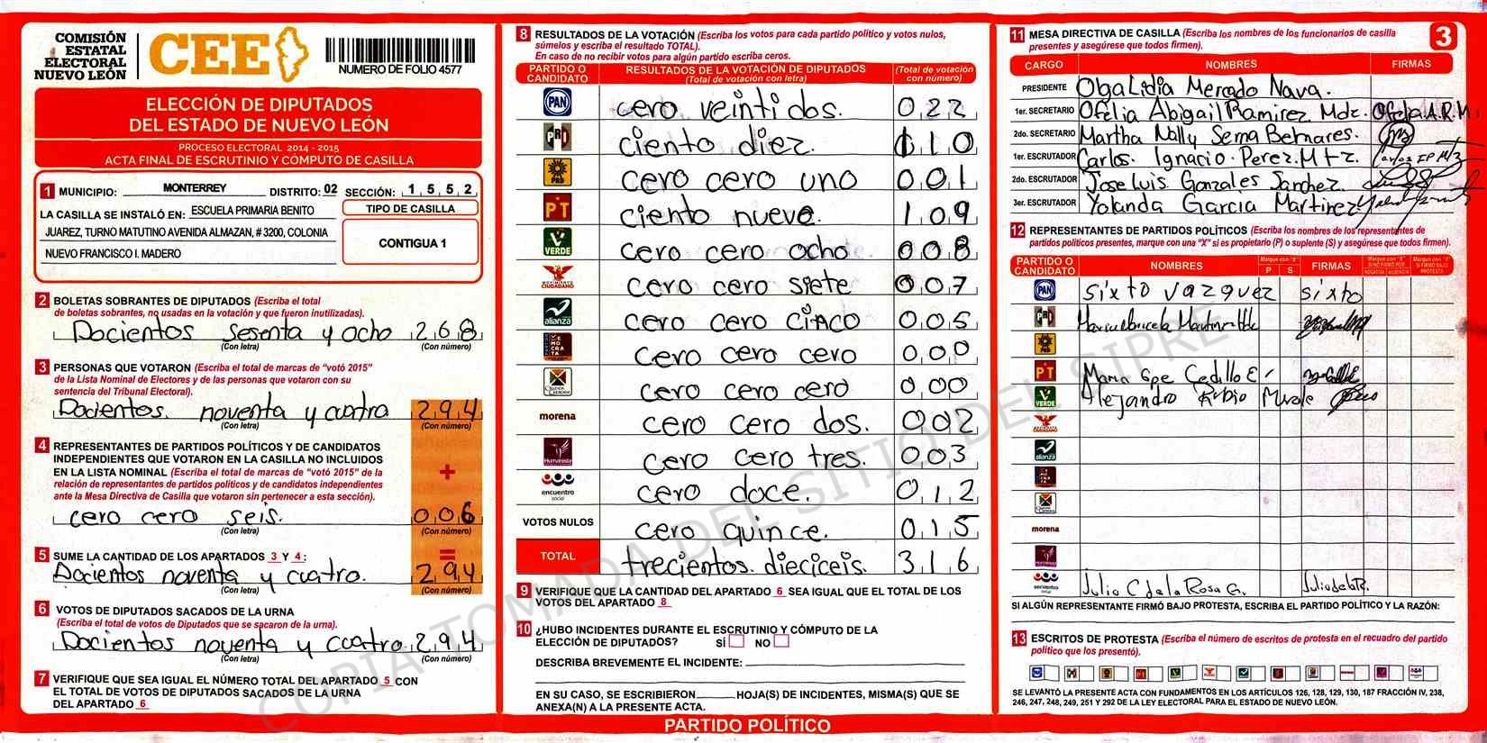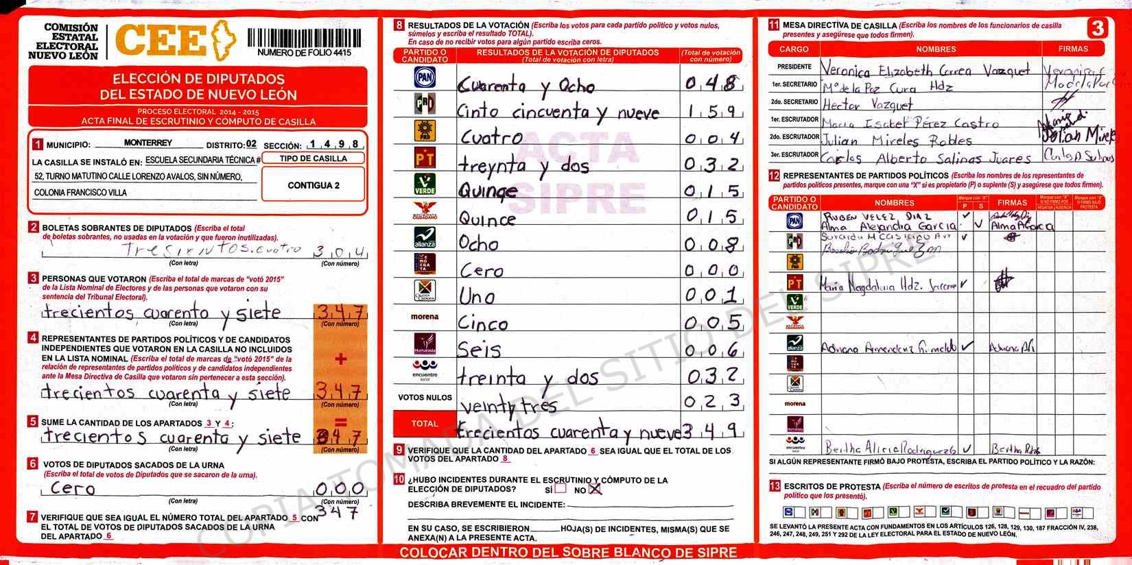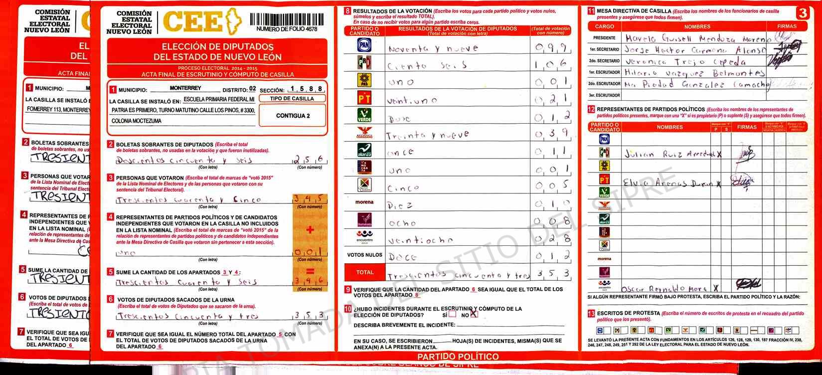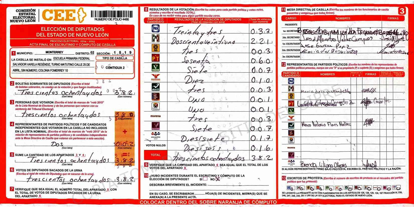 | Claves de Incidencia: | (1) Ilegible, (2) Mutilada, (3) Presenta Correcciones, (4) Presenta Borrones, (5) En Blanco, (6) Cifras Remarcadas, (7) Cifras de Mas, (8) Copiado Movido, (9) Con Signos Inválidos, (10) Excede Lista Nominal, (11) Otra |