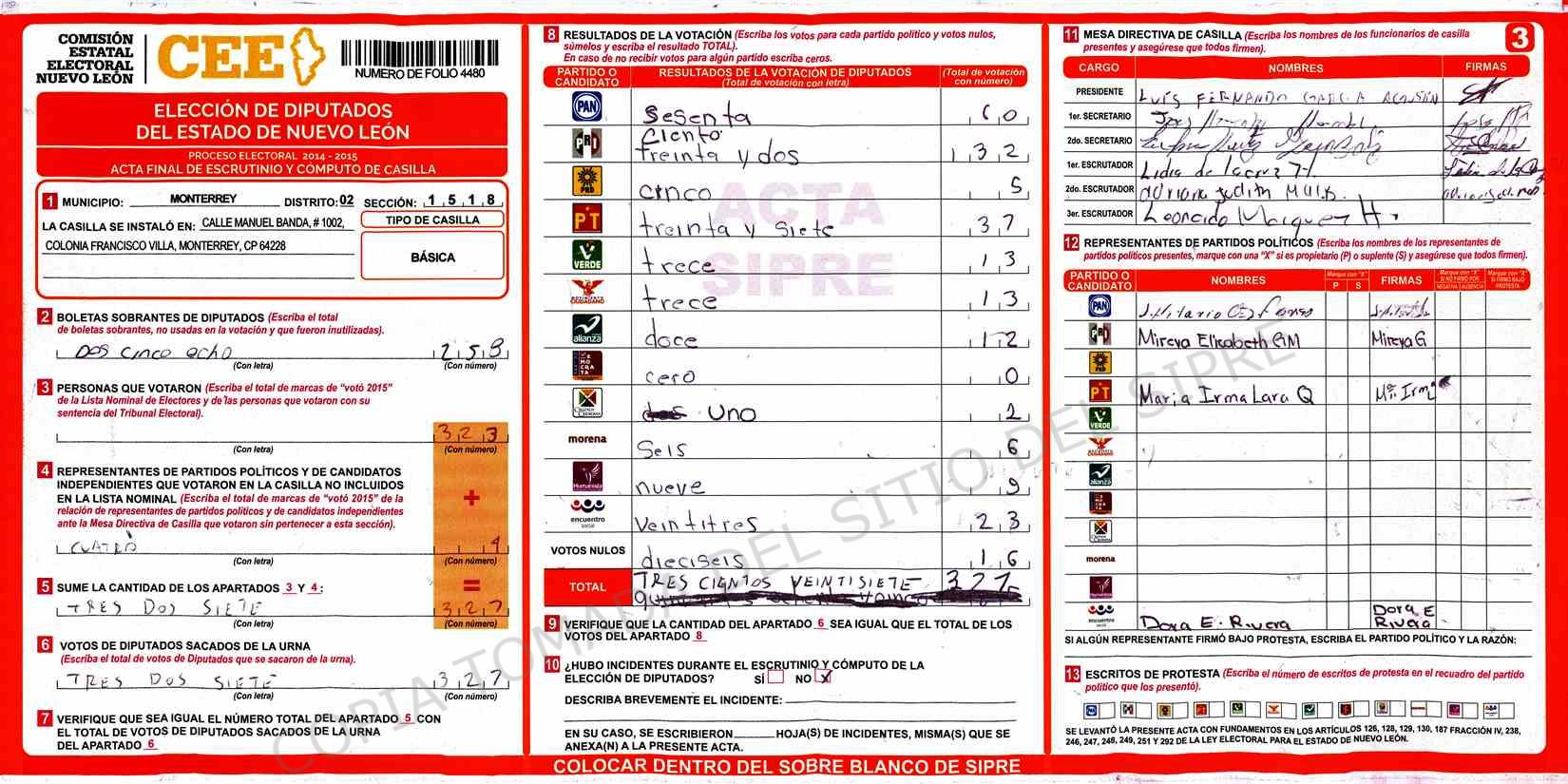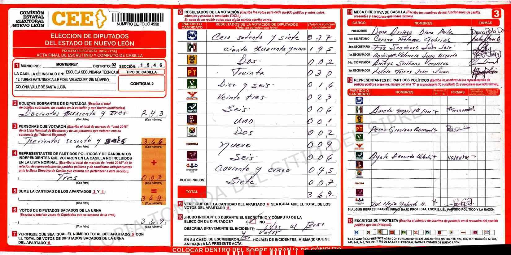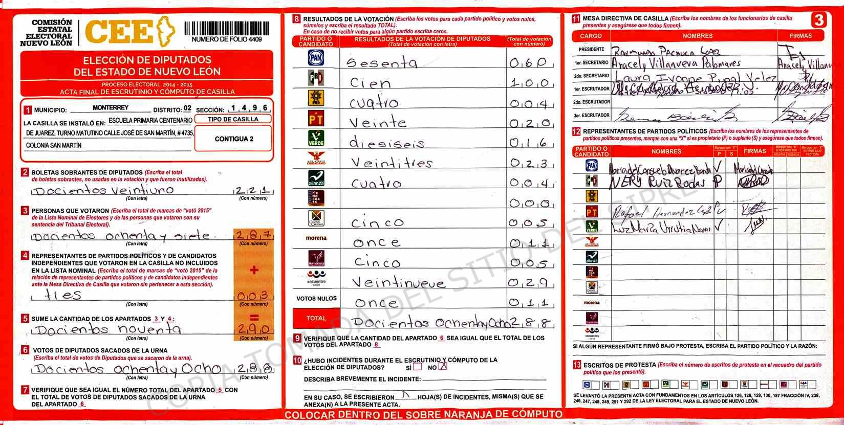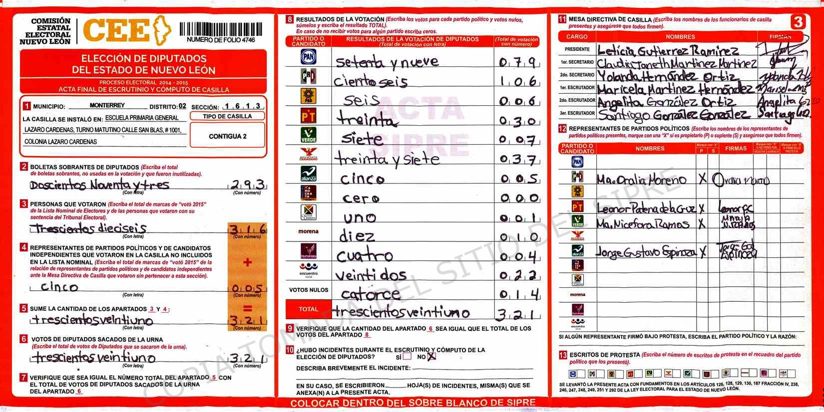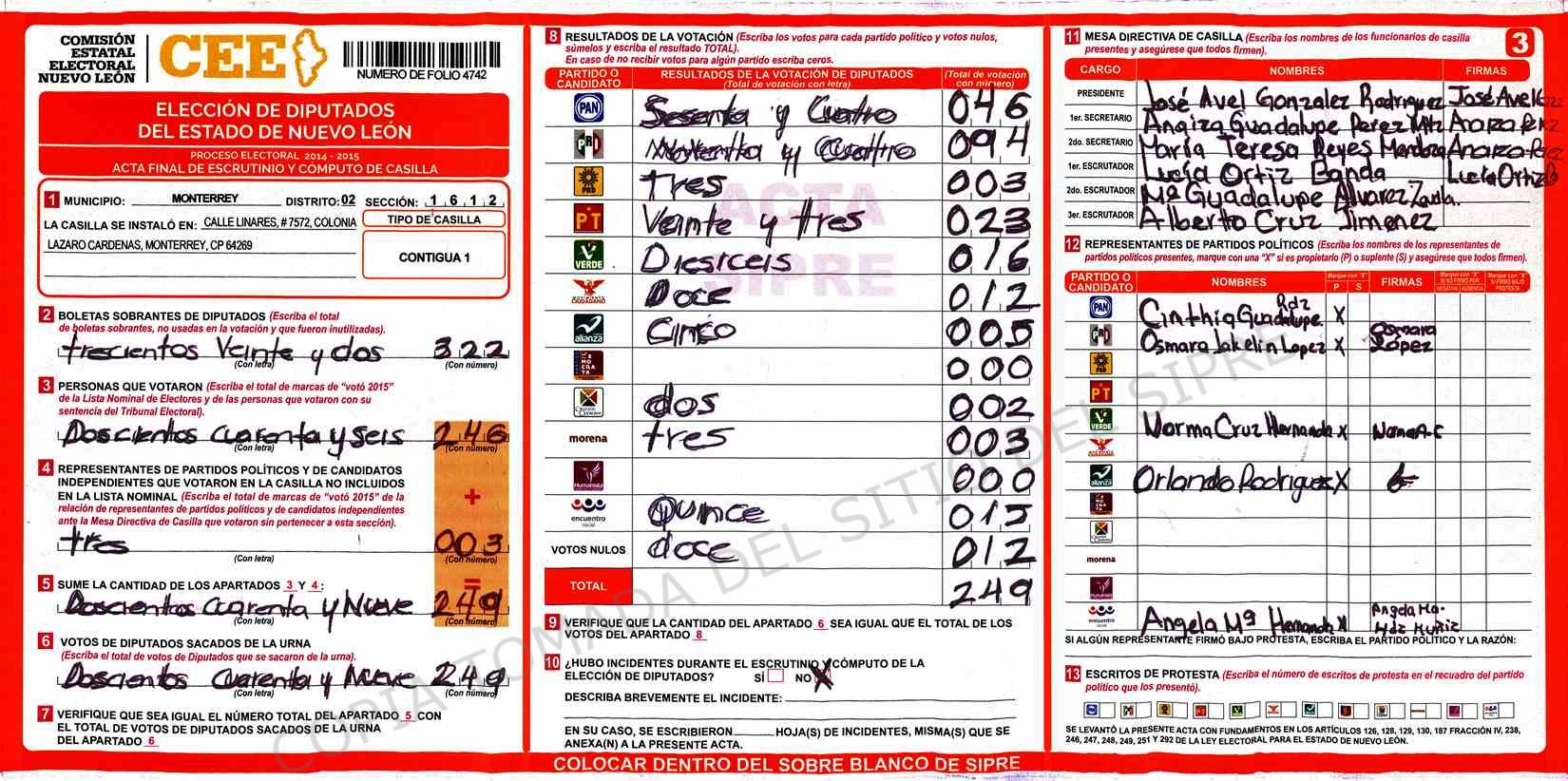 | Claves de Incidencia: | (1) Ilegible, (2) Mutilada, (3) Presenta Correcciones, (4) Presenta Borrones, (5) En Blanco, (6) Cifras Remarcadas, (7) Cifras de Mas, (8) Copiado Movido, (9) Con Signos Inválidos, (10) Excede Lista Nominal, (11) Otra |