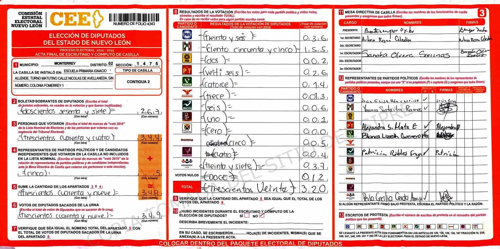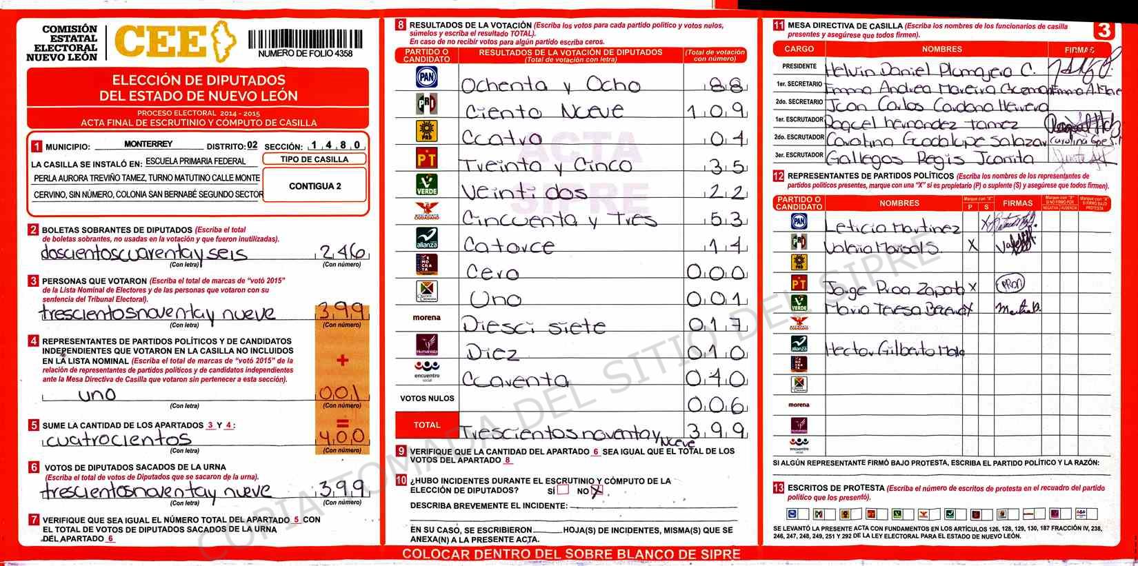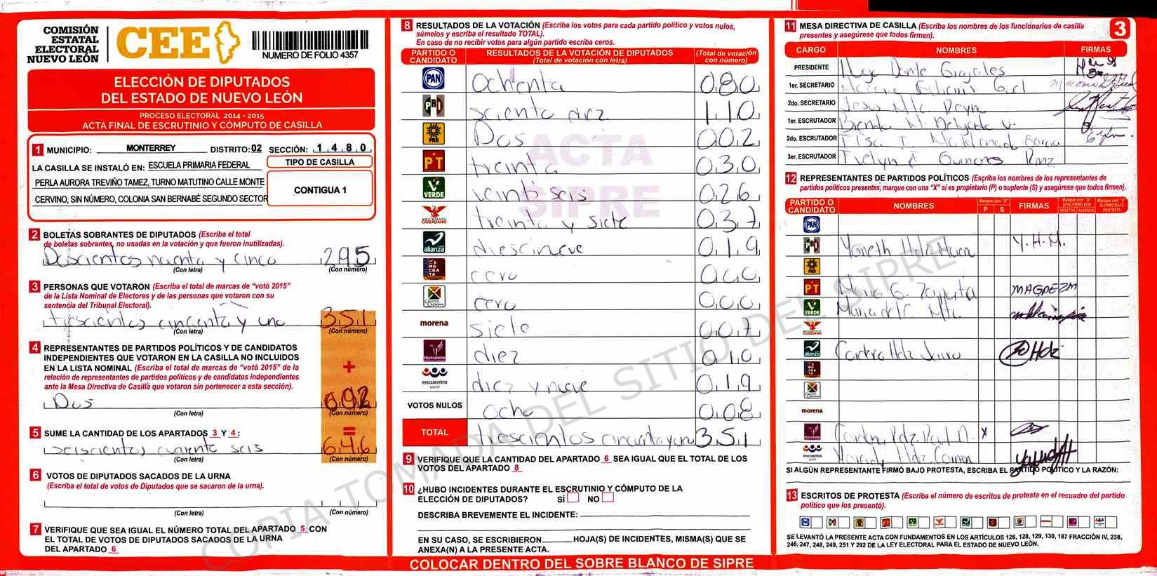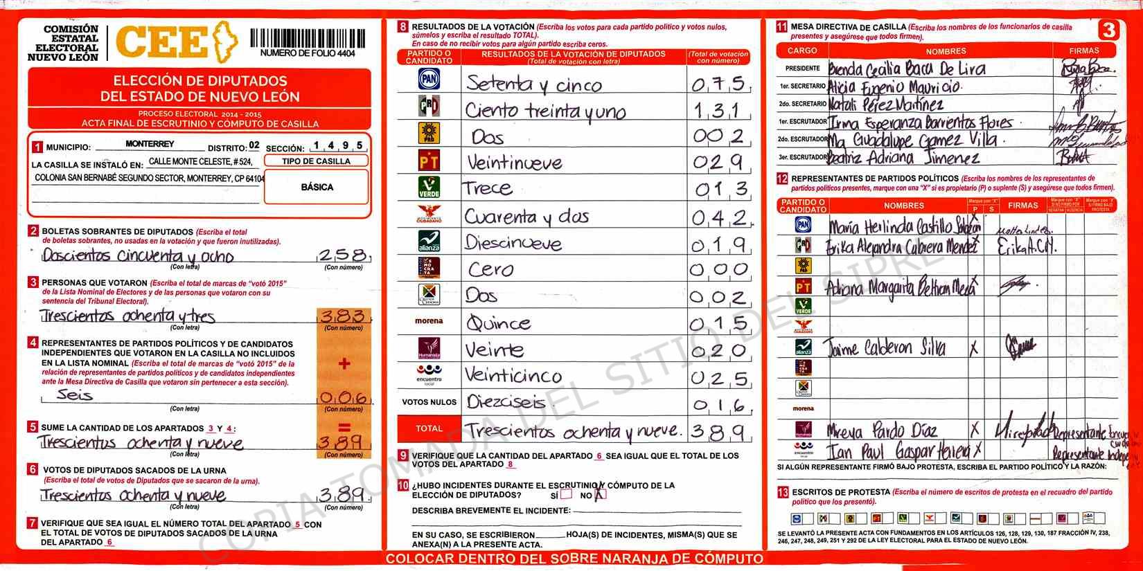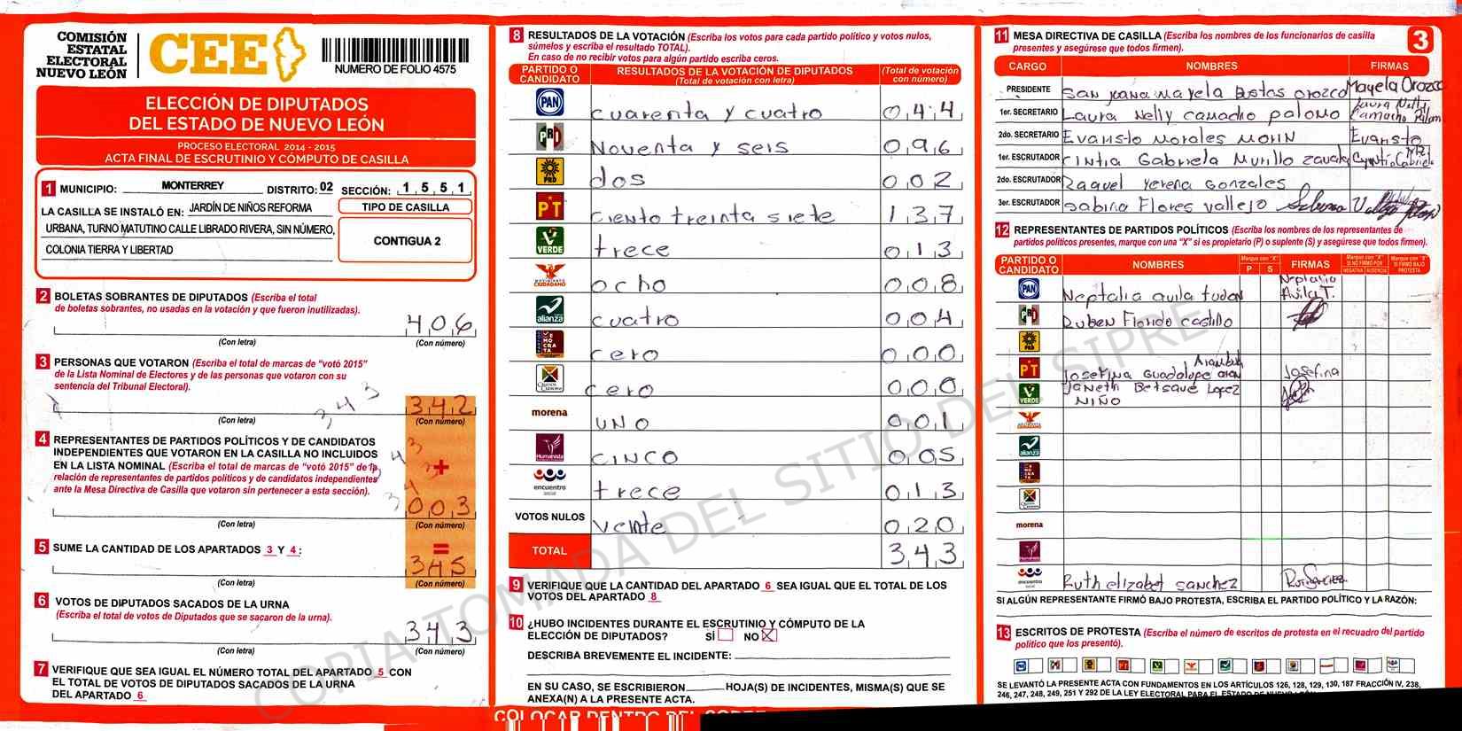 | Claves de Incidencia: | (1) Ilegible, (2) Mutilada, (3) Presenta Correcciones, (4) Presenta Borrones, (5) En Blanco, (6) Cifras Remarcadas, (7) Cifras de Mas, (8) Copiado Movido, (9) Con Signos Inválidos, (10) Excede Lista Nominal, (11) Otra |