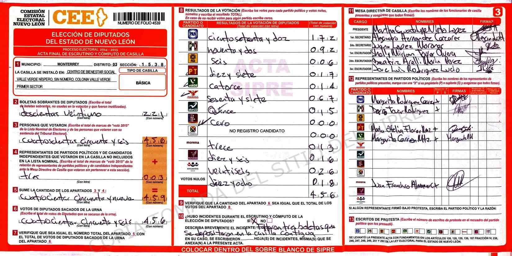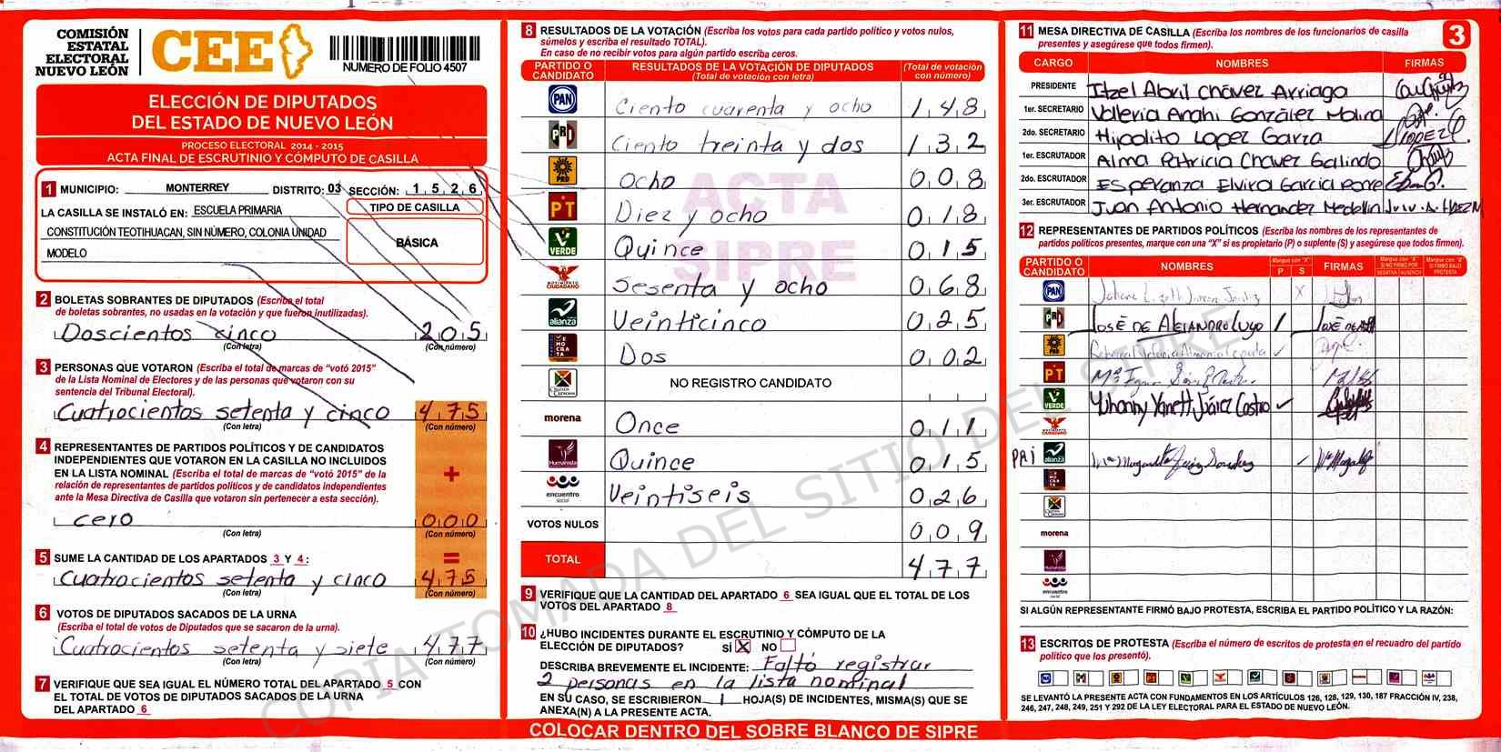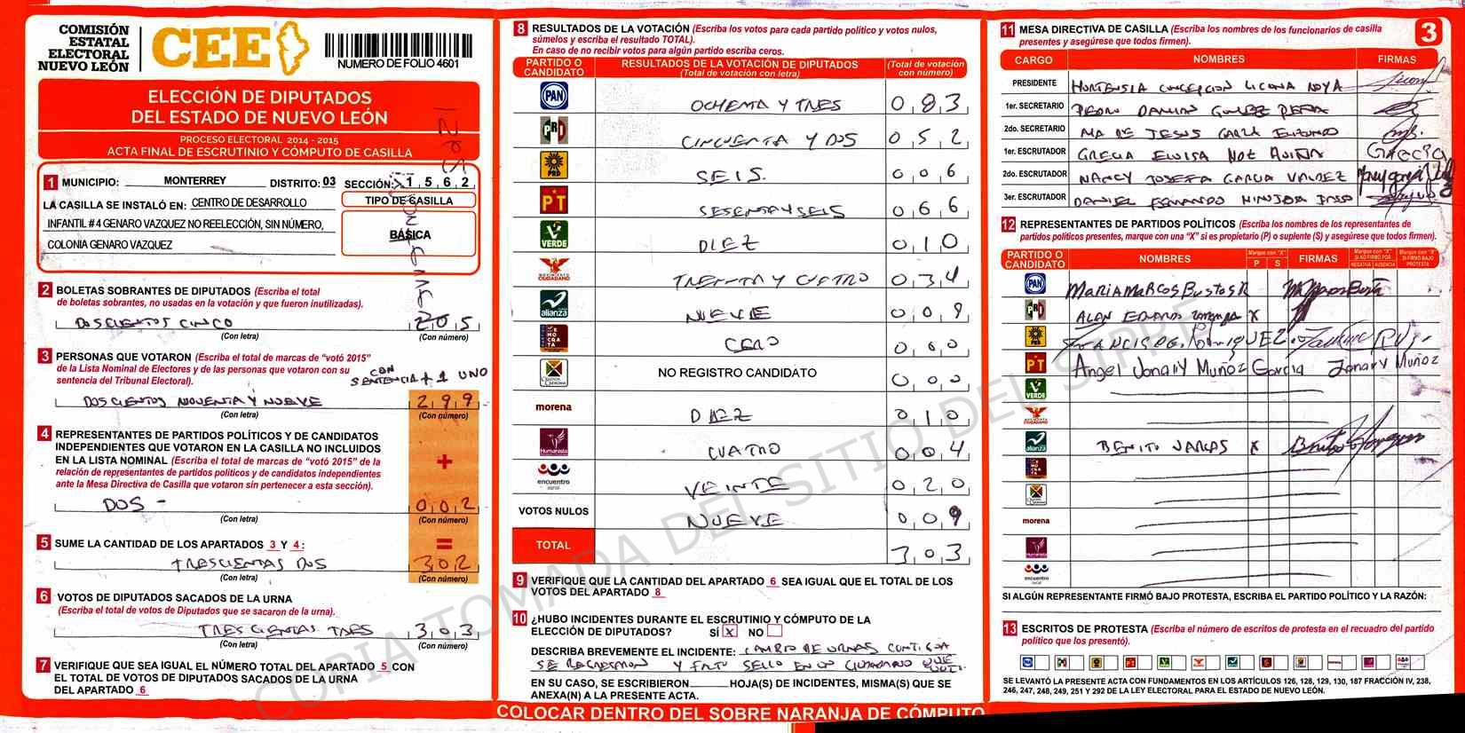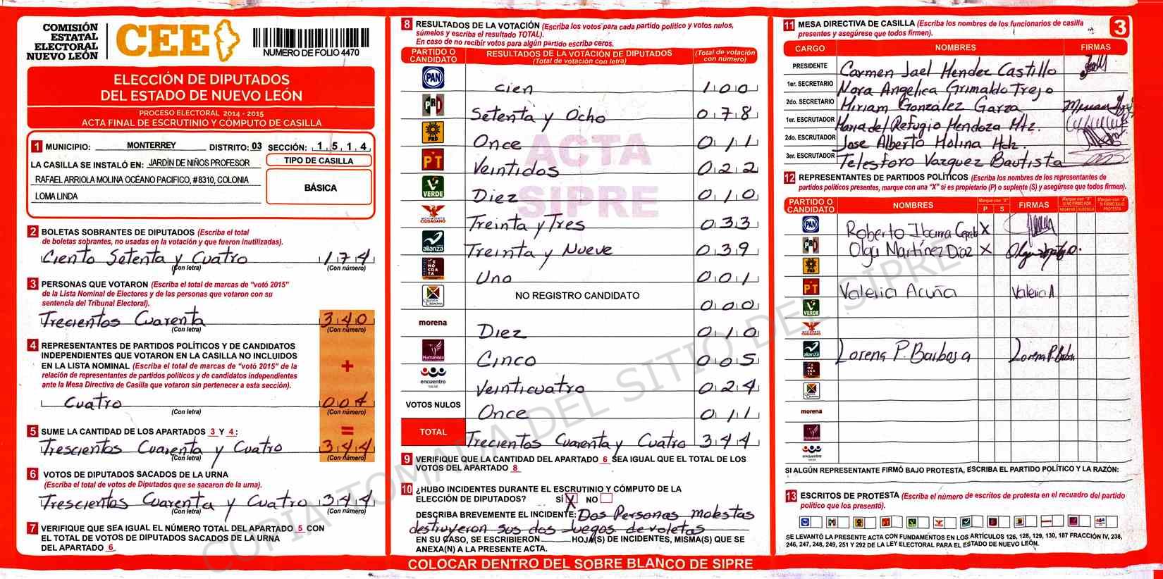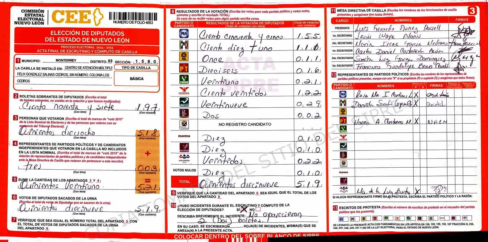 | Claves de Incidencia: | (1) Ilegible, (2) Mutilada, (3) Presenta Correcciones, (4) Presenta Borrones, (5) En Blanco, (6) Cifras Remarcadas, (7) Cifras de Mas, (8) Copiado Movido, (9) Con Signos Inválidos, (10) Excede Lista Nominal, (11) Otra |