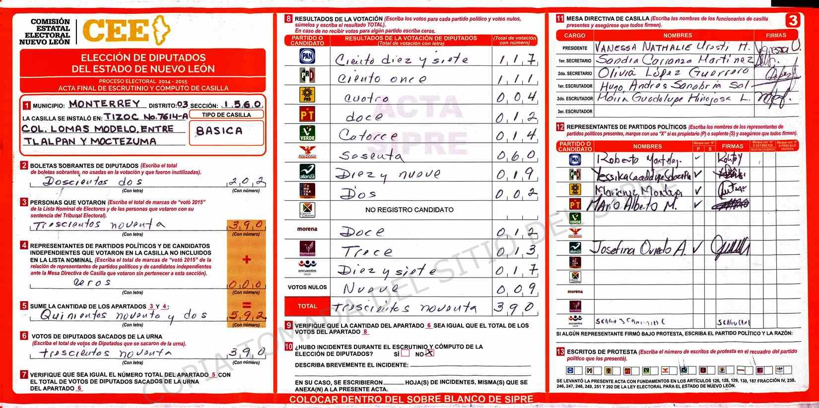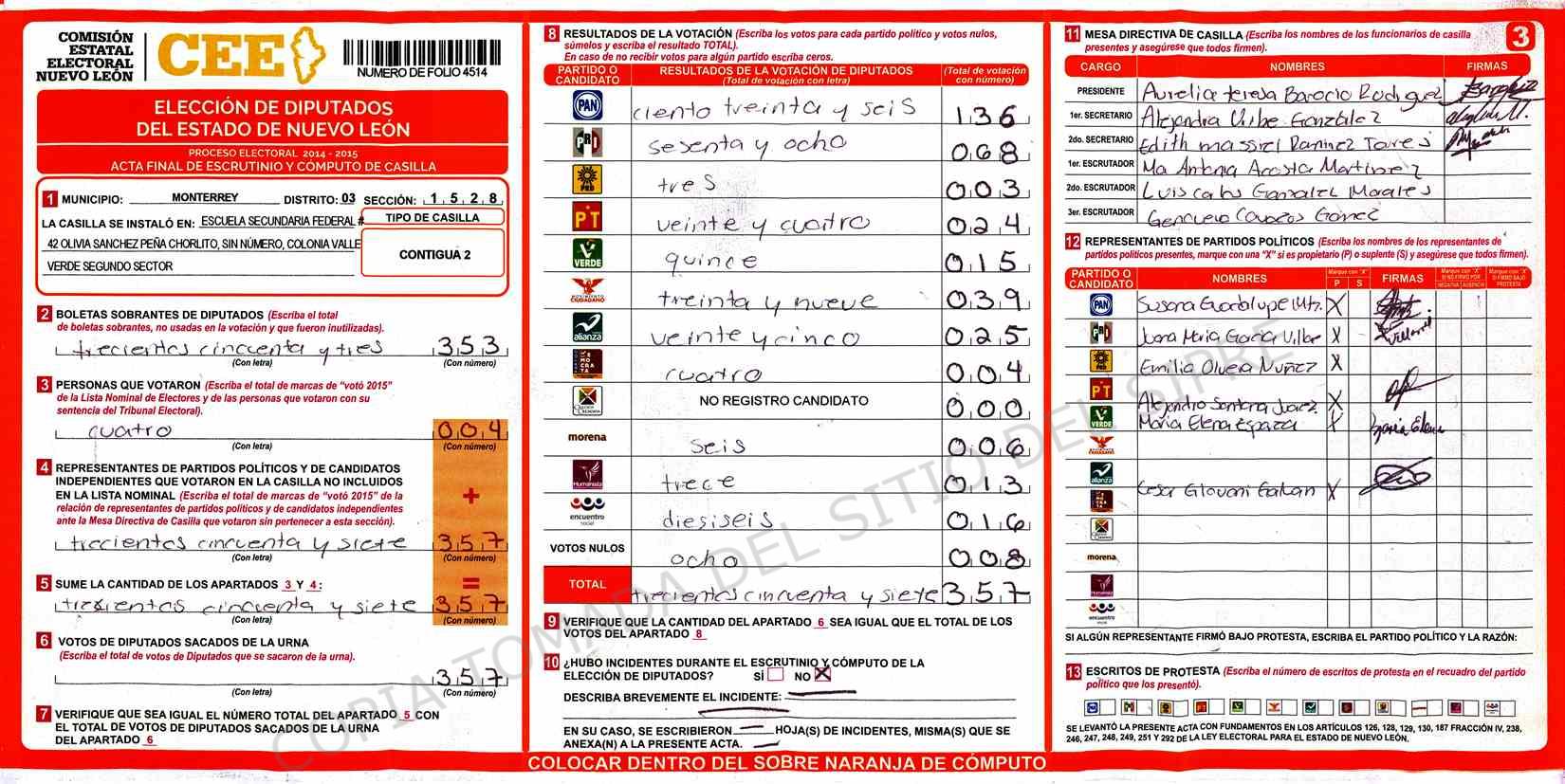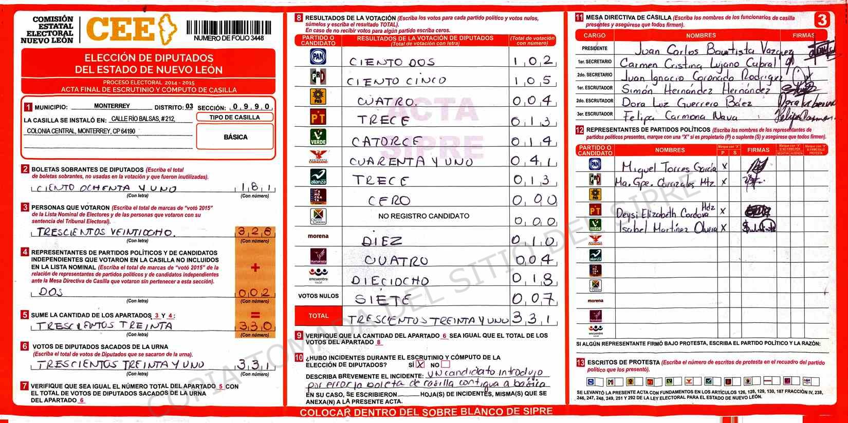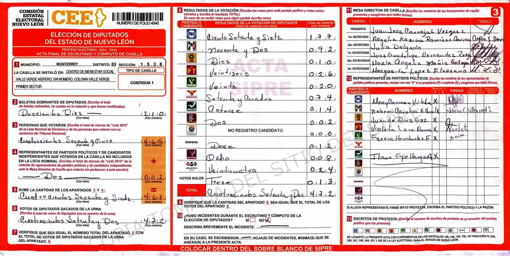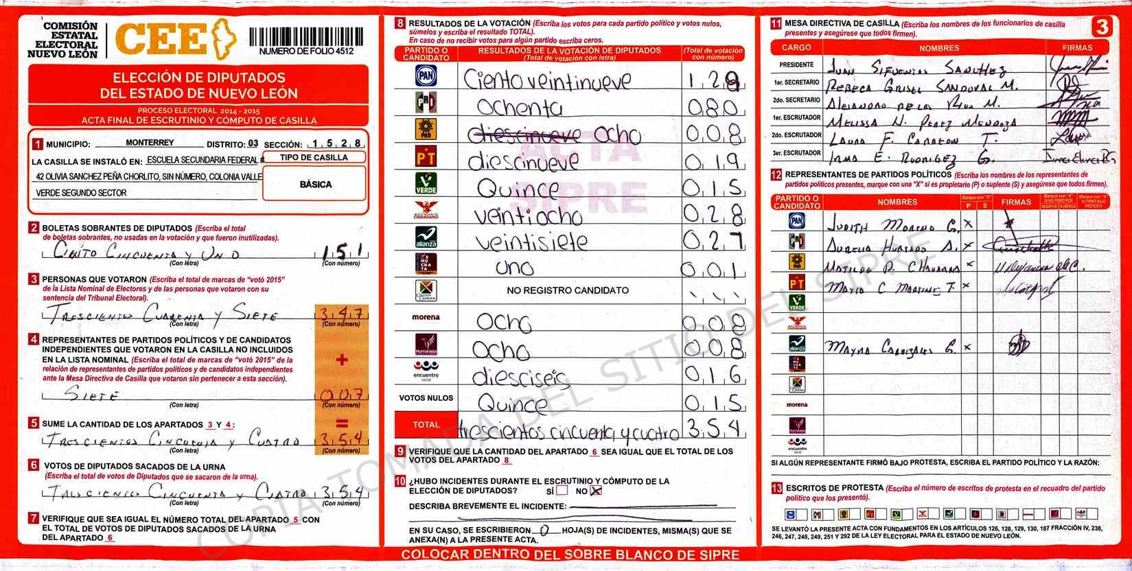 | Claves de Incidencia: | (1) Ilegible, (2) Mutilada, (3) Presenta Correcciones, (4) Presenta Borrones, (5) En Blanco, (6) Cifras Remarcadas, (7) Cifras de Mas, (8) Copiado Movido, (9) Con Signos Inválidos, (10) Excede Lista Nominal, (11) Otra |