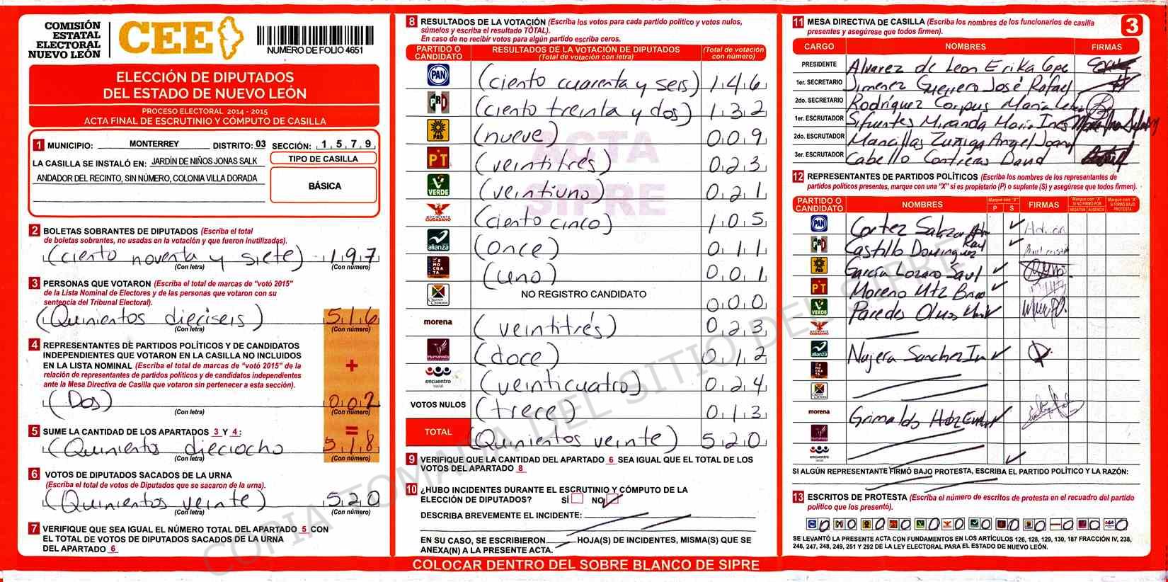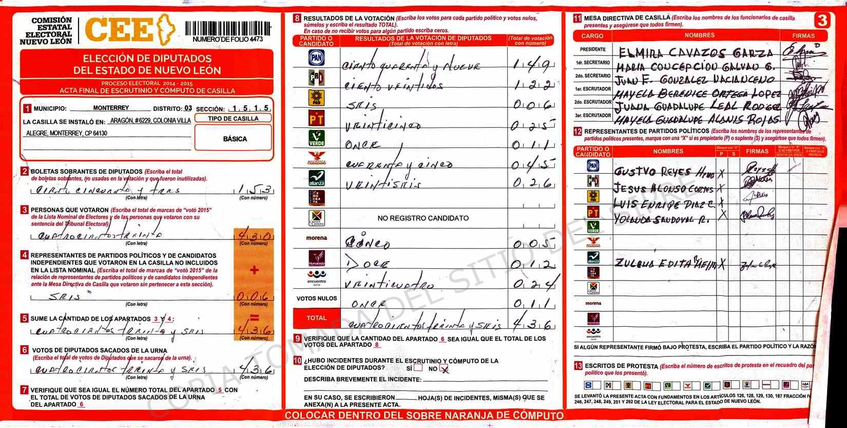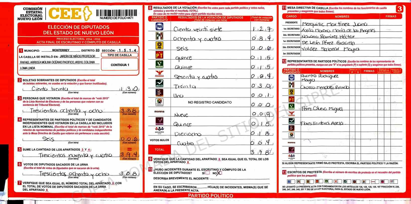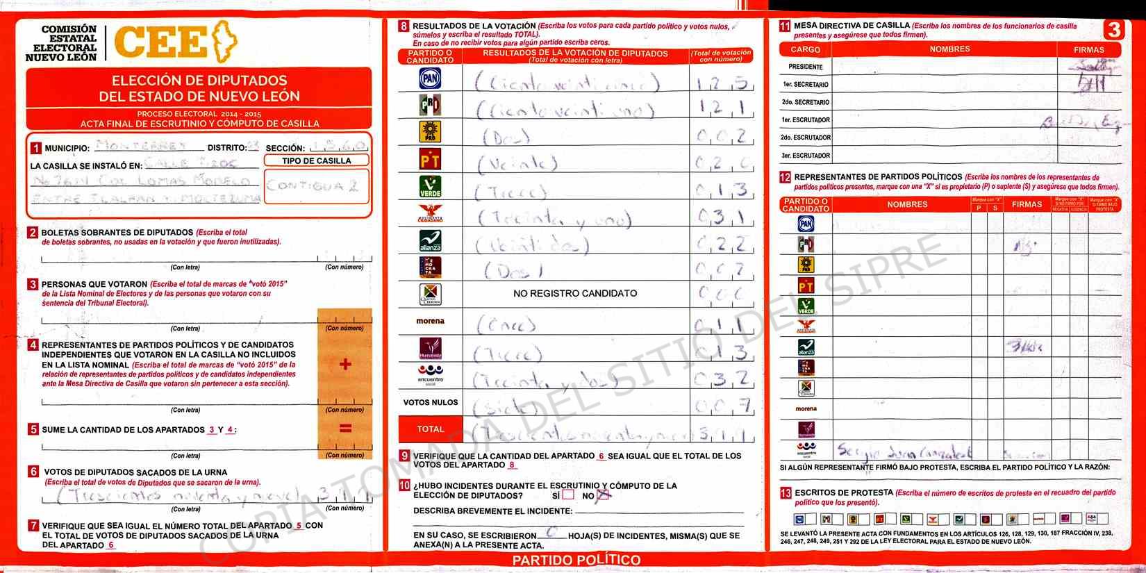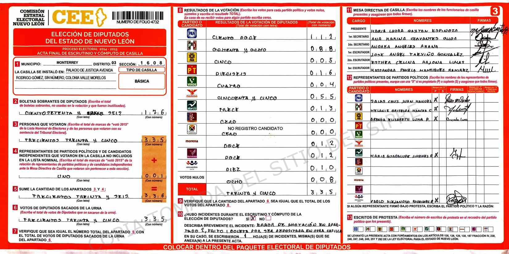 | Claves de Incidencia: | (1) Ilegible, (2) Mutilada, (3) Presenta Correcciones, (4) Presenta Borrones, (5) En Blanco, (6) Cifras Remarcadas, (7) Cifras de Mas, (8) Copiado Movido, (9) Con Signos Inválidos, (10) Excede Lista Nominal, (11) Otra |