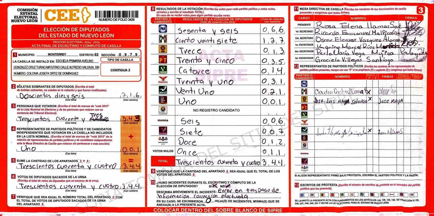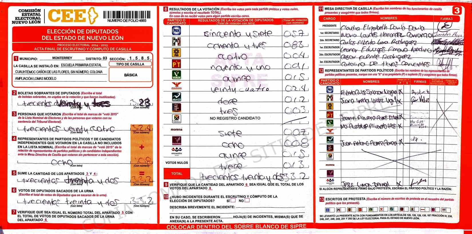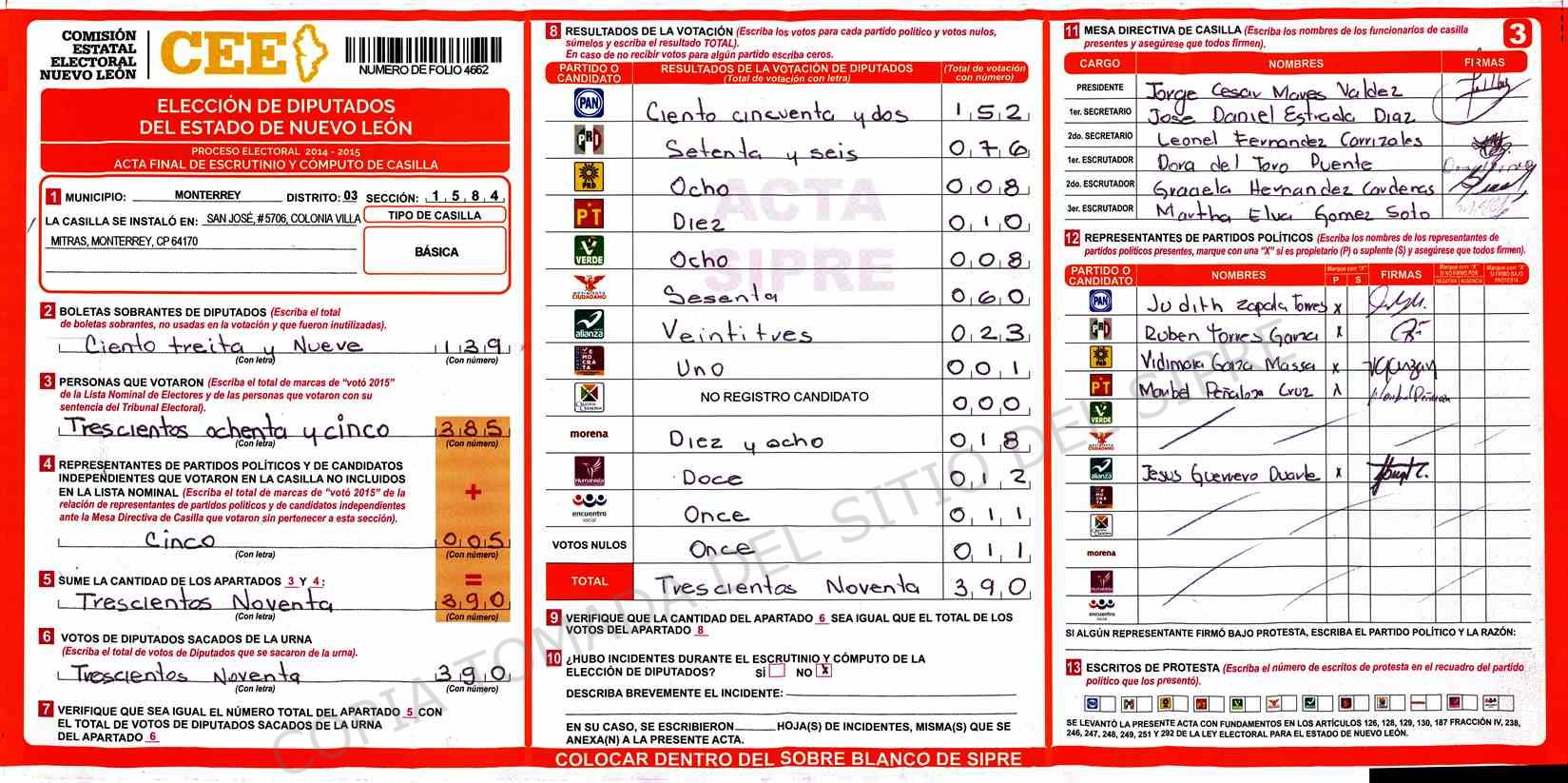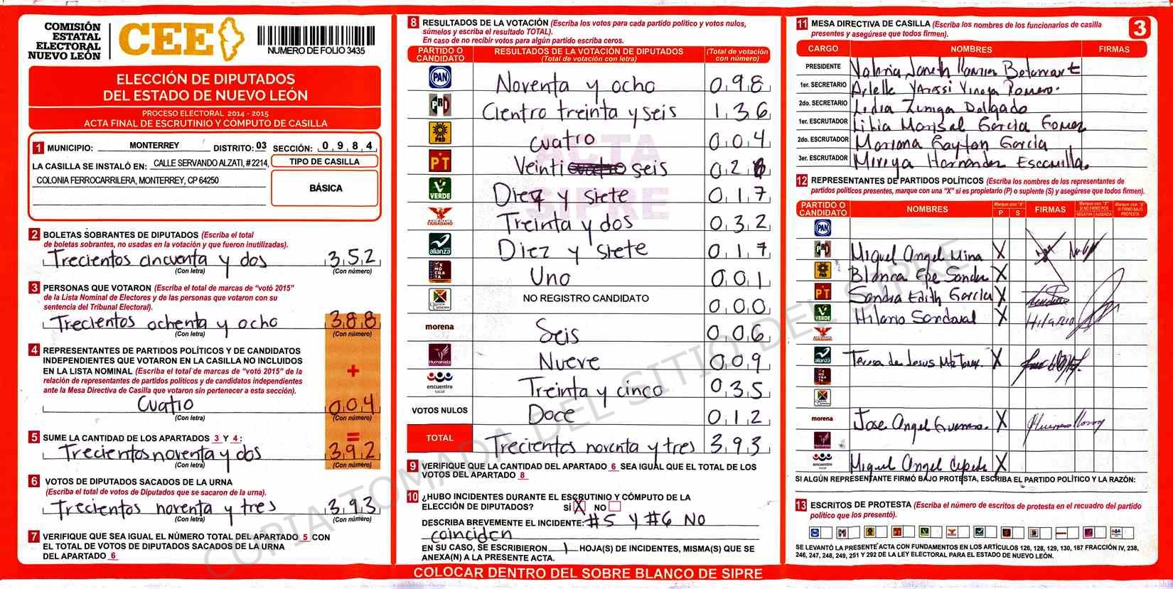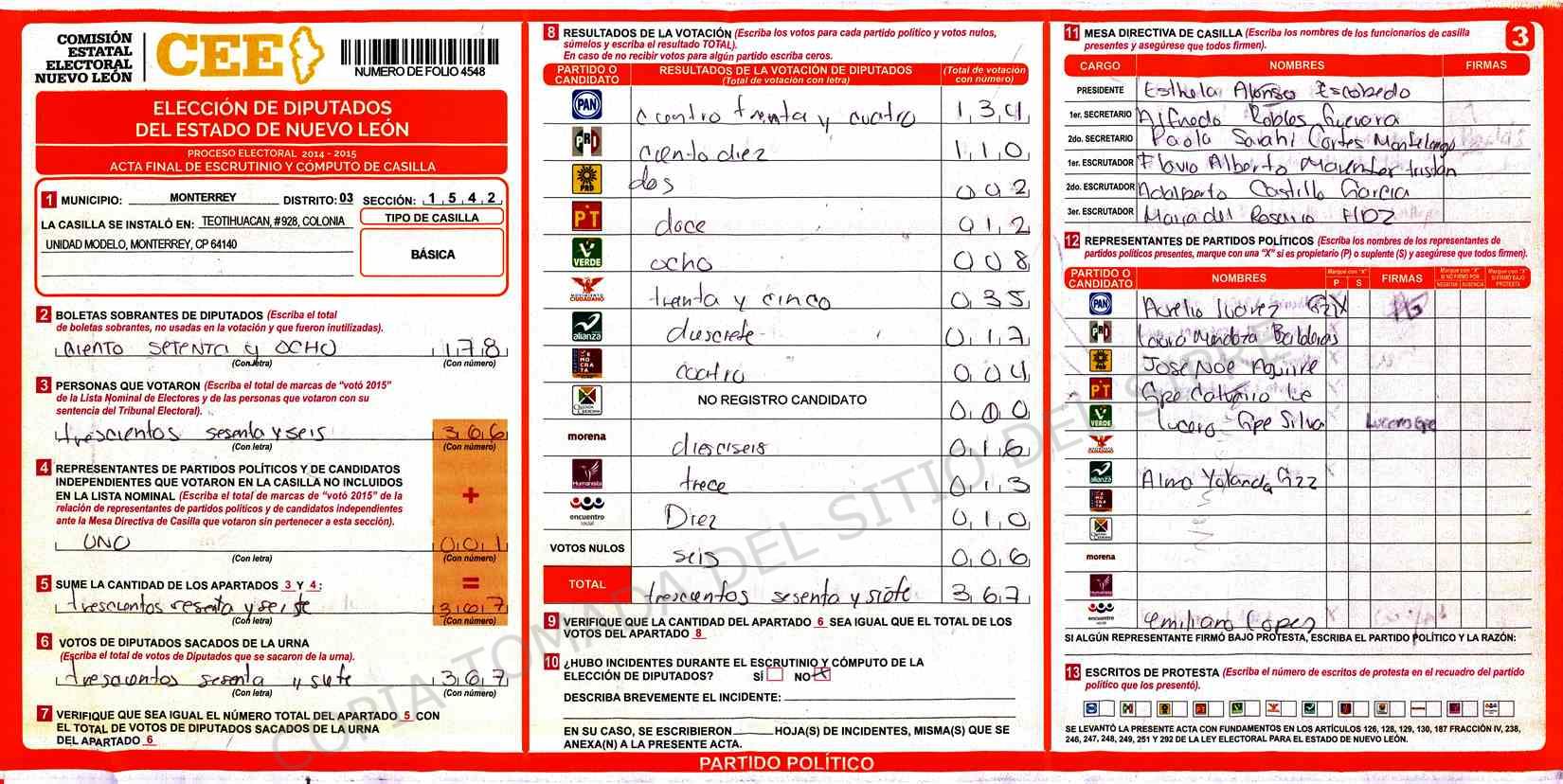 | Claves de Incidencia: | (1) Ilegible, (2) Mutilada, (3) Presenta Correcciones, (4) Presenta Borrones, (5) En Blanco, (6) Cifras Remarcadas, (7) Cifras de Mas, (8) Copiado Movido, (9) Con Signos Inválidos, (10) Excede Lista Nominal, (11) Otra |