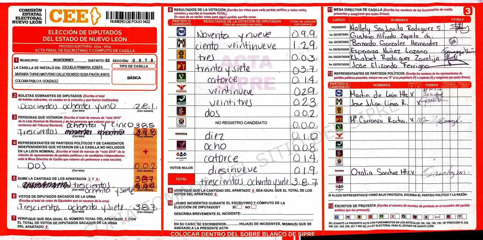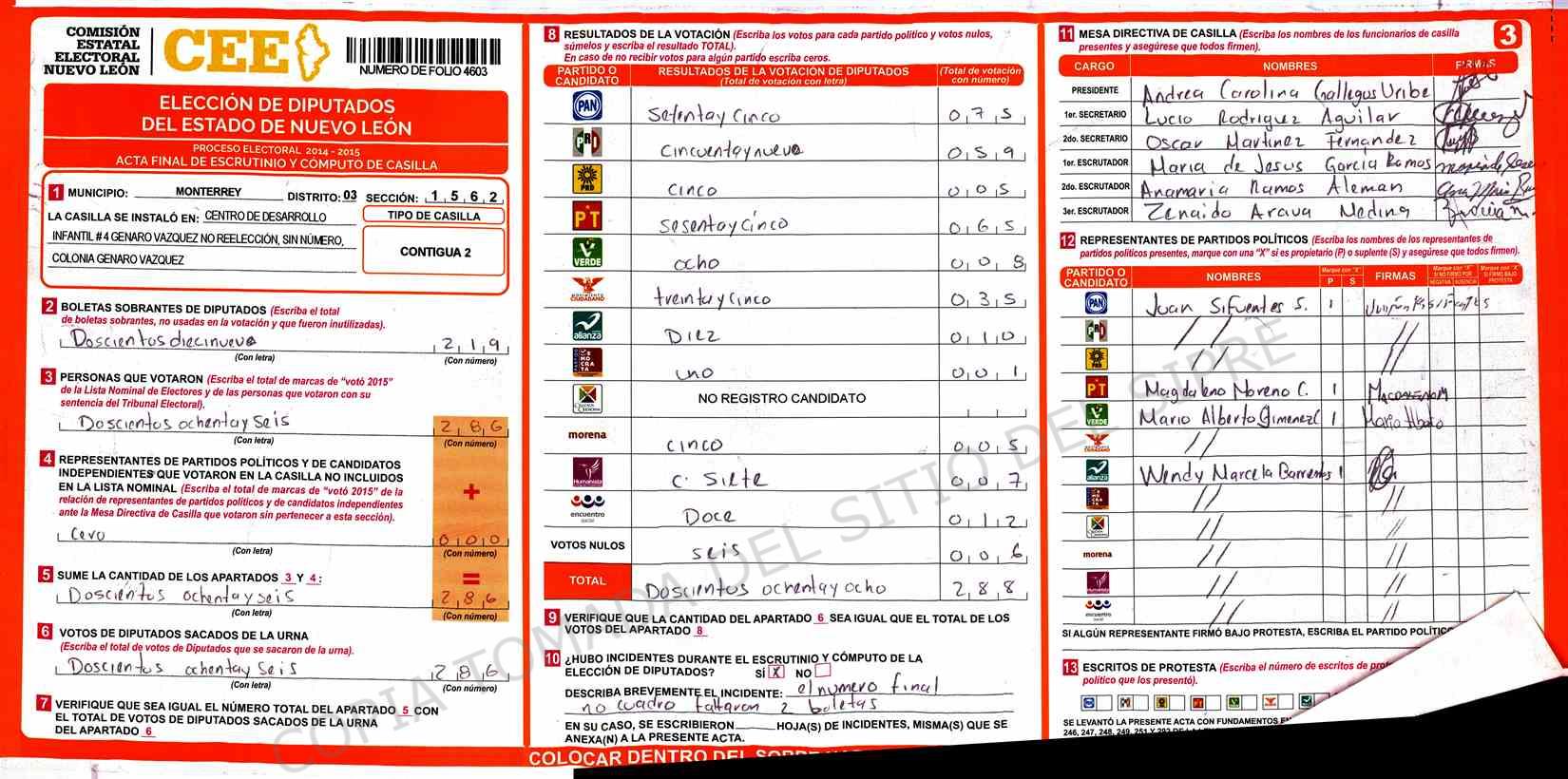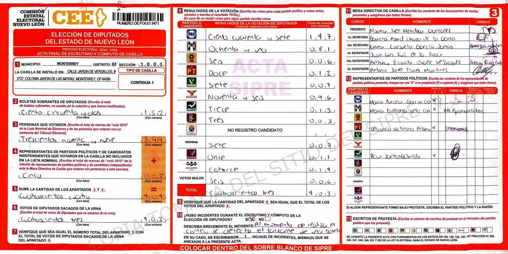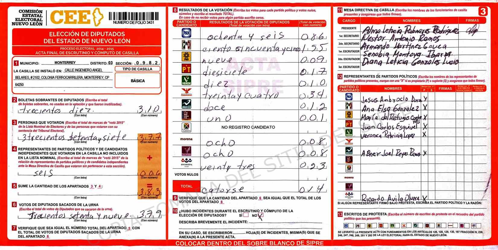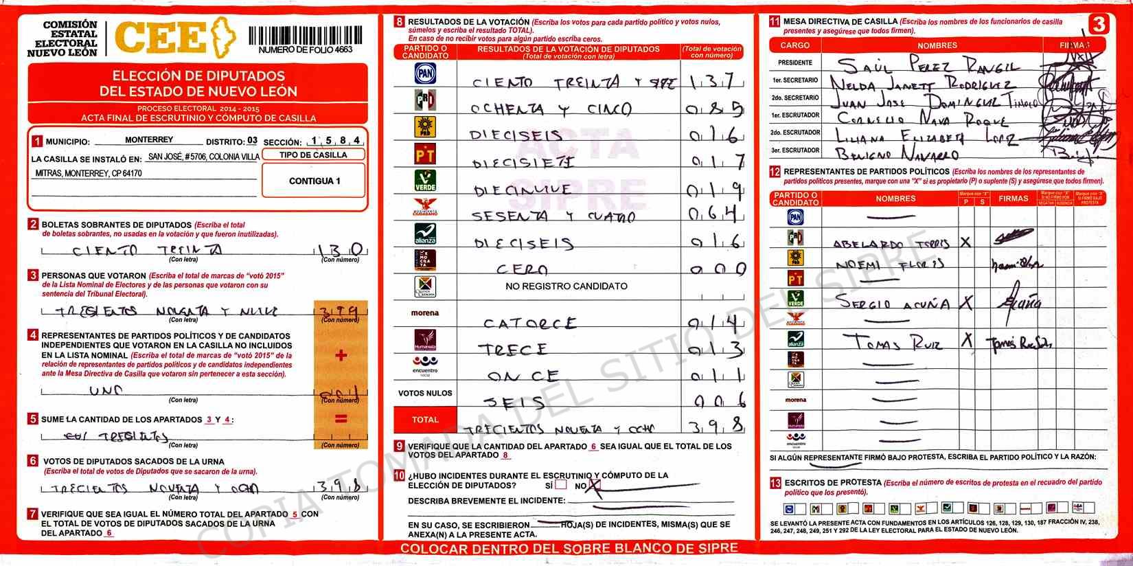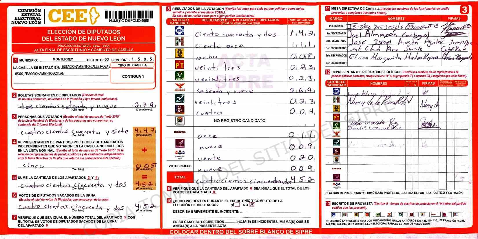 | Claves de Incidencia: | (1) Ilegible, (2) Mutilada, (3) Presenta Correcciones, (4) Presenta Borrones, (5) En Blanco, (6) Cifras Remarcadas, (7) Cifras de Mas, (8) Copiado Movido, (9) Con Signos Inválidos, (10) Excede Lista Nominal, (11) Otra |