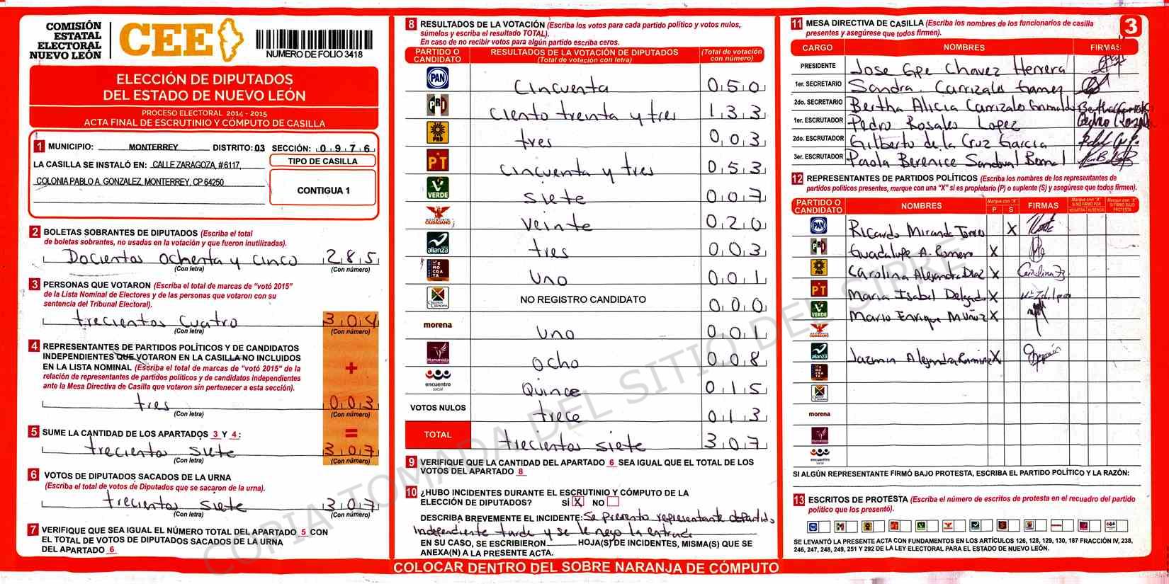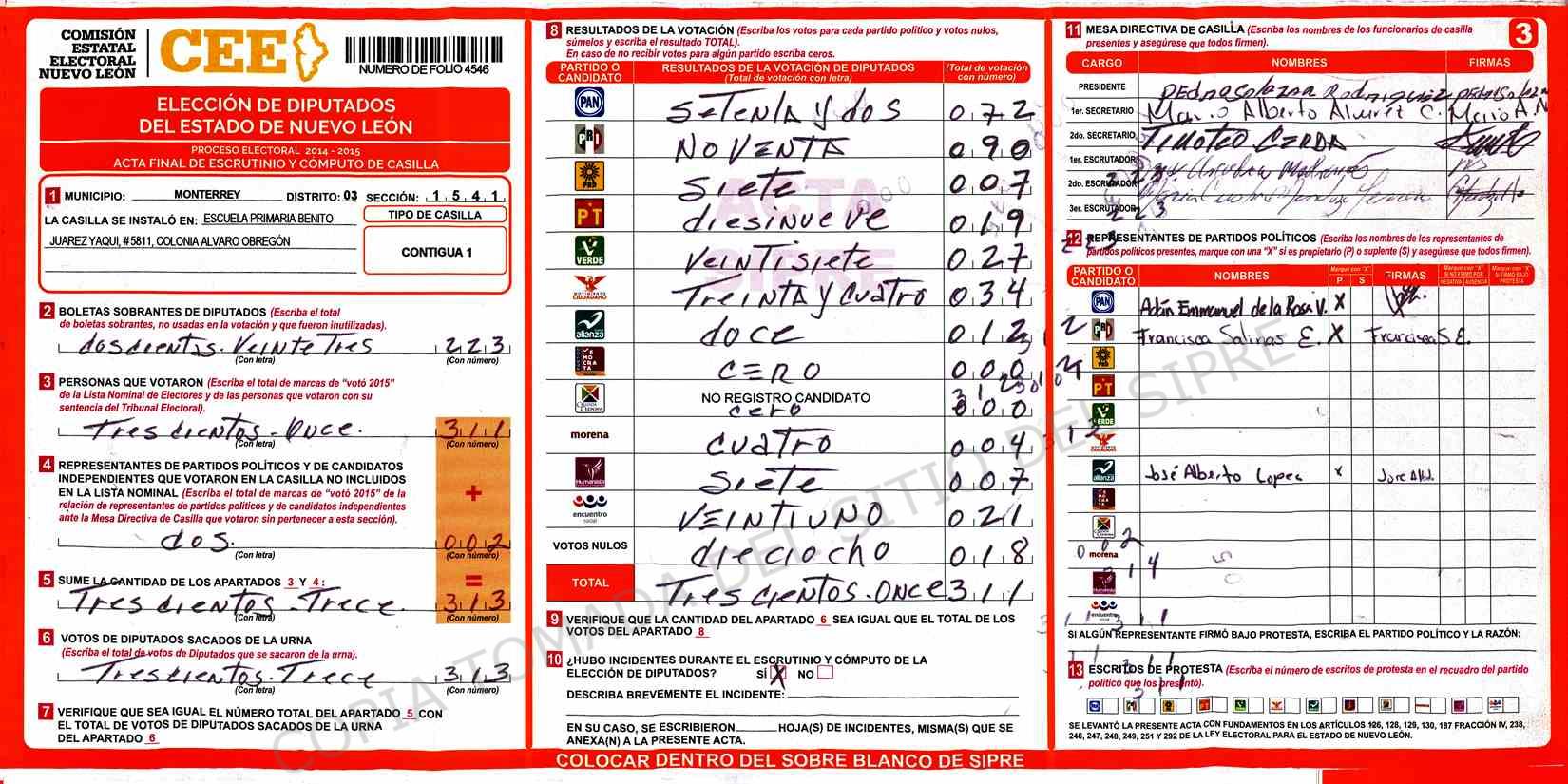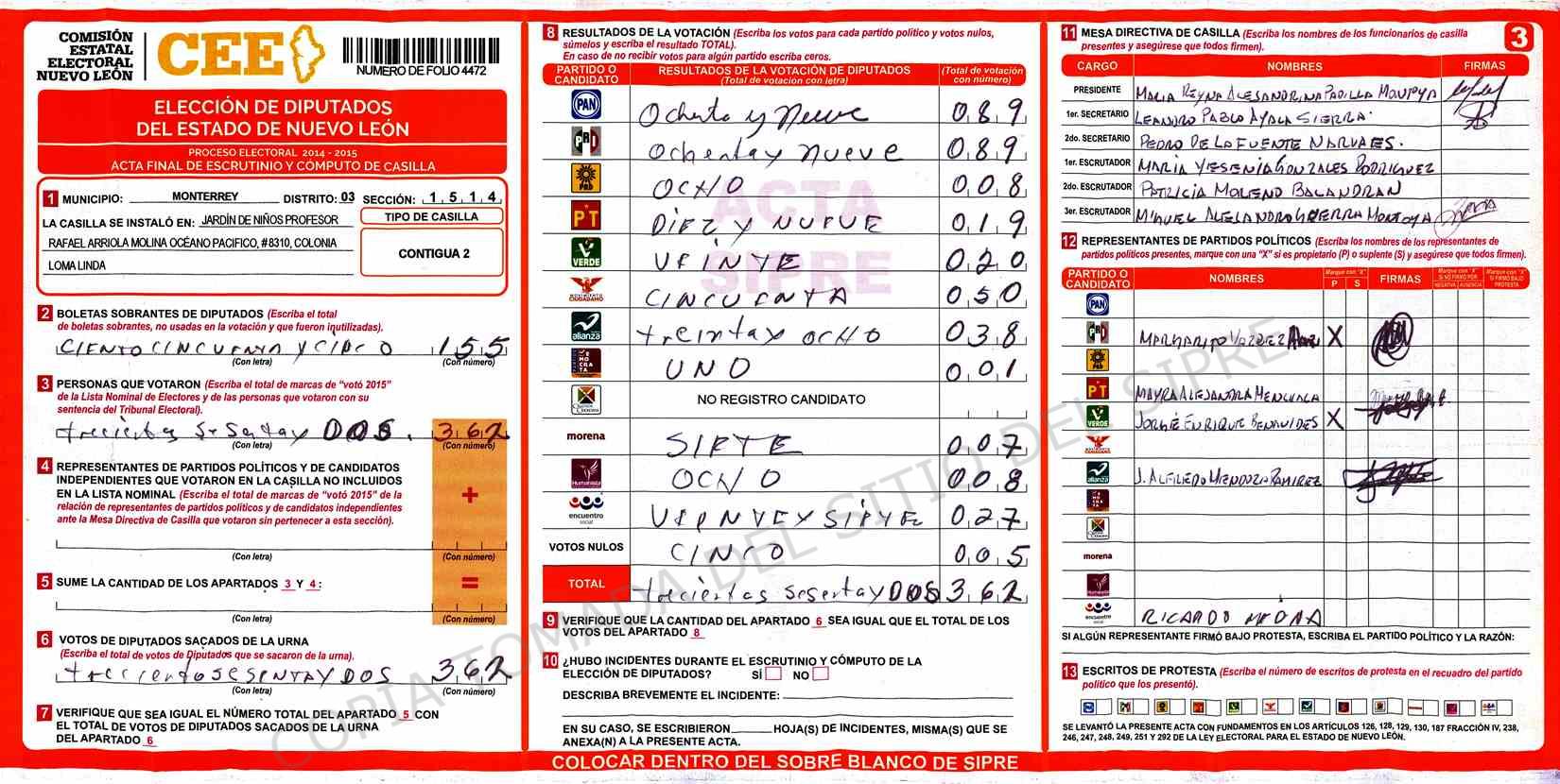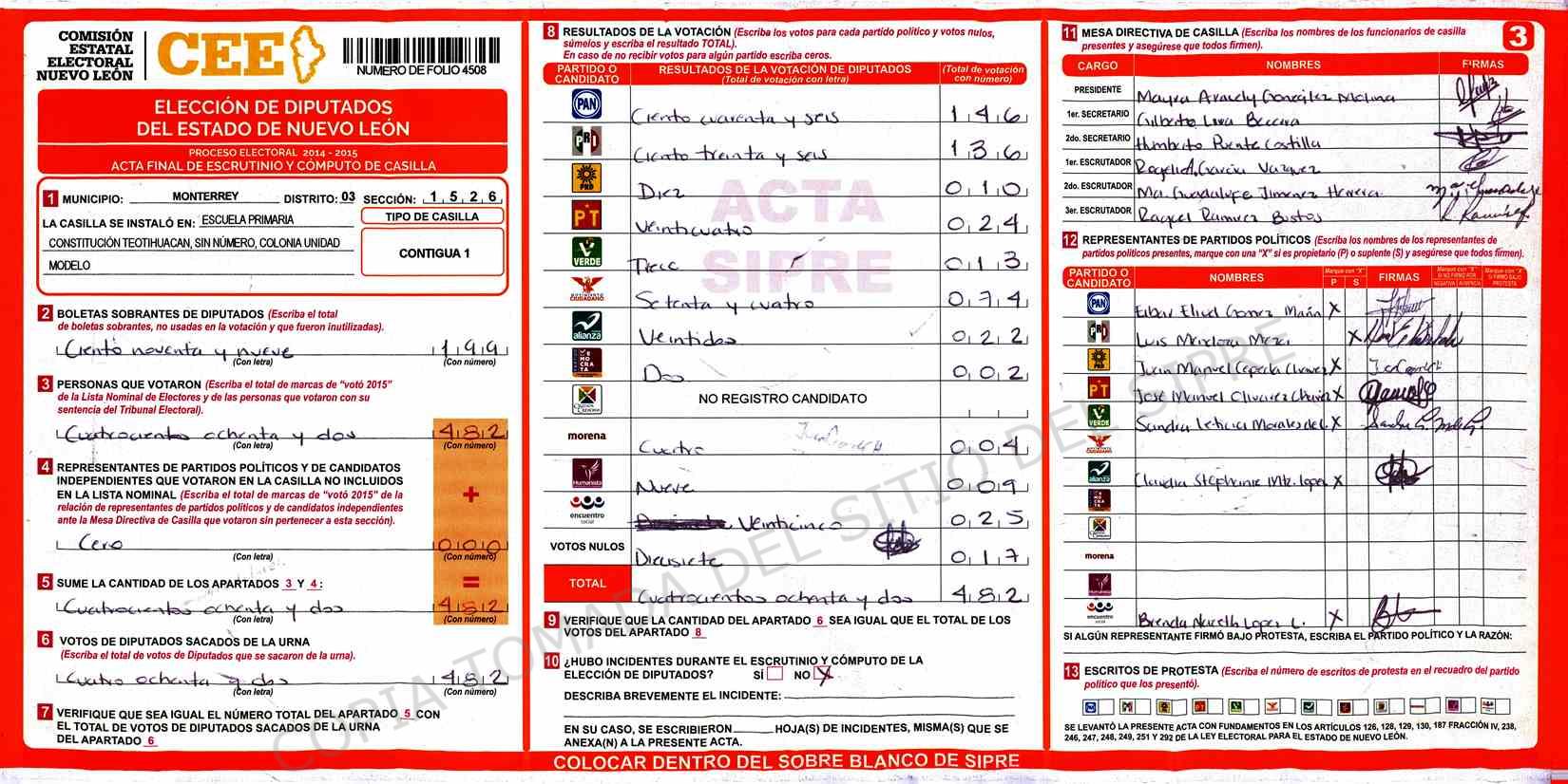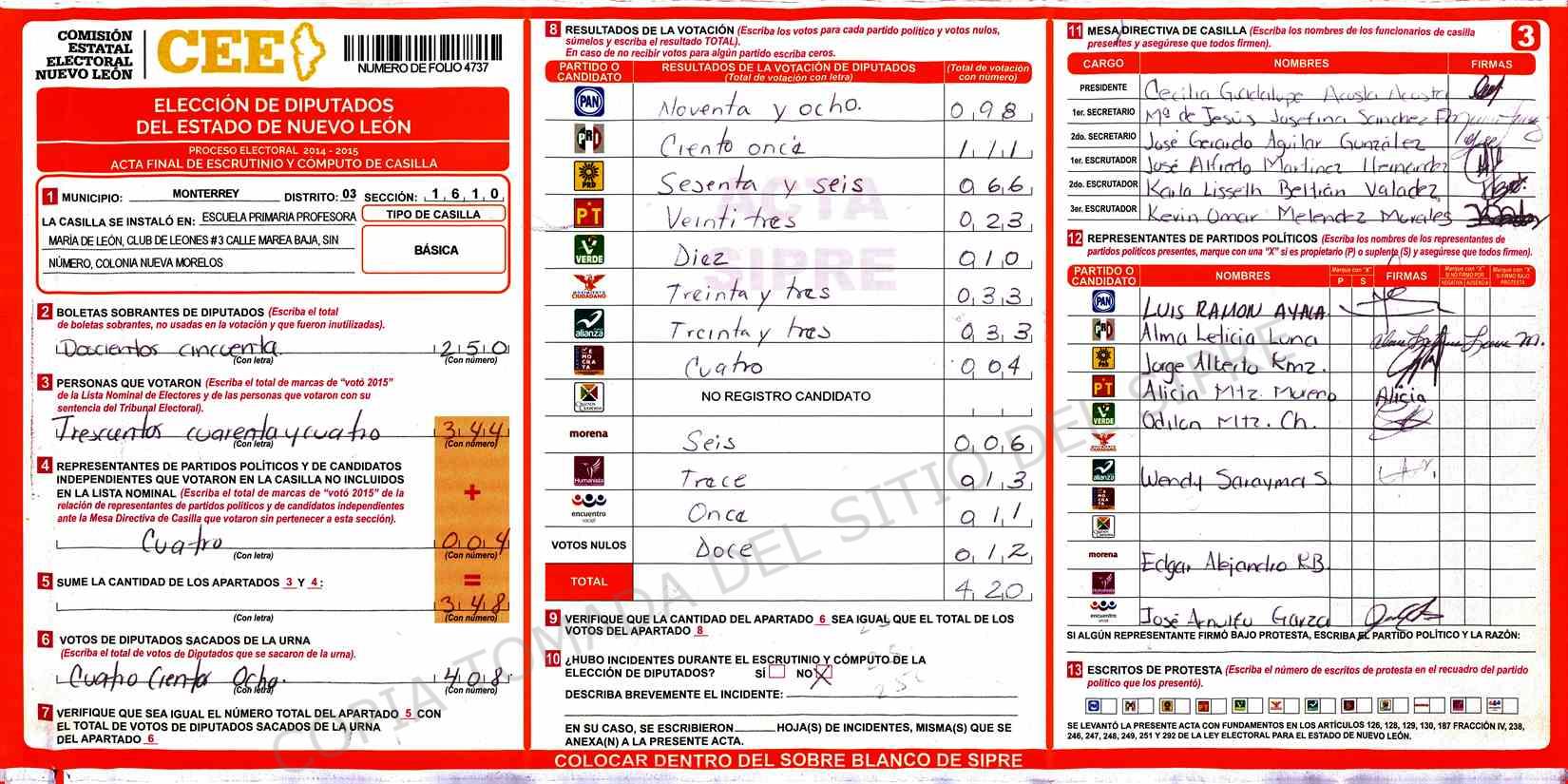 | Claves de Incidencia: | (1) Ilegible, (2) Mutilada, (3) Presenta Correcciones, (4) Presenta Borrones, (5) En Blanco, (6) Cifras Remarcadas, (7) Cifras de Mas, (8) Copiado Movido, (9) Con Signos Inválidos, (10) Excede Lista Nominal, (11) Otra |