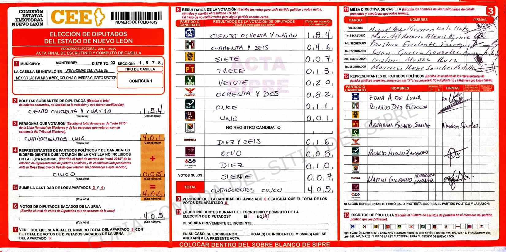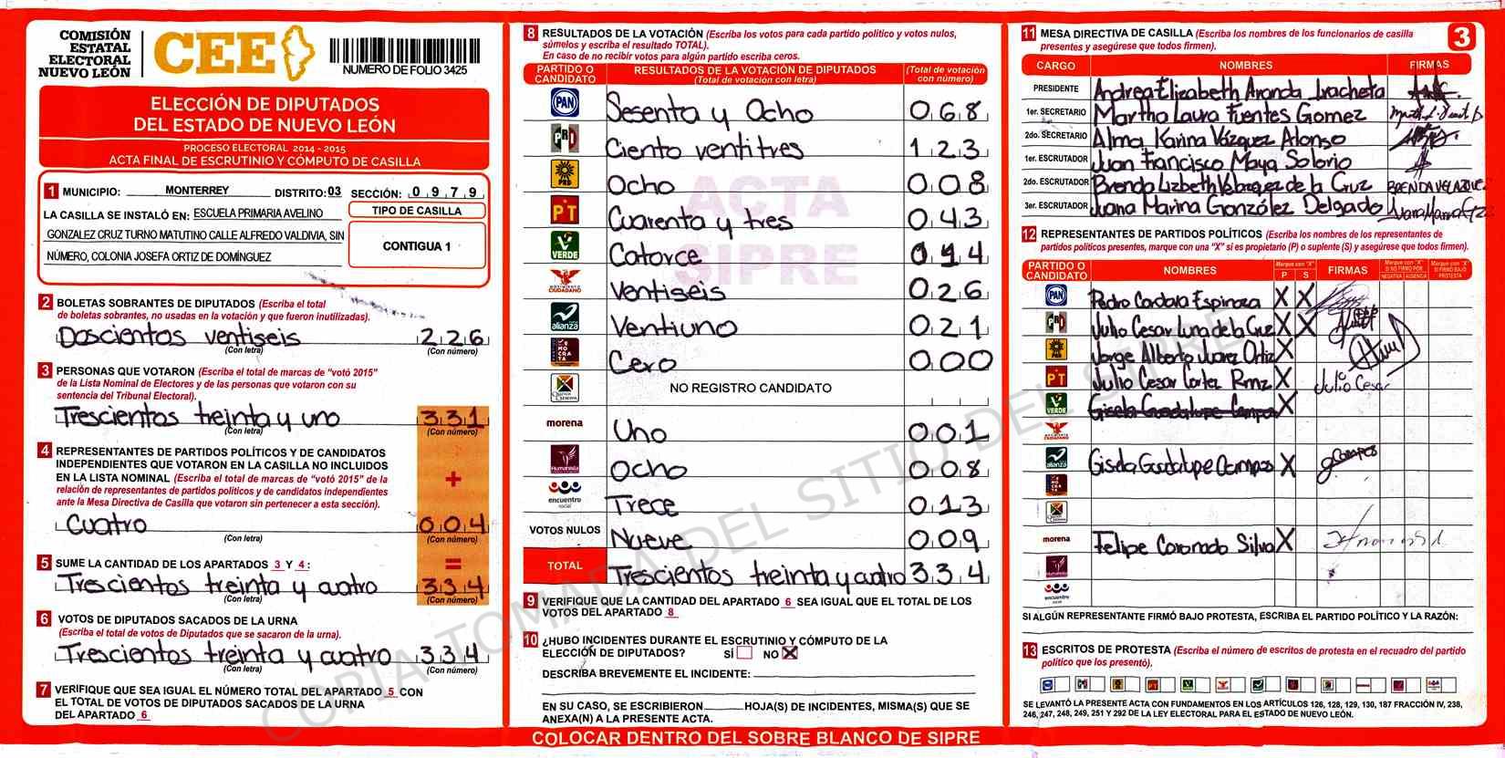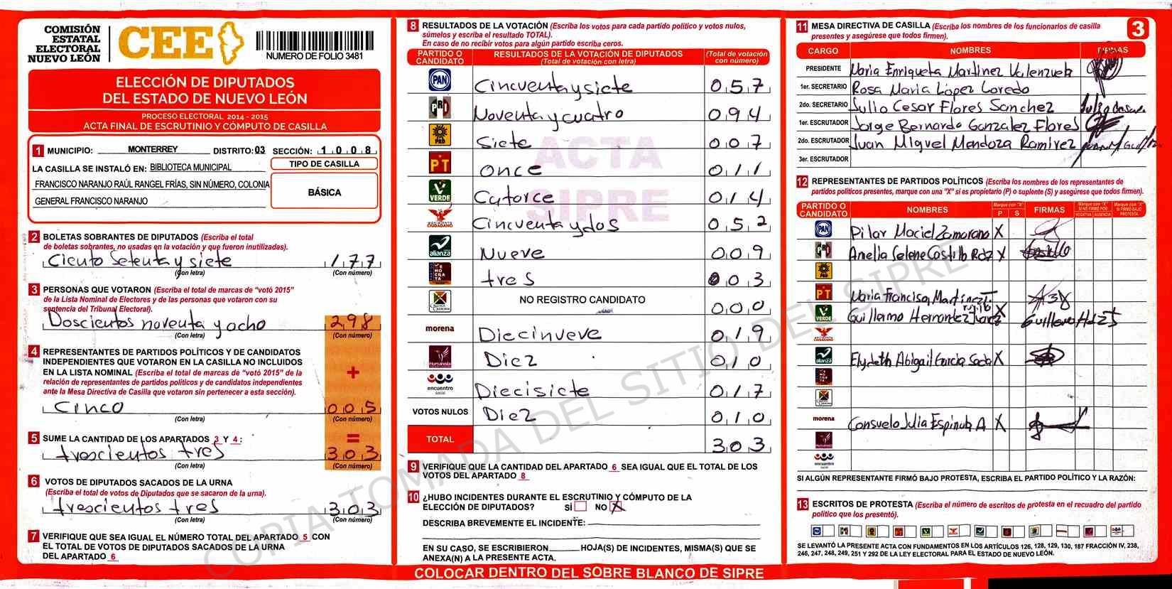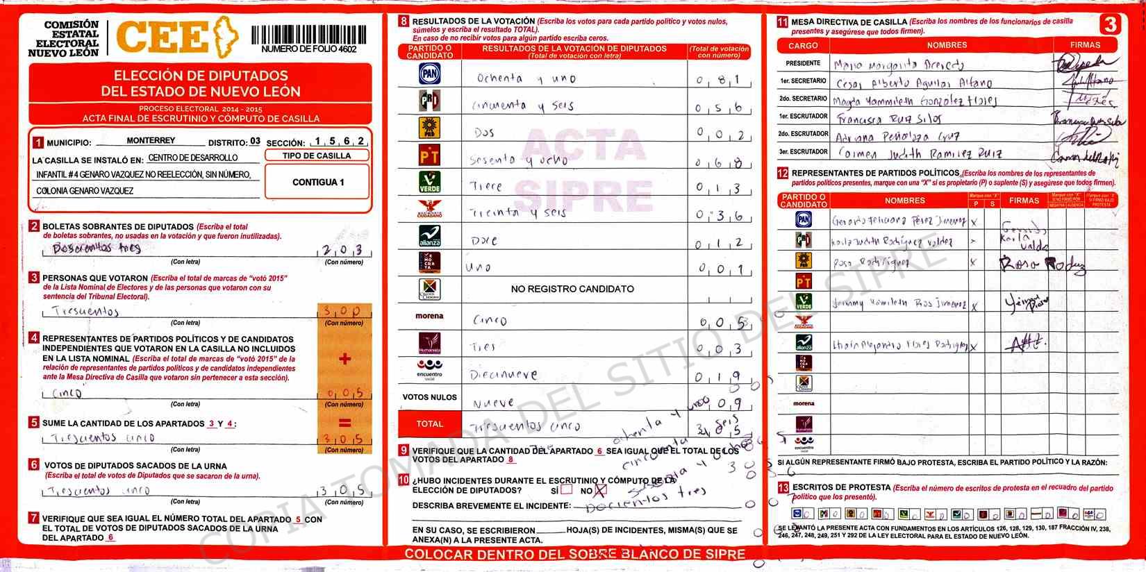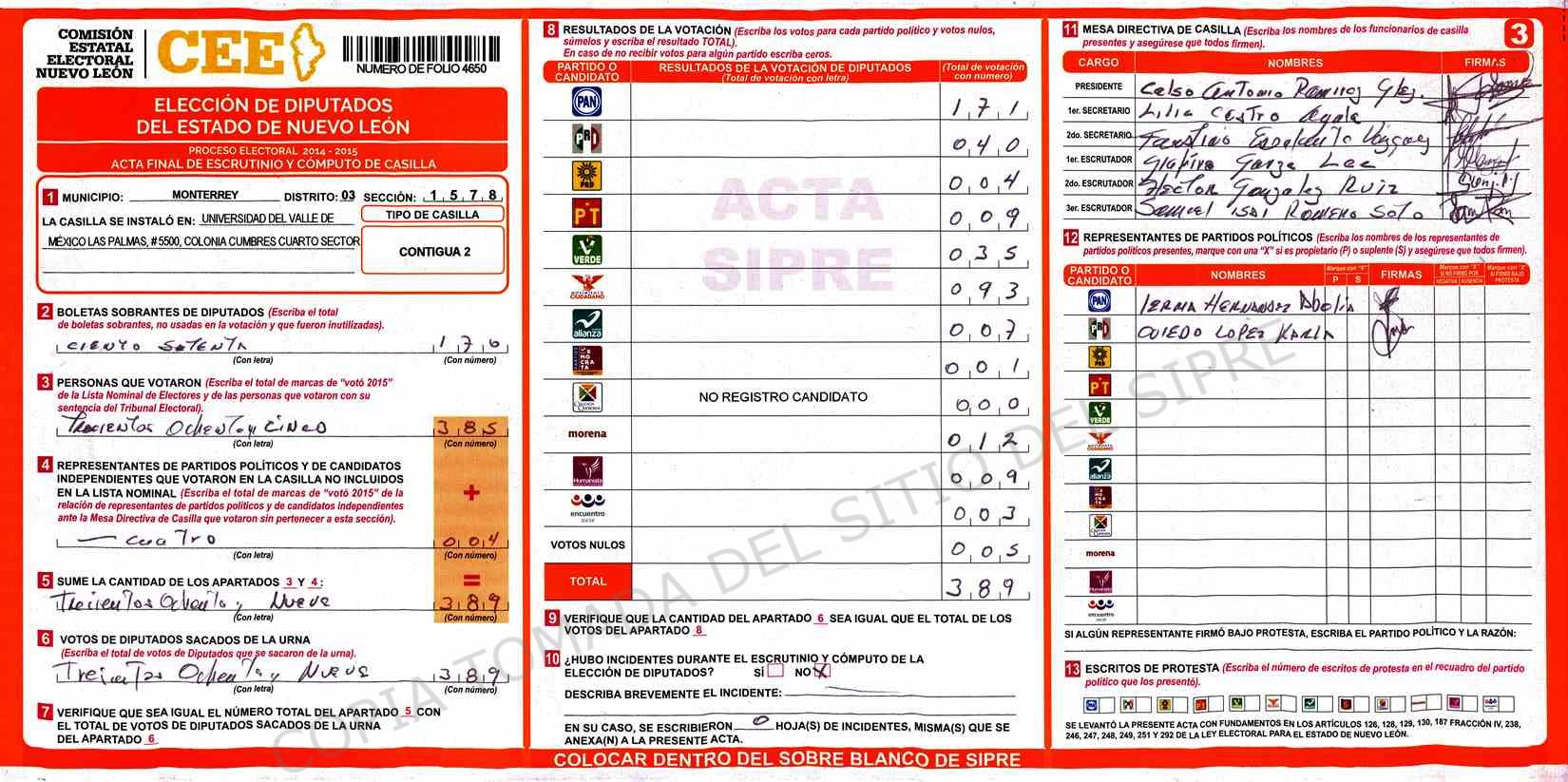 | Claves de Incidencia: | (1) Ilegible, (2) Mutilada, (3) Presenta Correcciones, (4) Presenta Borrones, (5) En Blanco, (6) Cifras Remarcadas, (7) Cifras de Mas, (8) Copiado Movido, (9) Con Signos Inválidos, (10) Excede Lista Nominal, (11) Otra |
